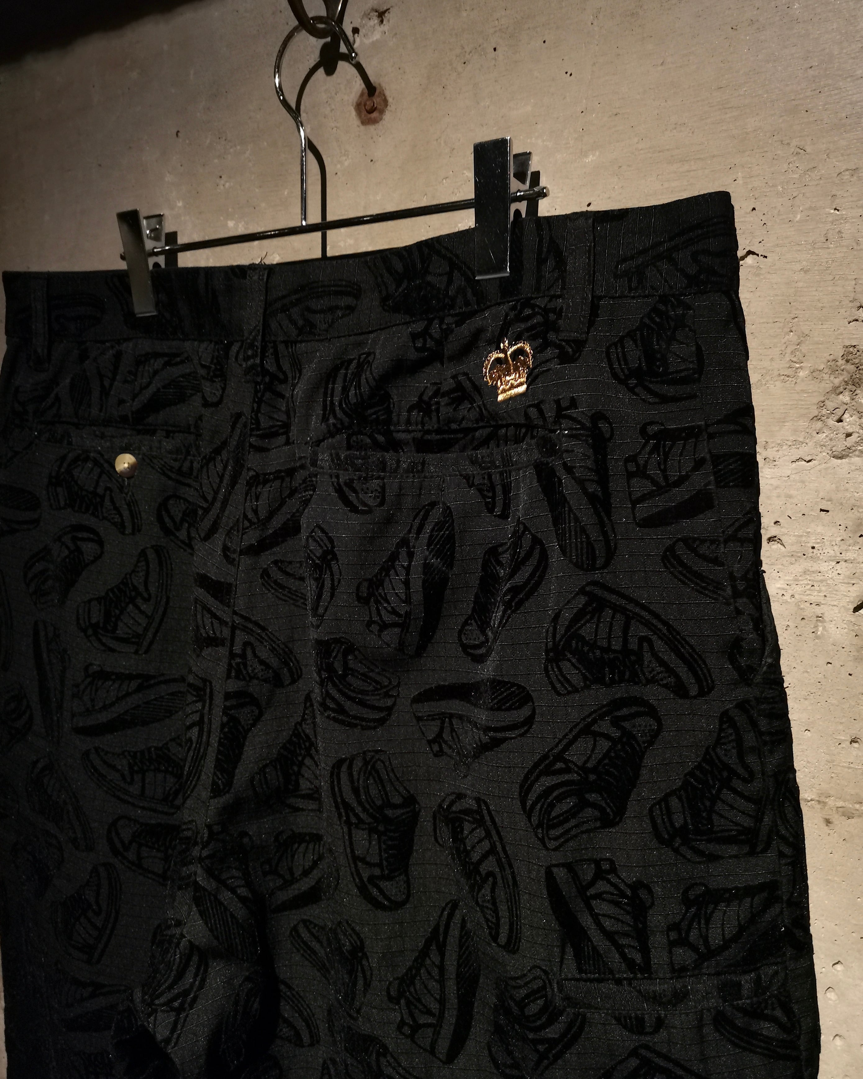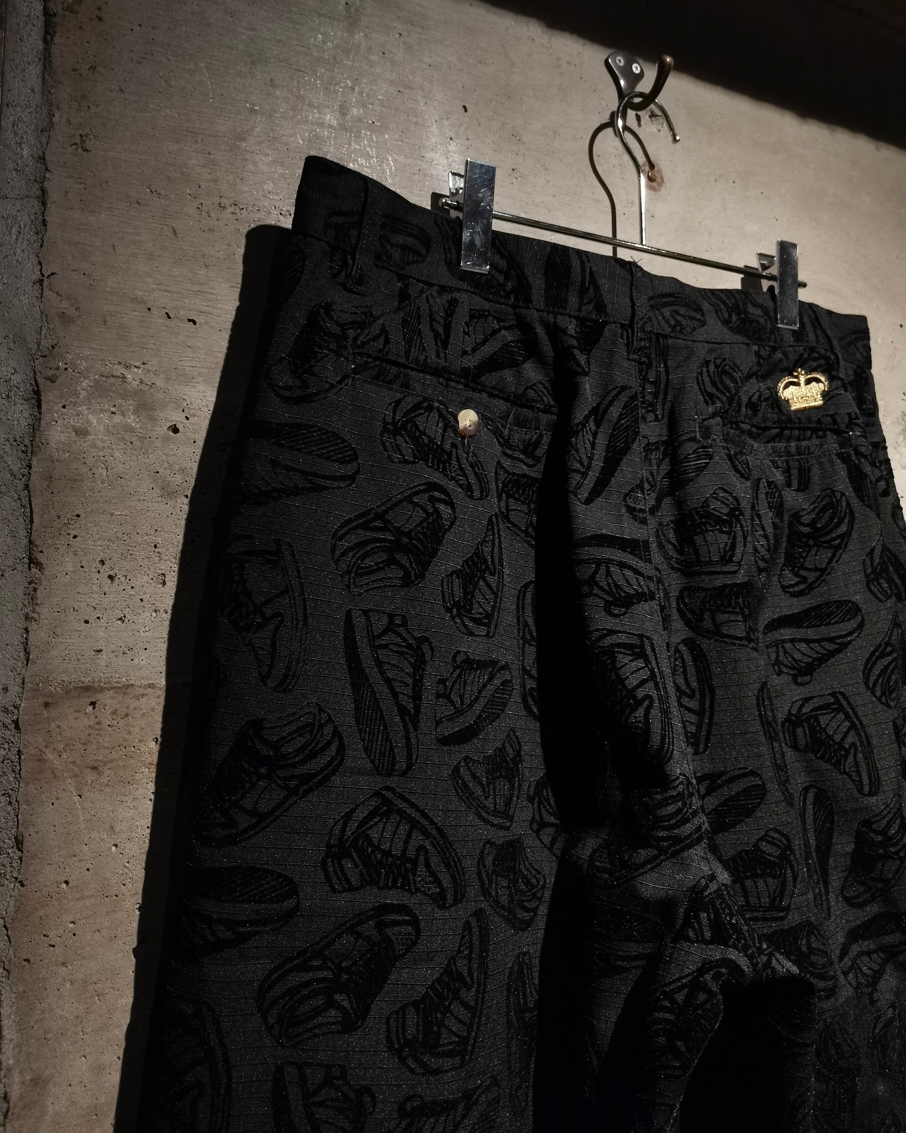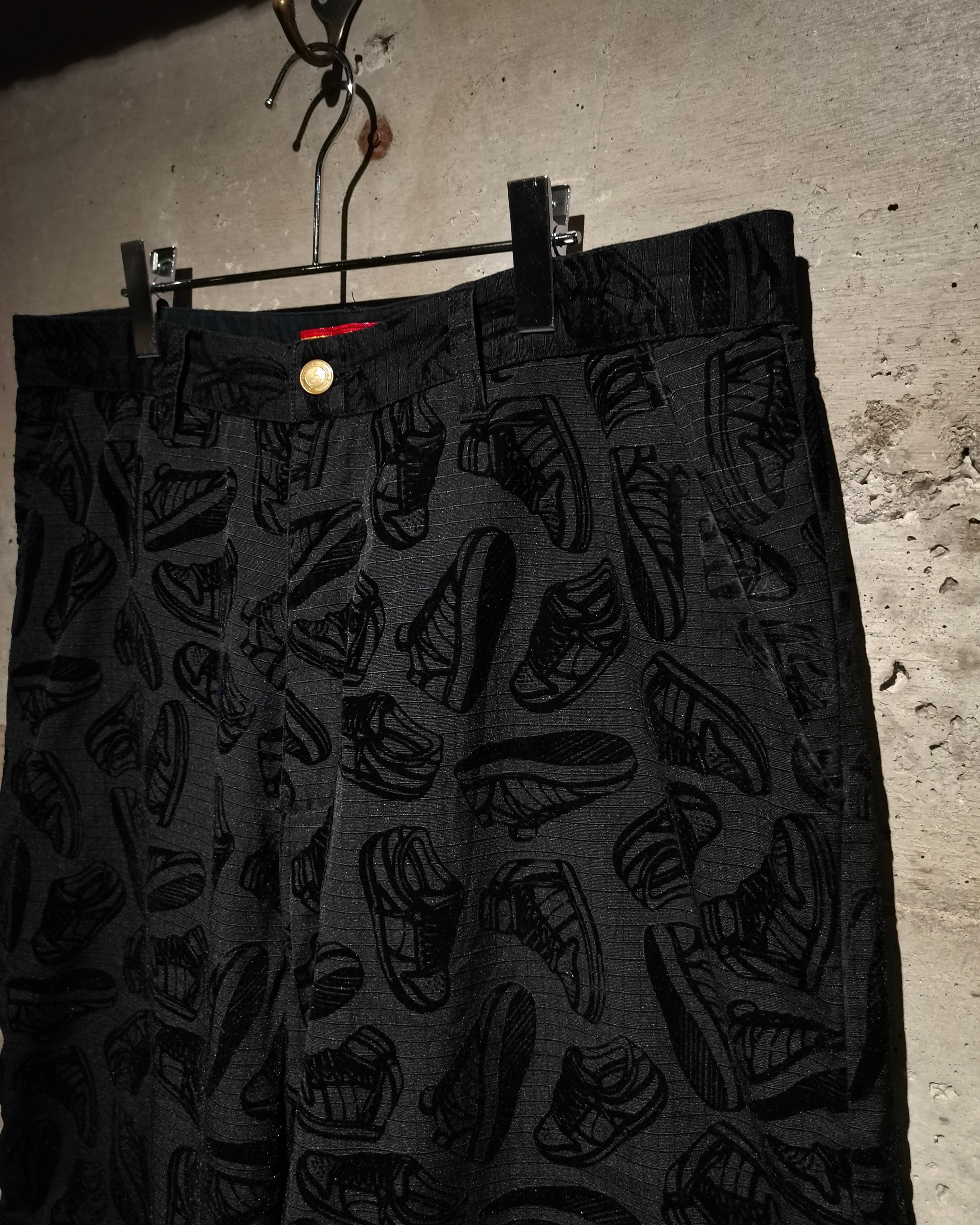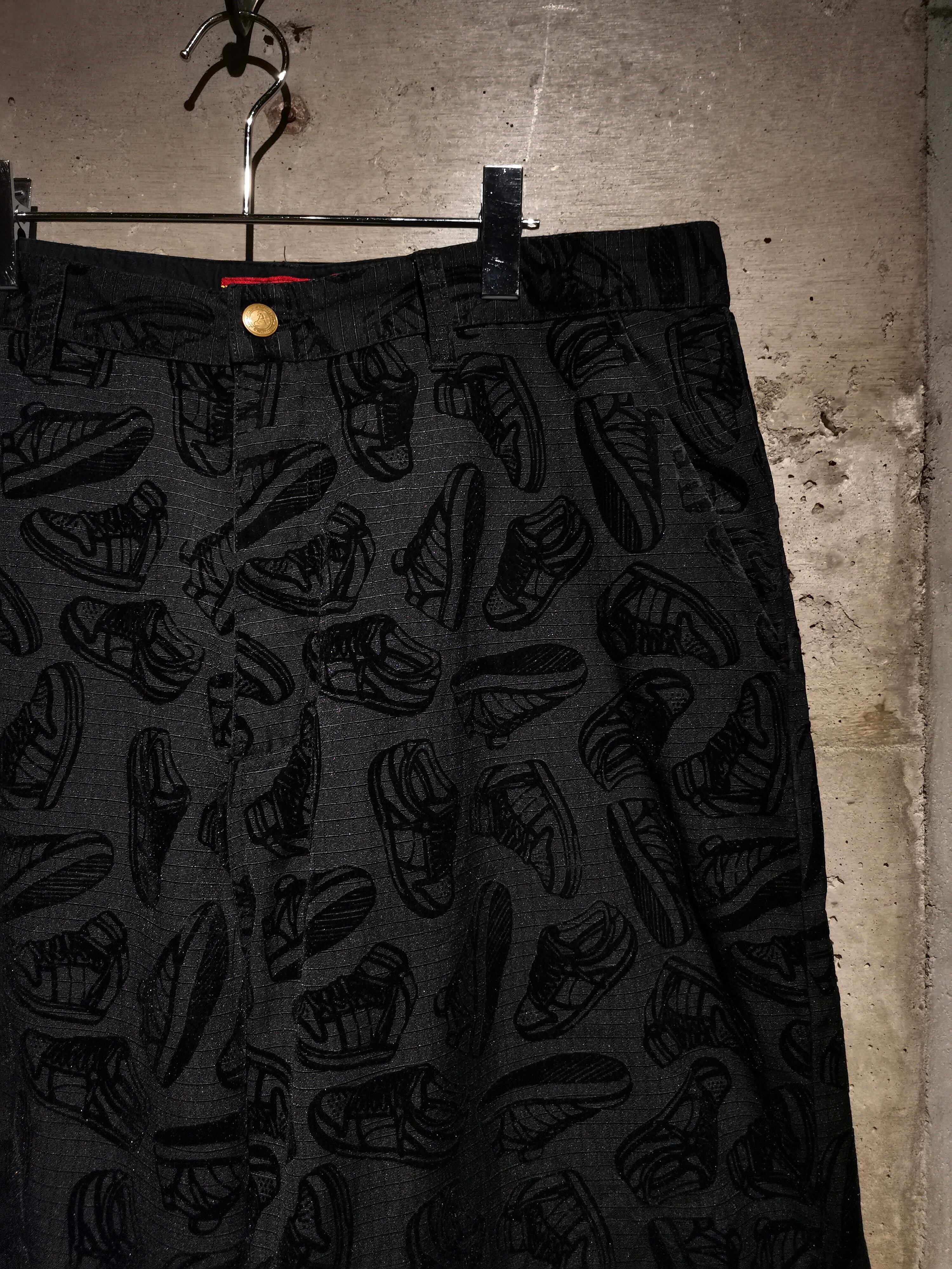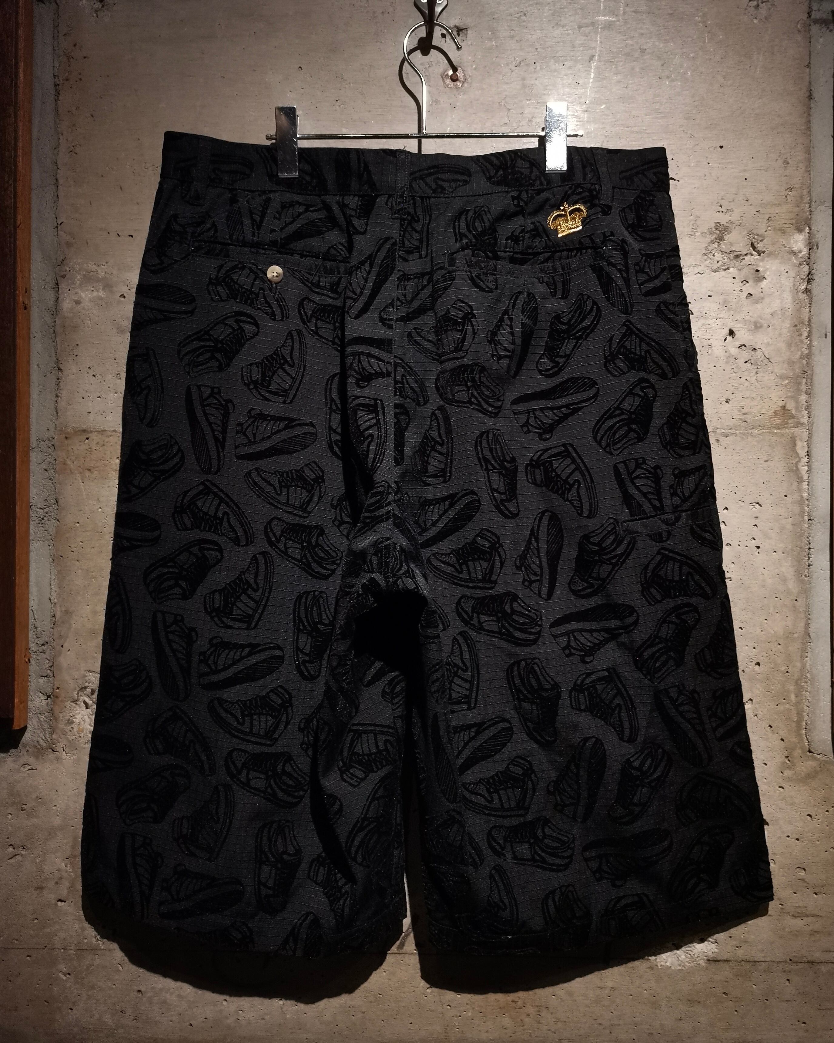 タフかつ強度の高いリップストップ生地のボディに、フロッキープリントでスニーカーを全面に載せたバギーショーツ。