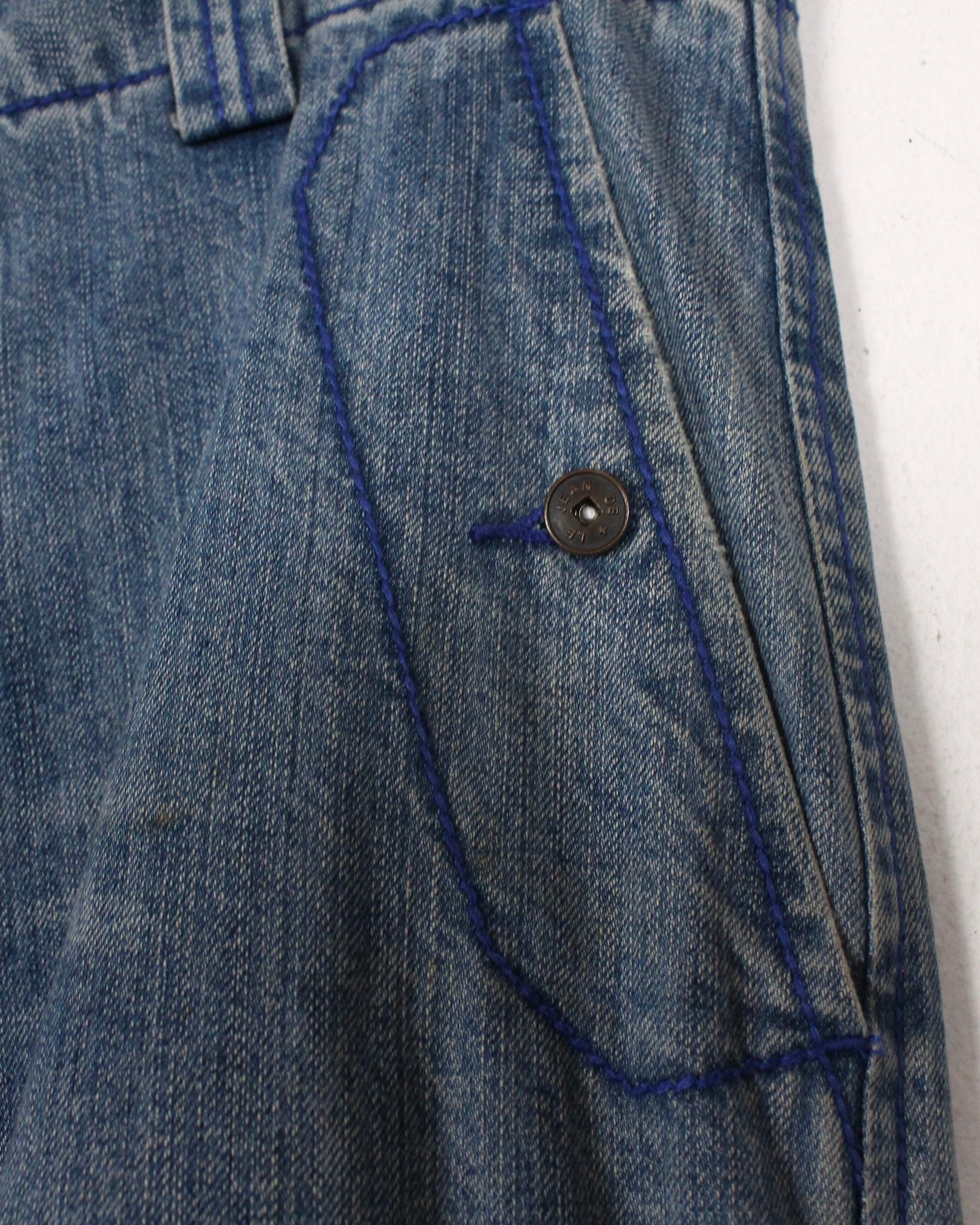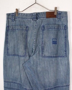 ベルクロが施されたシャトルパンツが有名な当ブランドですが、そちらをモチーフにフェード感の良いブルーのデニムをベースに、ブランドロゴを太腿、裾部分に刺繍で刻んだバギーデニム。