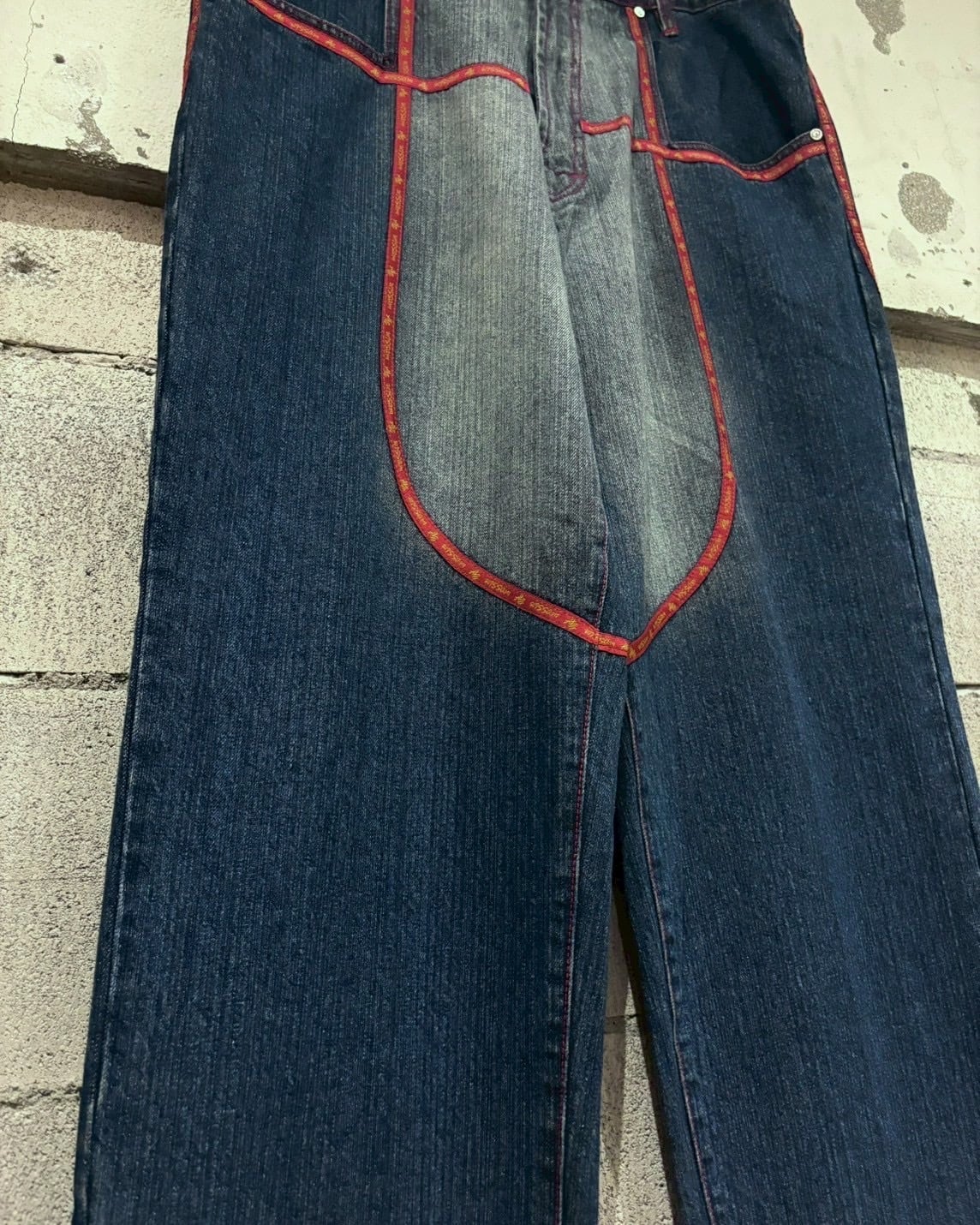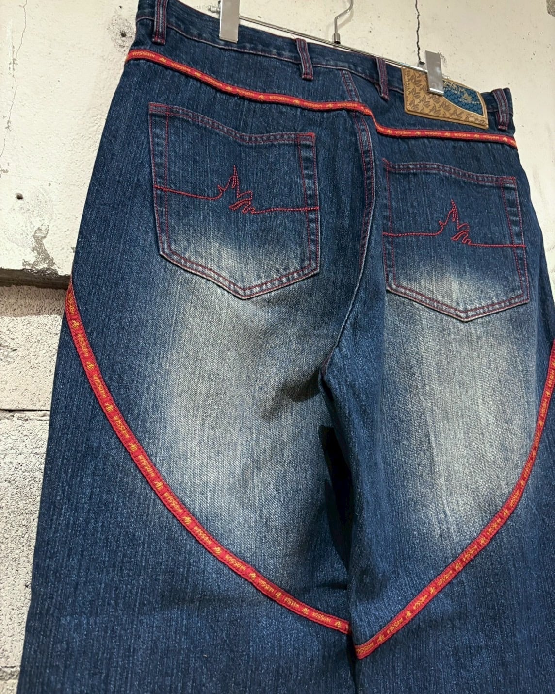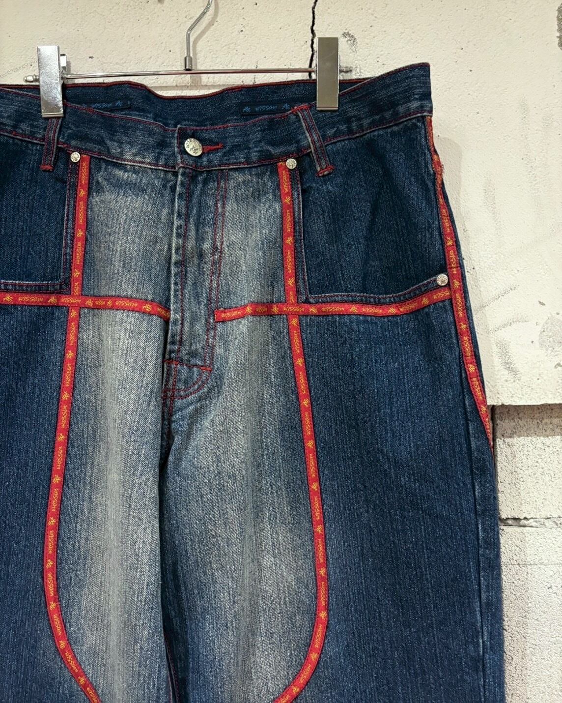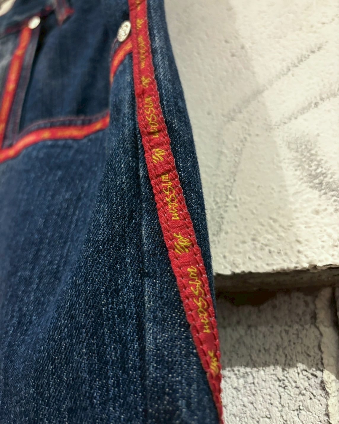 フェード加工が施された、美しい表情を見せるインディゴデニムをボディに使用し、ブランドロゴを載せた赤のラインを張り巡らせたバギーデニム。