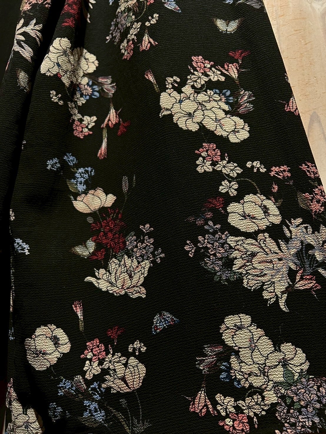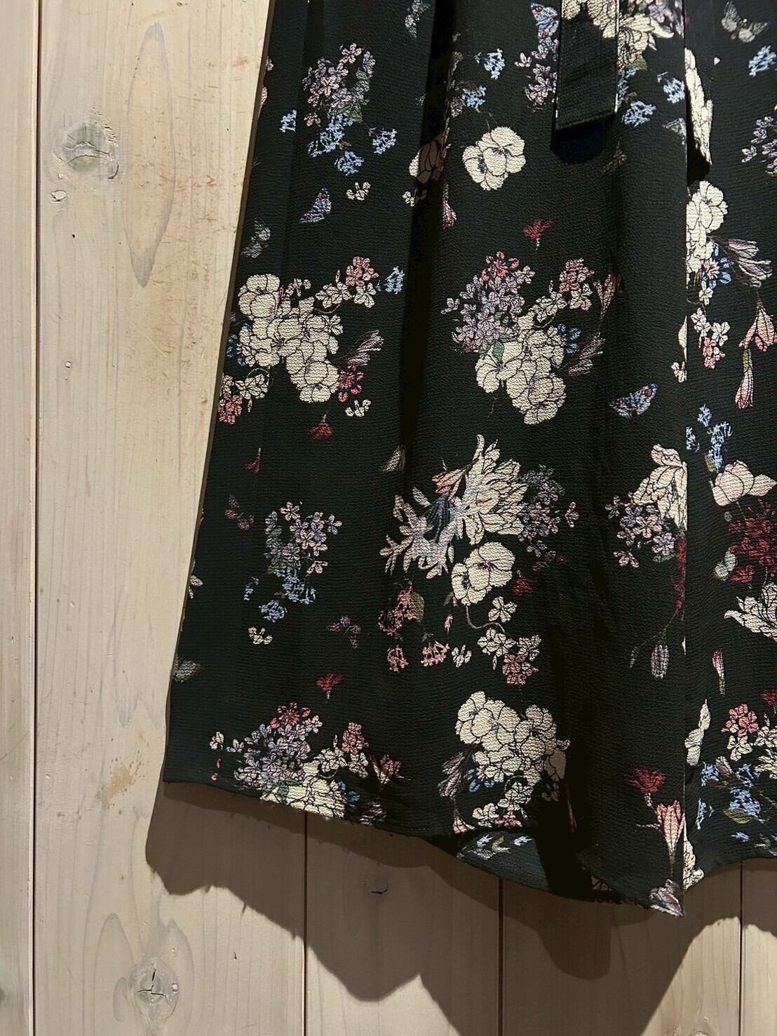 黒のボディに繊細に描かれた花々が美しく映え、生地感も相まってどこか和な雰囲気も感じられます。