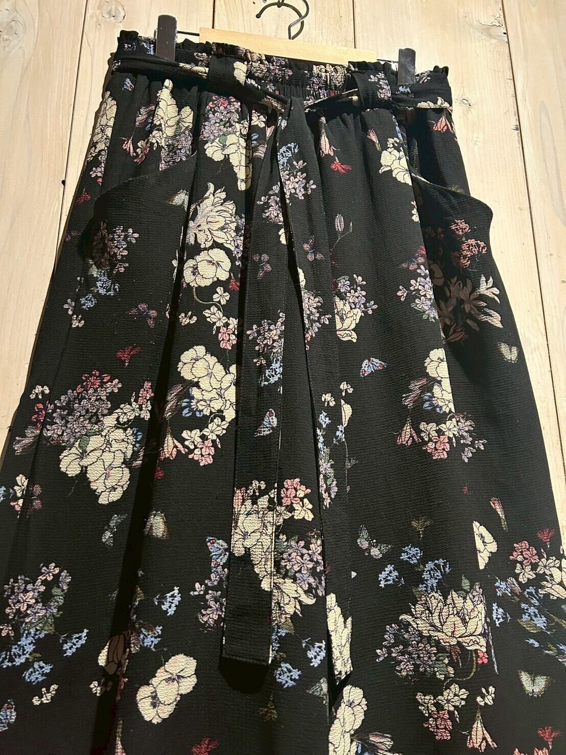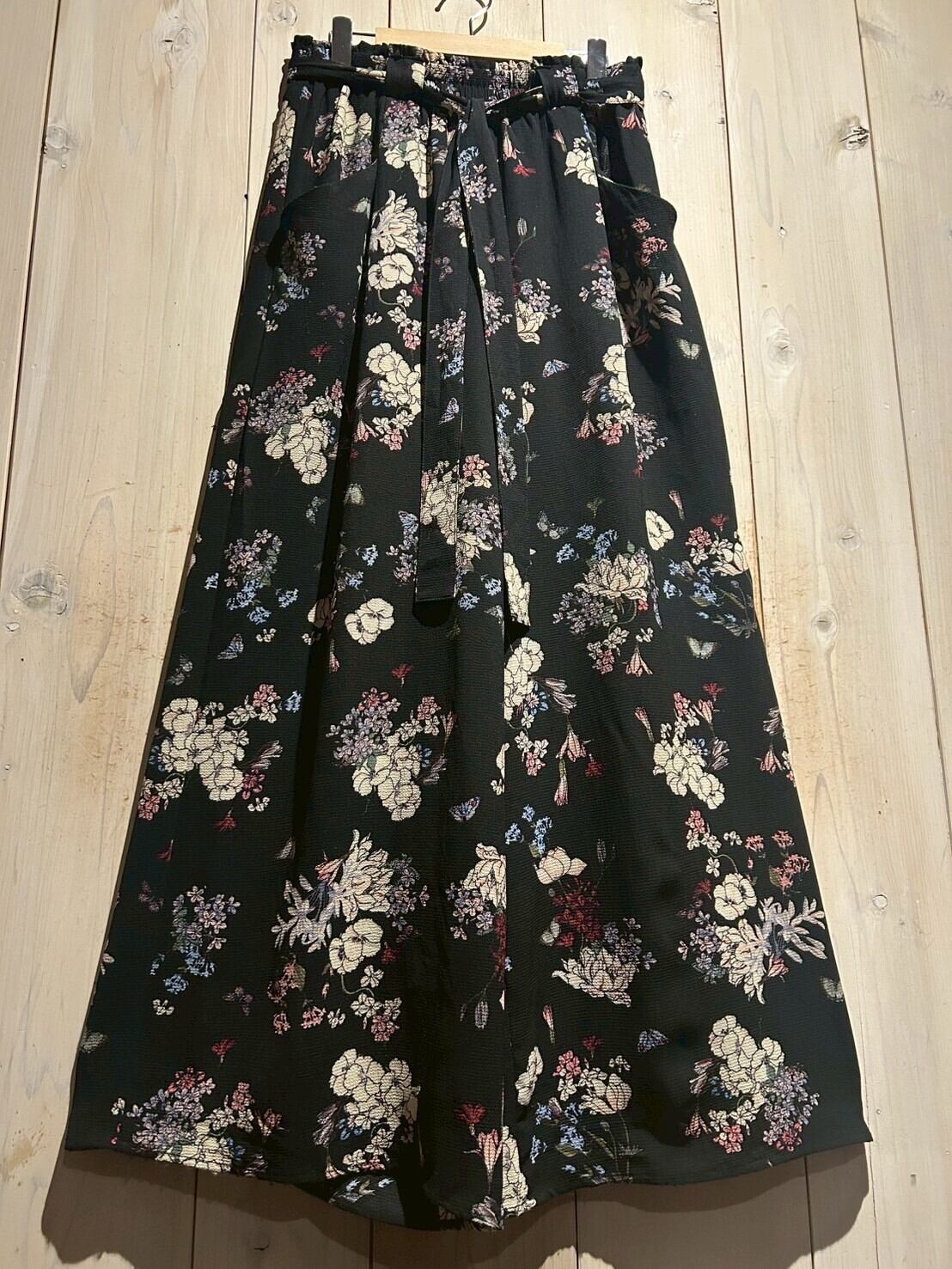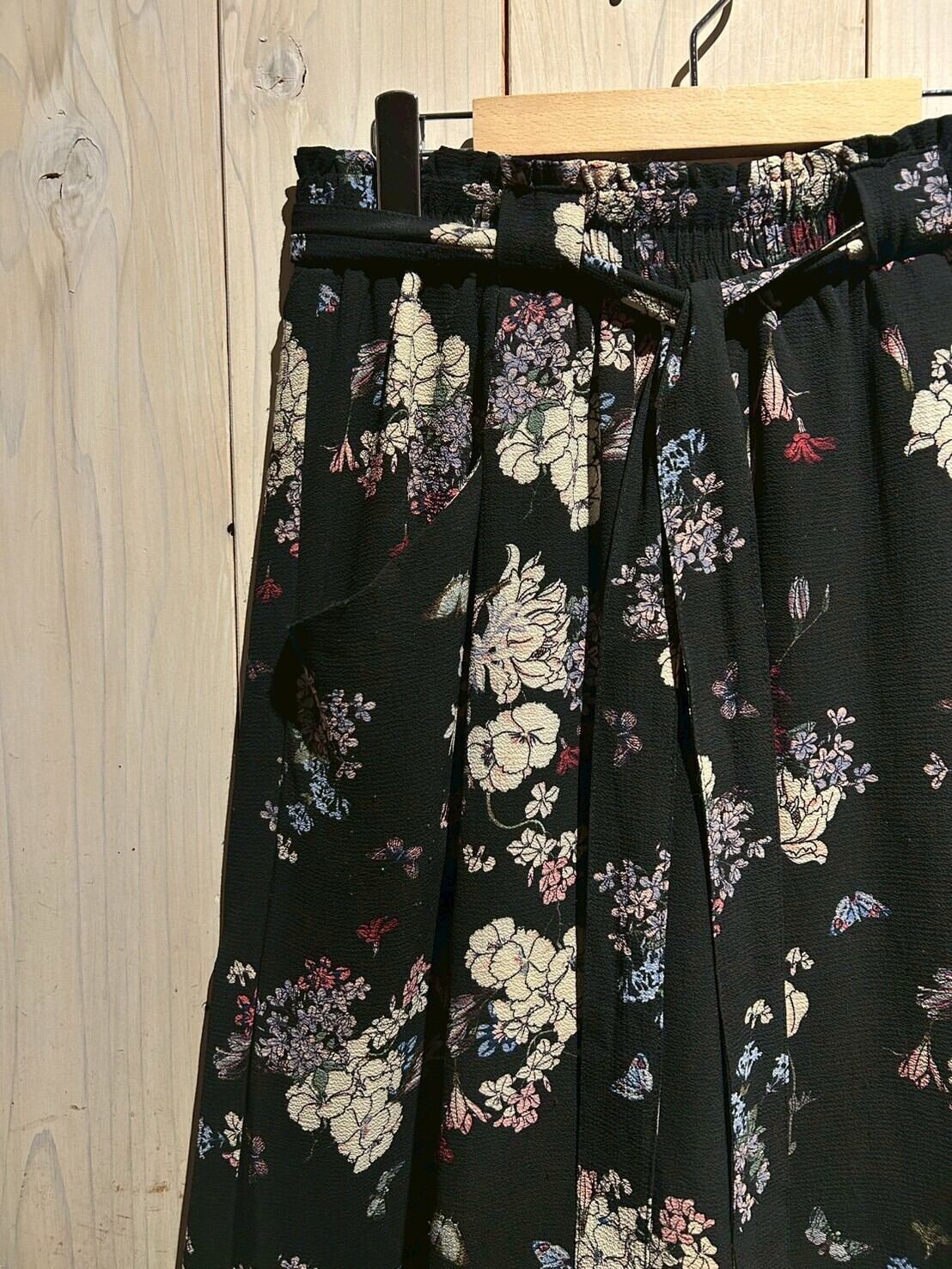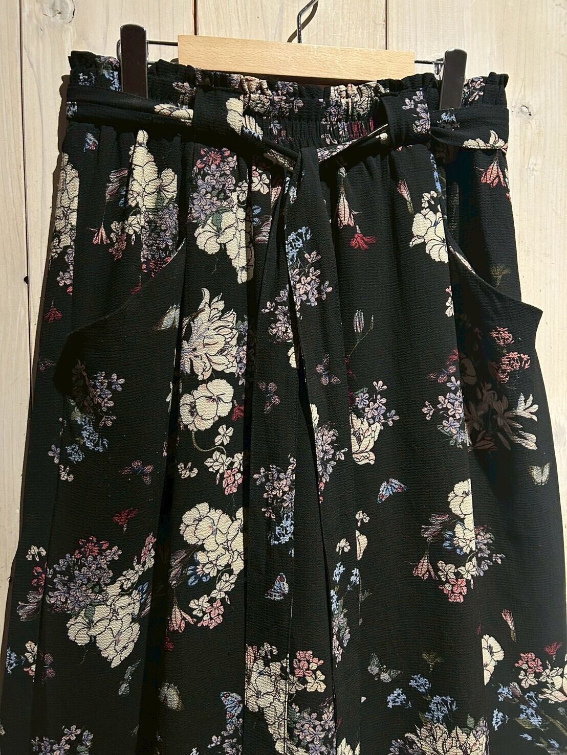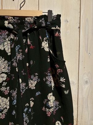 ブラックのボディをベースに、可憐な花を散りばめたワイドパンツ。