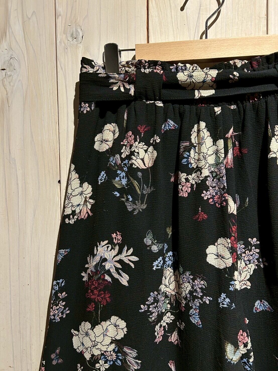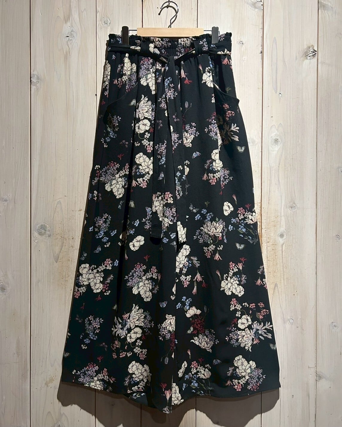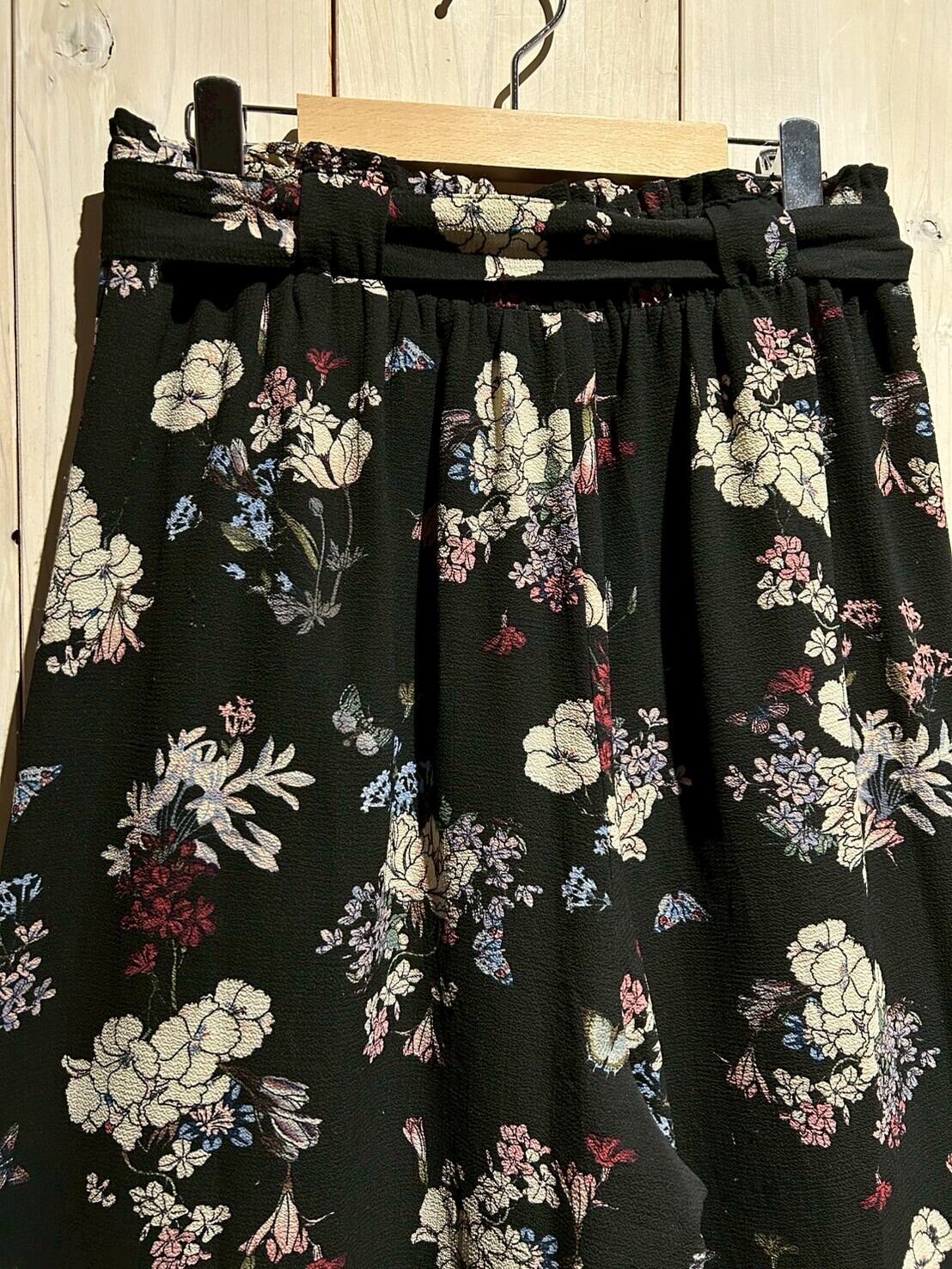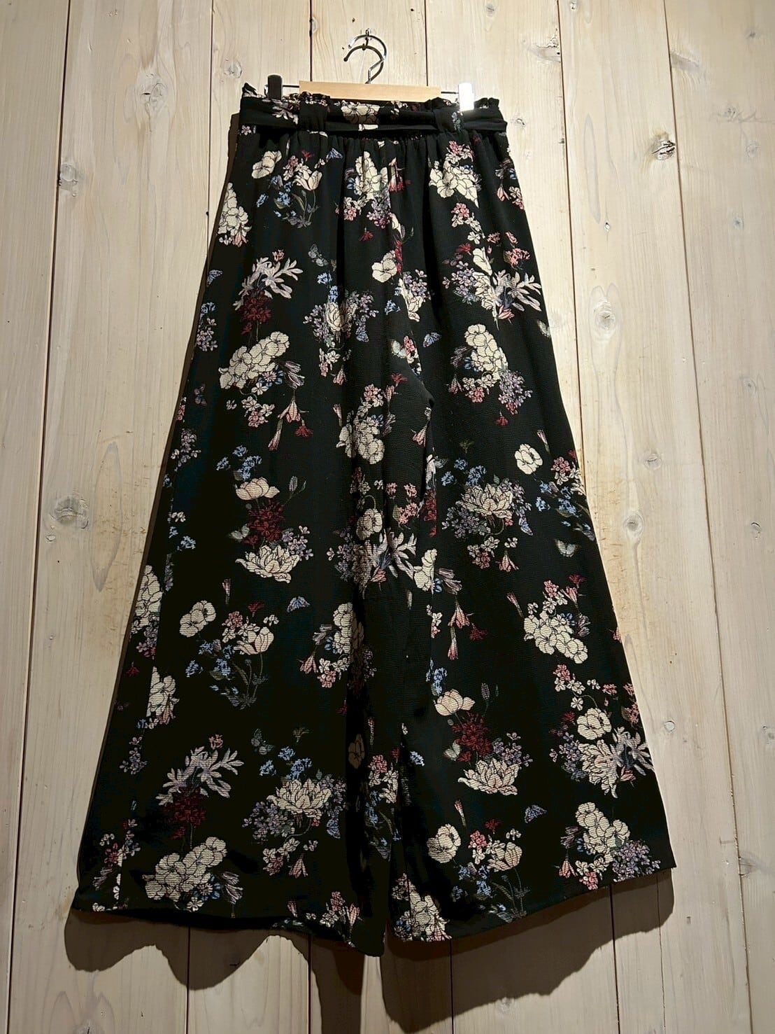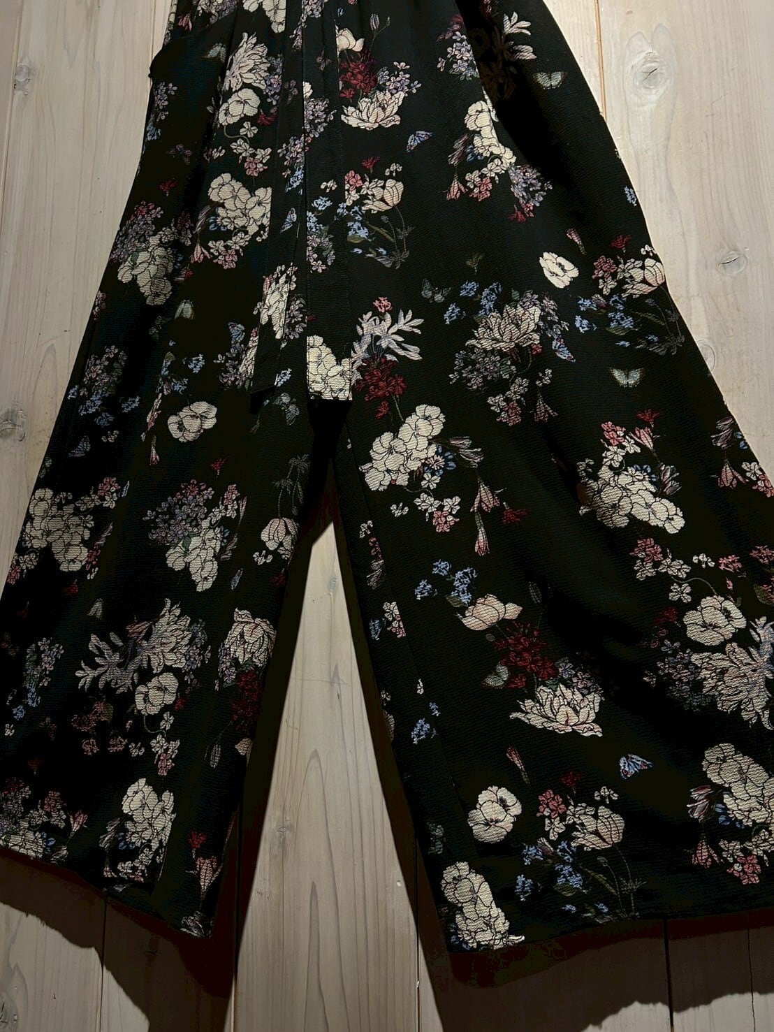 ブラックのボディをベースに、可憐な花を散りばめたワイドパンツ。