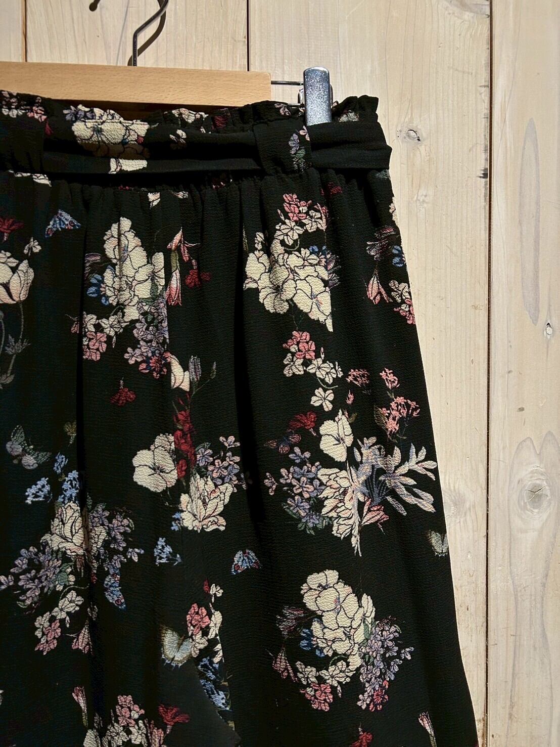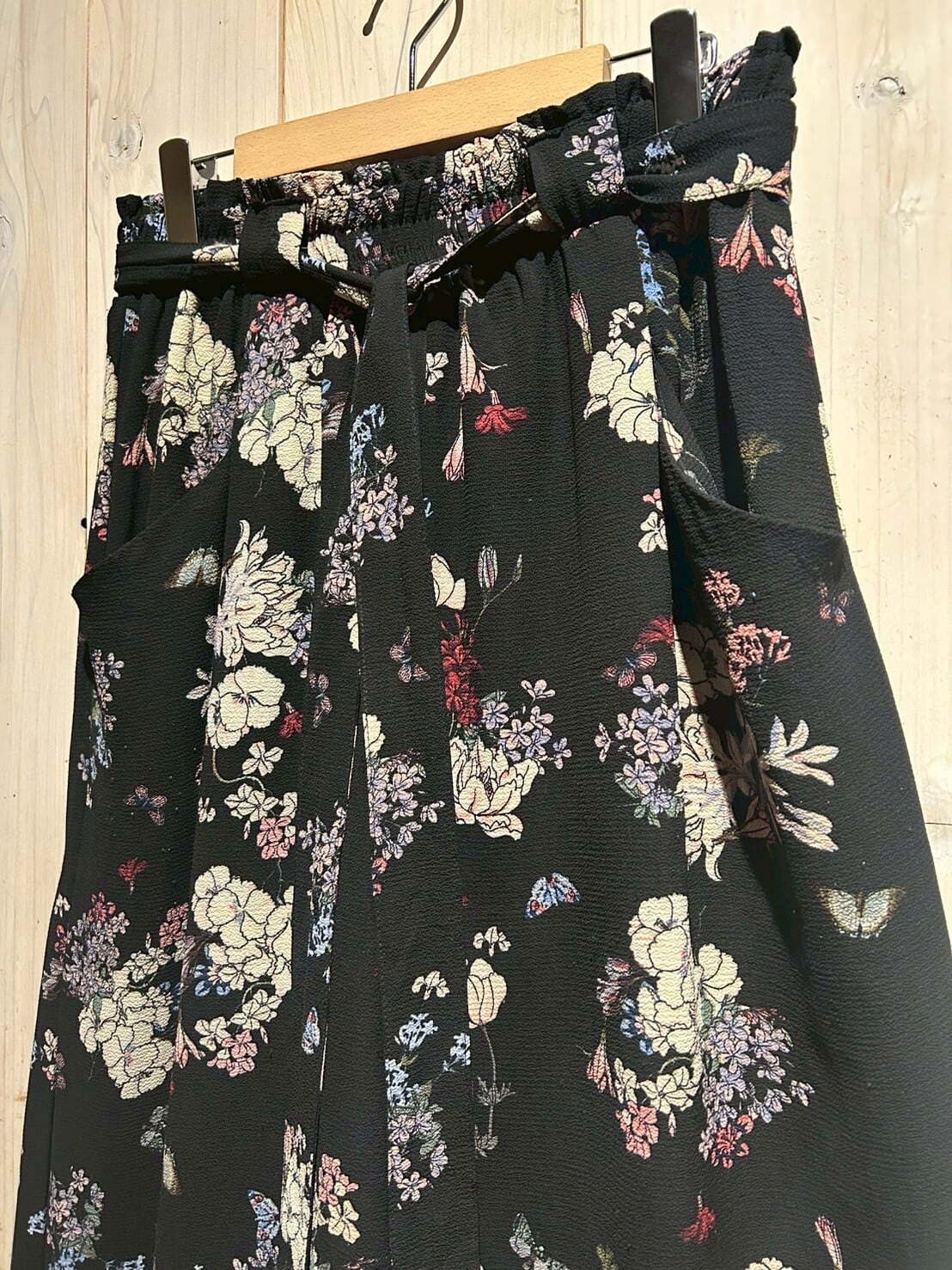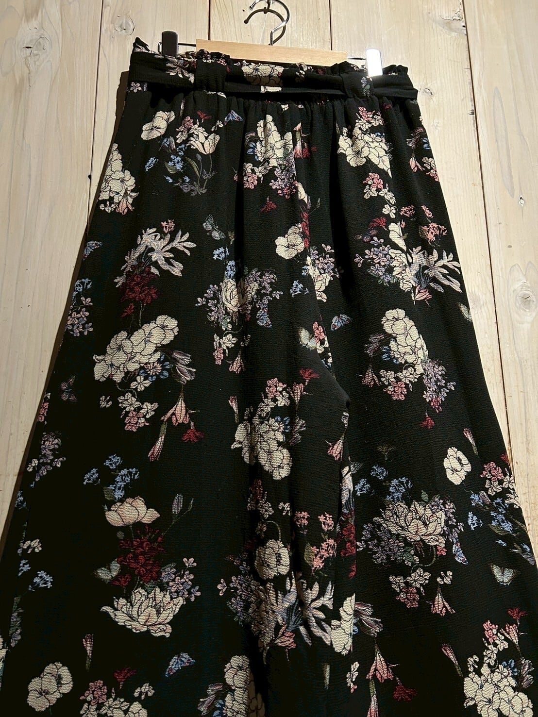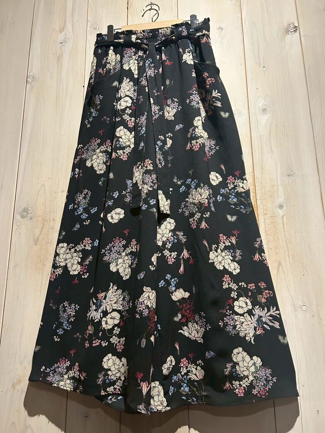 ブラックのボディをベースに、可憐な花を散りばめたワイドパンツ。