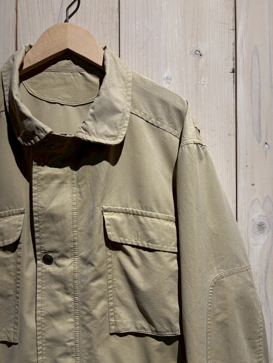 シャリ感のあるベージュのボディに、ファイヤーマンバックルや複数ポケットを載せた、機能性に富んだジャケット。