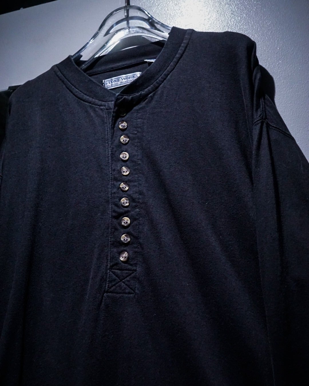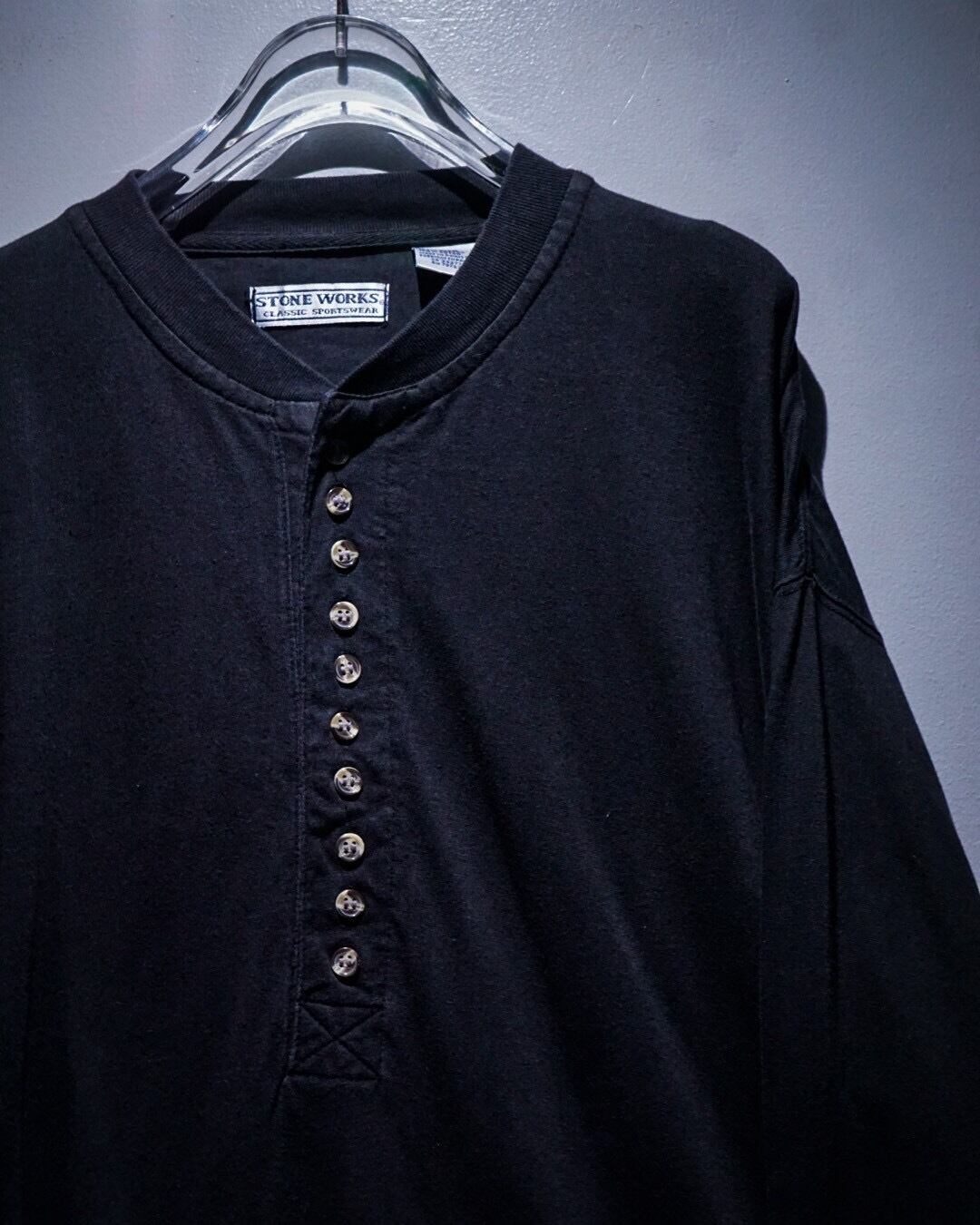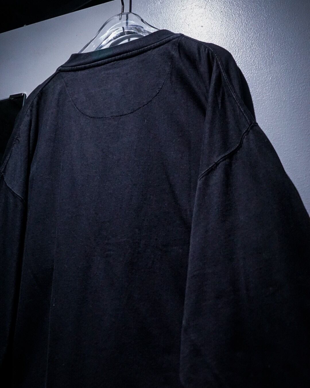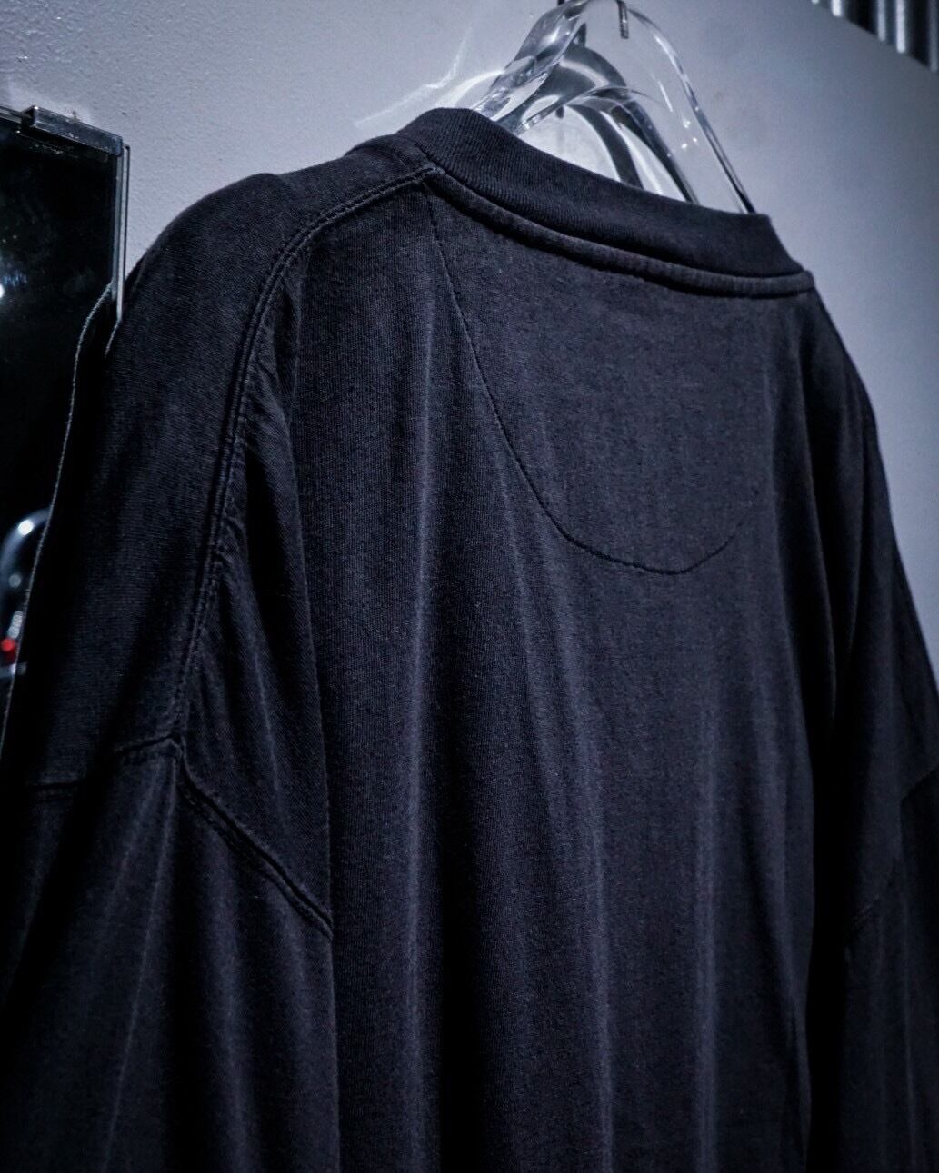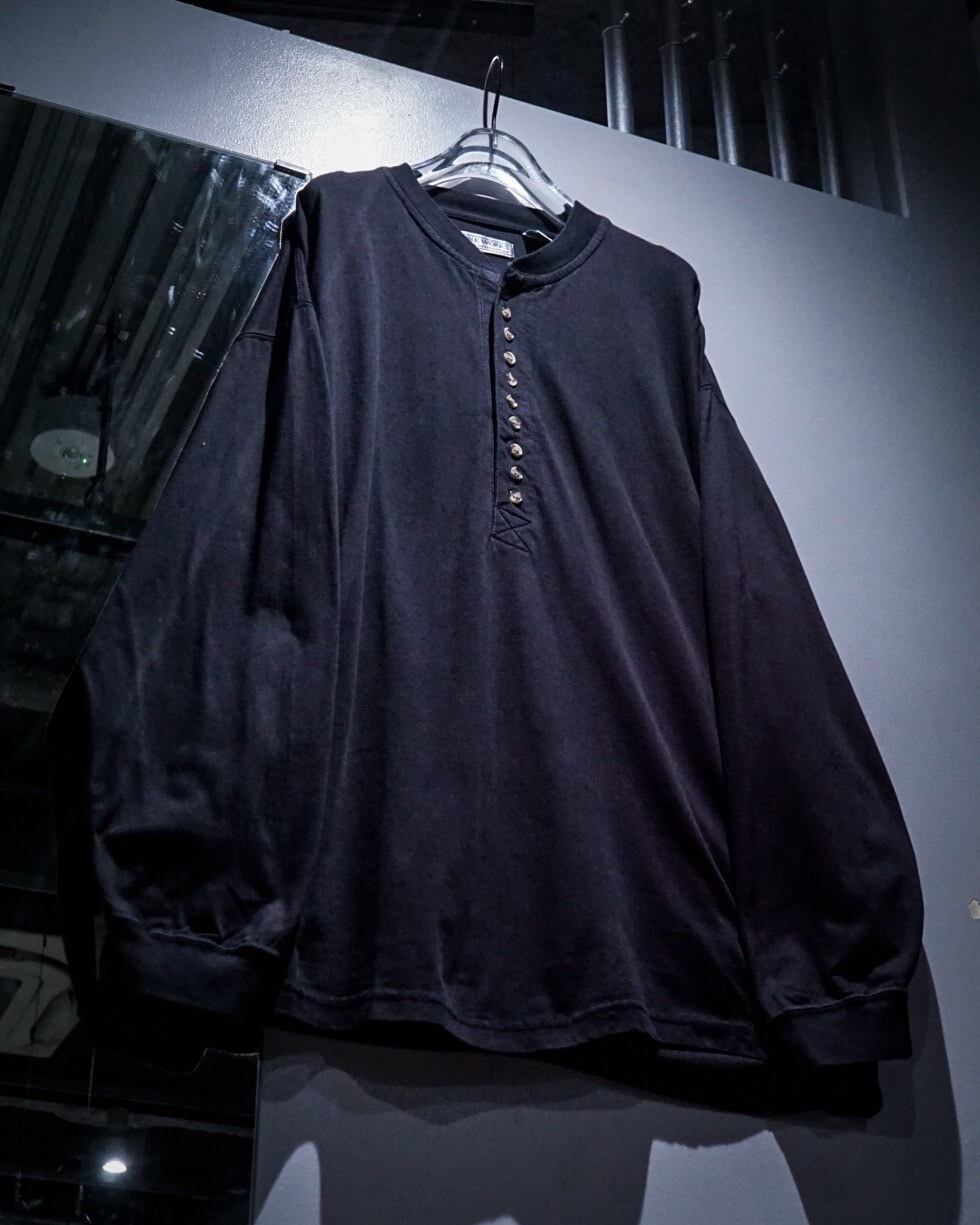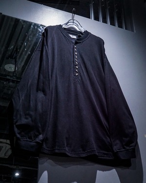 肌触りの良いコットンを用いたブラックのボディに、首元に多数のボタンを施したロンT。