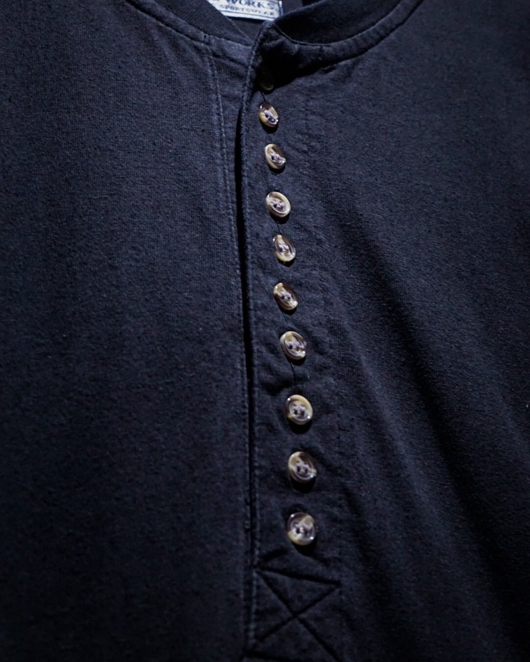 首元がヘンリーネックでスッキリとミニマルな仕上がり。シンプルなデザインが故にボタンのディテールが引き立てられています。