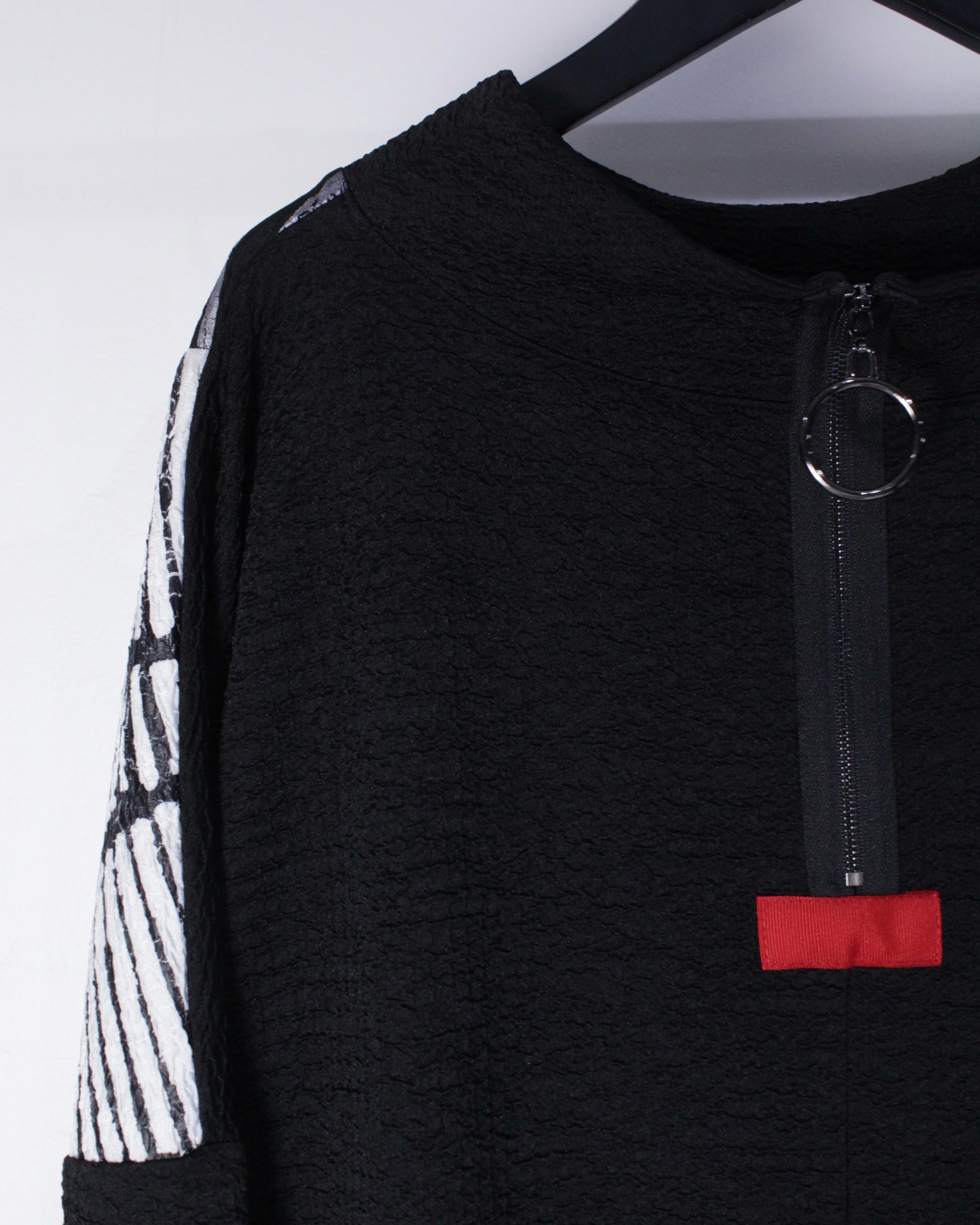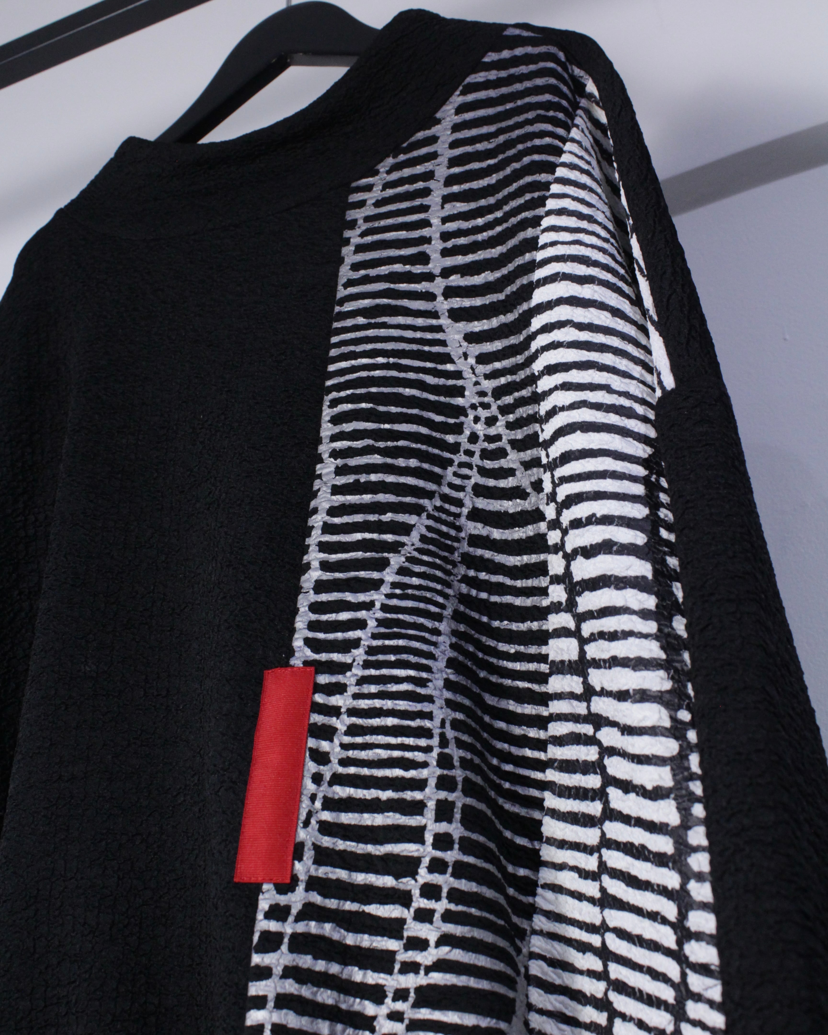 ブラックのボディをベースに、フロント左側にホワイトベースのアート柄を切り替えた長袖プルオーバー。