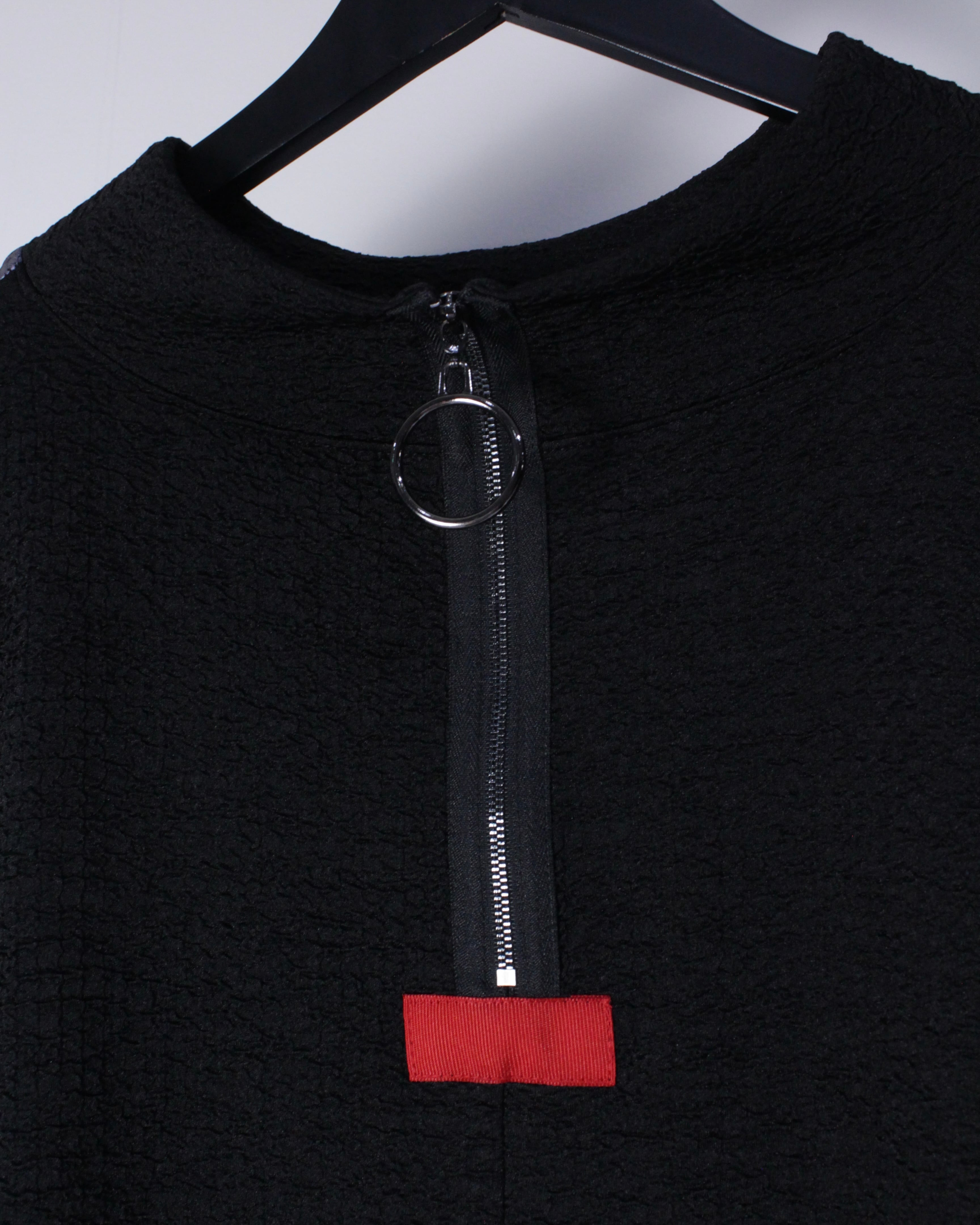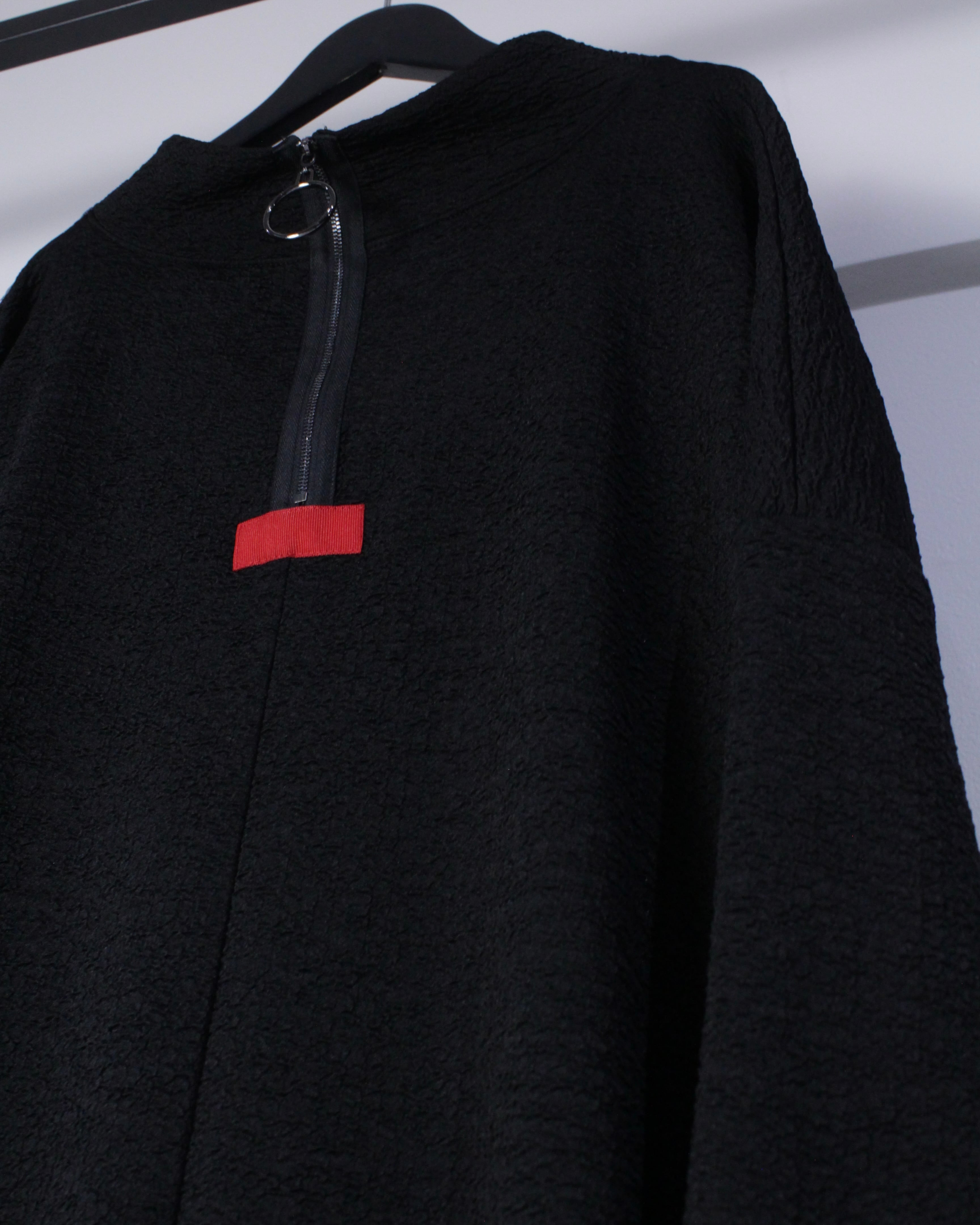 背面が珍しいハーフジップ仕様で、開けばレイヤードが楽々可能な上に、アクセサリー等の遊びを効かせられるのも嬉しいポイント。