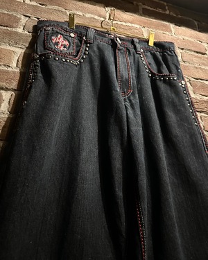 古着業界で稀少性が高まったブラックデニムをベースに、バックポケットに刺繍、スタッズの装飾を施したバギーパンツ。