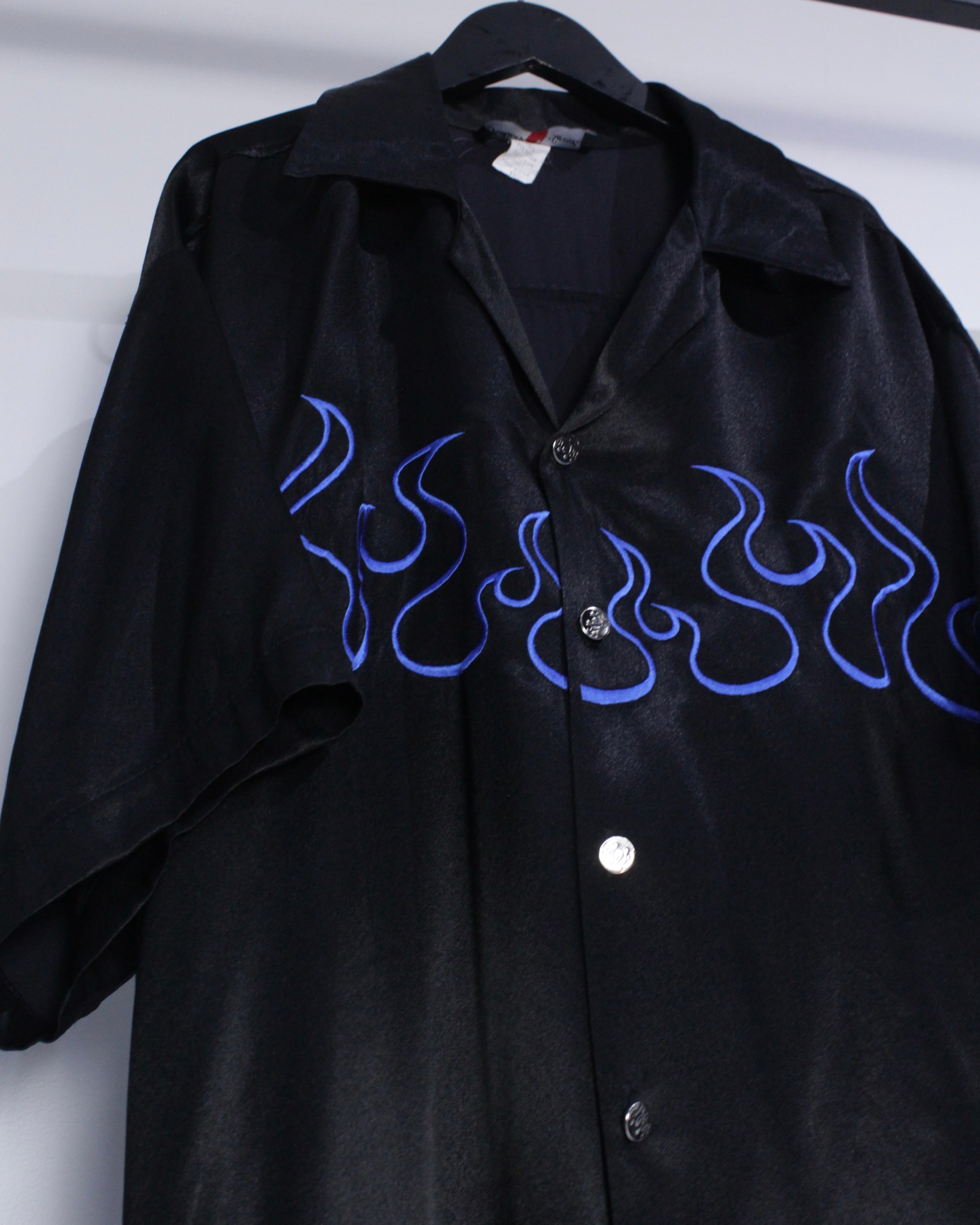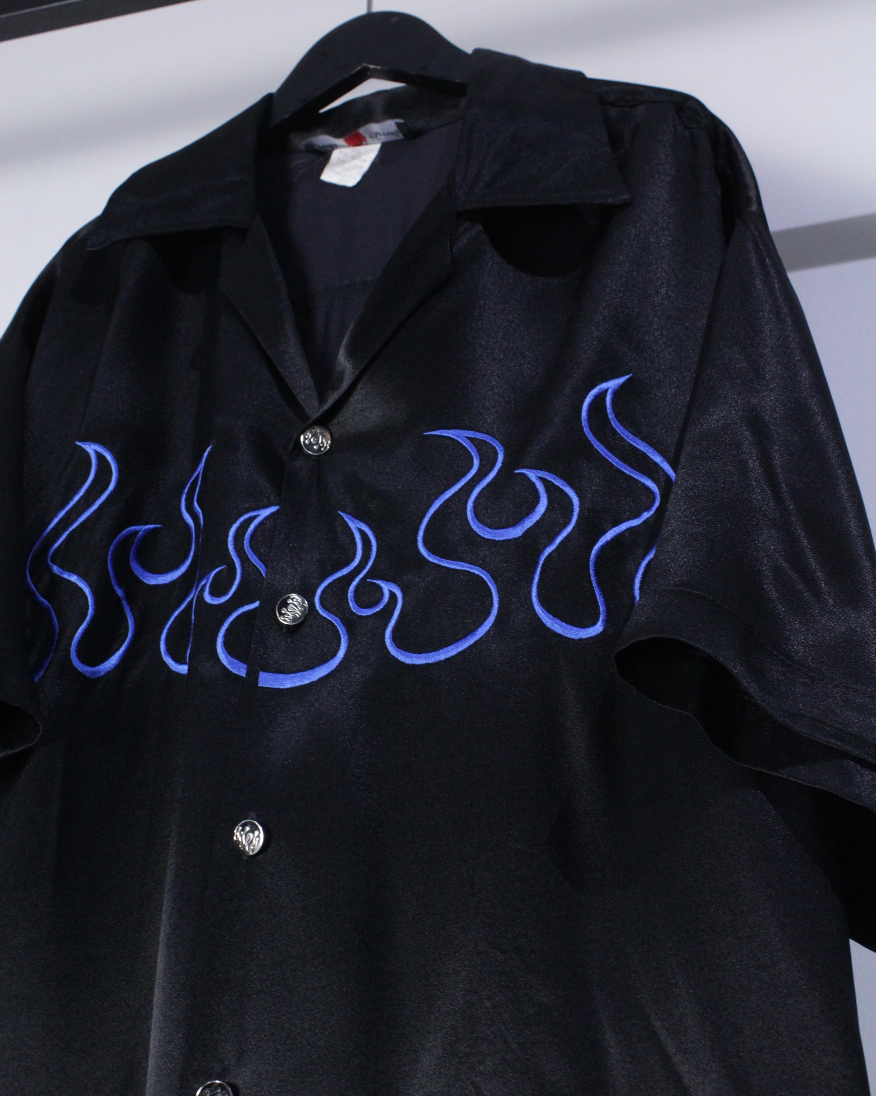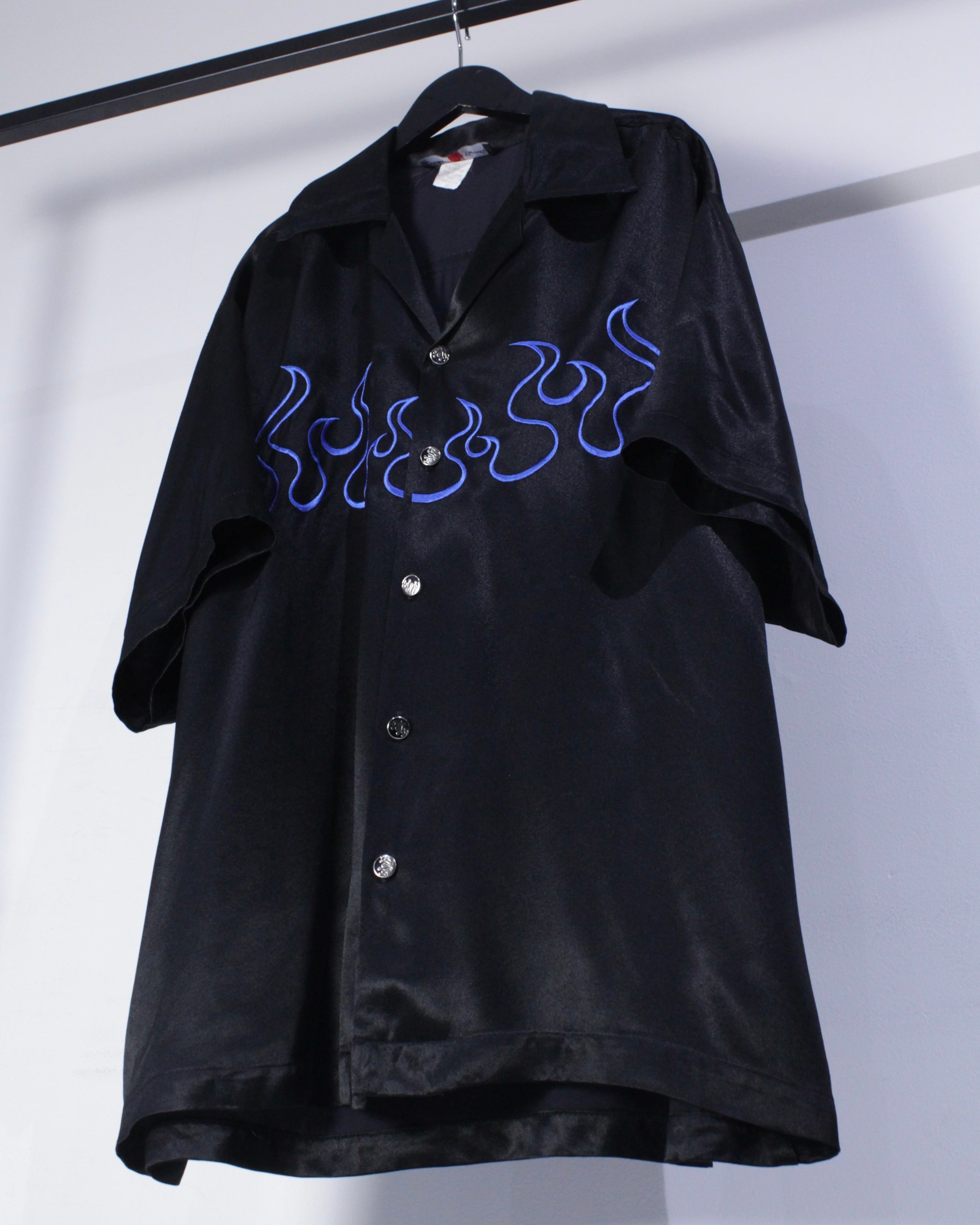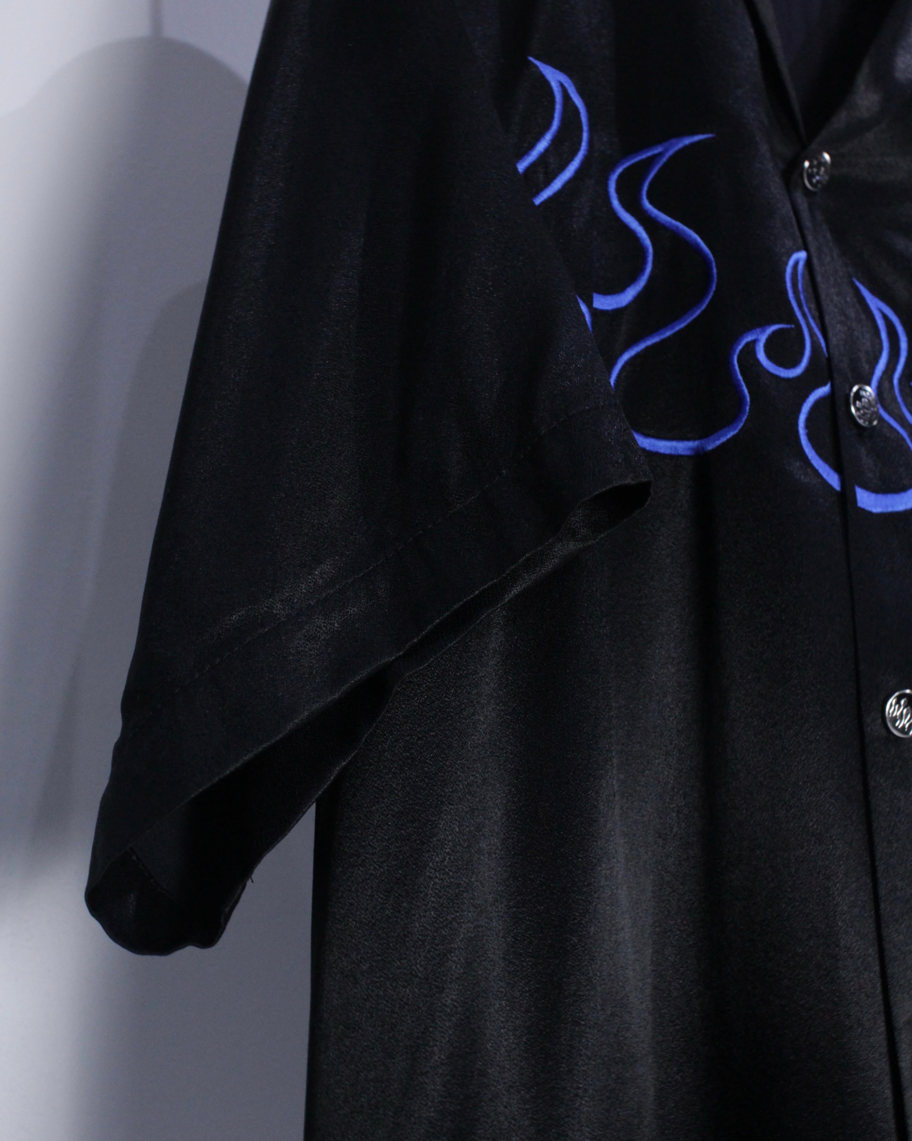 サテンのようなツルッとした質感で仕上げられた、美しい光沢を帯びたボディに、青の刺繍でファイヤーパターンを施した半袖シャツ。