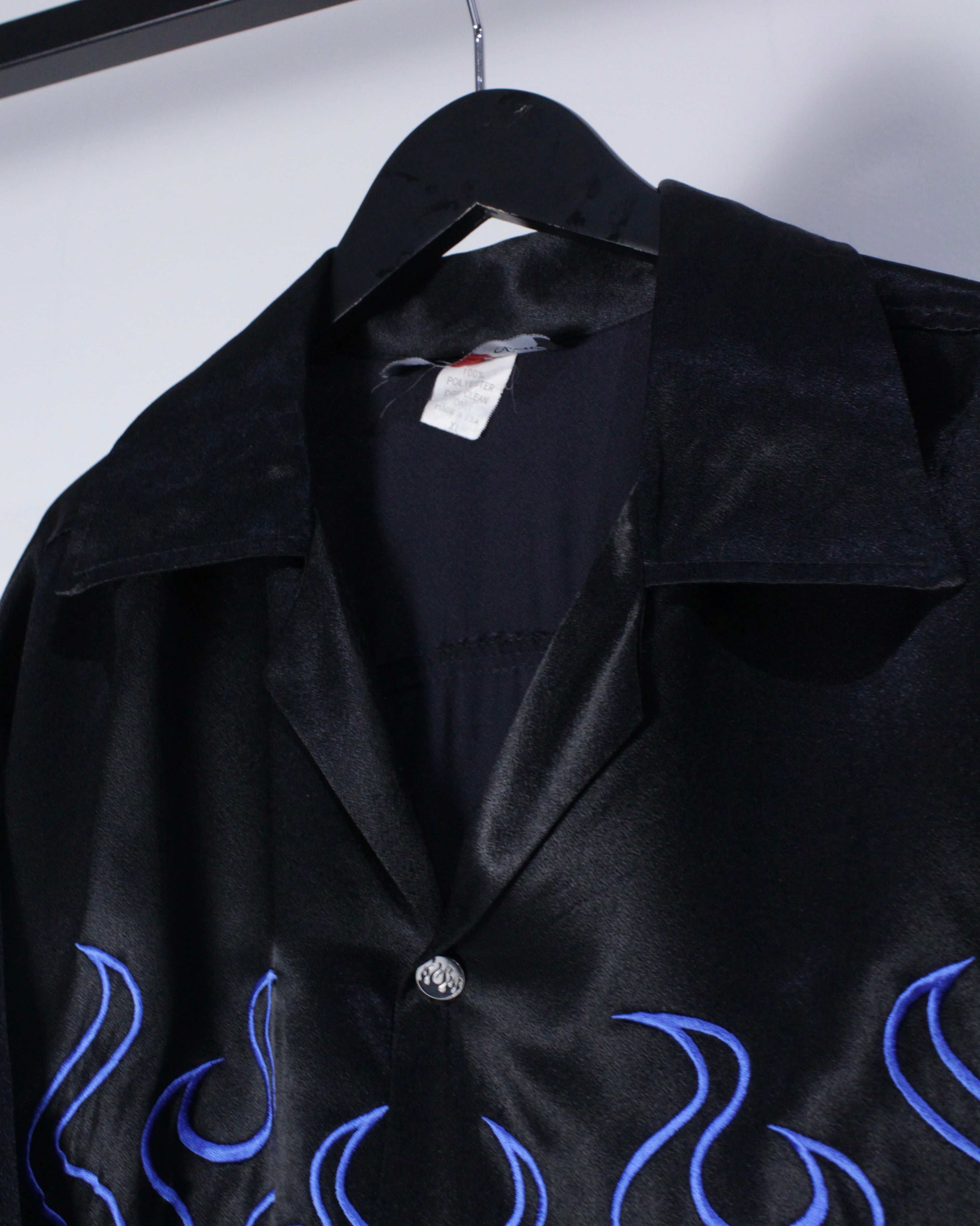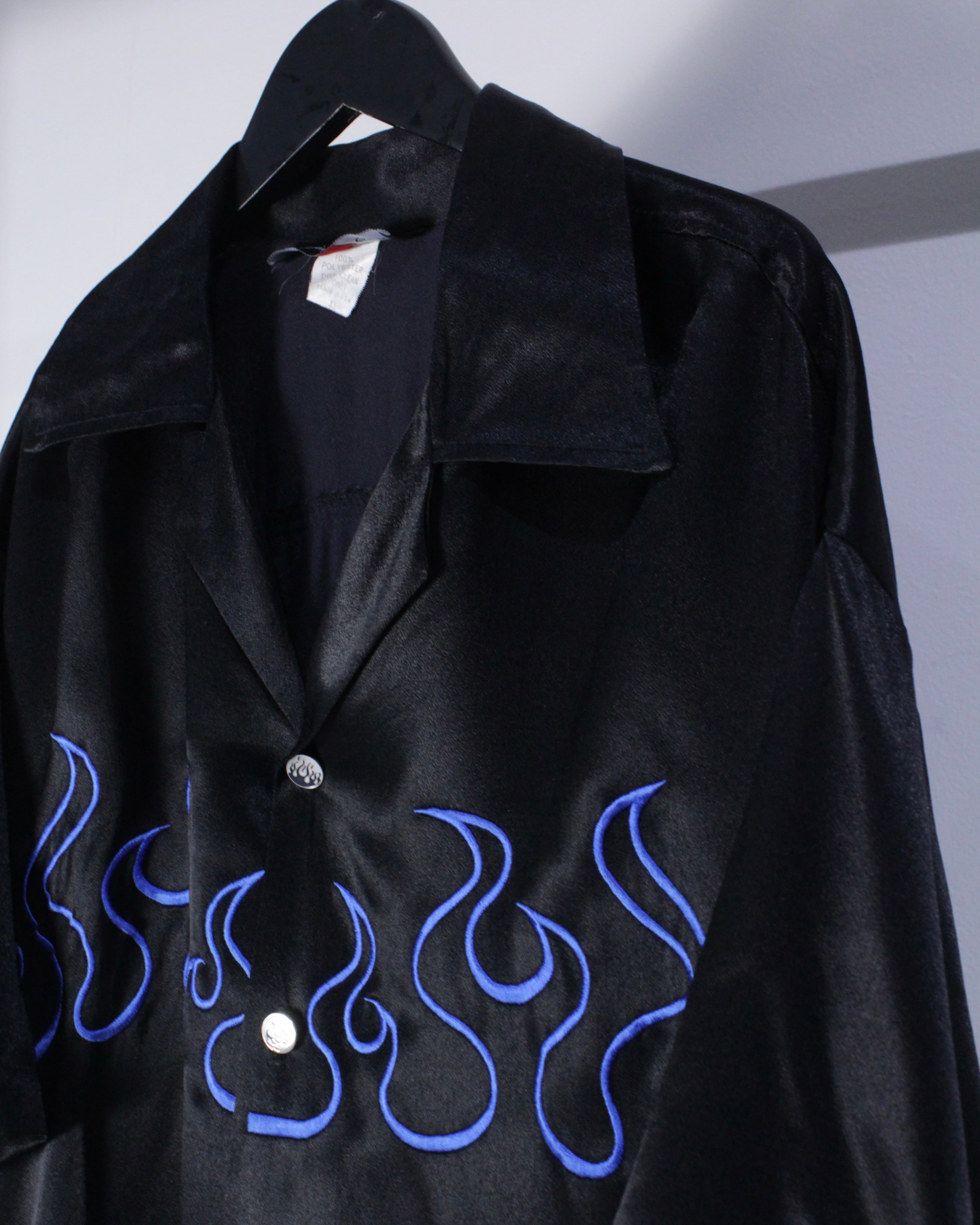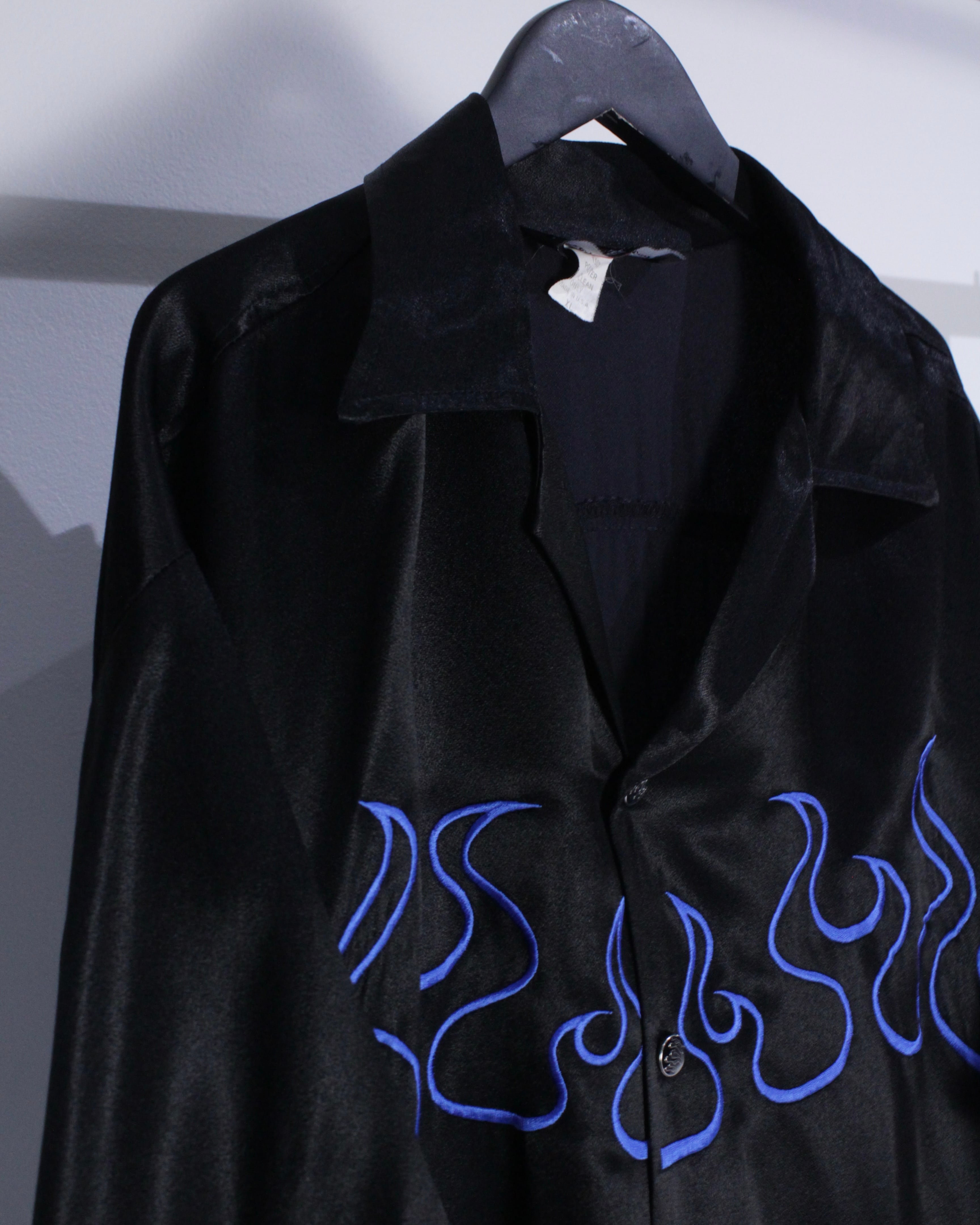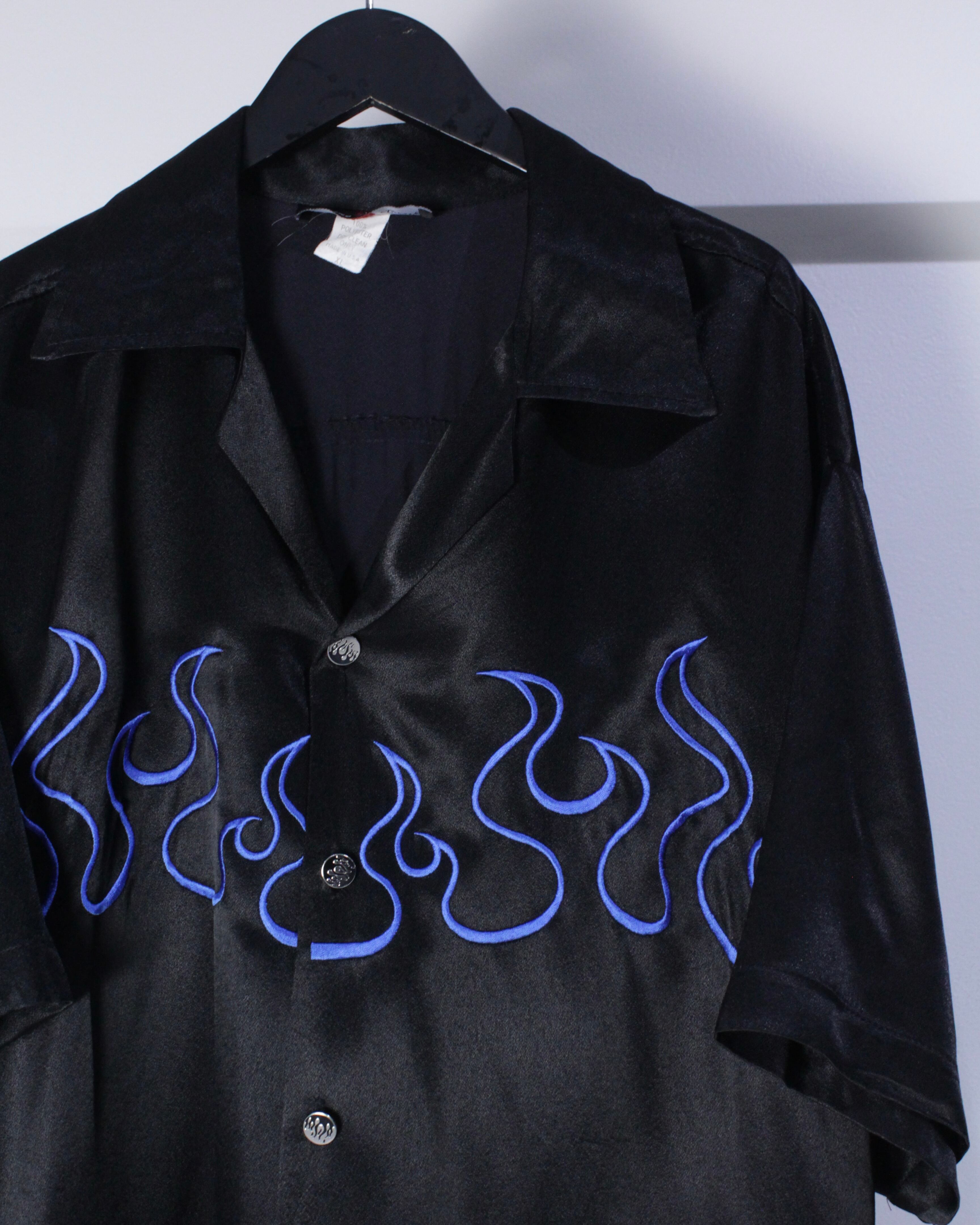 サテンのようなツルッとした質感で仕上げられた、美しい光沢を帯びたボディに、青の刺繍でファイヤーパターンを施した半袖シャツ。