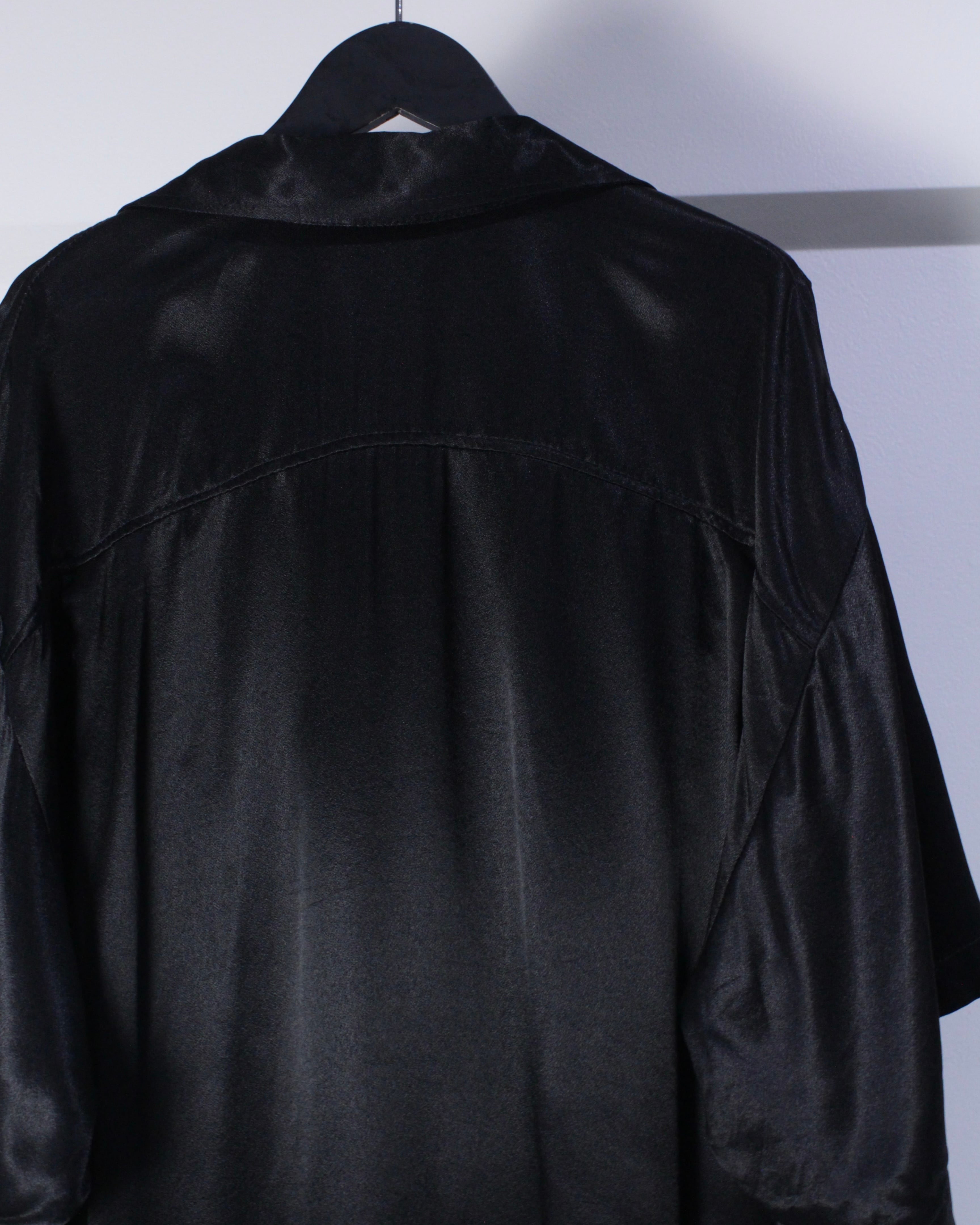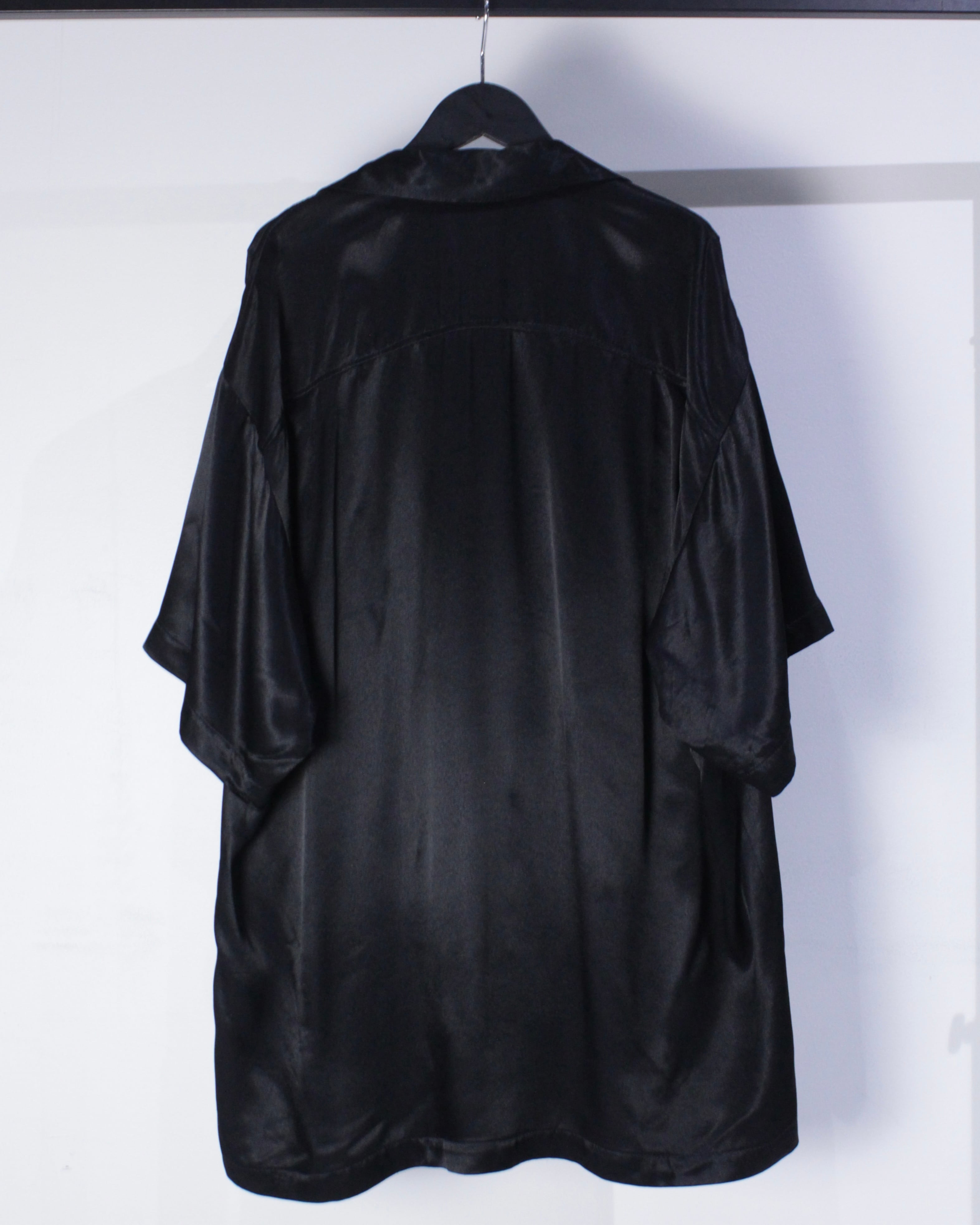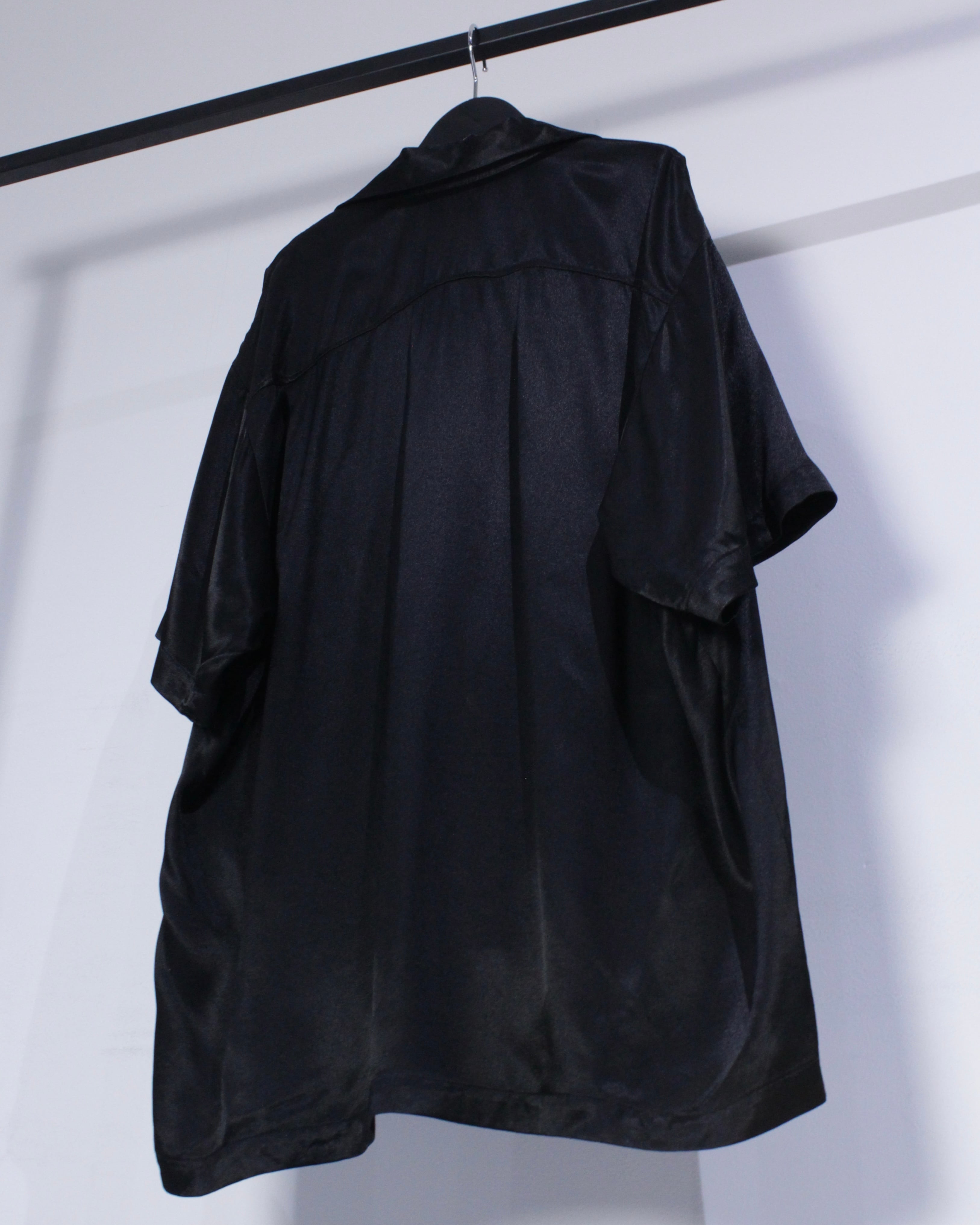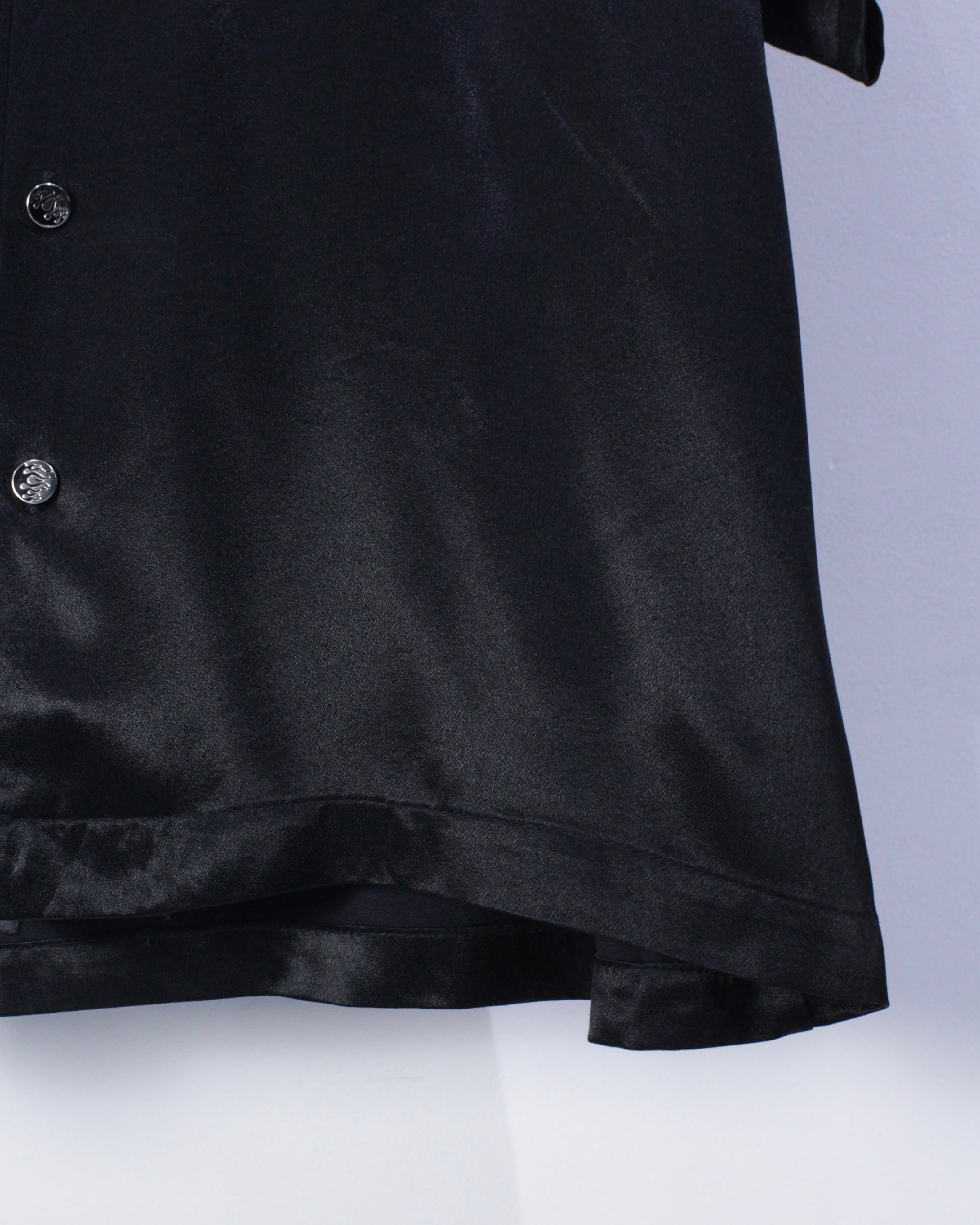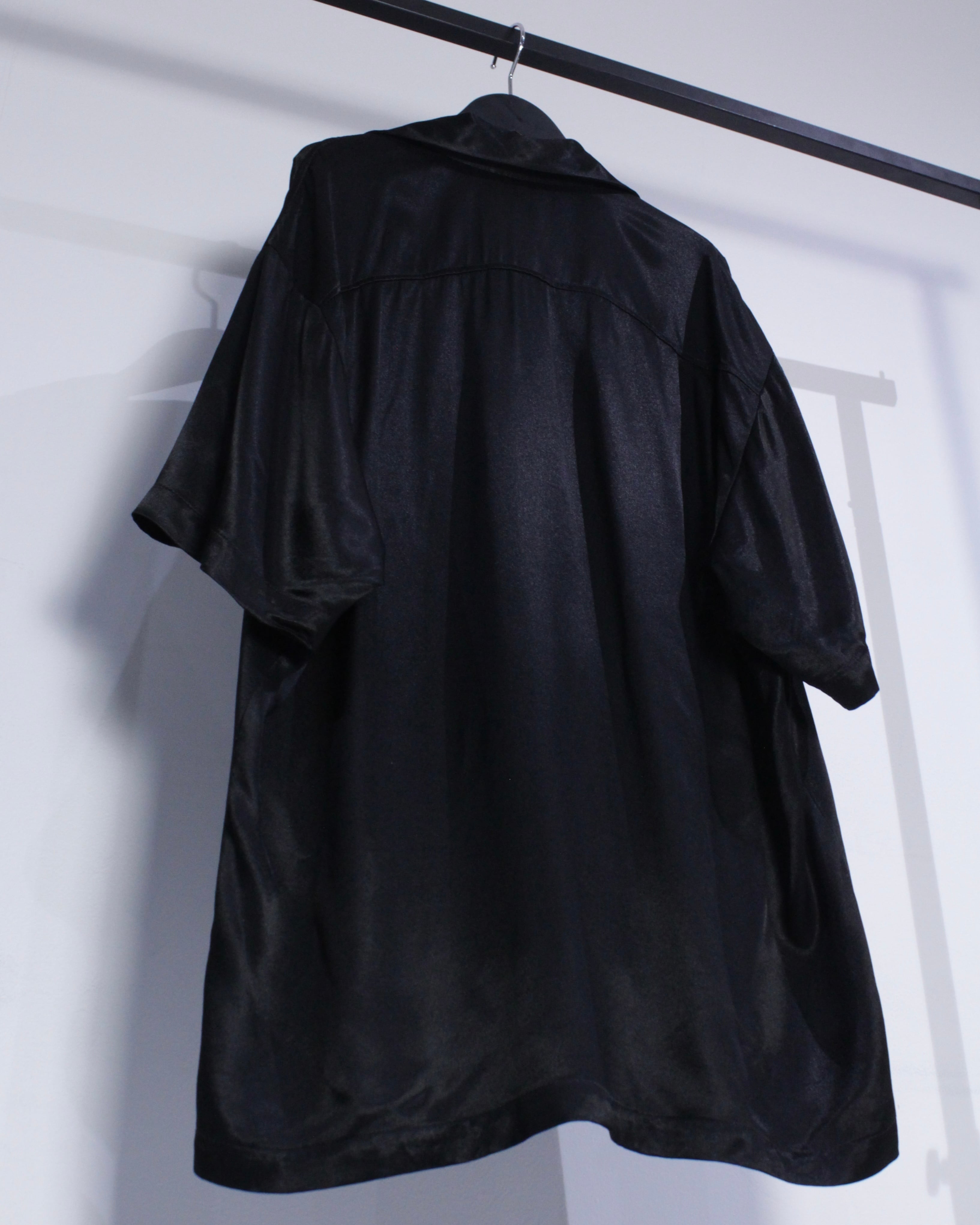 サテンのようなツルッとした質感で仕上げられた、美しい光沢を帯びたボディに、青の刺繍でファイヤーパターンを施した半袖シャツ。