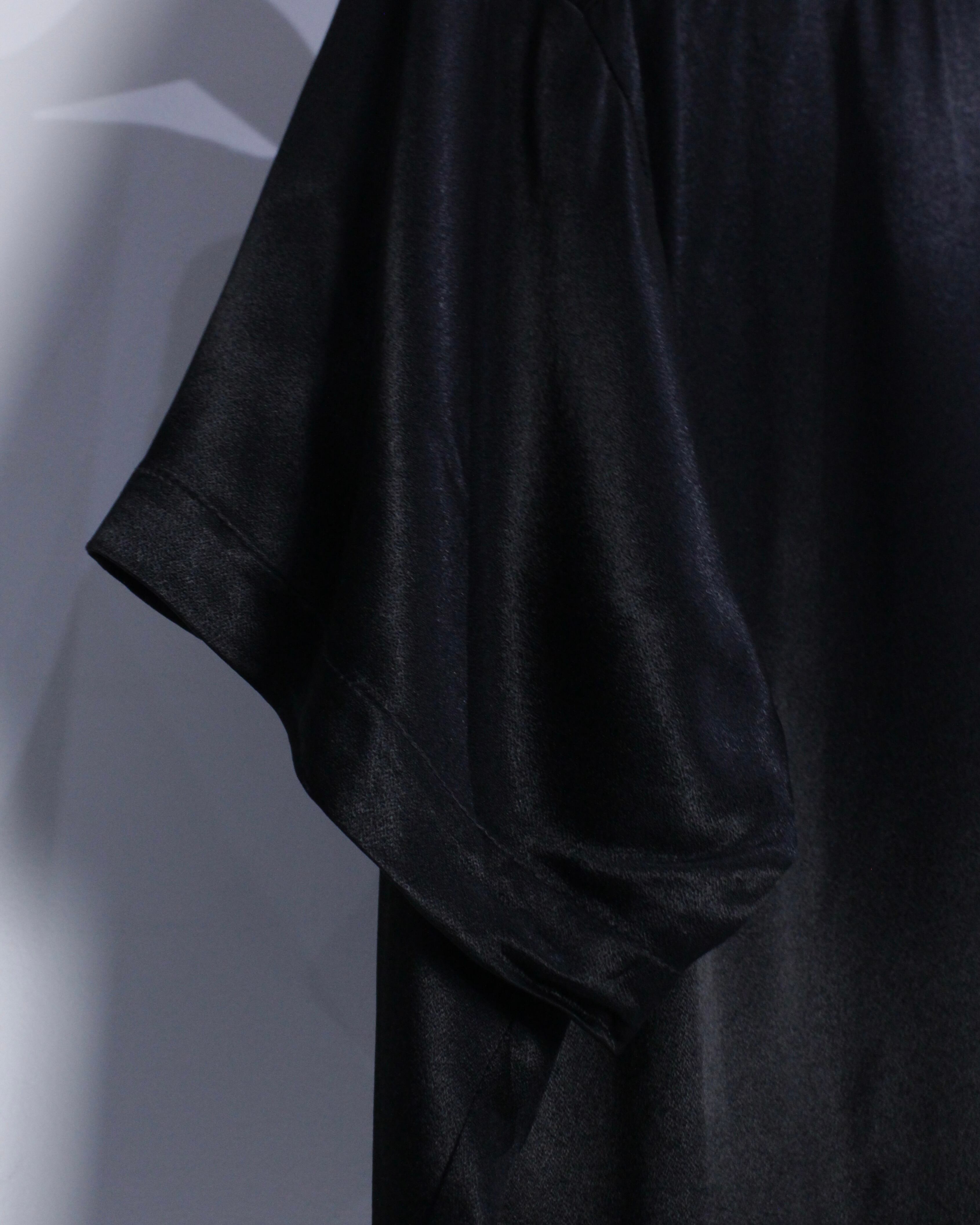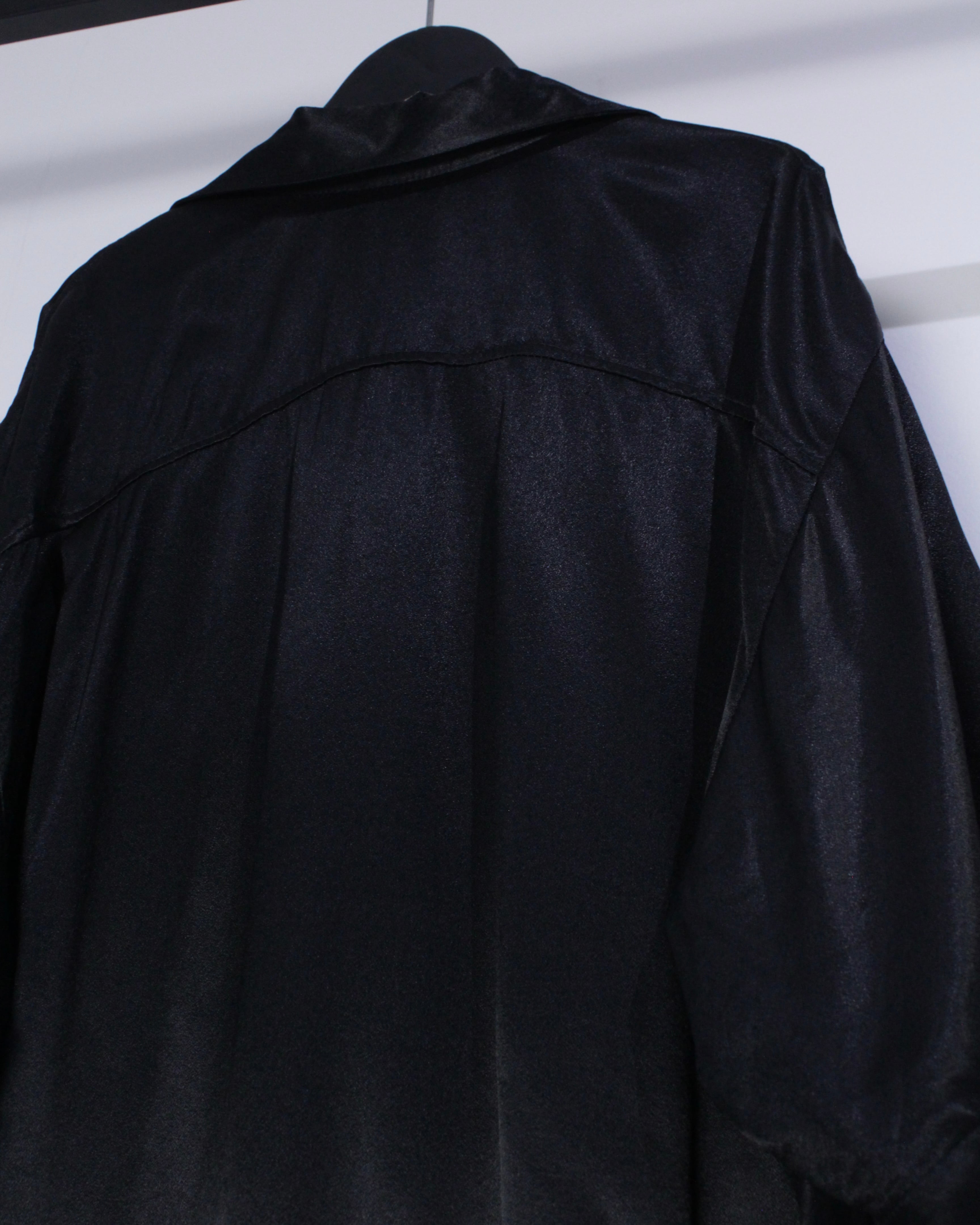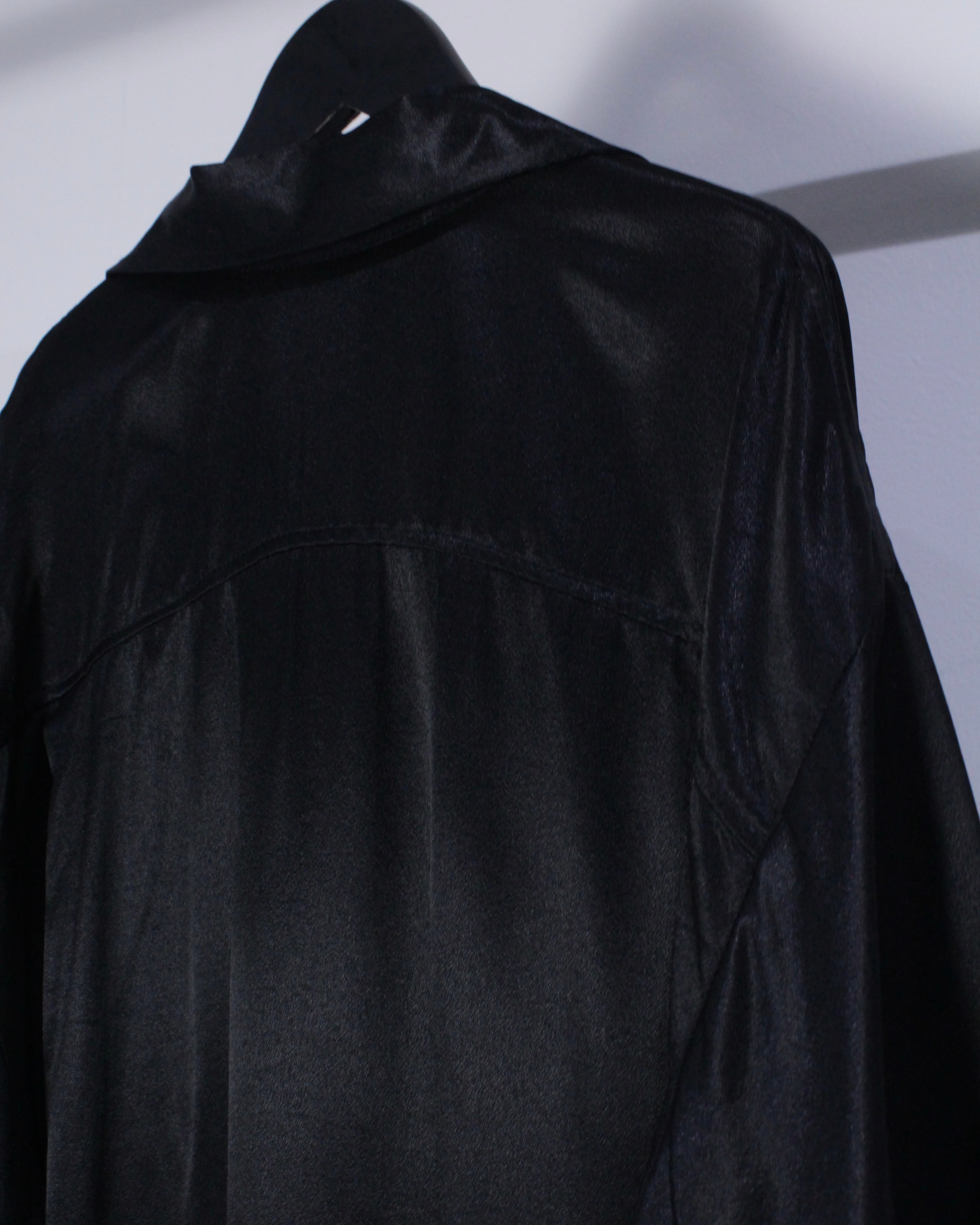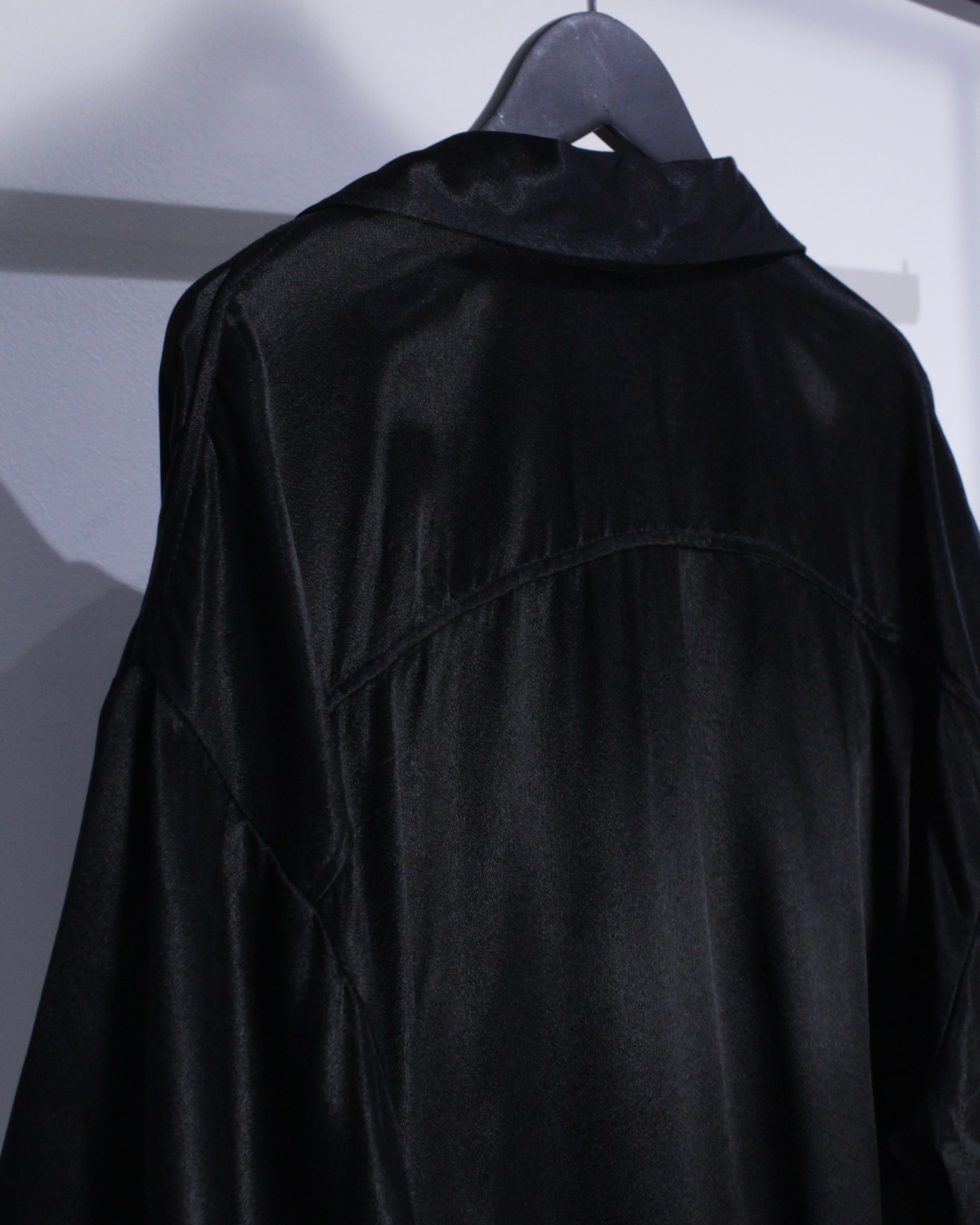 サテンのようなツルッとした質感で仕上げられた、美しい光沢を帯びたボディに、青の刺繍でファイヤーパターンを施した半袖シャツ。