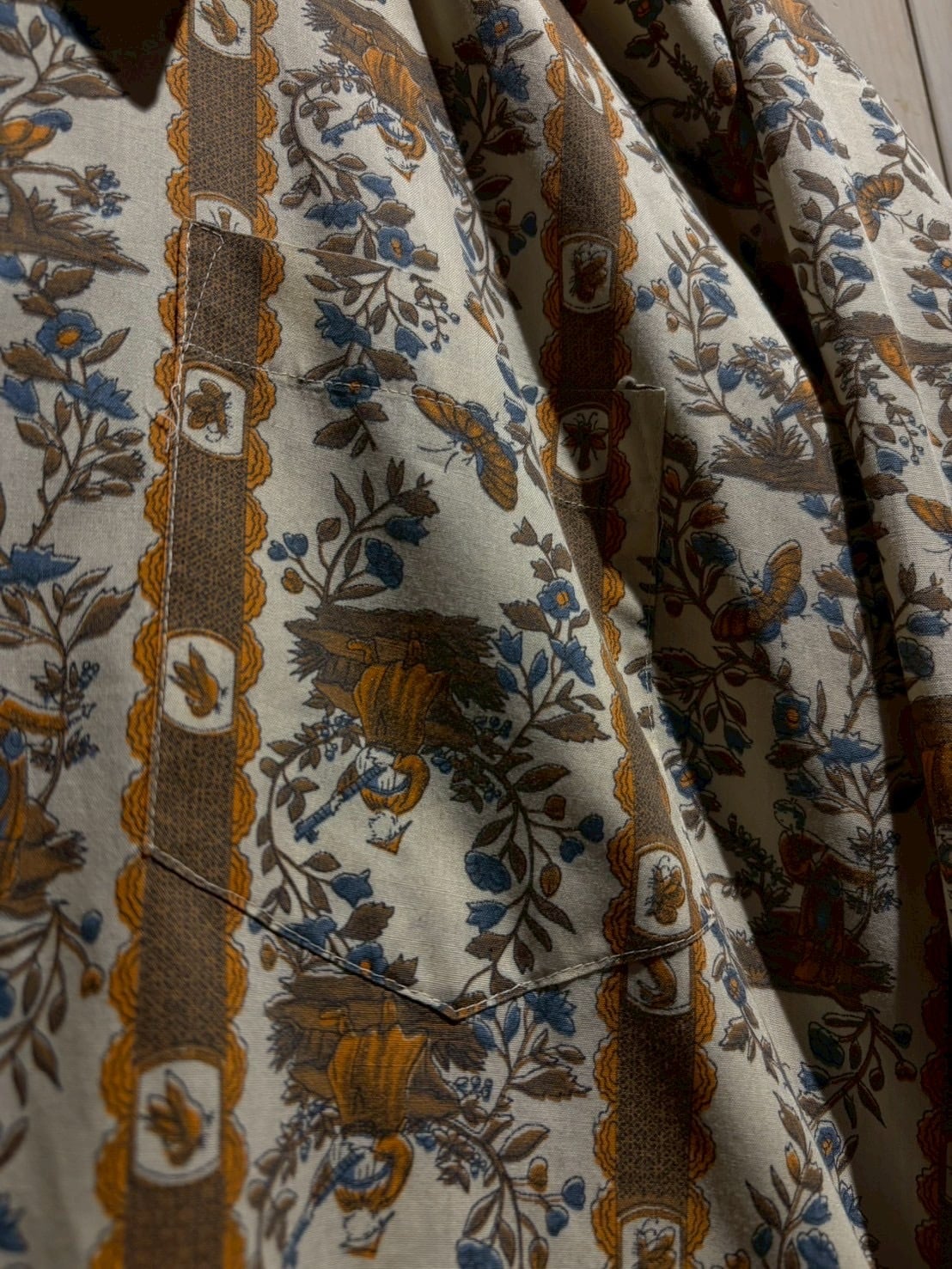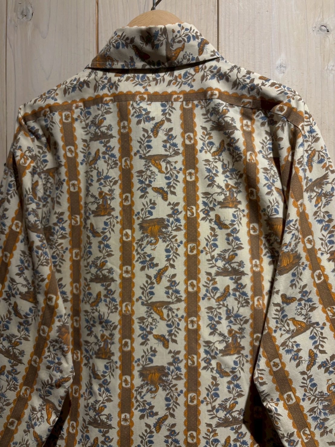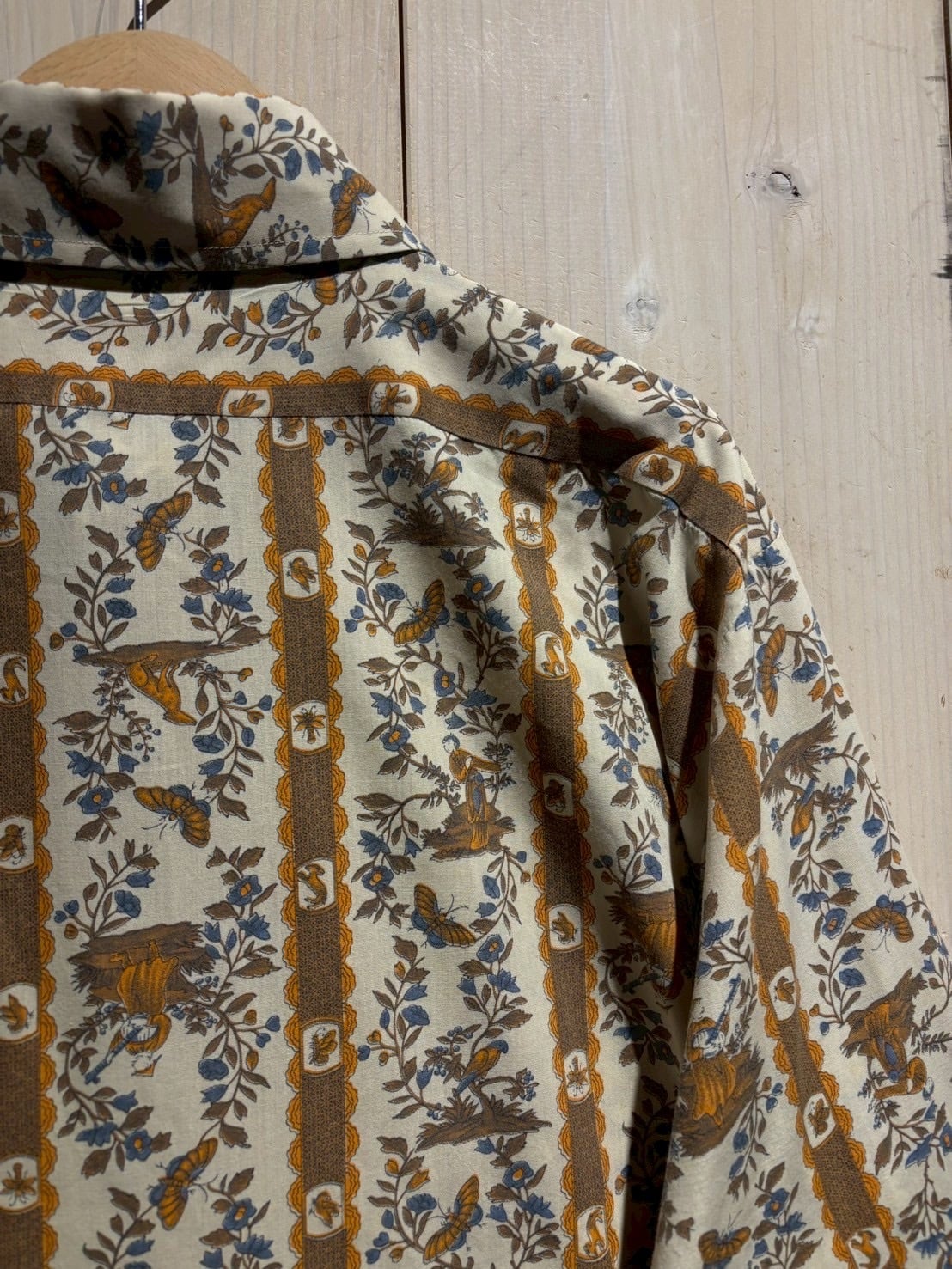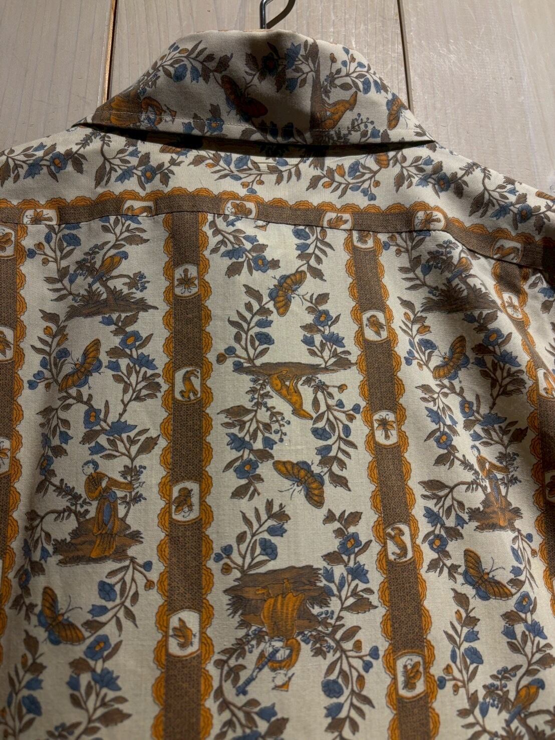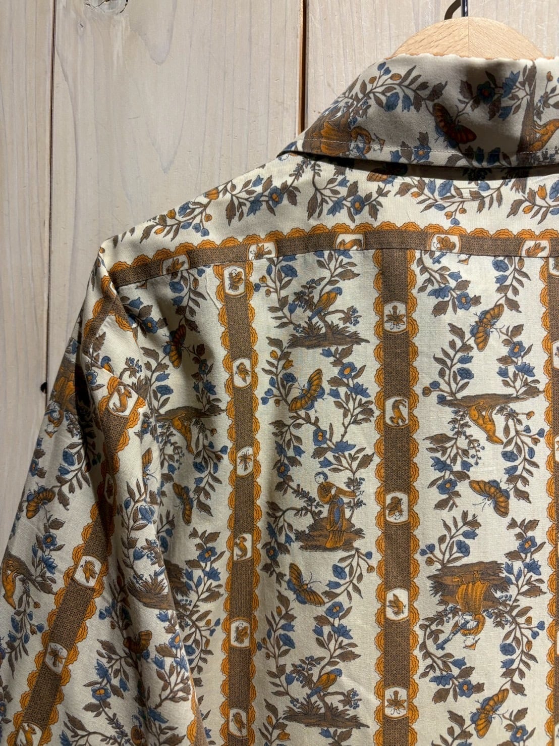 ピマコットンを用いたボディに、花や蝶々などを落とし込んだ70'sヴィンテージの長袖シャツ。