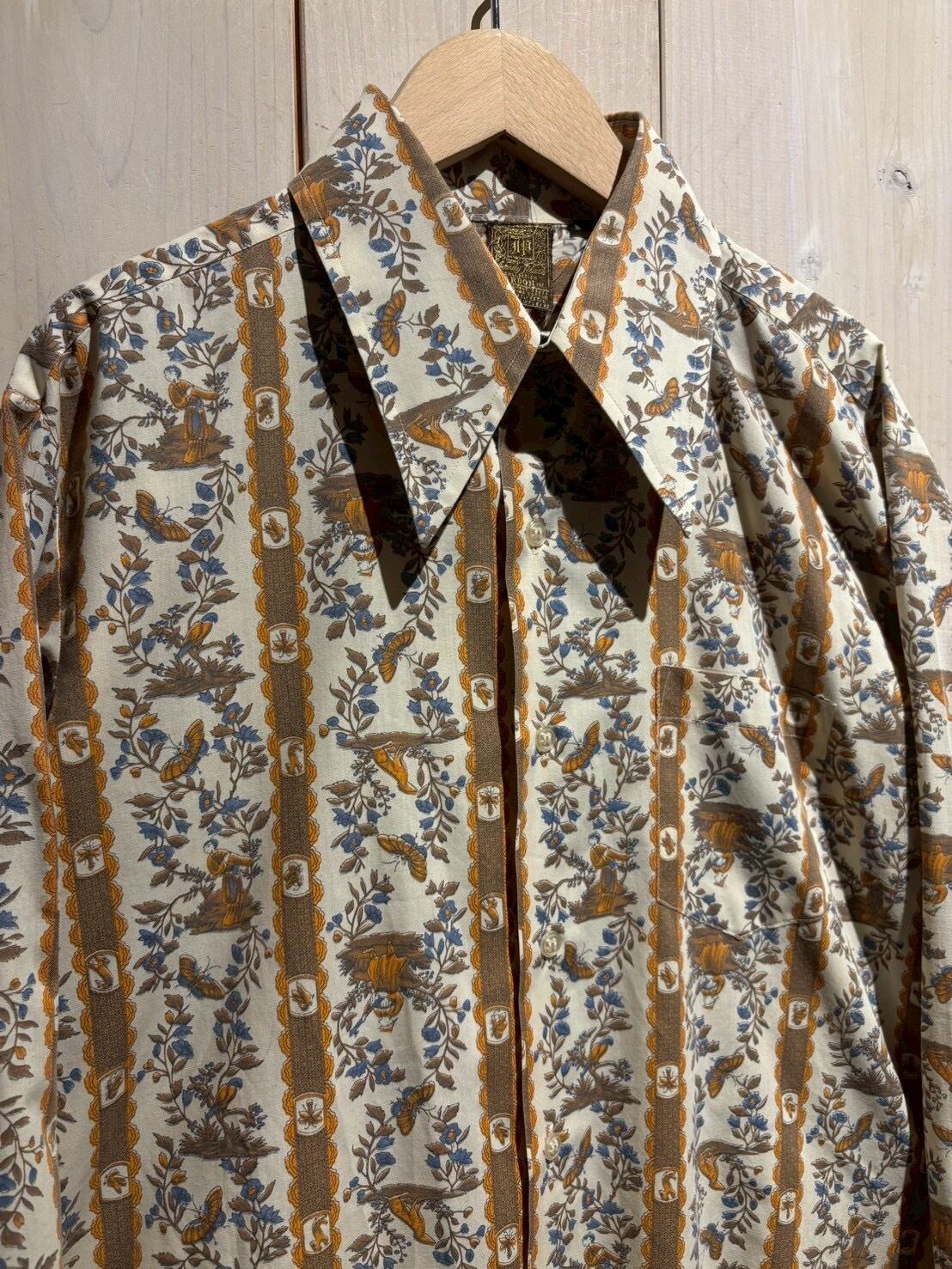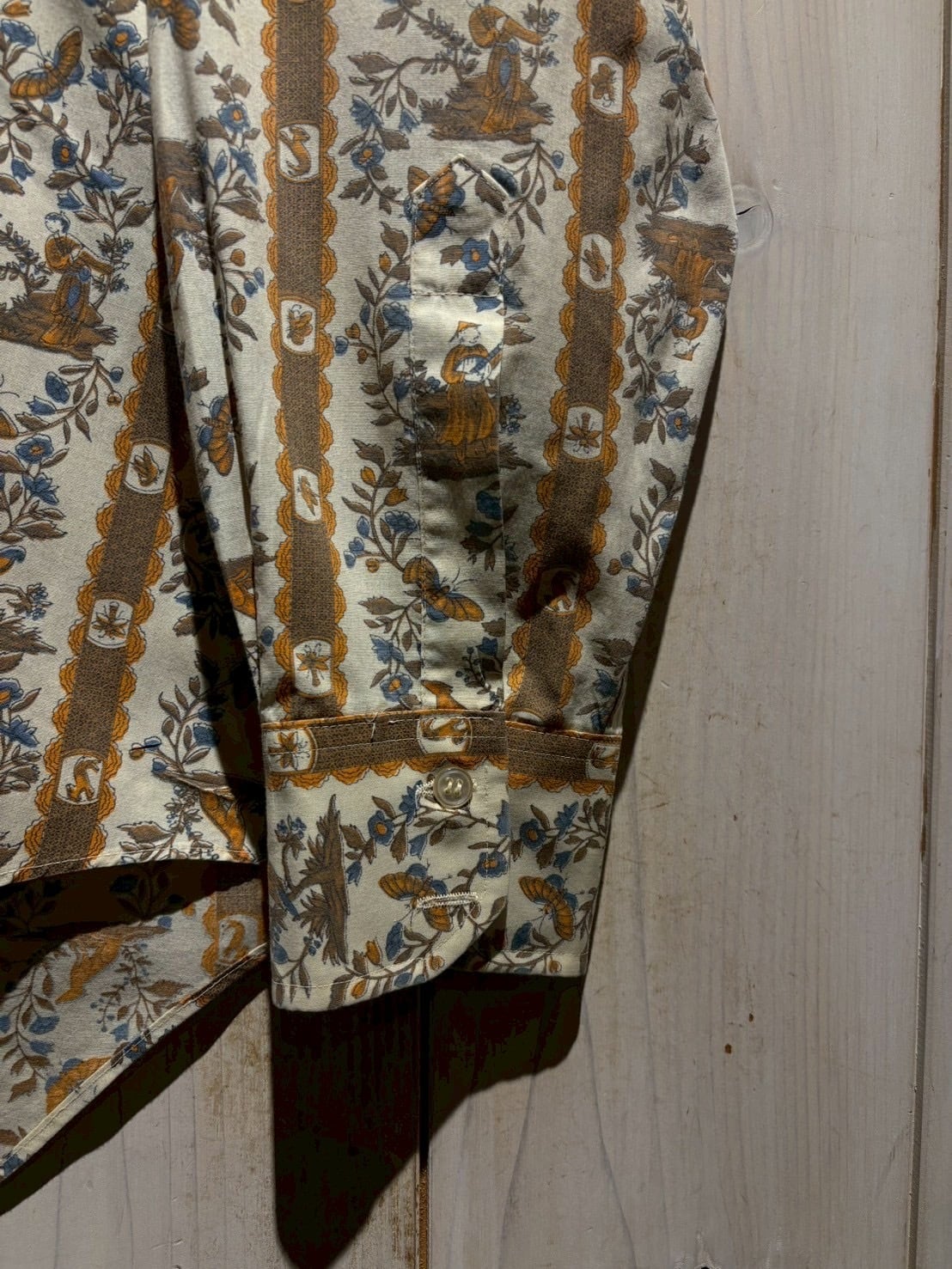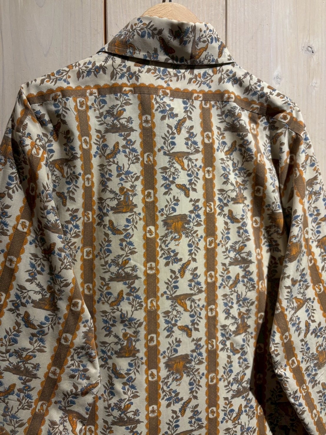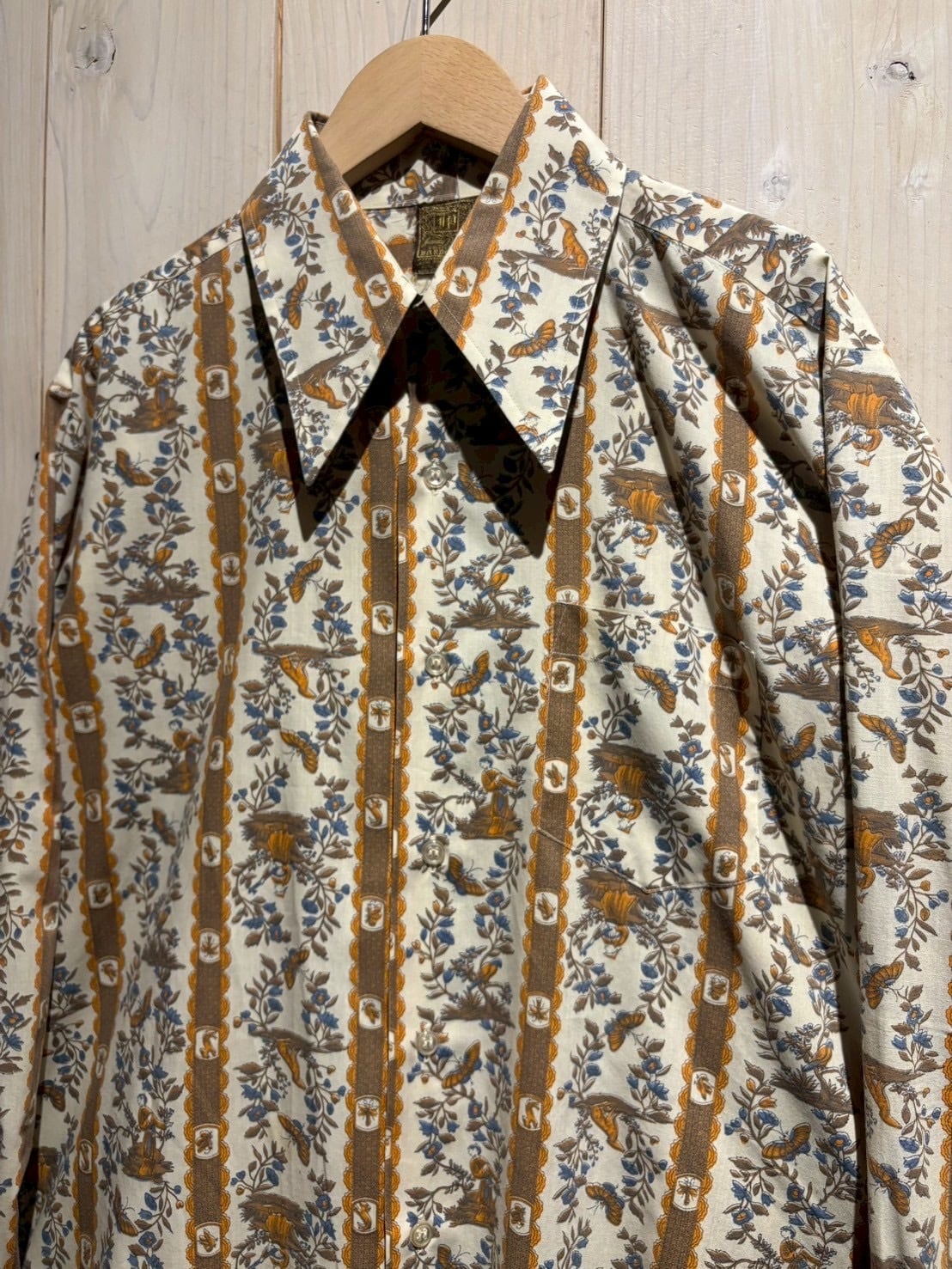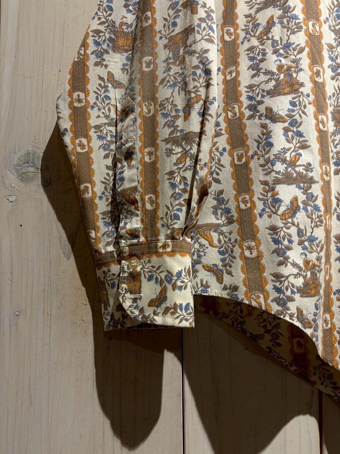 ピマコットンを用いたボディに、花や蝶々などを落とし込んだ70'sヴィンテージの長袖シャツ。