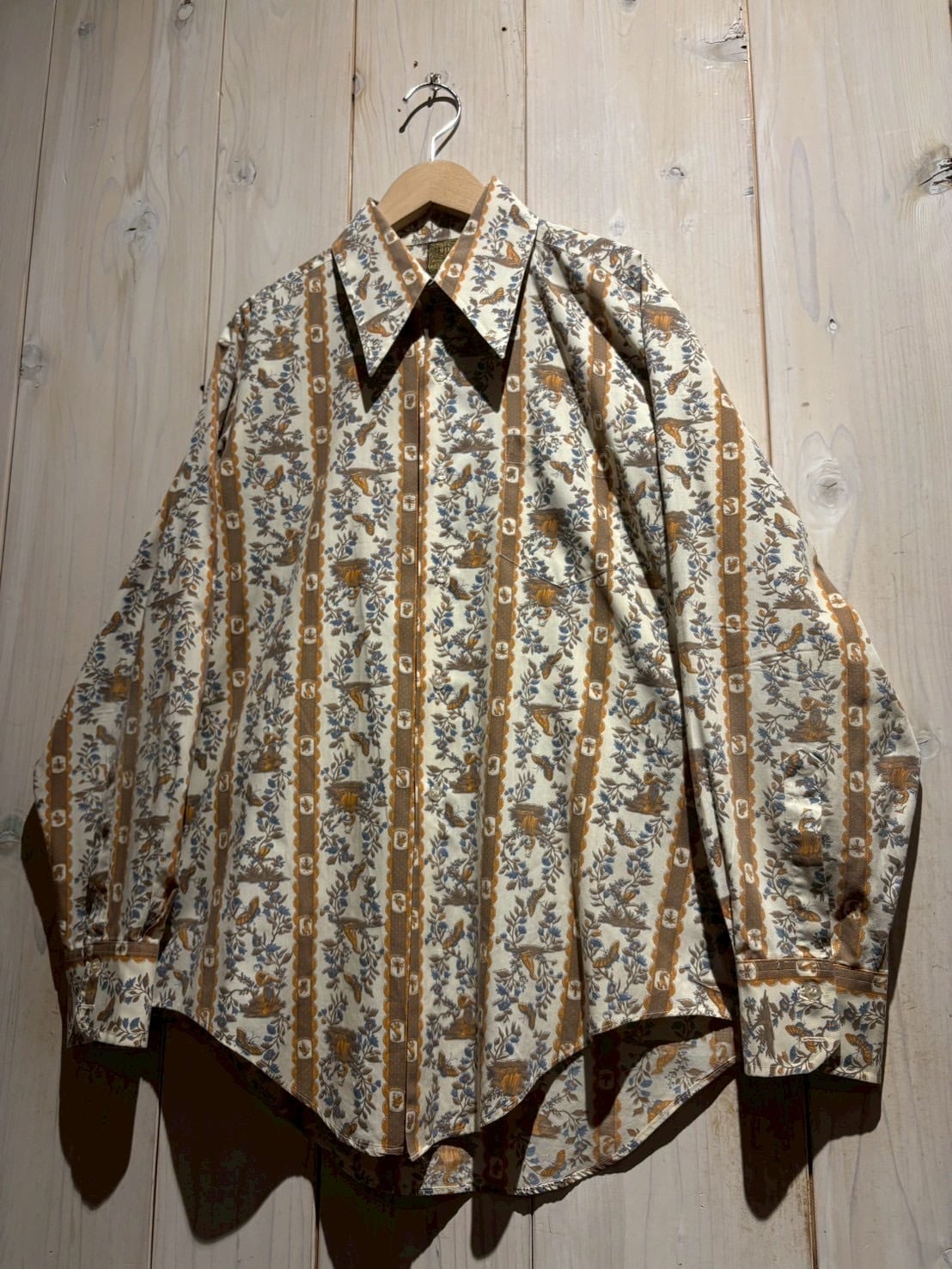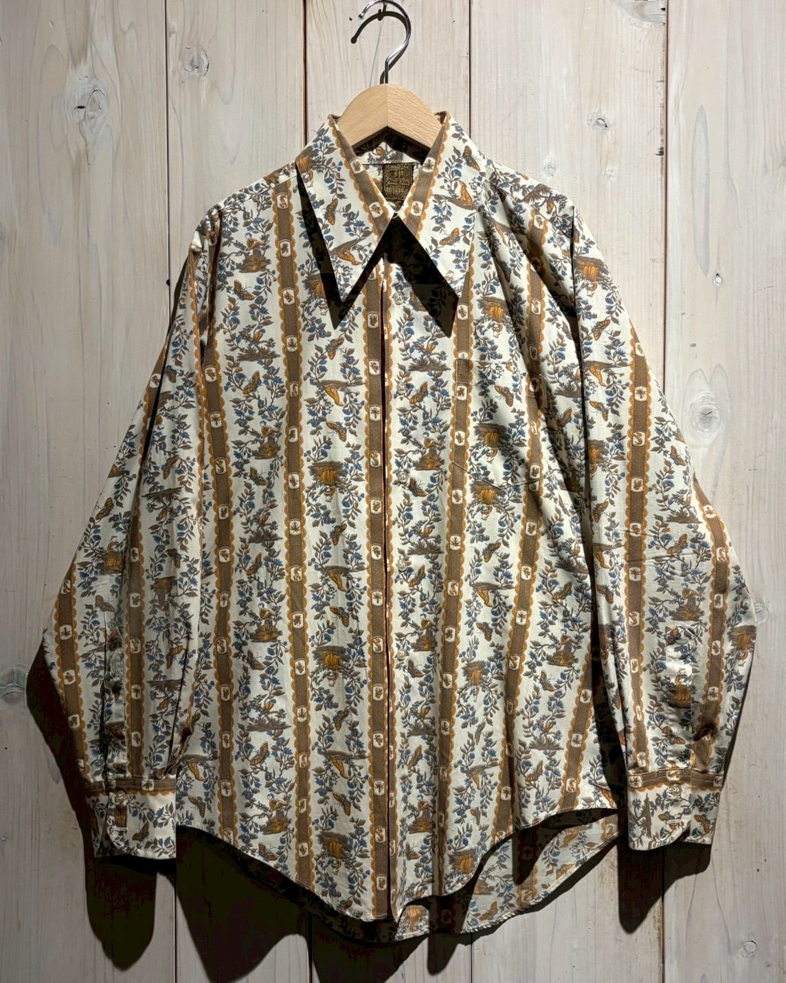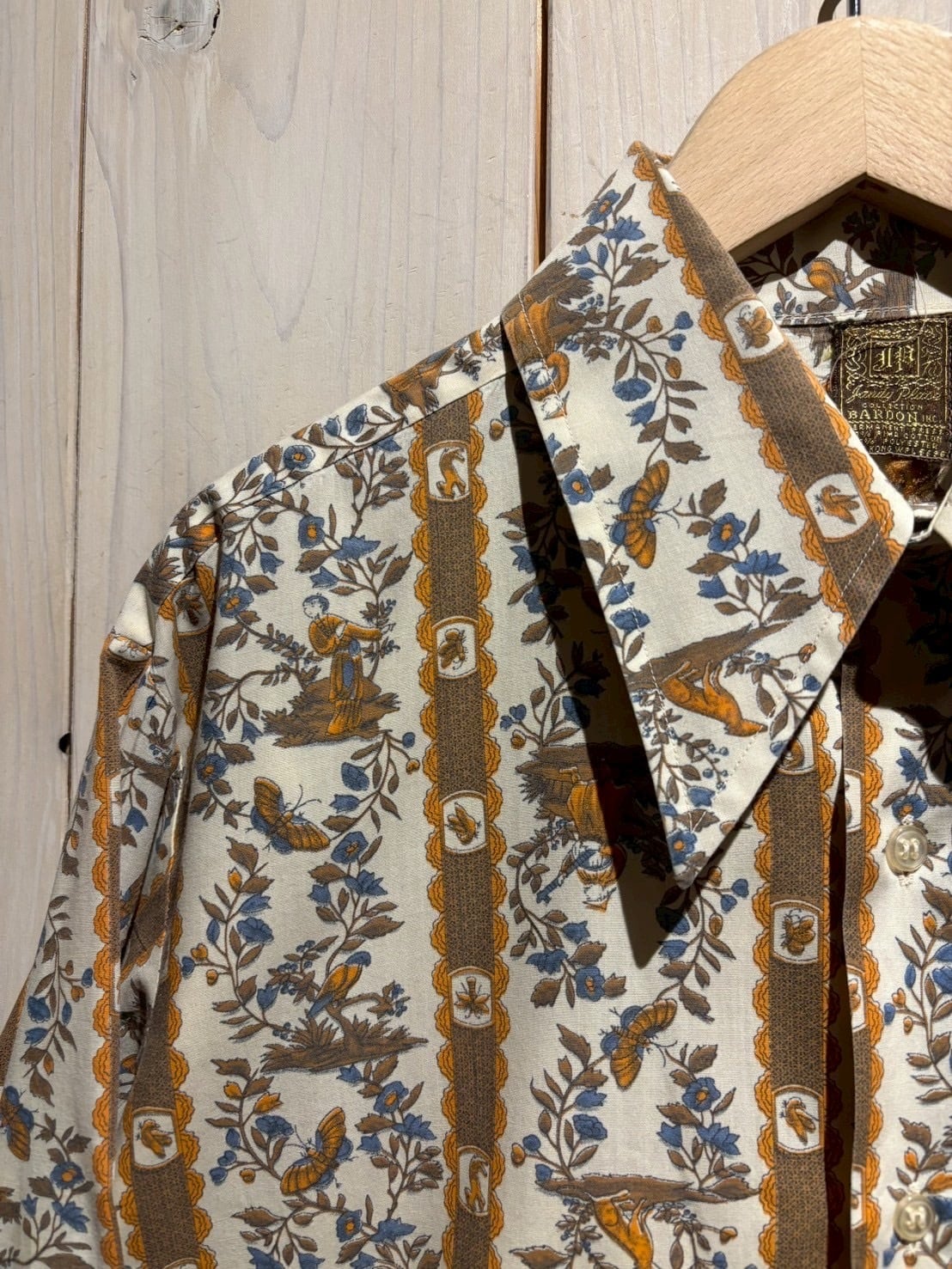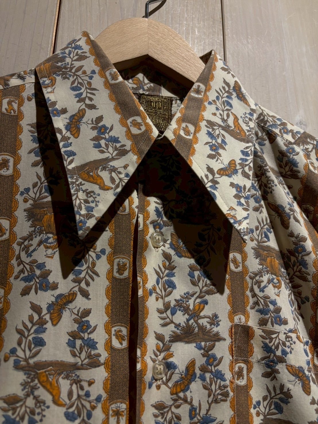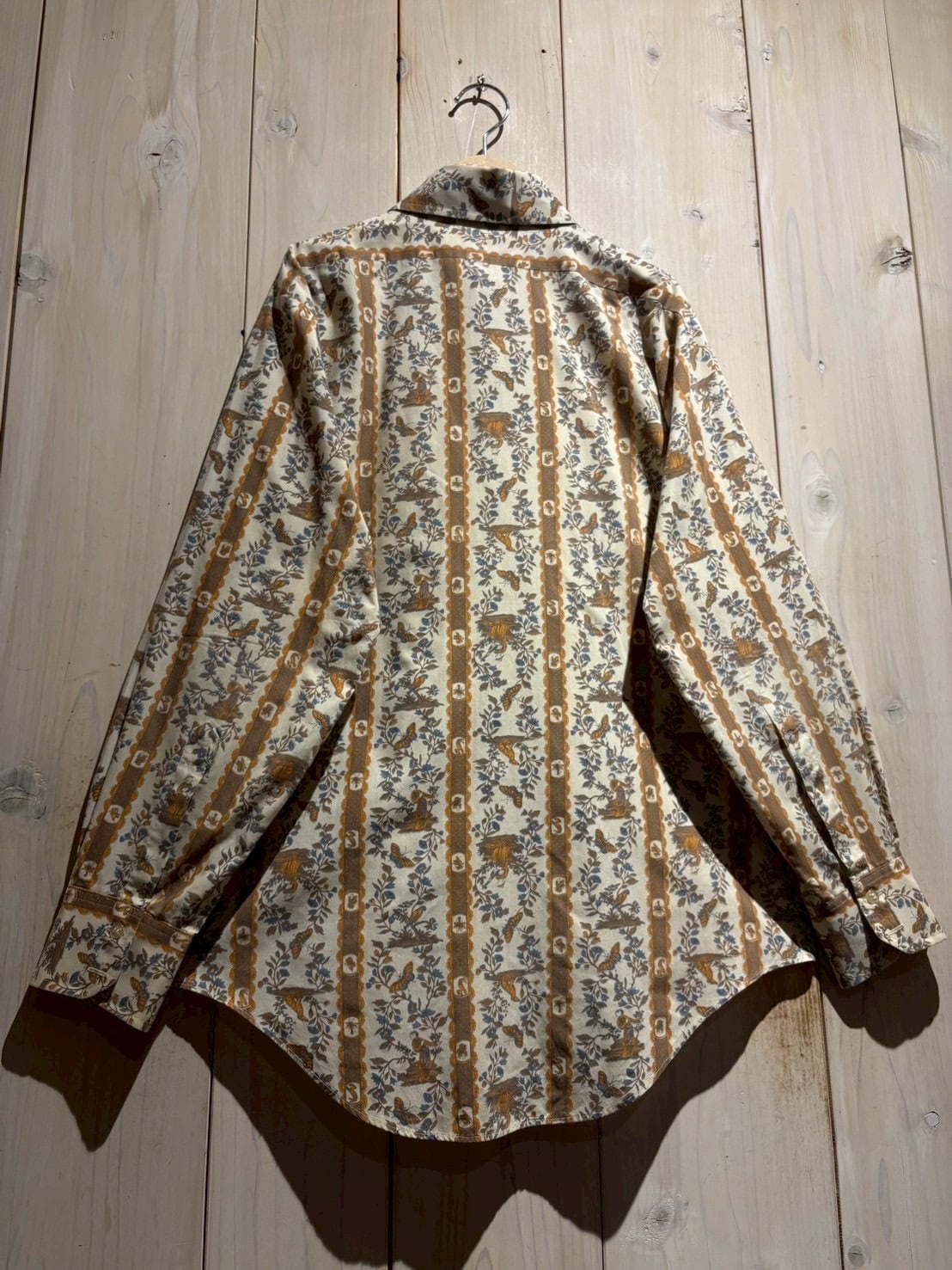 ピマコットンを用いたボディに、花や蝶々などを落とし込んだ70'sヴィンテージの長袖シャツ。