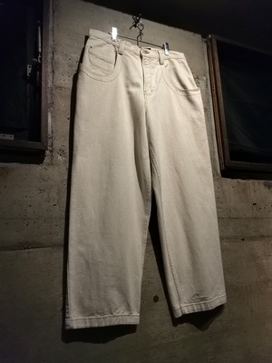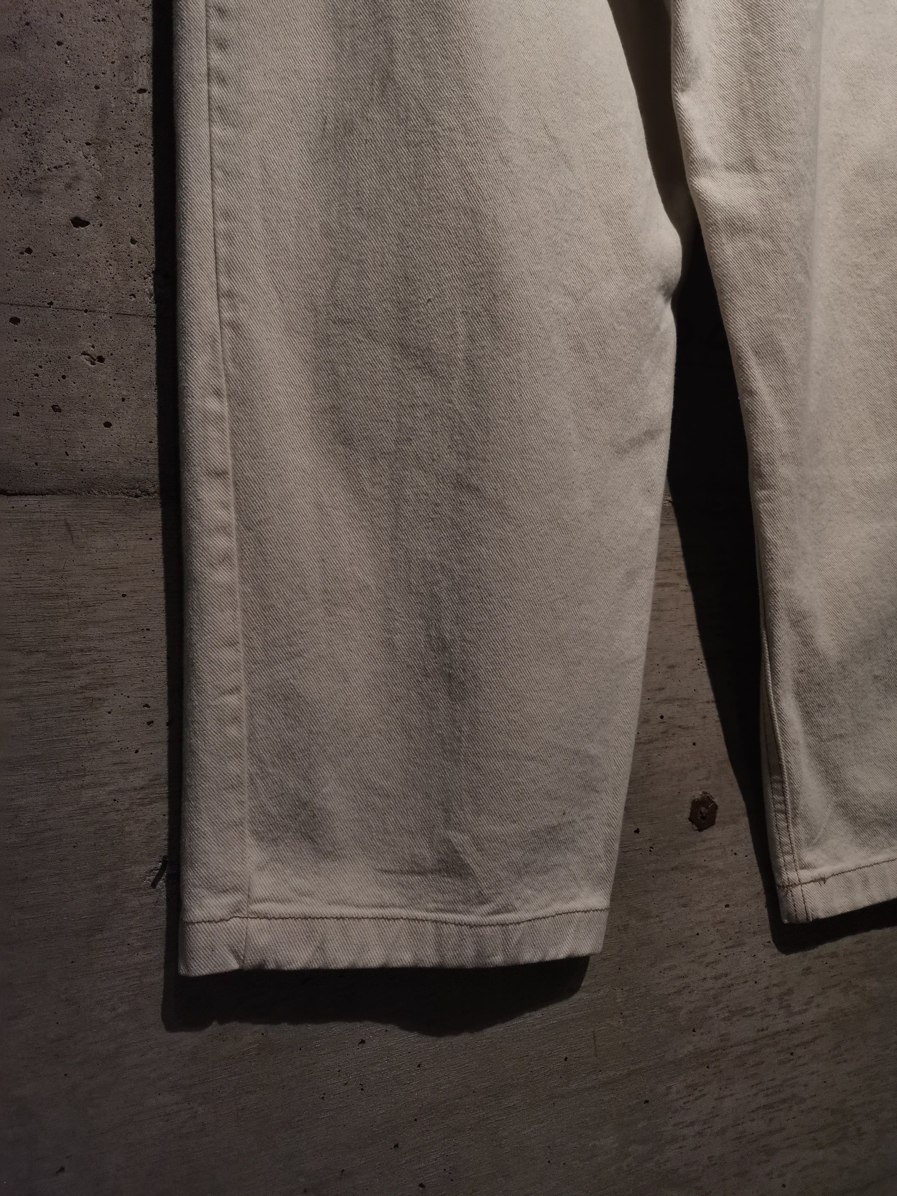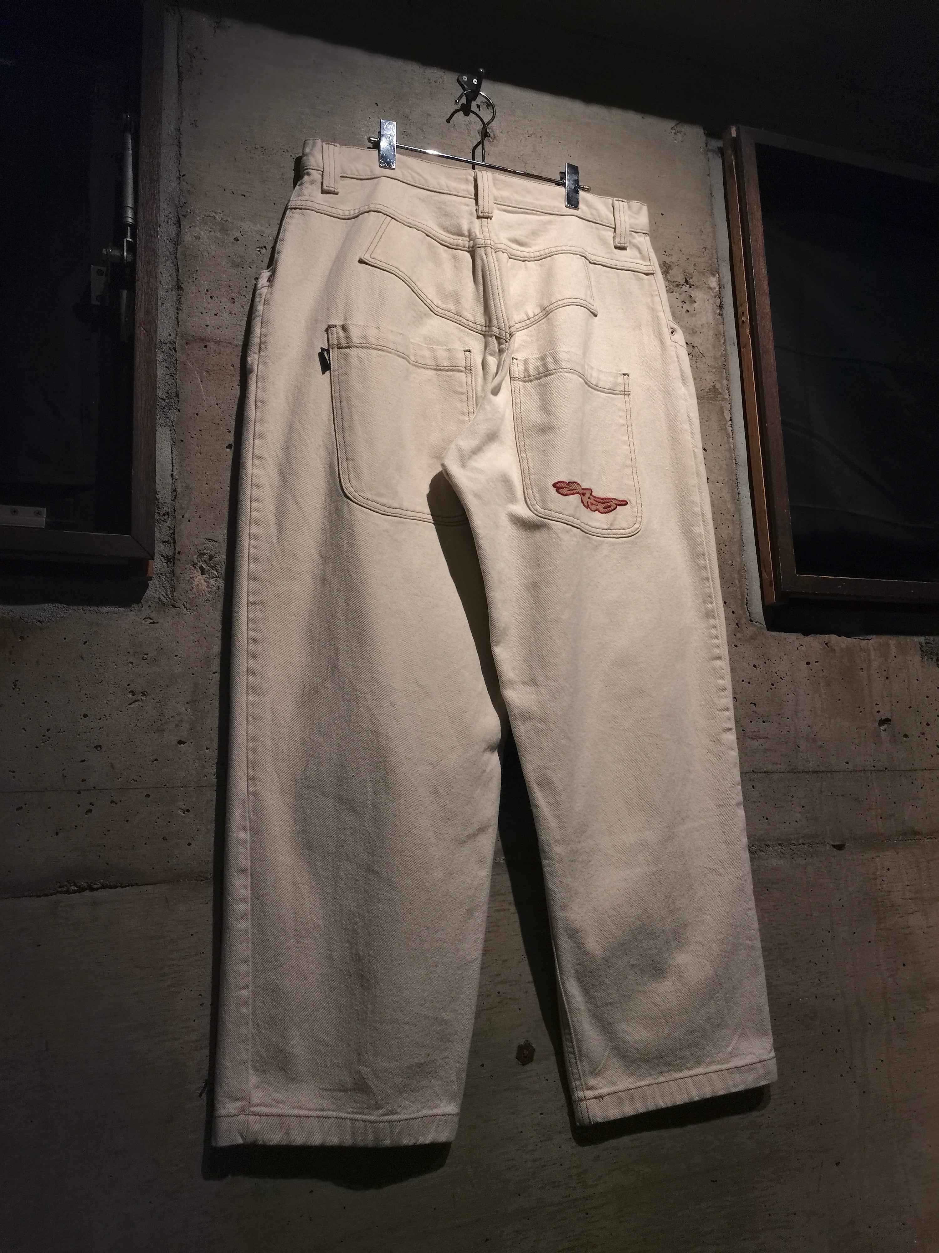 ホワイトのデニム生地をベースに、バックポケットにブランドロゴを刺繍で刻んだバギーデニムパンツ。