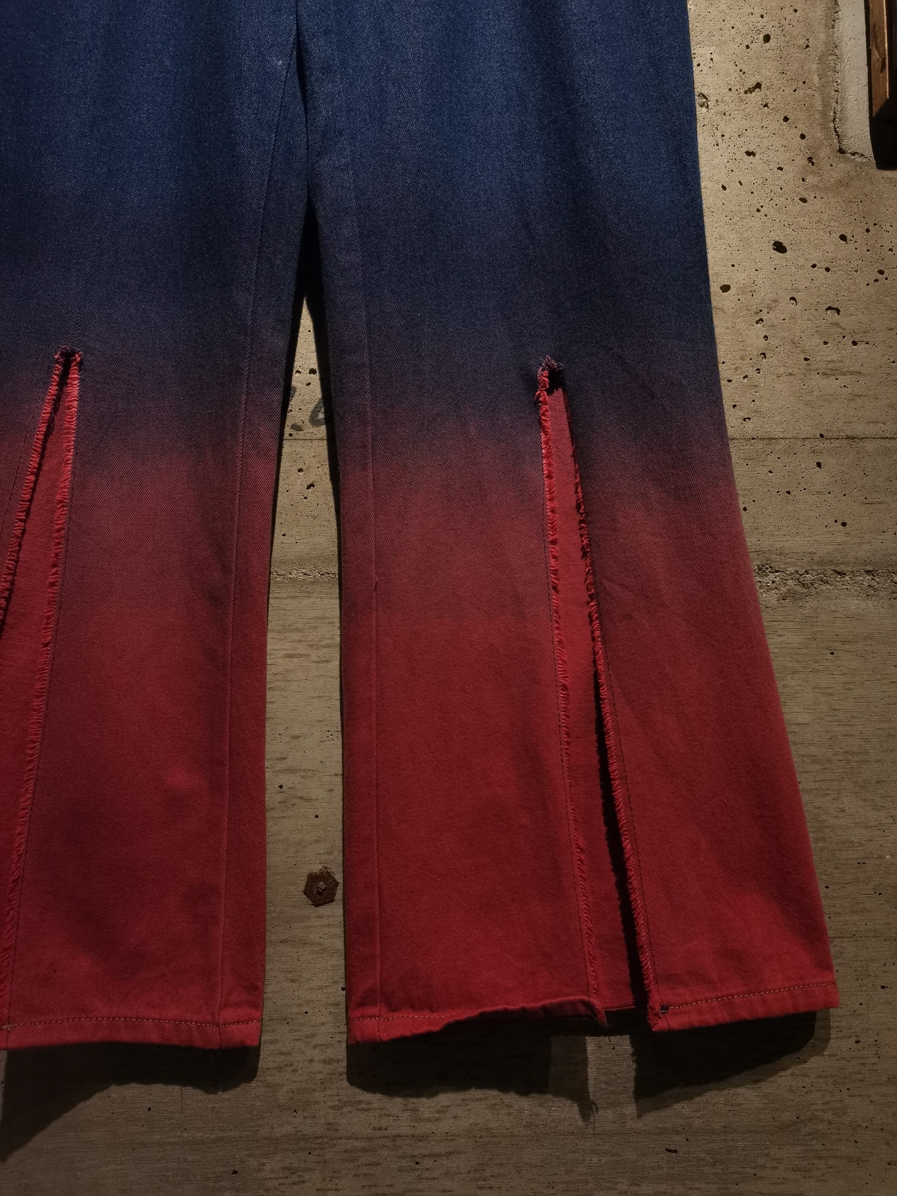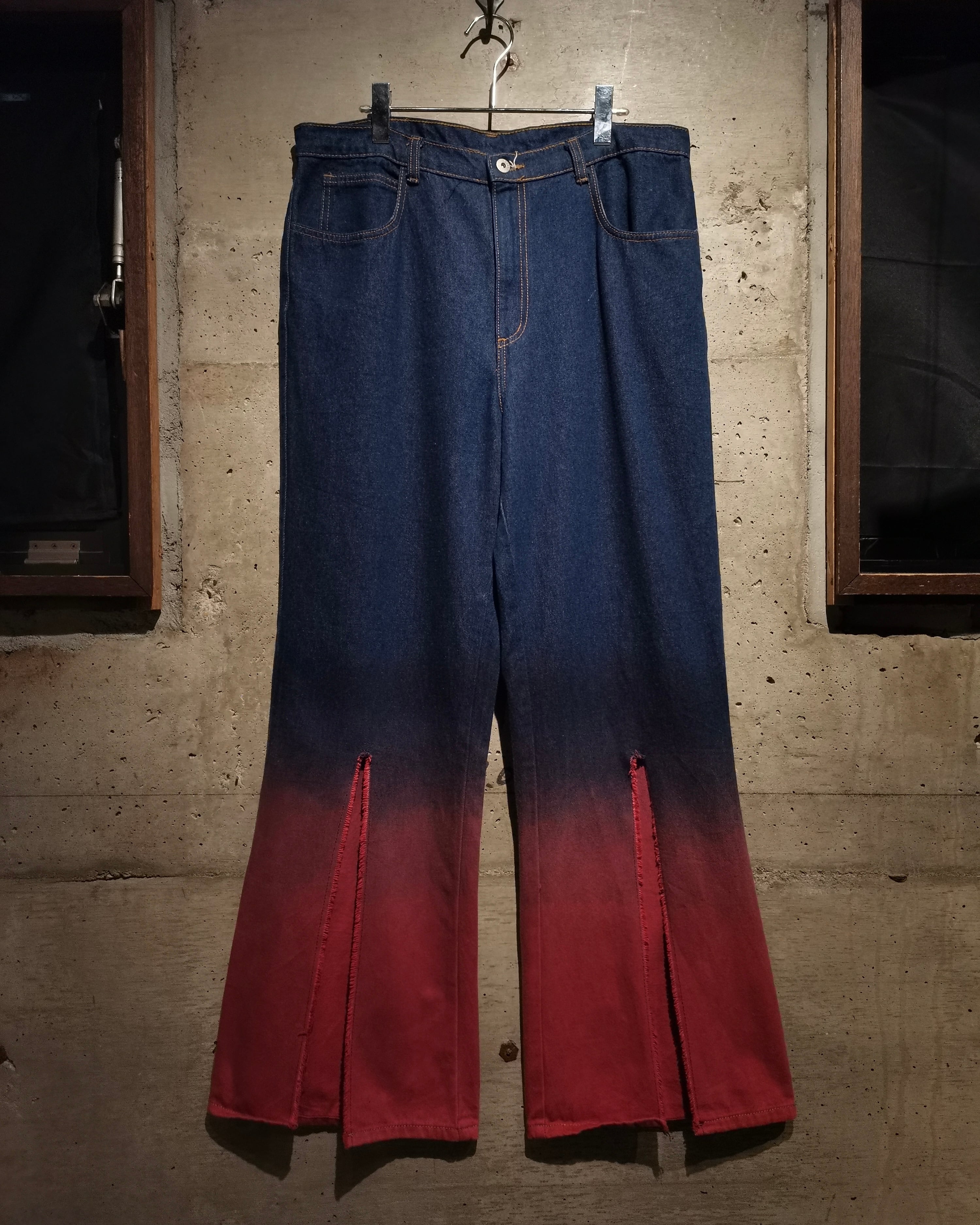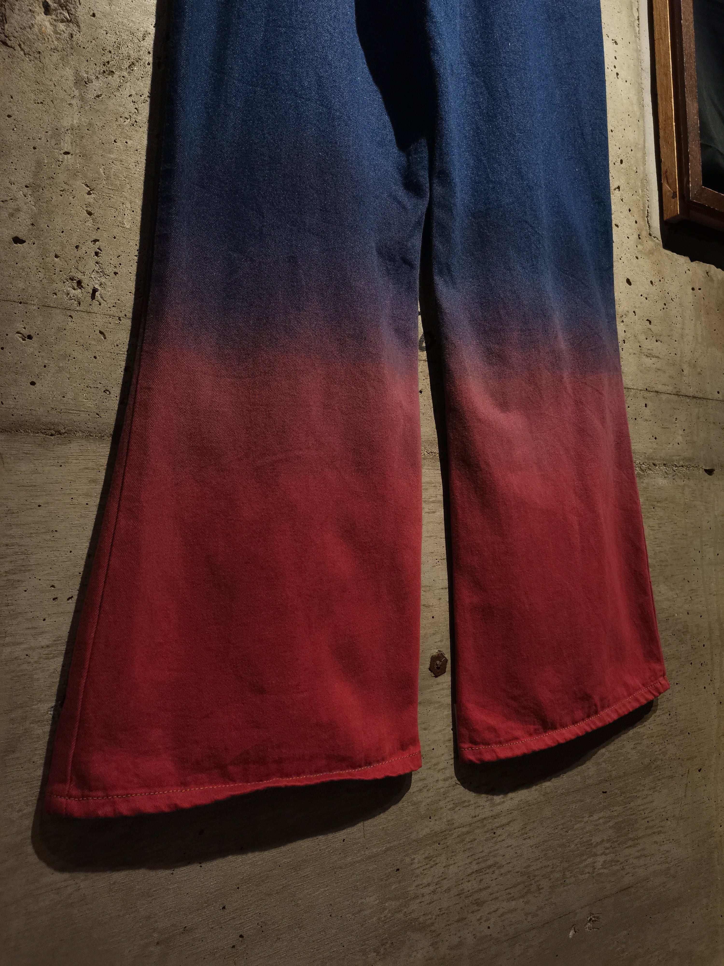 インディゴブルーのデニムをベースに、裾付近に鮮やかなピンクの染めを施し美しいグラデーションに仕上げたフレアデニムパンツ。