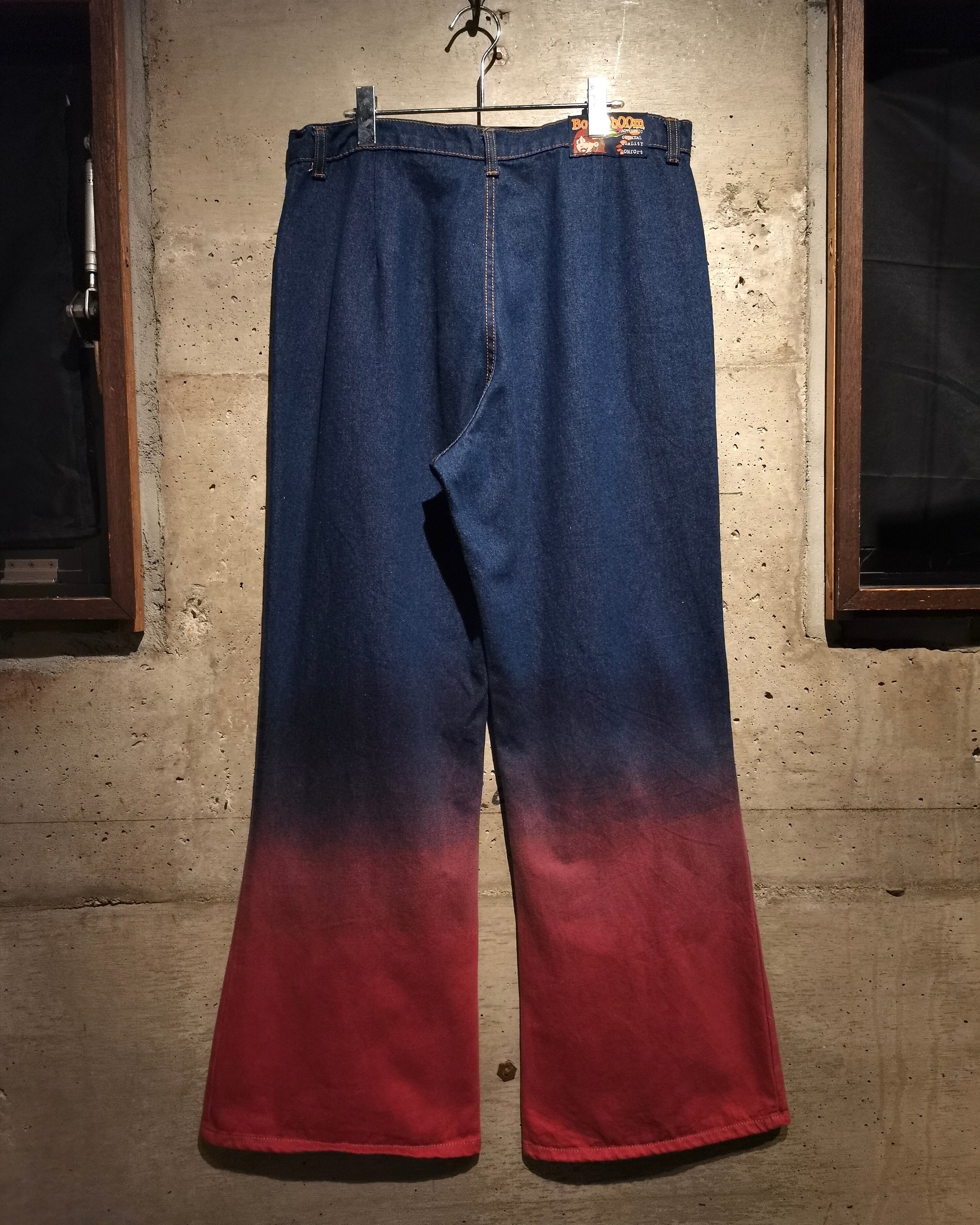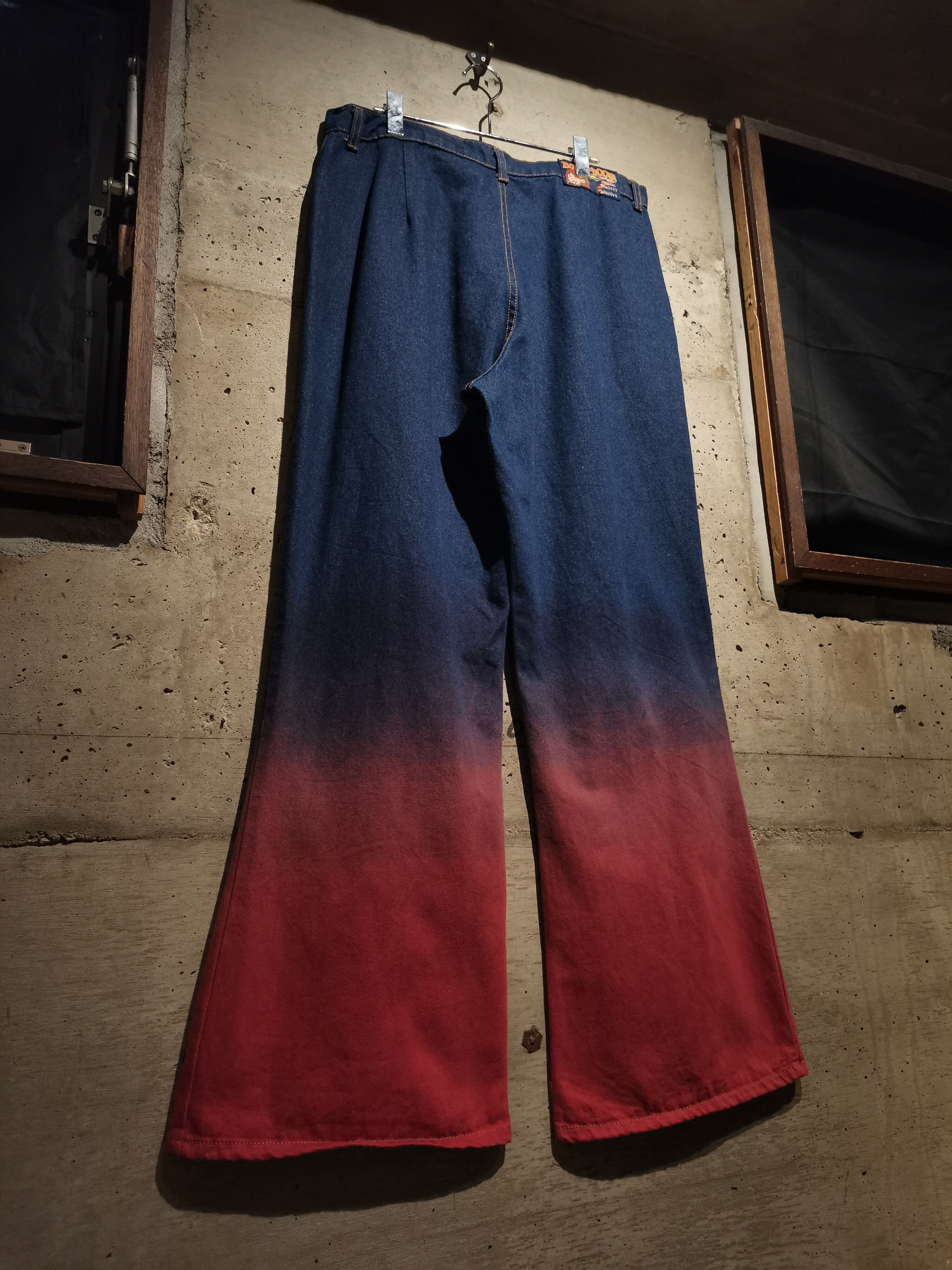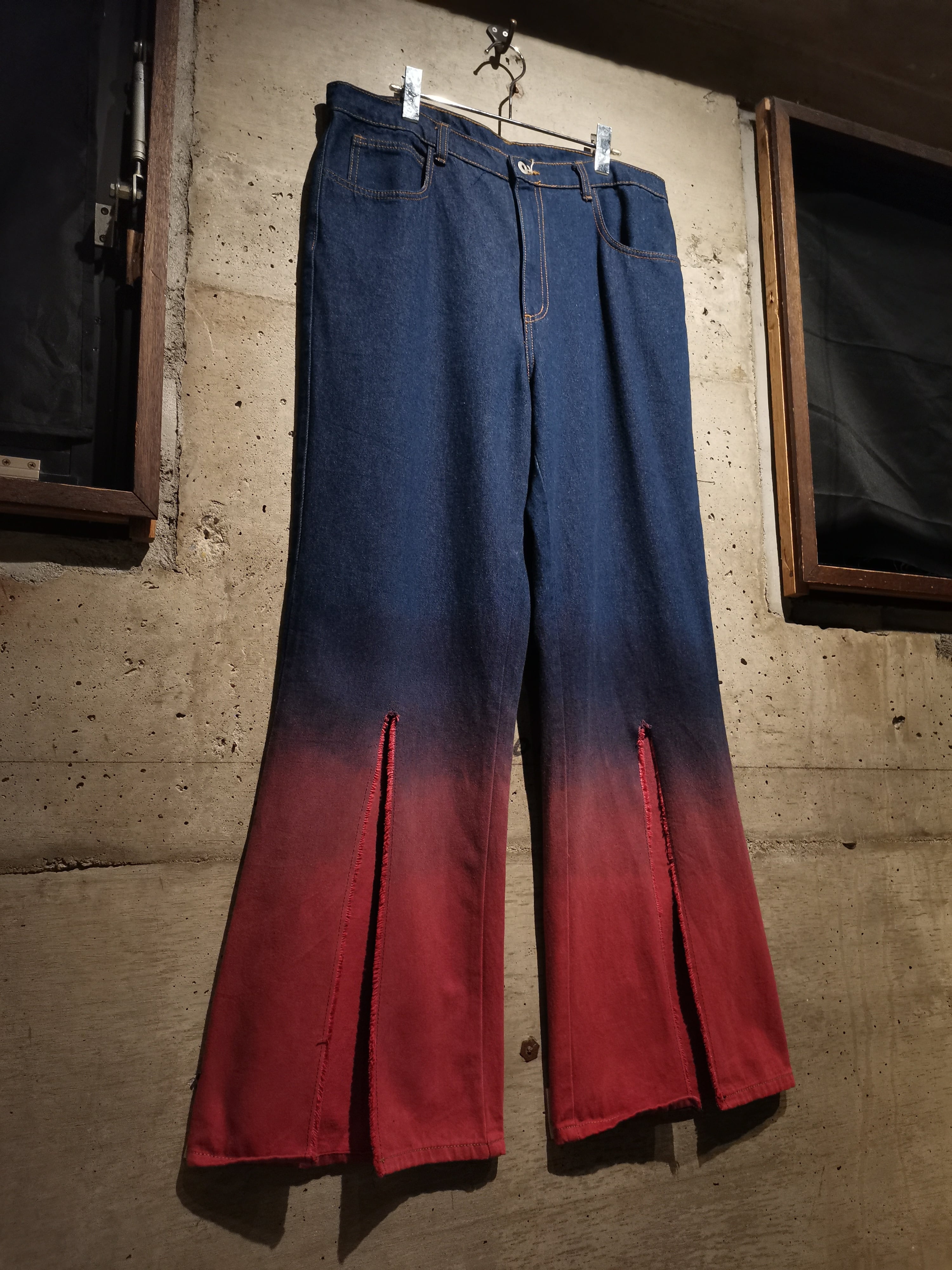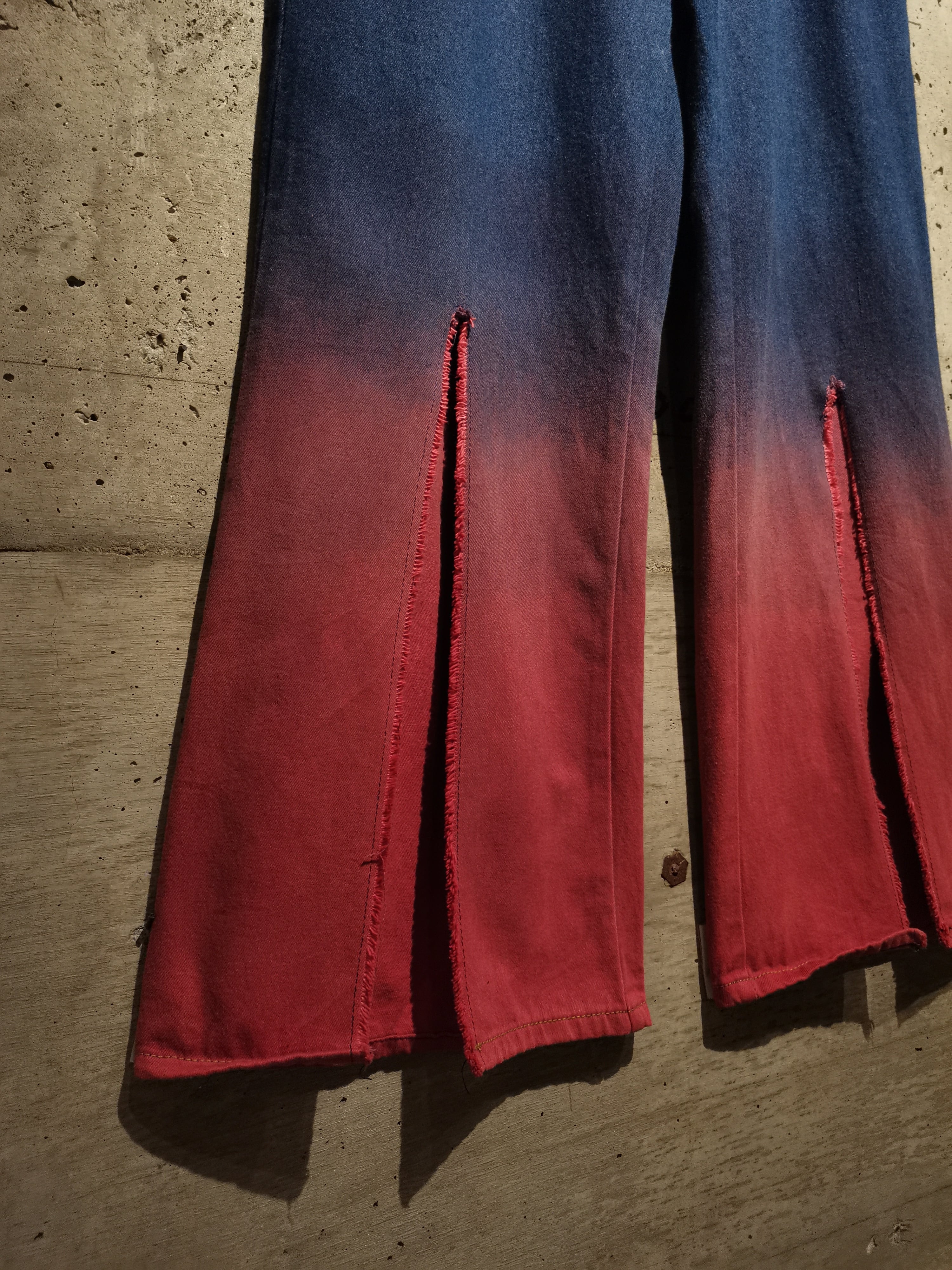 インディゴブルーのデニムをベースに、裾付近に鮮やかなピンクの染めを施し美しいグラデーションに仕上げたフレアデニムパンツ。