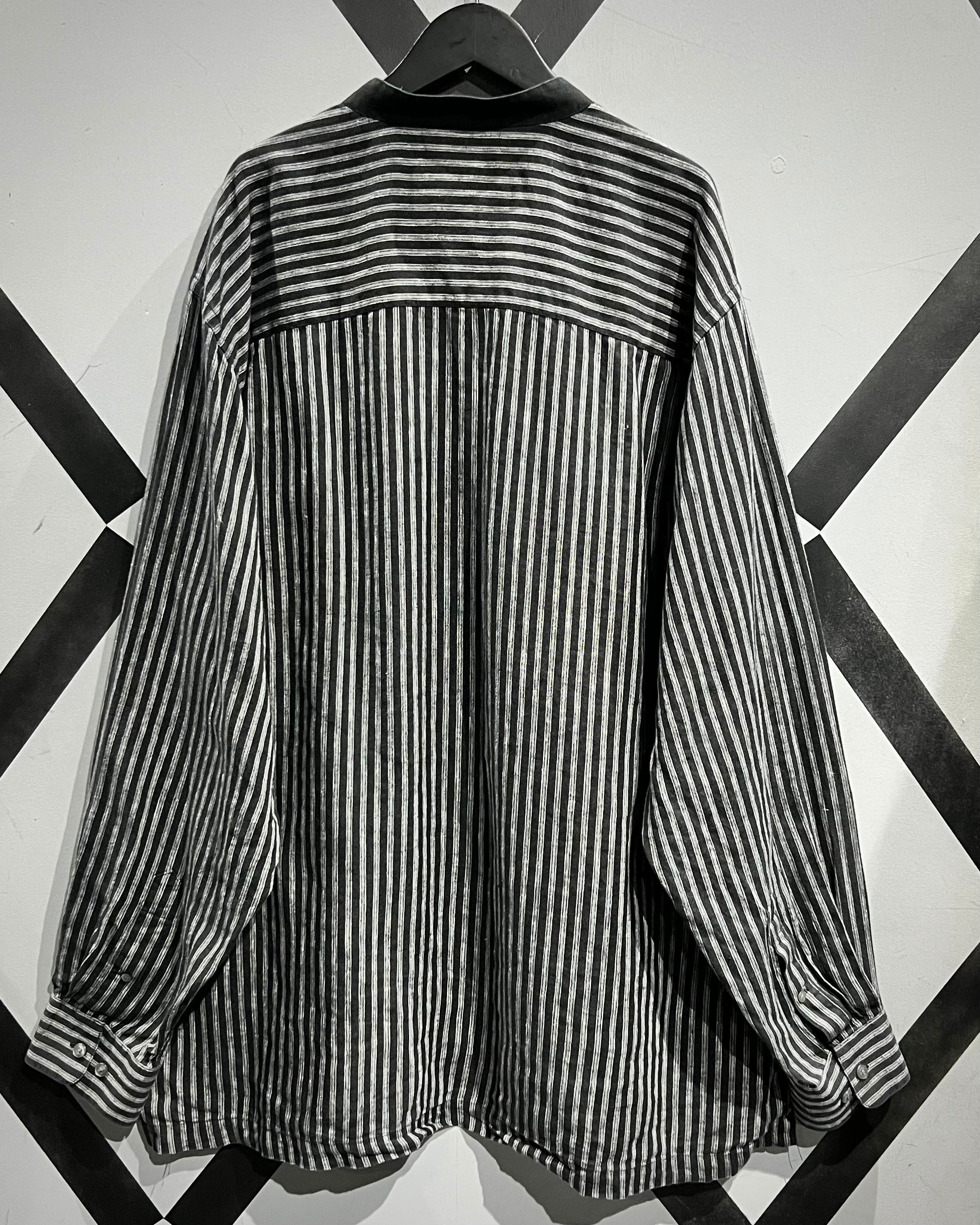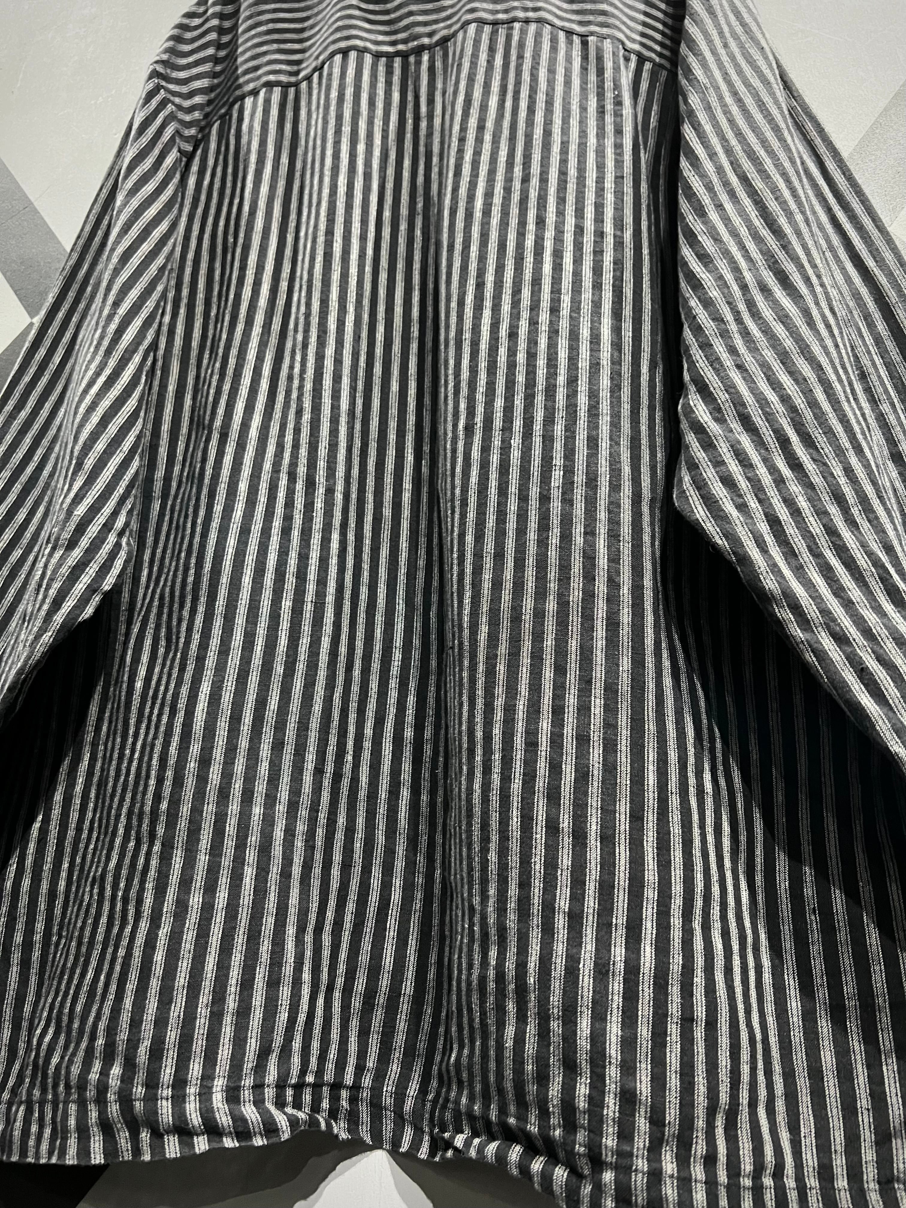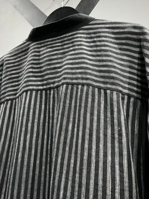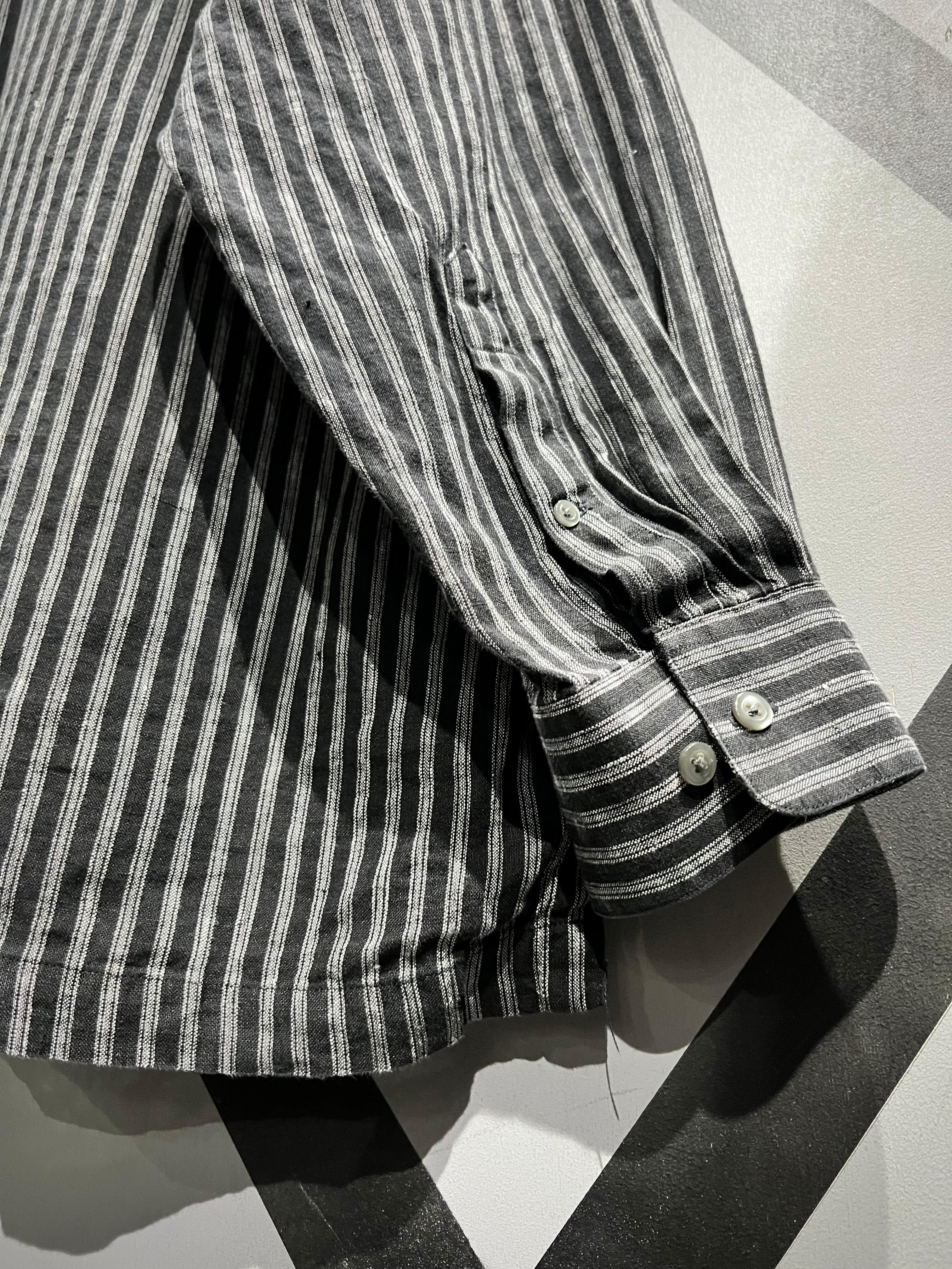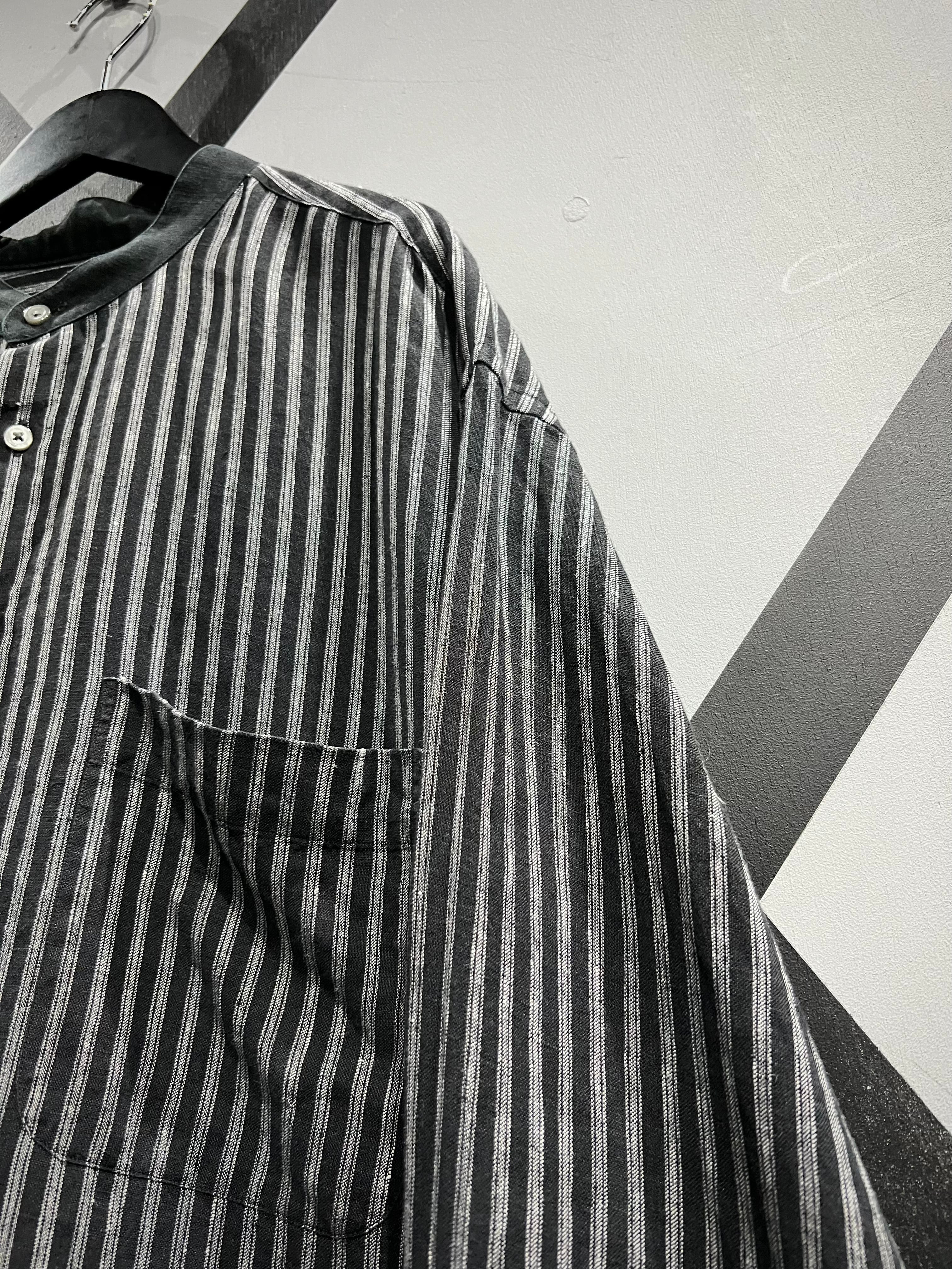 サラリとドライな質感のリネンを用いたボディに、モノトーンでストライプを載せたバンドカラーシャツ。