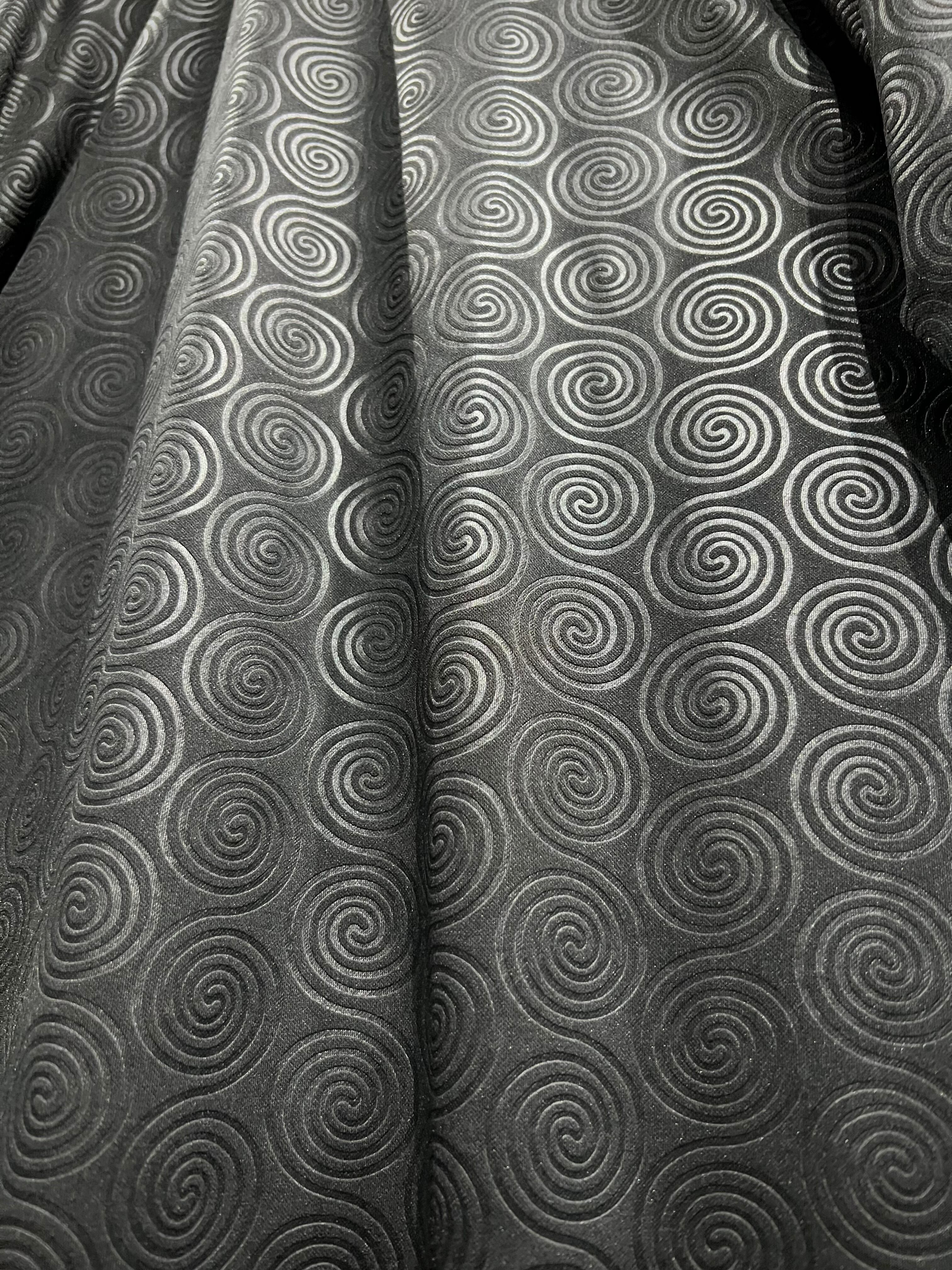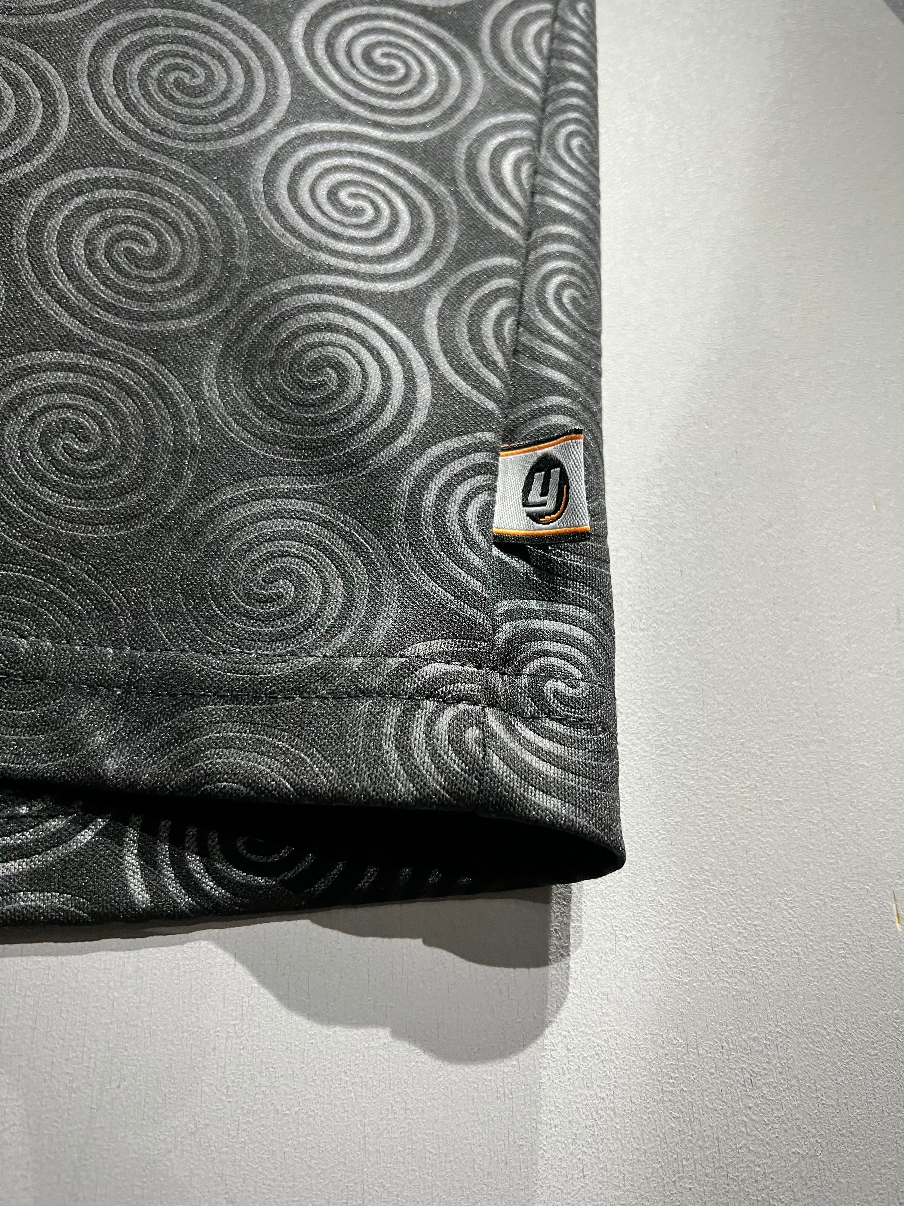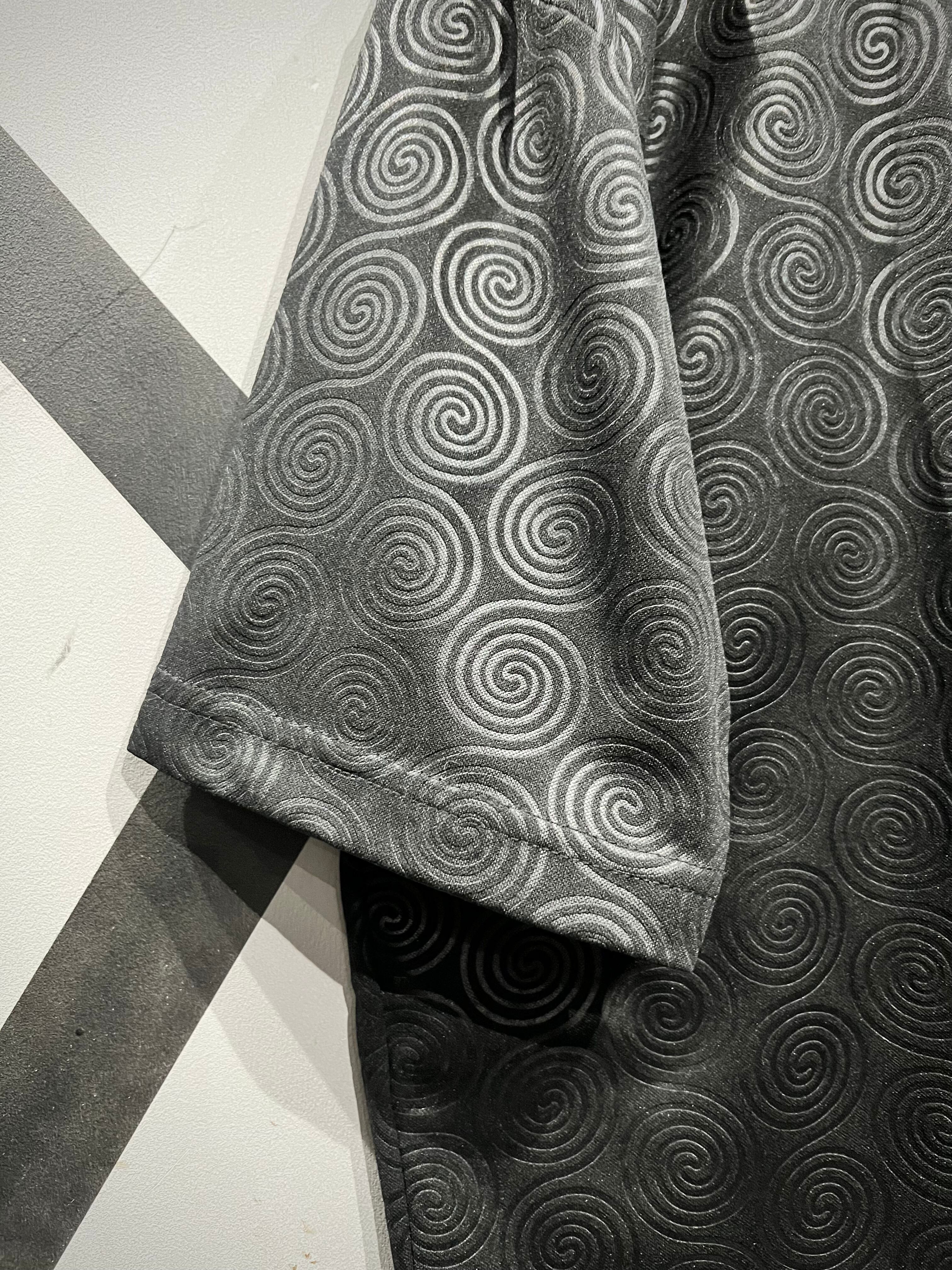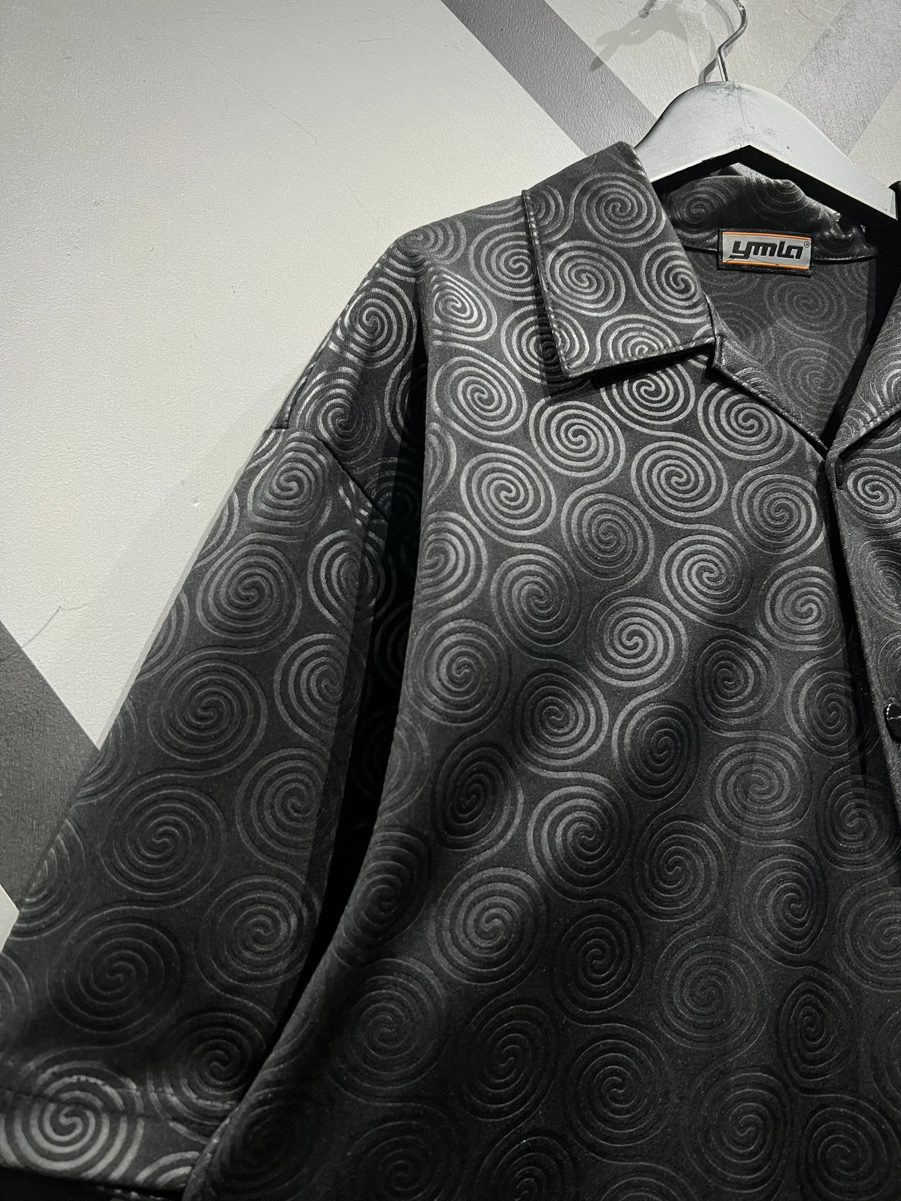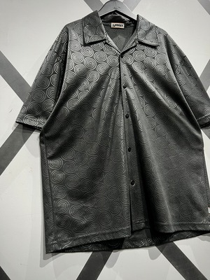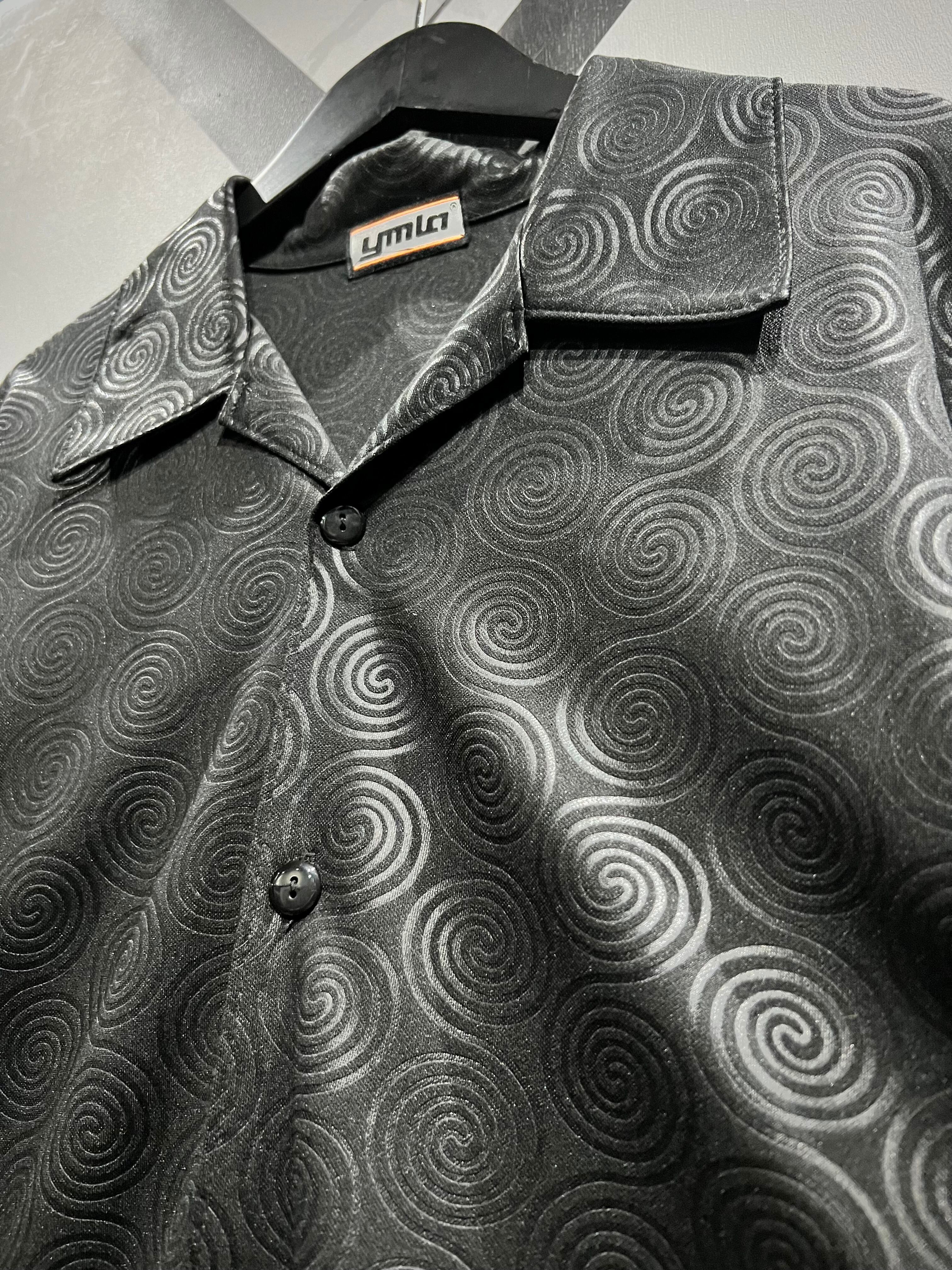 マットなブラックのボディをベースに、渦柄をプリントで載せた半袖オープンカラーシャツ。