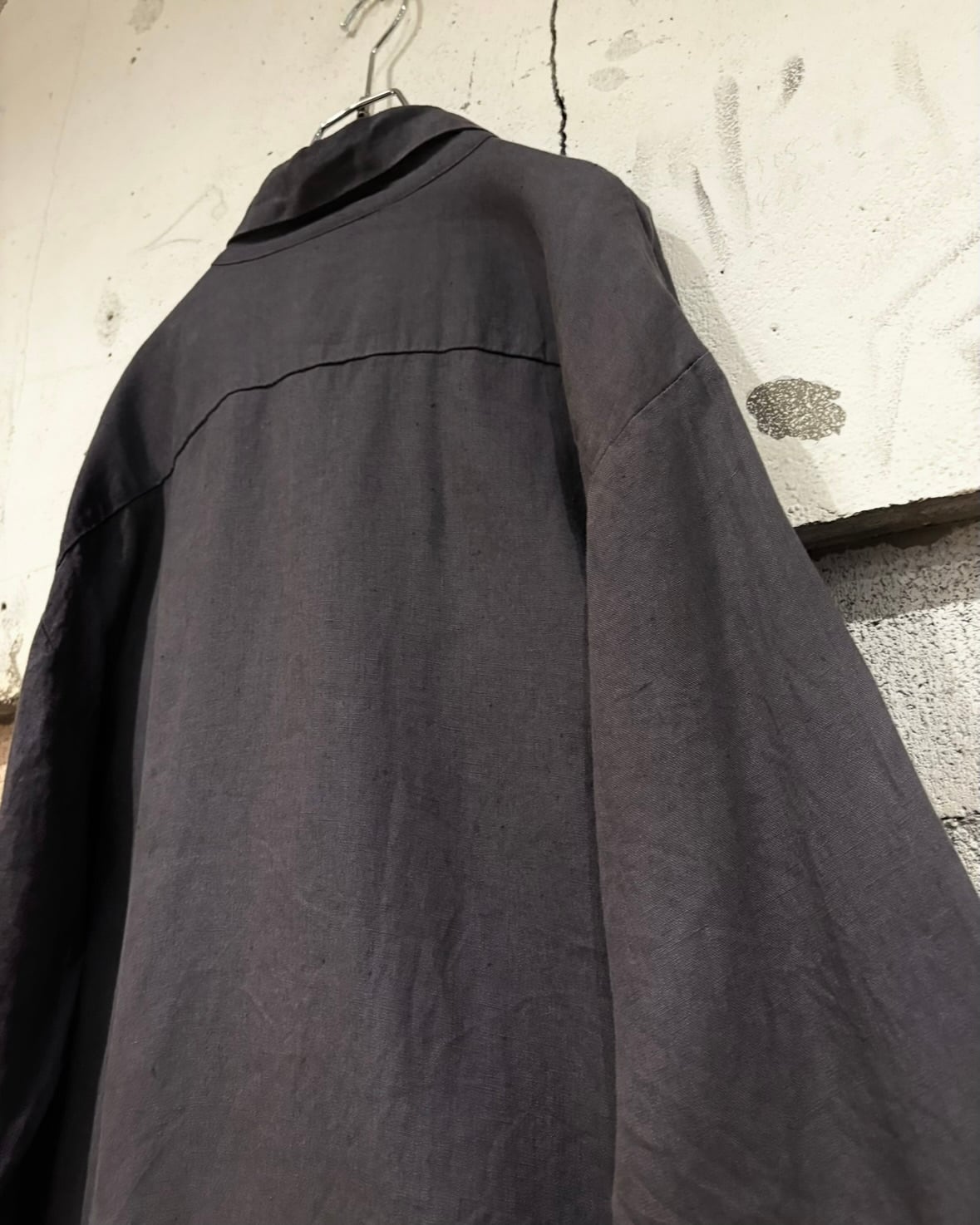 こなれ感のあるグレーのボディに、左胸にパッチポケットのみとシンプルなディテール。ボディに馴染むボタンを用いたことでより一層ミニマルなルックスに磨きがかかっています。