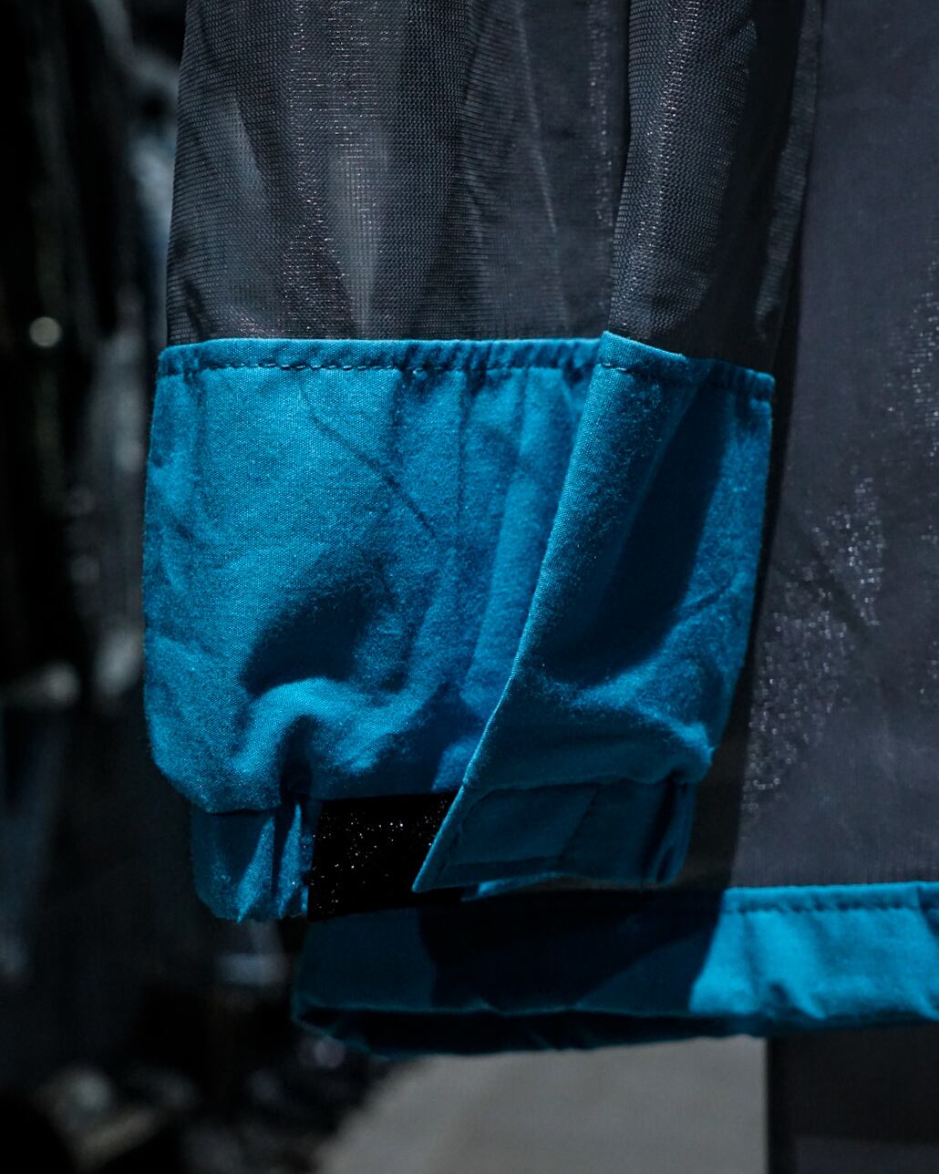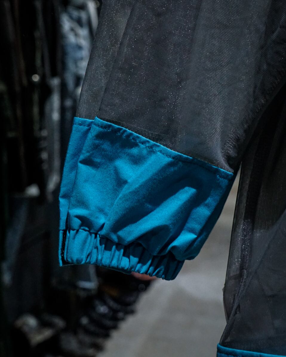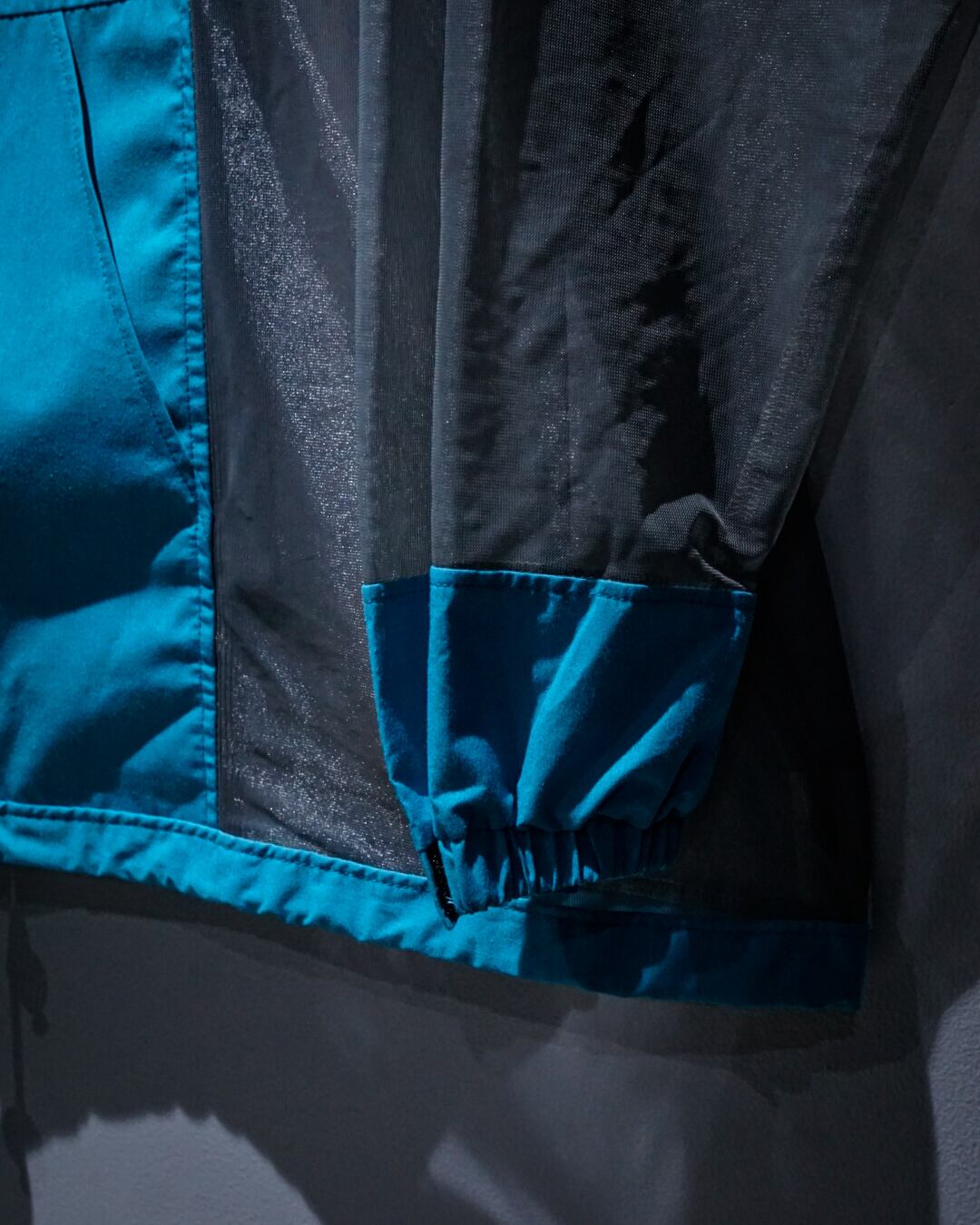 ハリのあるライトブルーのボディをベースに、各所がメッシュ素材に切り替えられ、そこにフラップポケットが取り付けられたレアカラーのバグジャケット。