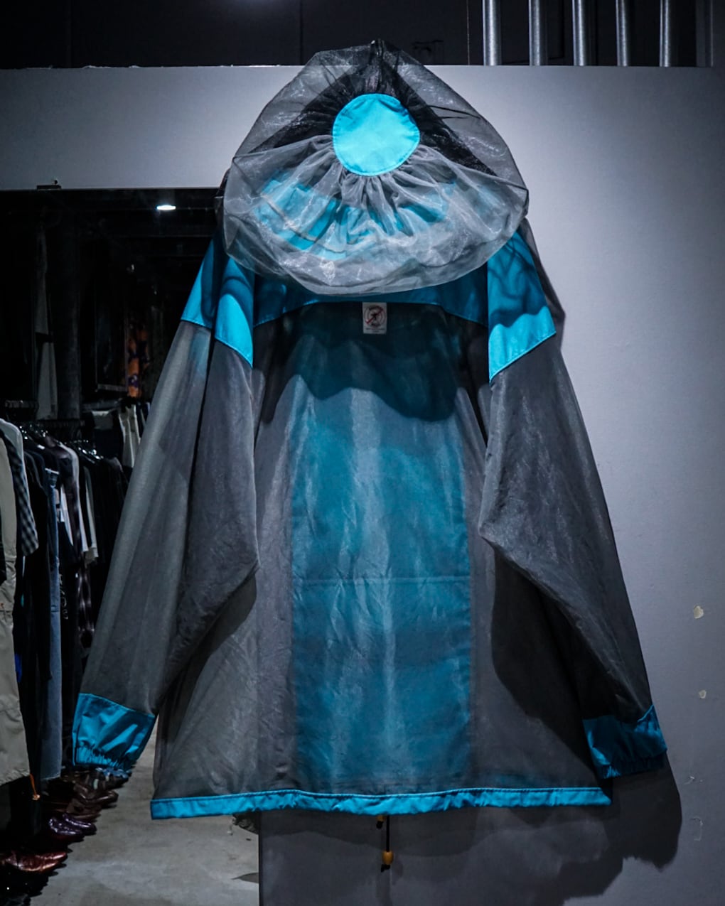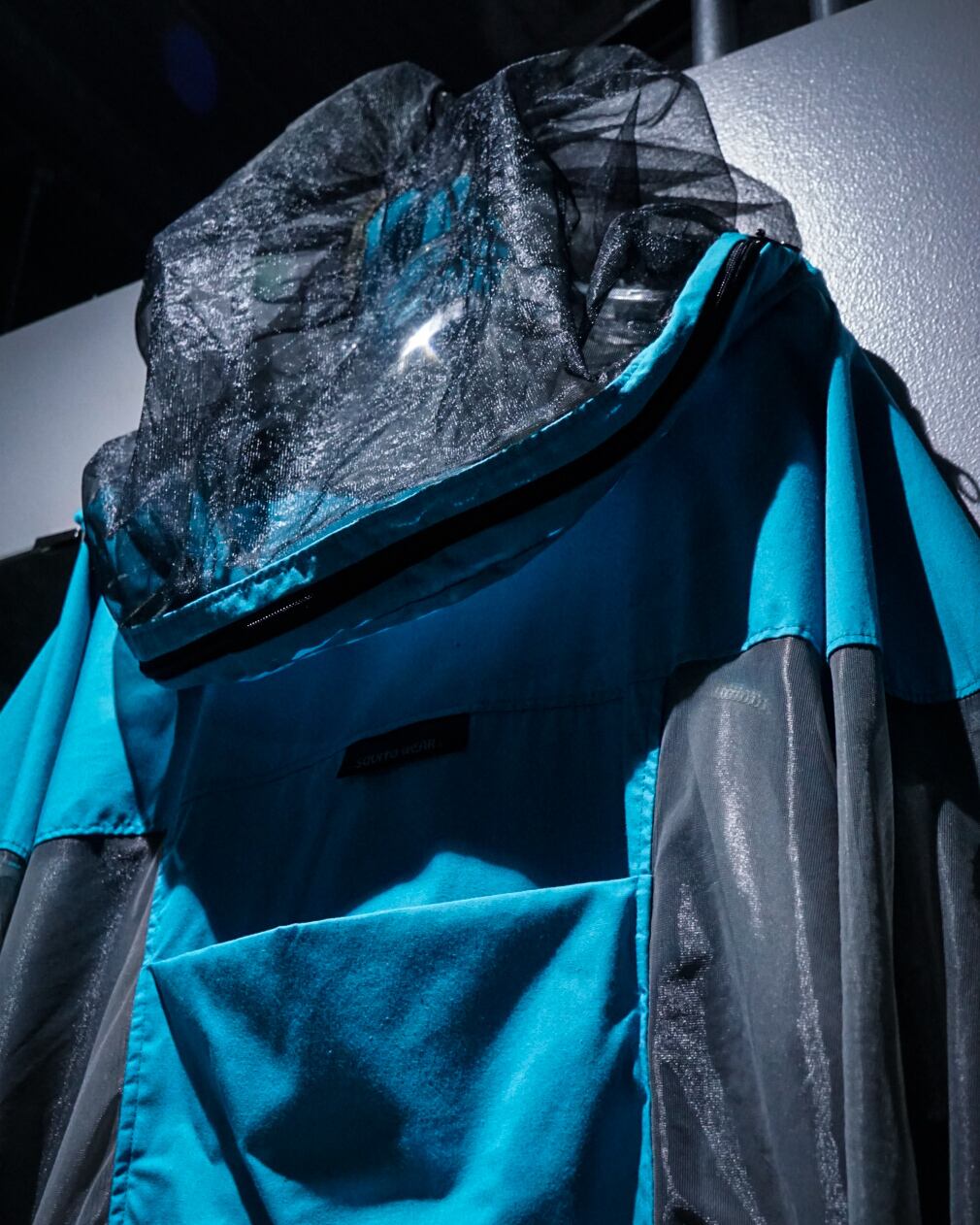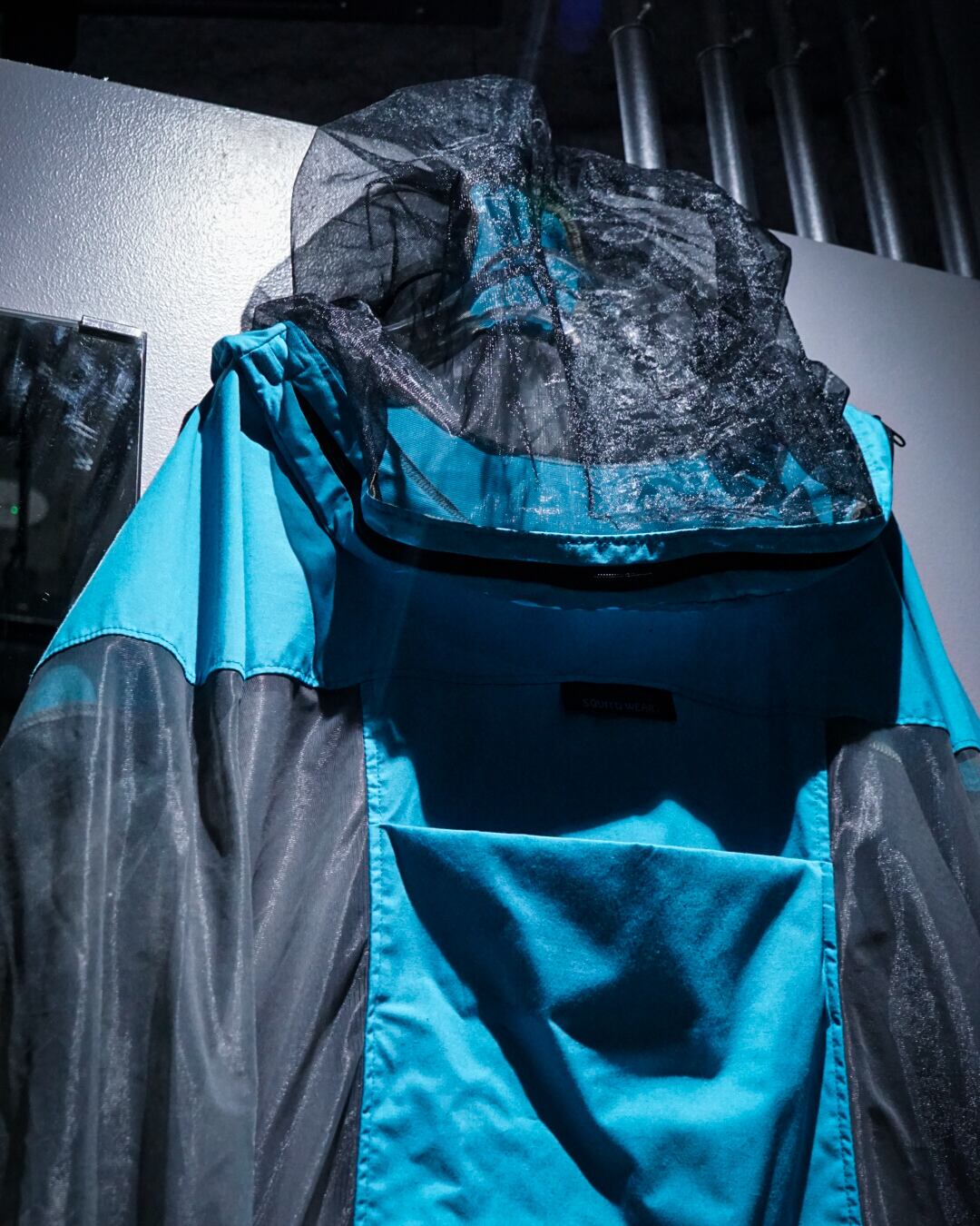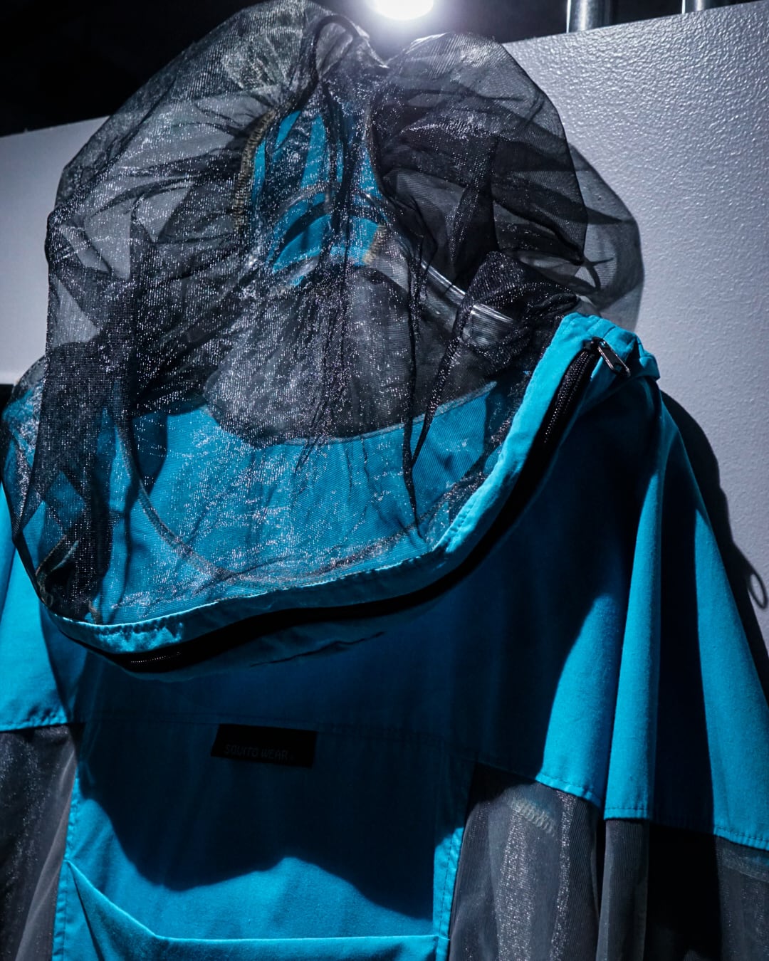 トレッキングや害虫駆除の為に使用される為、被った状態での作業を前提としたフードが施され、この状態で街を歩いていたらまず三度見はしてしまう程の迫力あるデザイン。