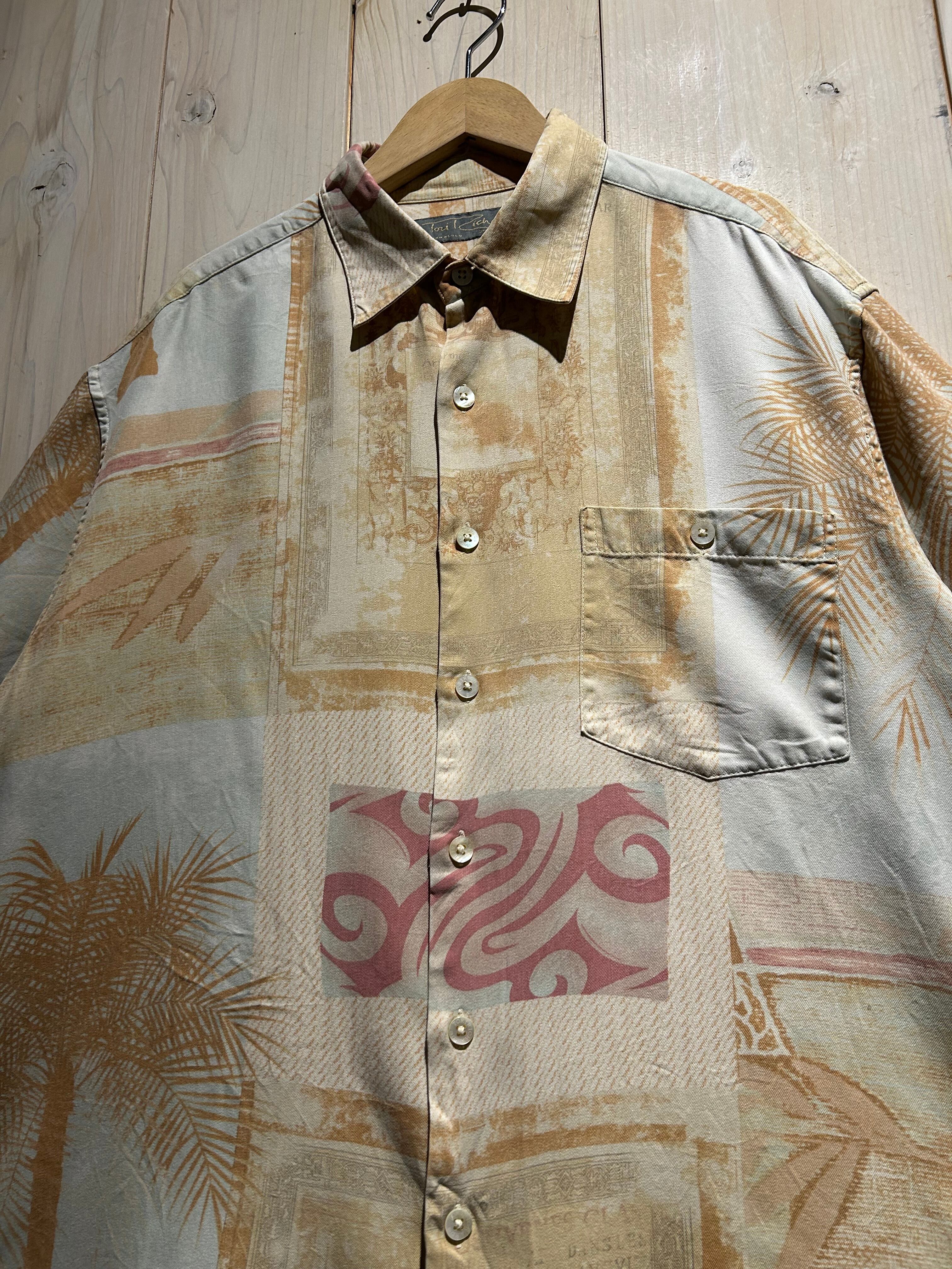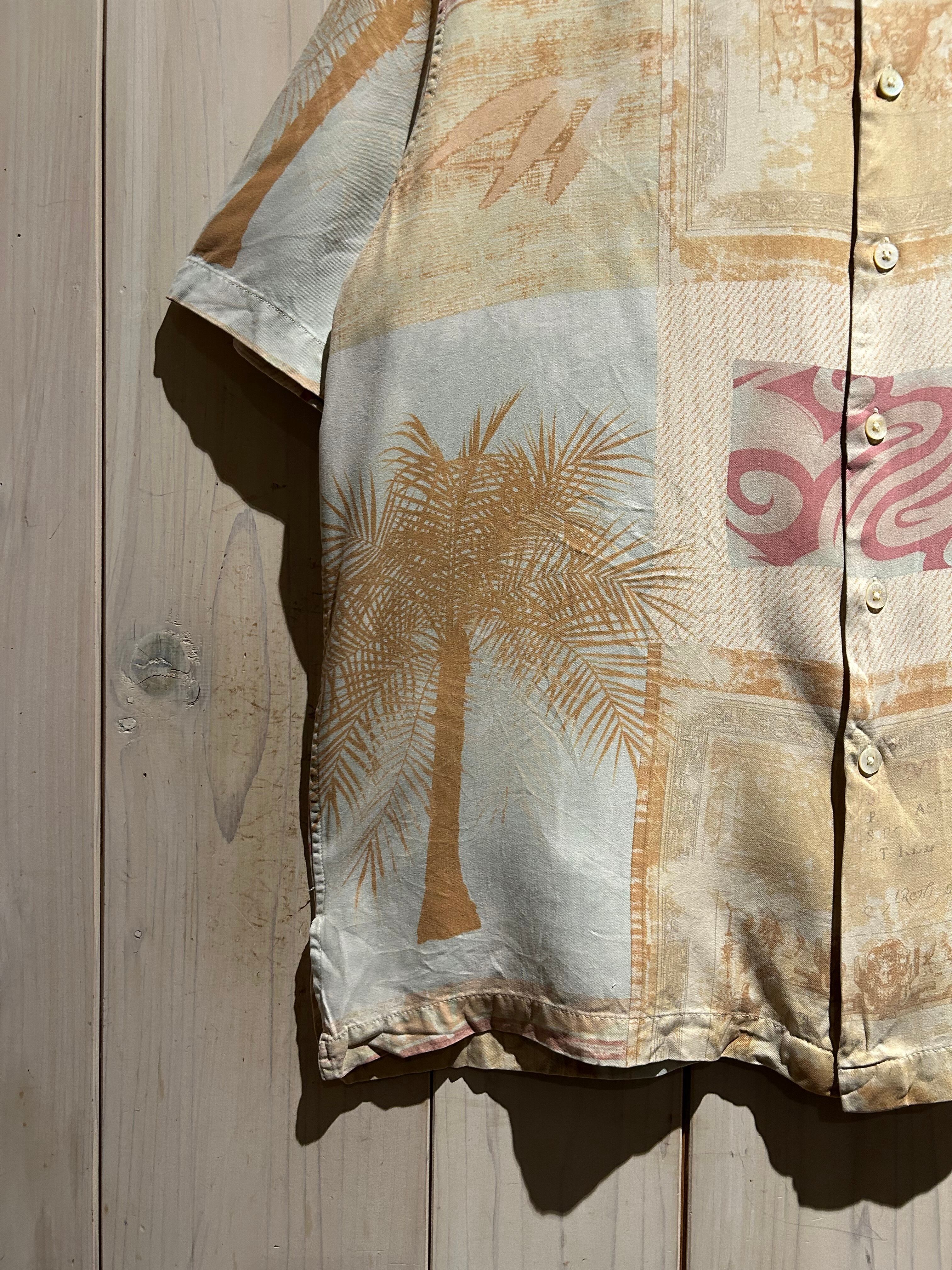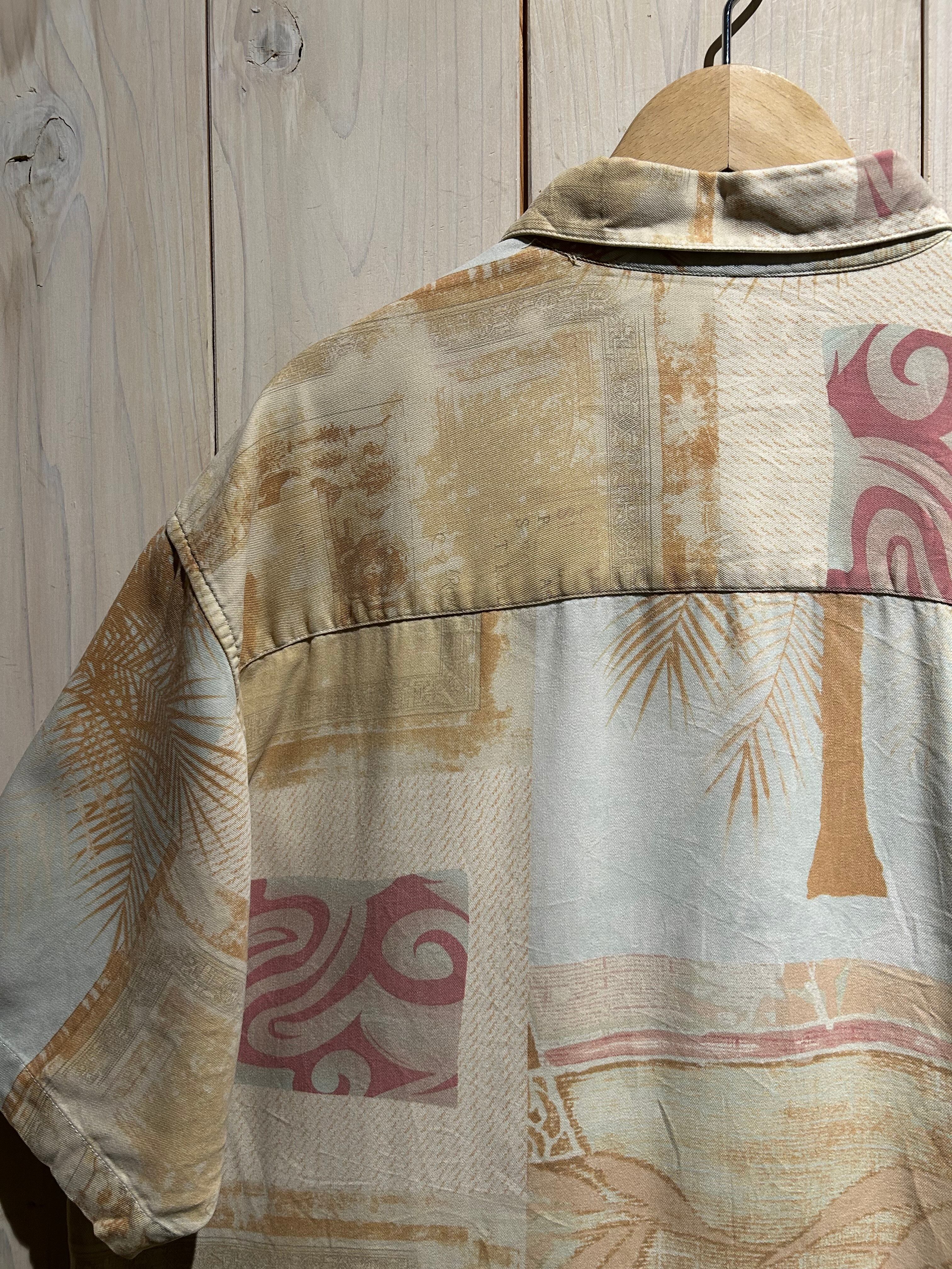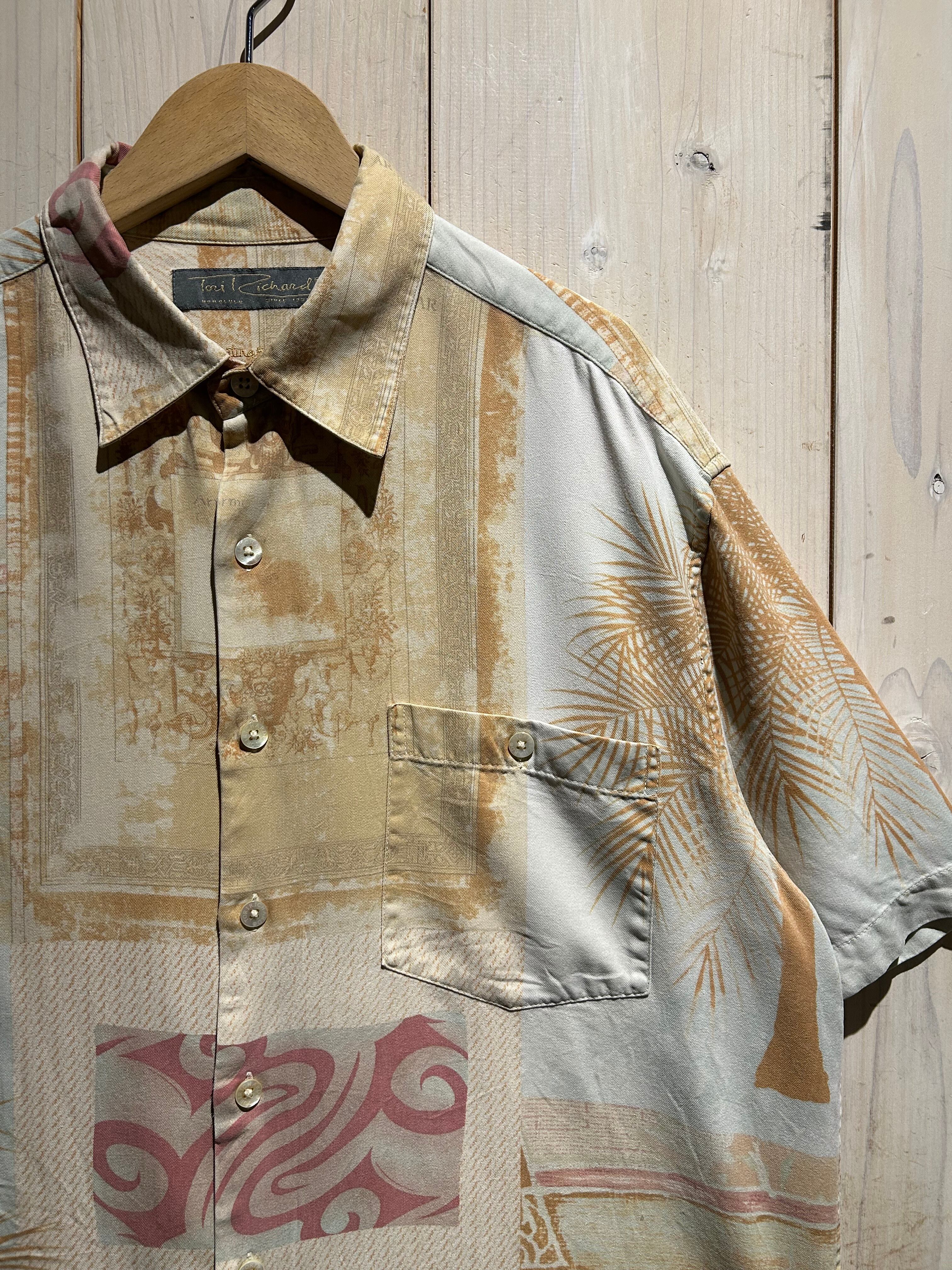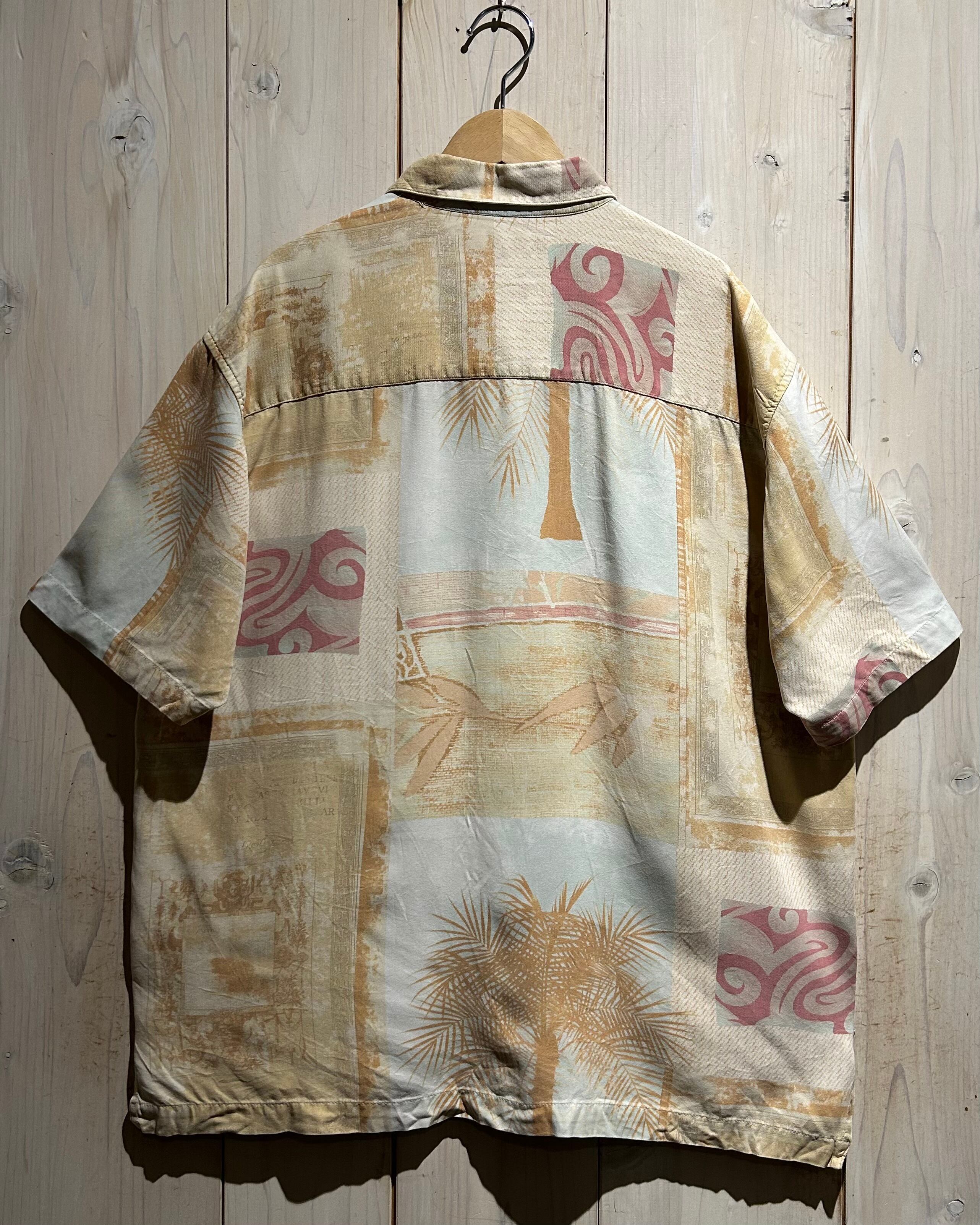 オフホワイトのボディに、ハワイアンなデザインを載せた半袖シルクシャツ。