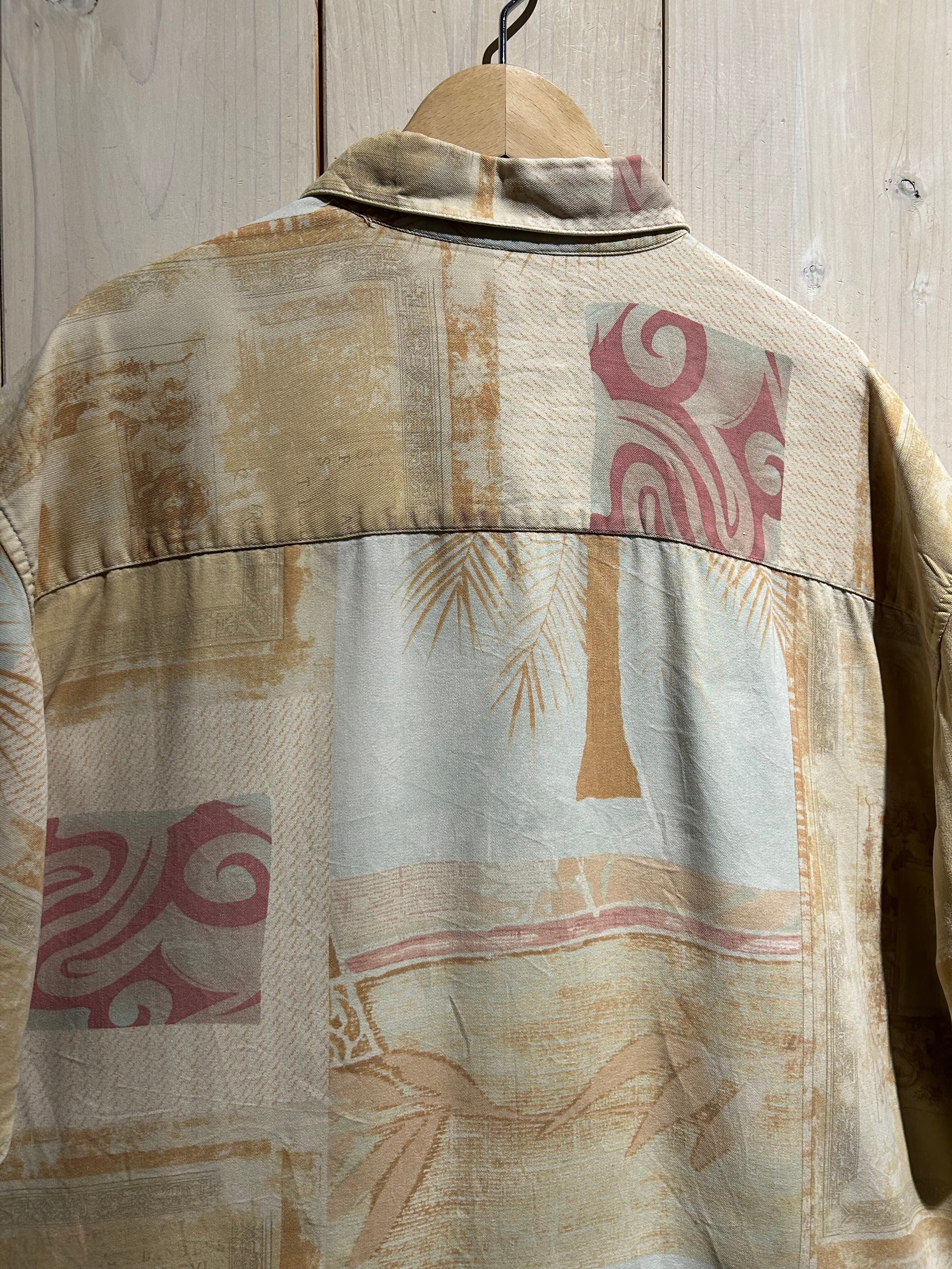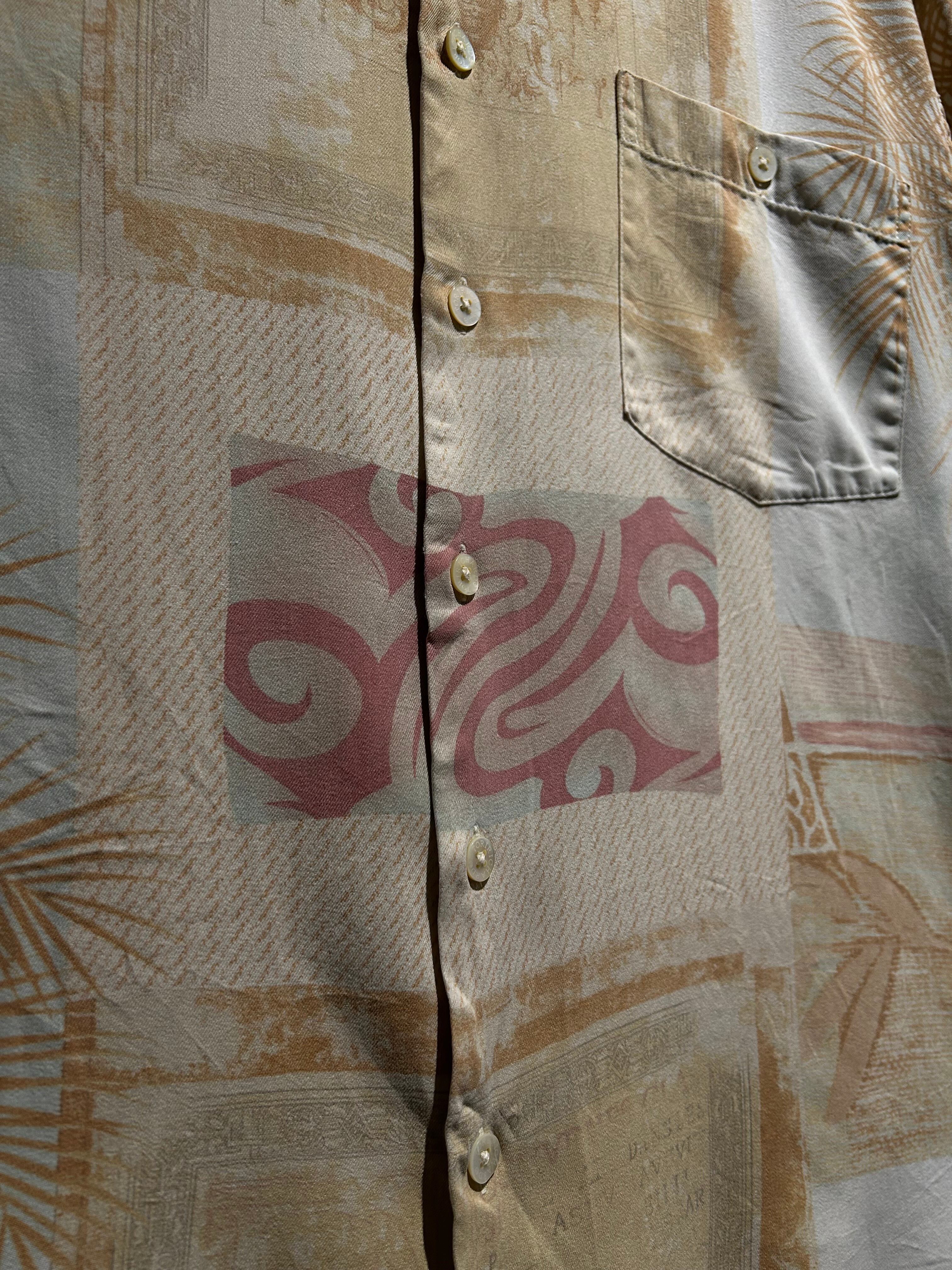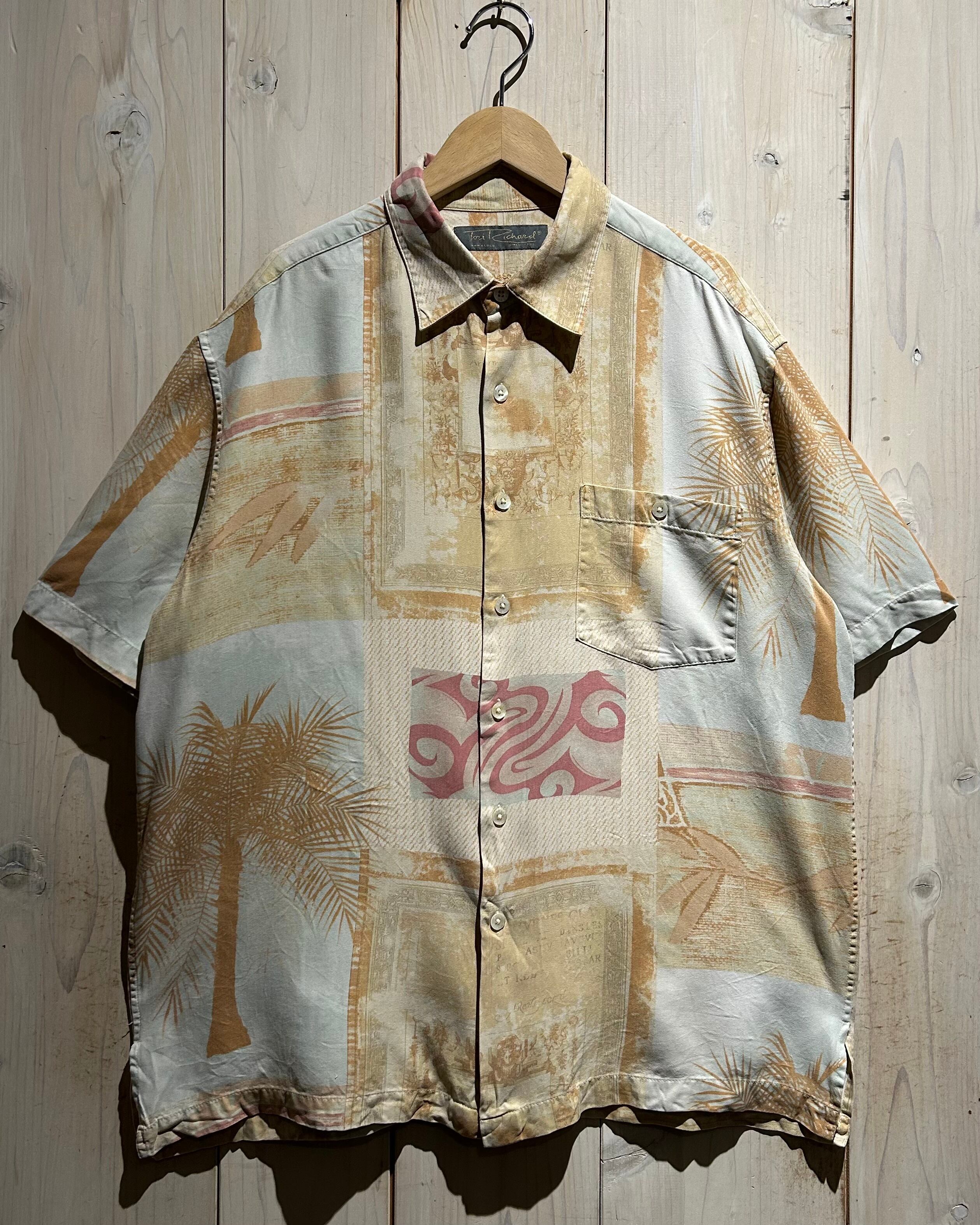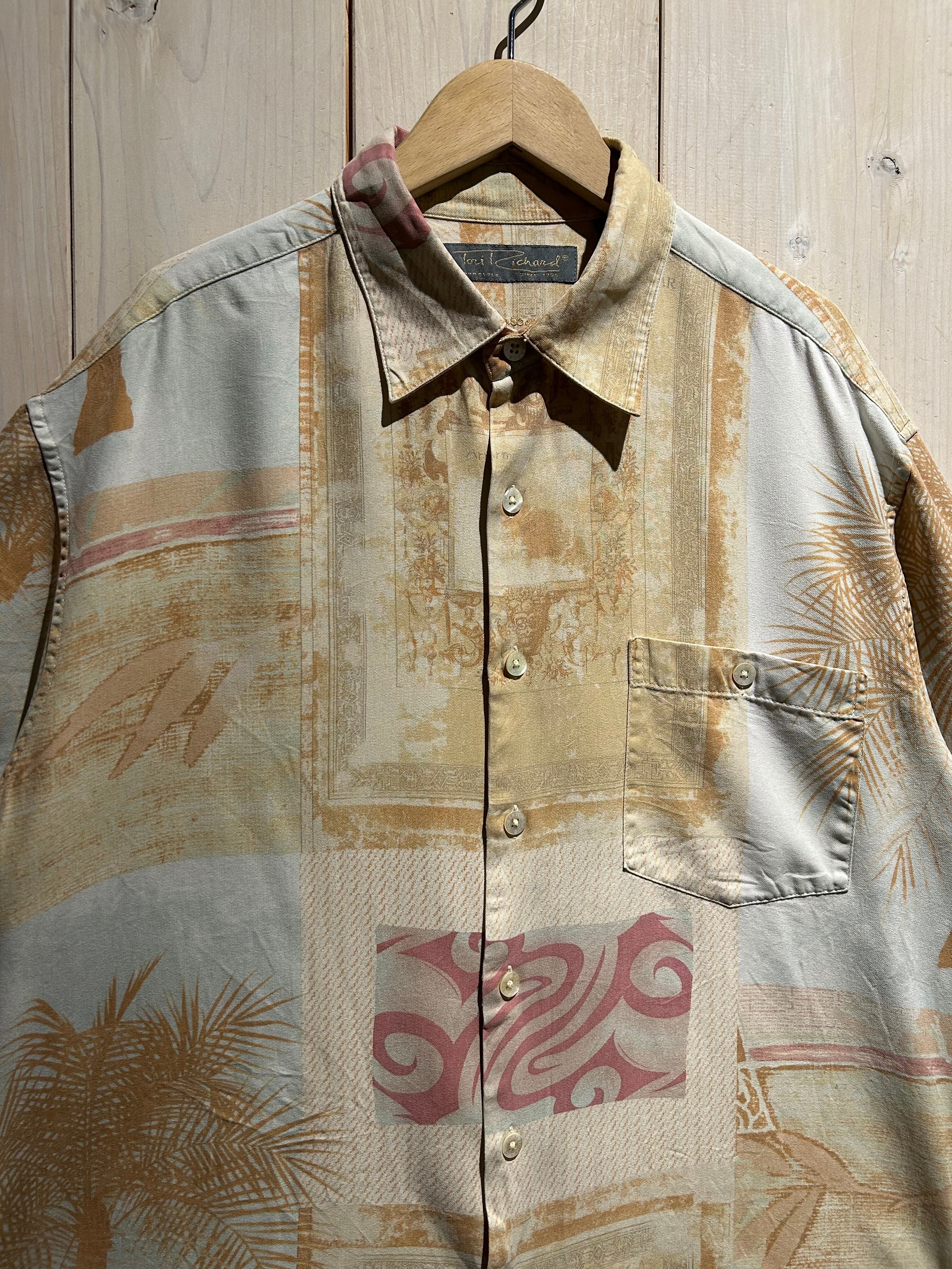 オフホワイトのボディに、ハワイアンなデザインを載せた半袖シルクシャツ。