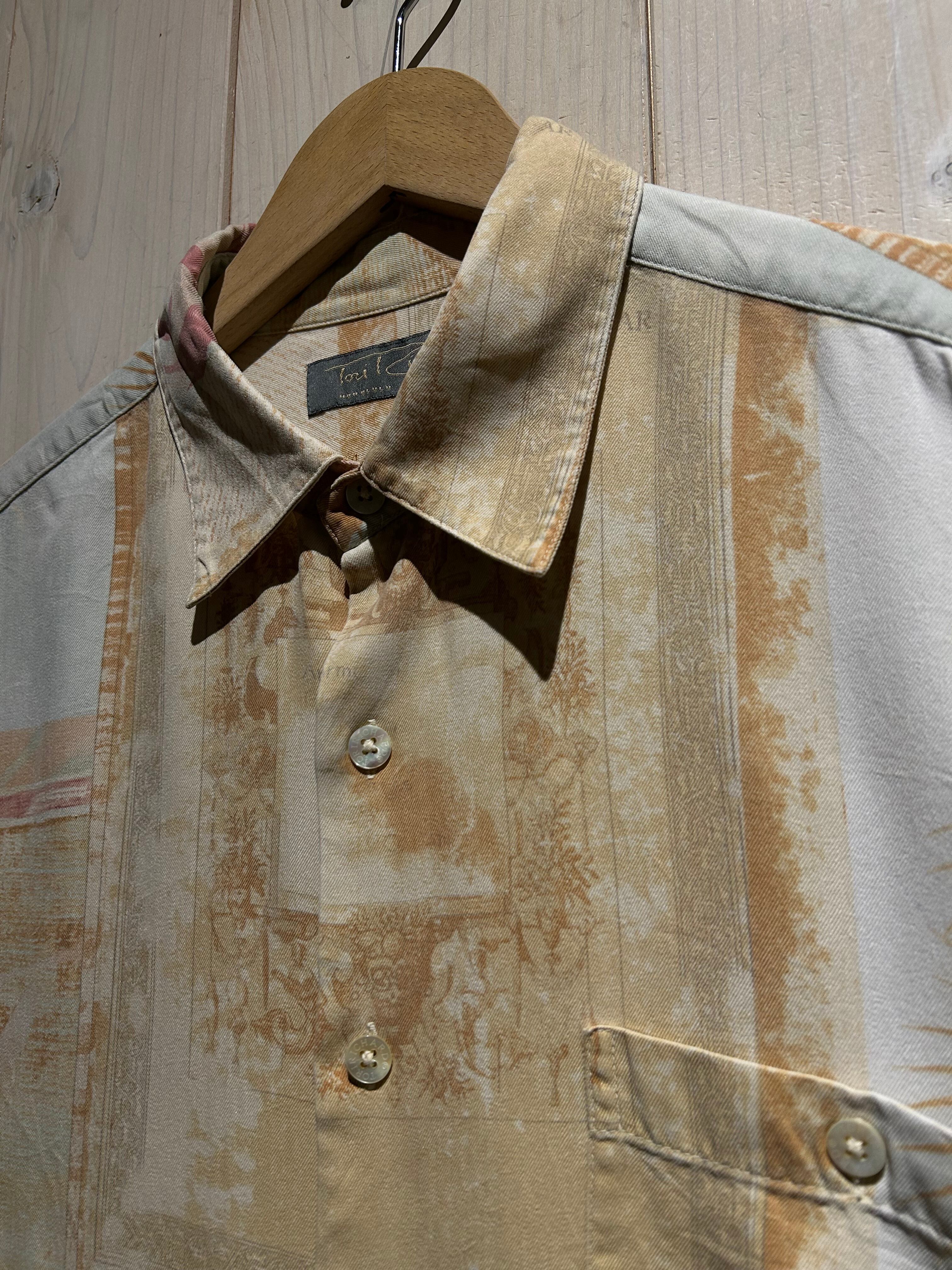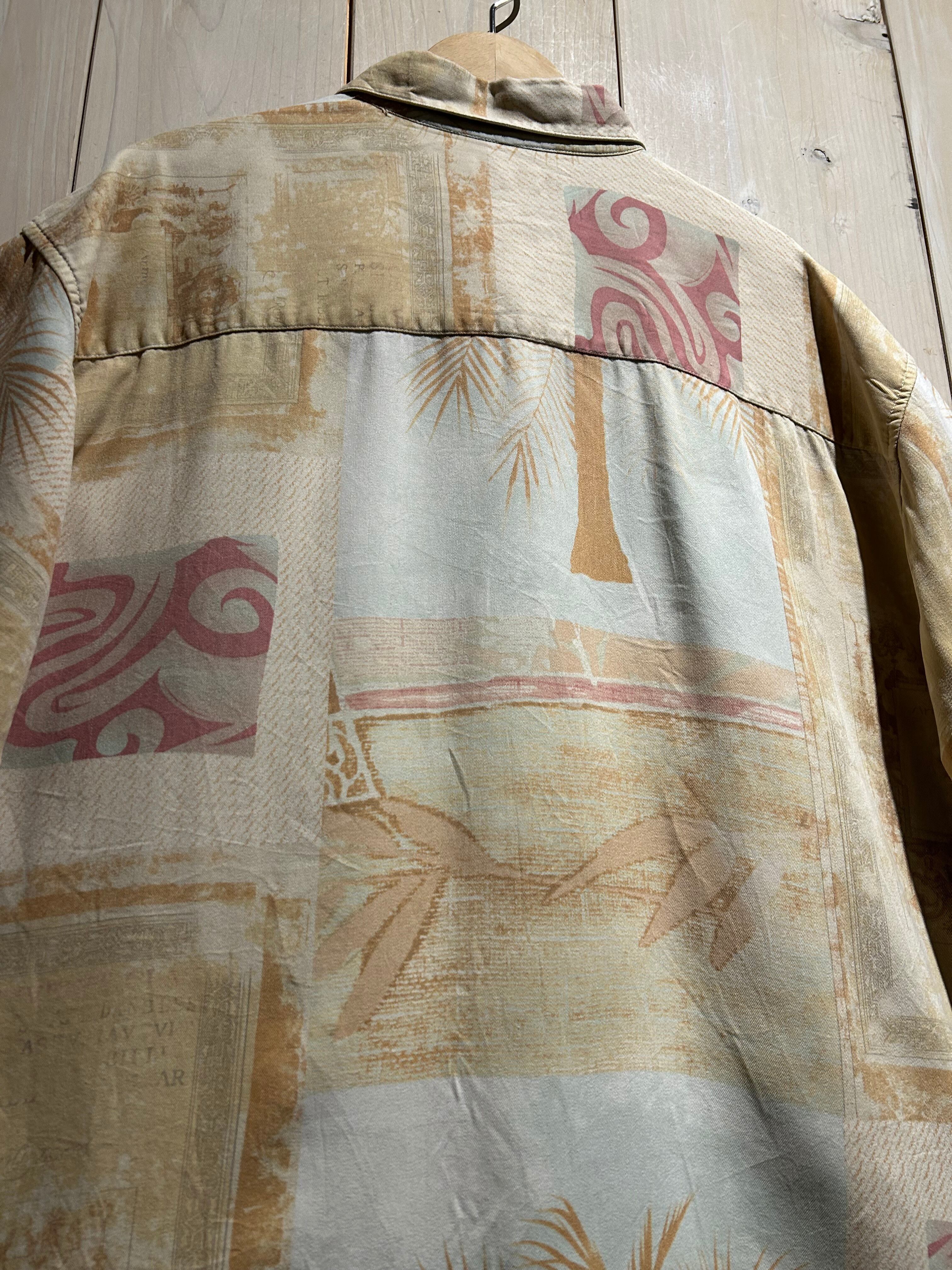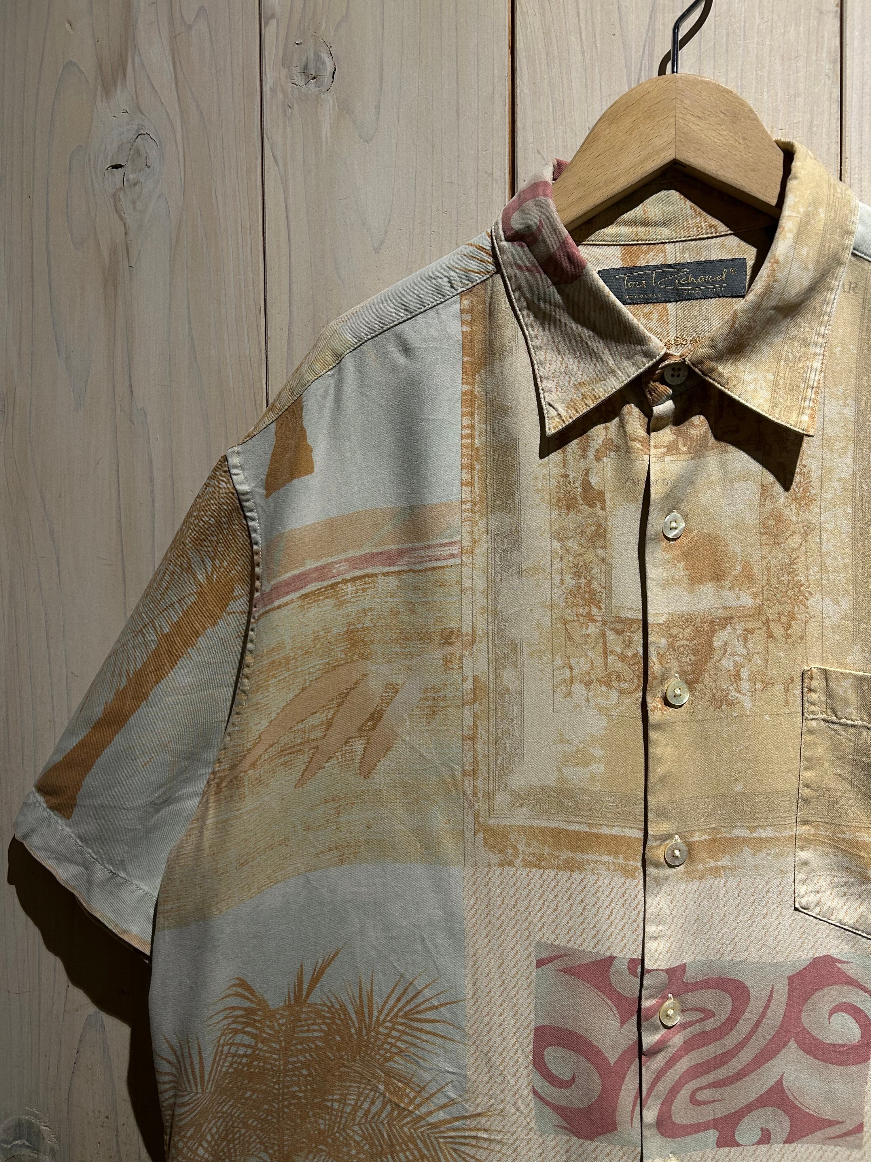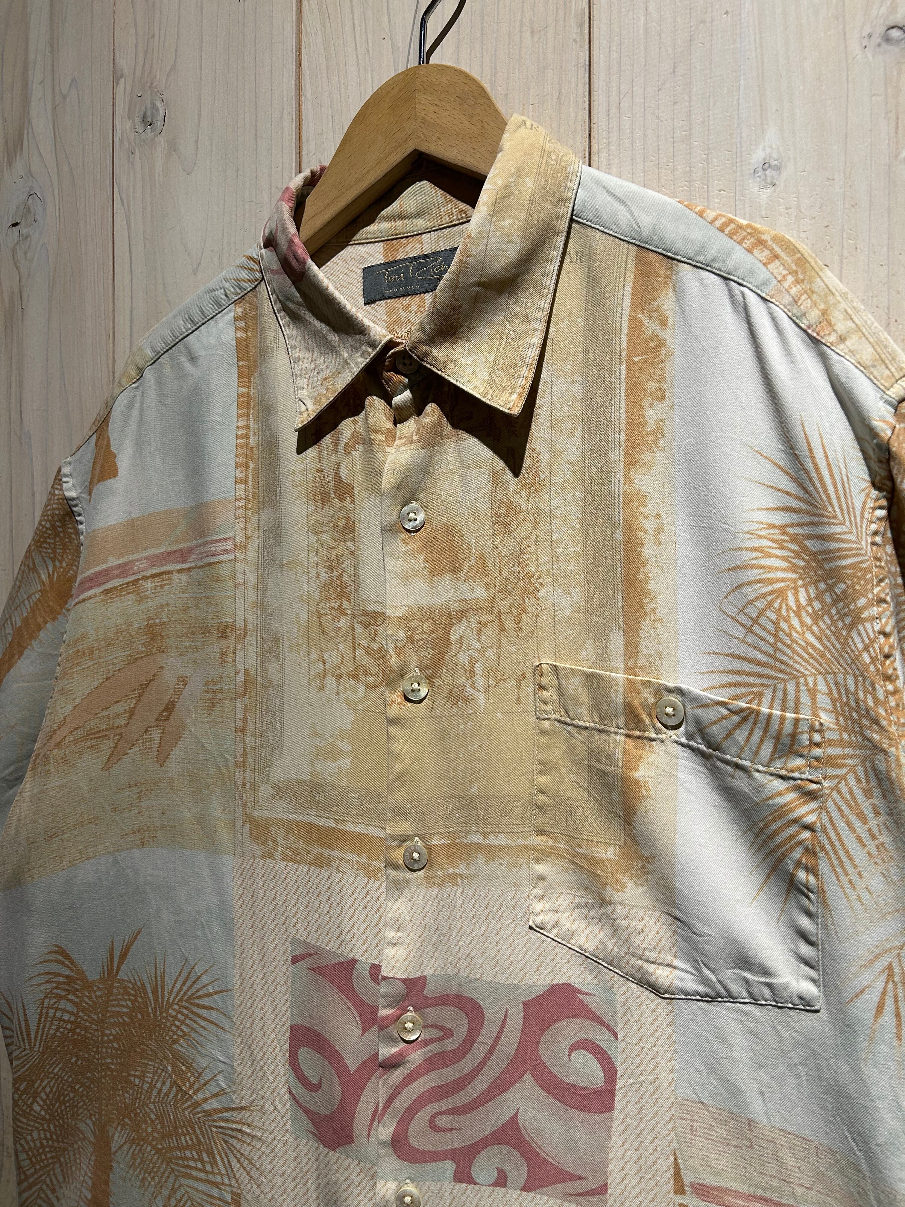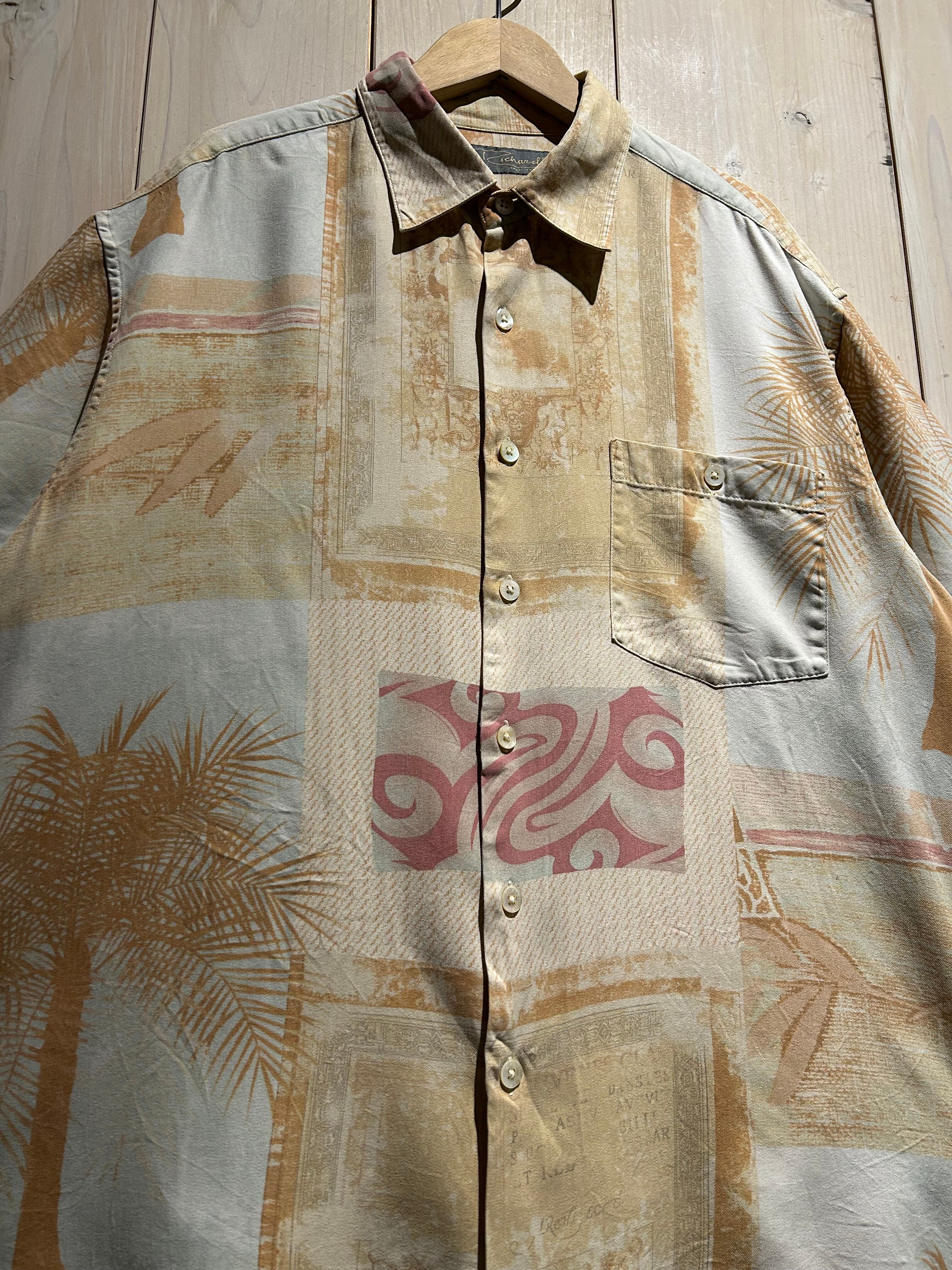オフホワイトのボディに、ハワイアンなデザインを載せた半袖シルクシャツ。