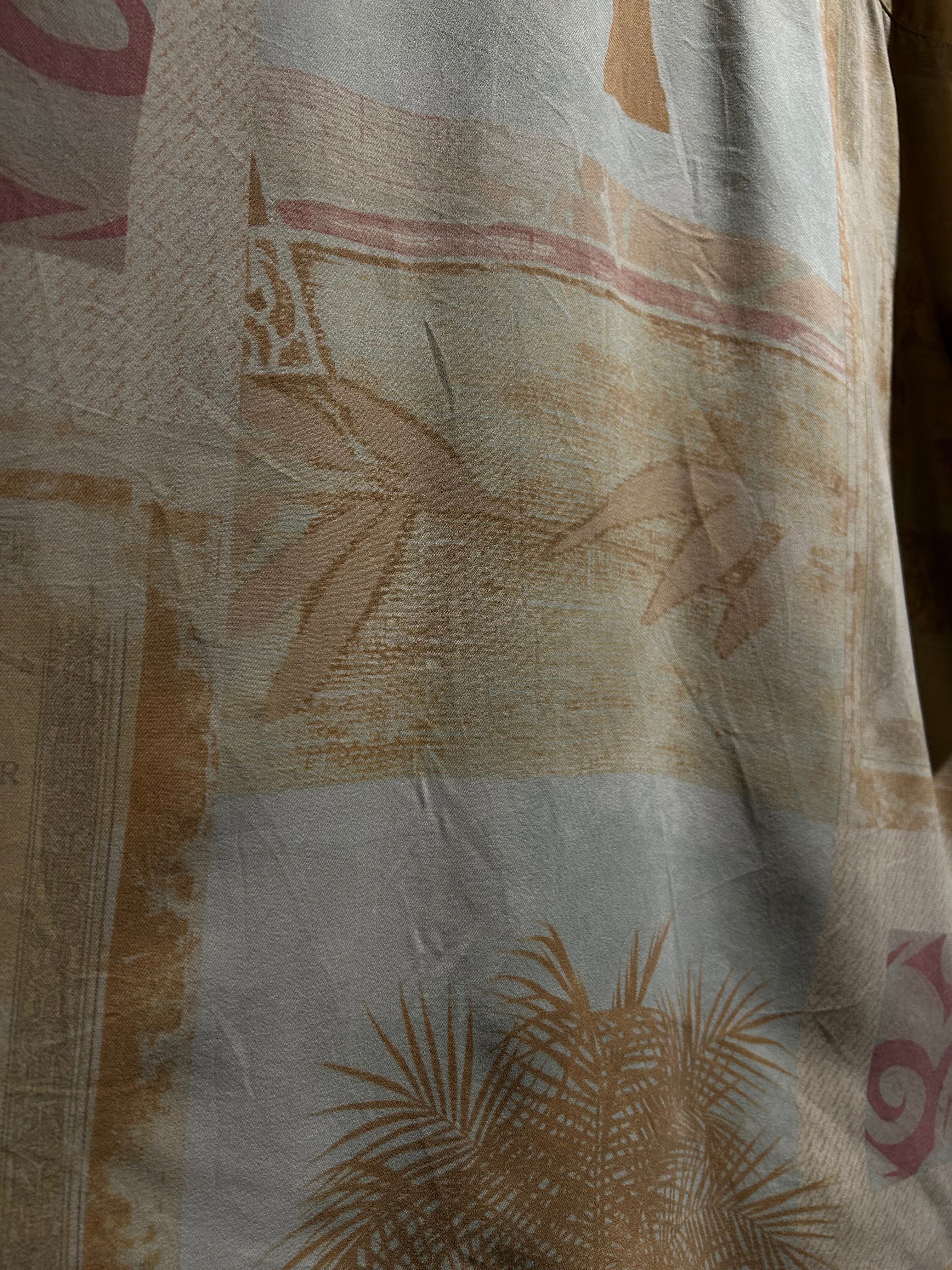 ヤシの木やアート調なデザインがボディ全体に載せられ、異国な雰囲気漂う仕上がり。総柄ですが、淡いカラートーンで揃えた事によりまとまりのある仕上がりとなっています。