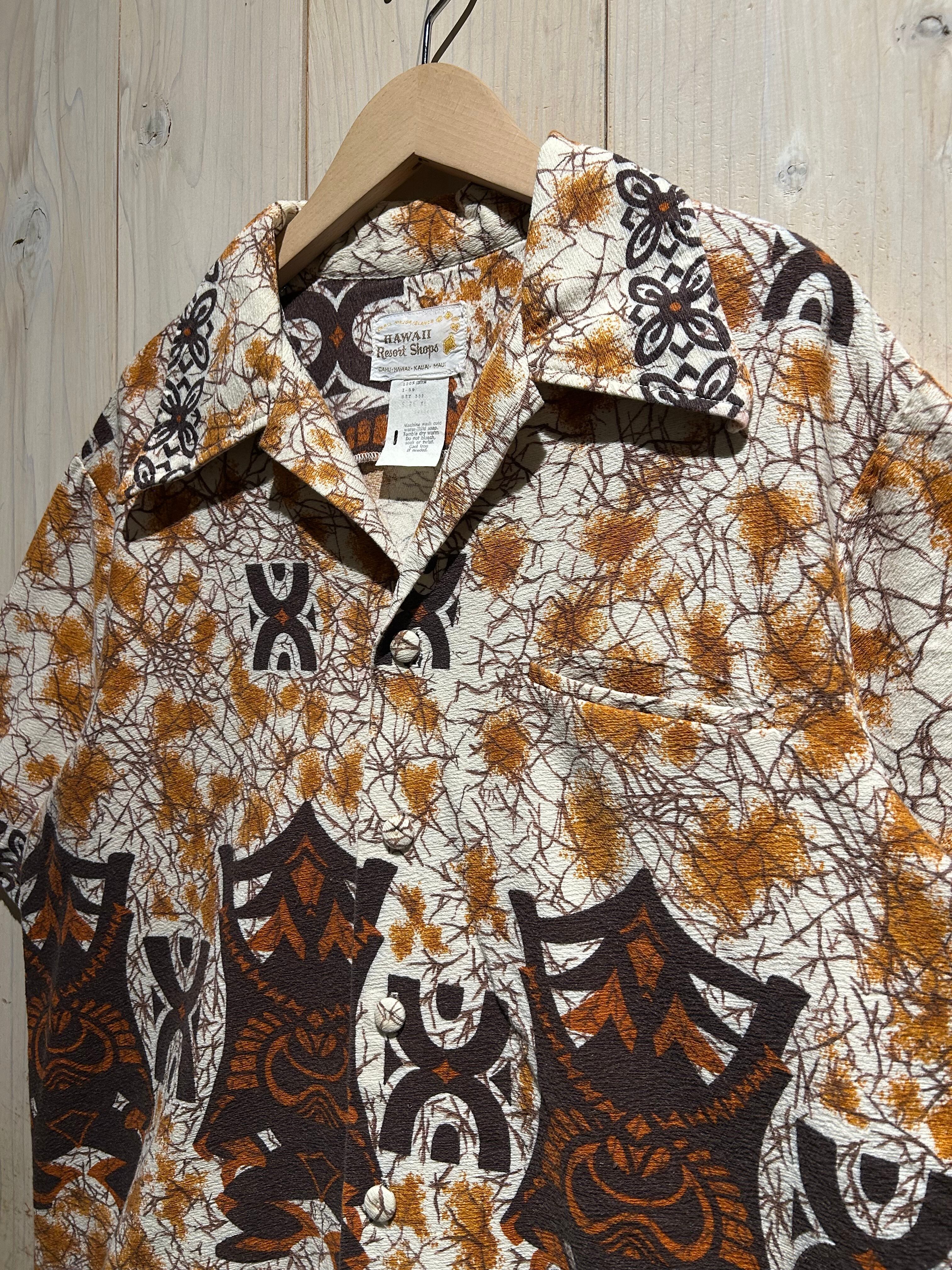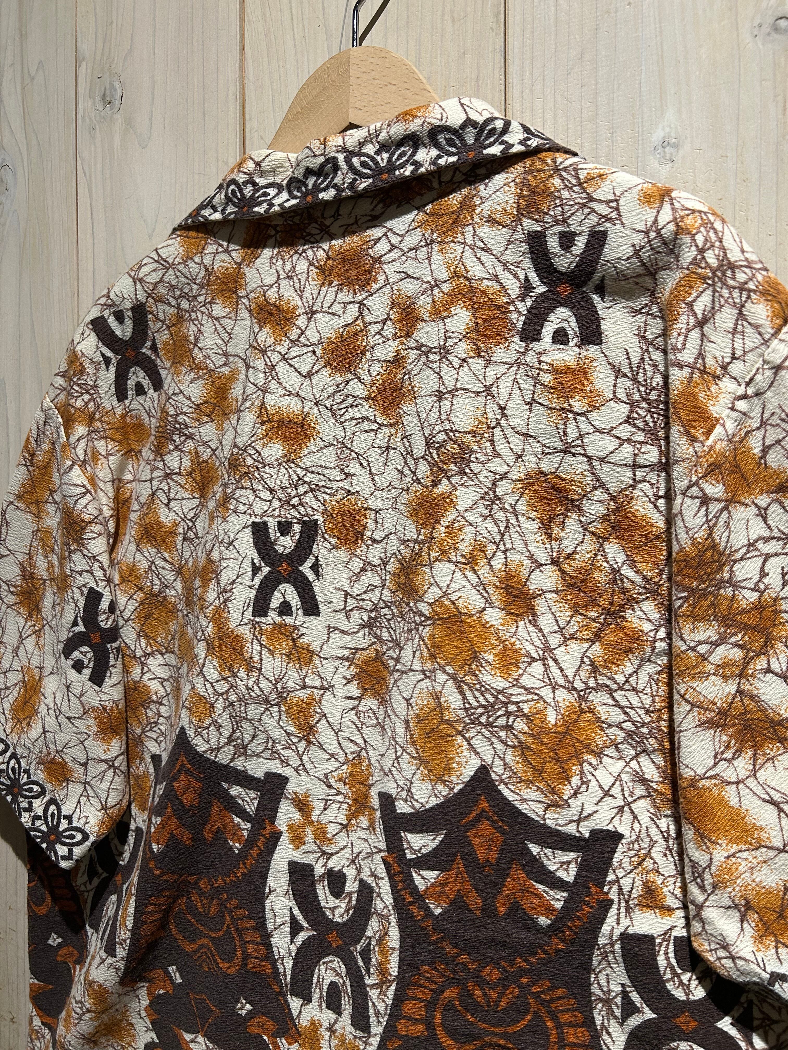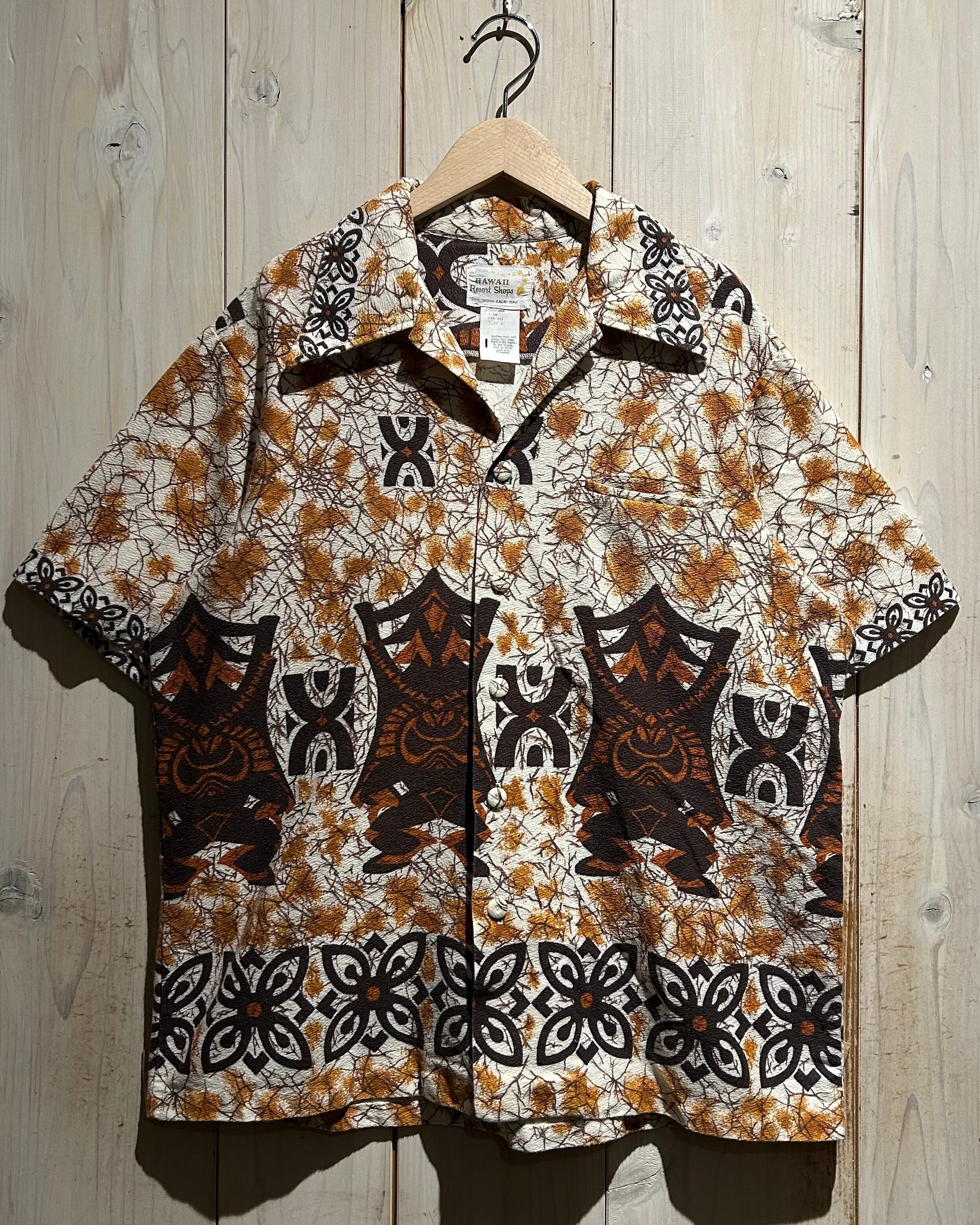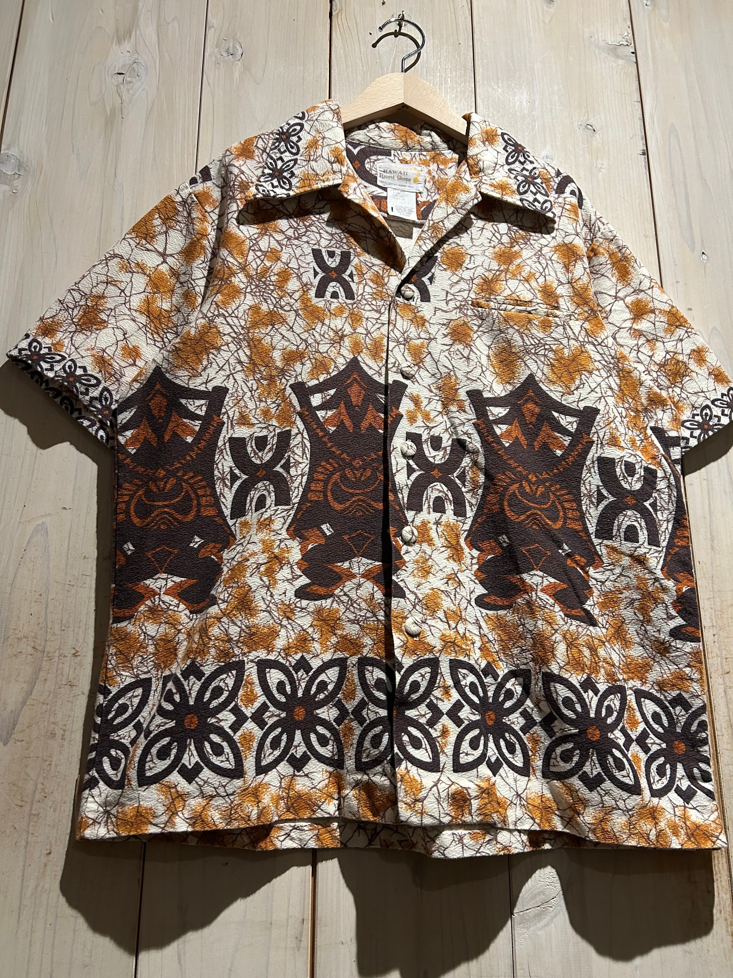 ハリのあるコットンを用いたボディ、ハワイ神話に登場する神様たちをモチーフにした木彫りや石で作られた神の像である"ティキ"をモチーフにエスニックなデザインを載せた70'sヴィンテージのアロハシャツ。
