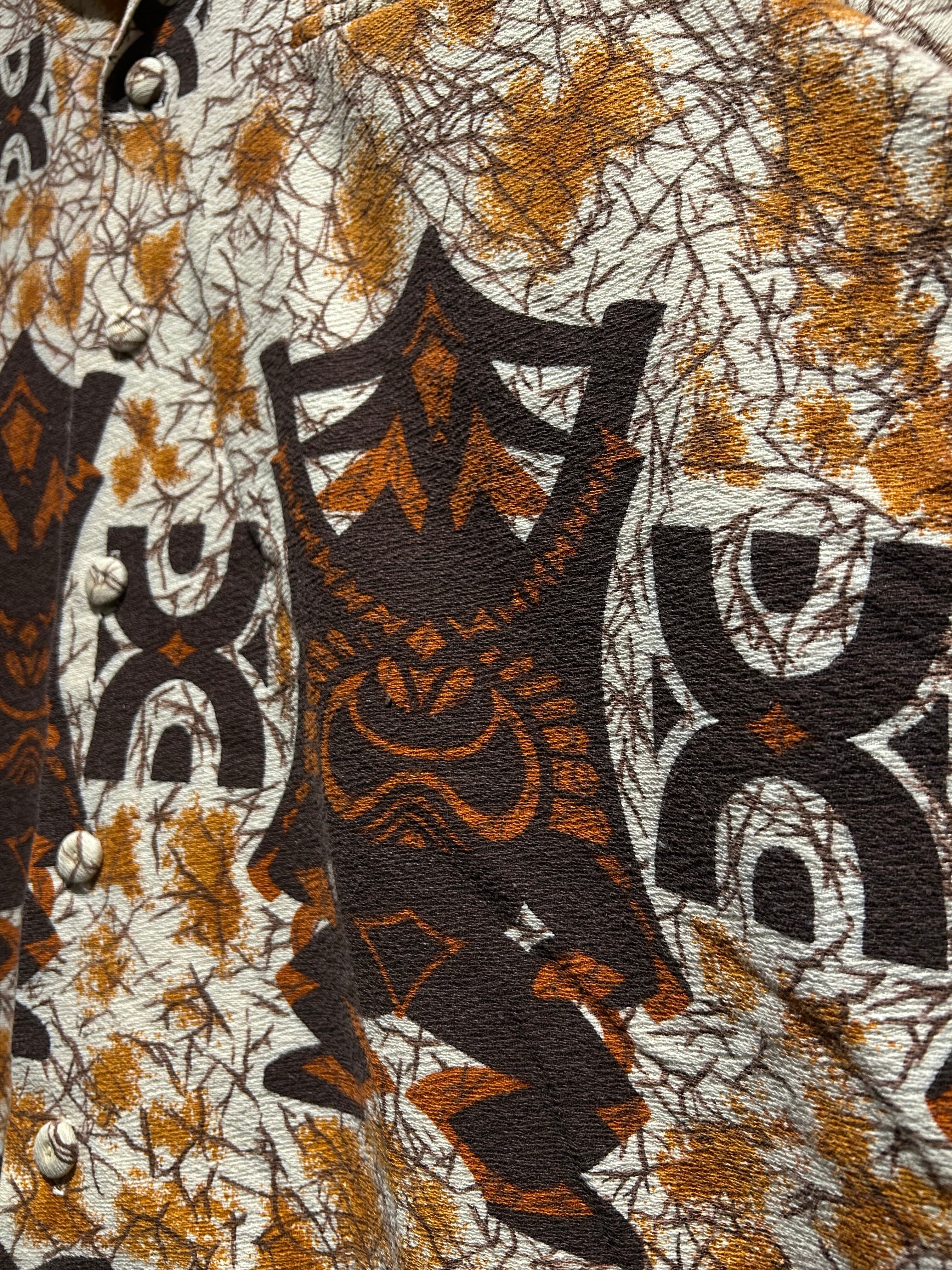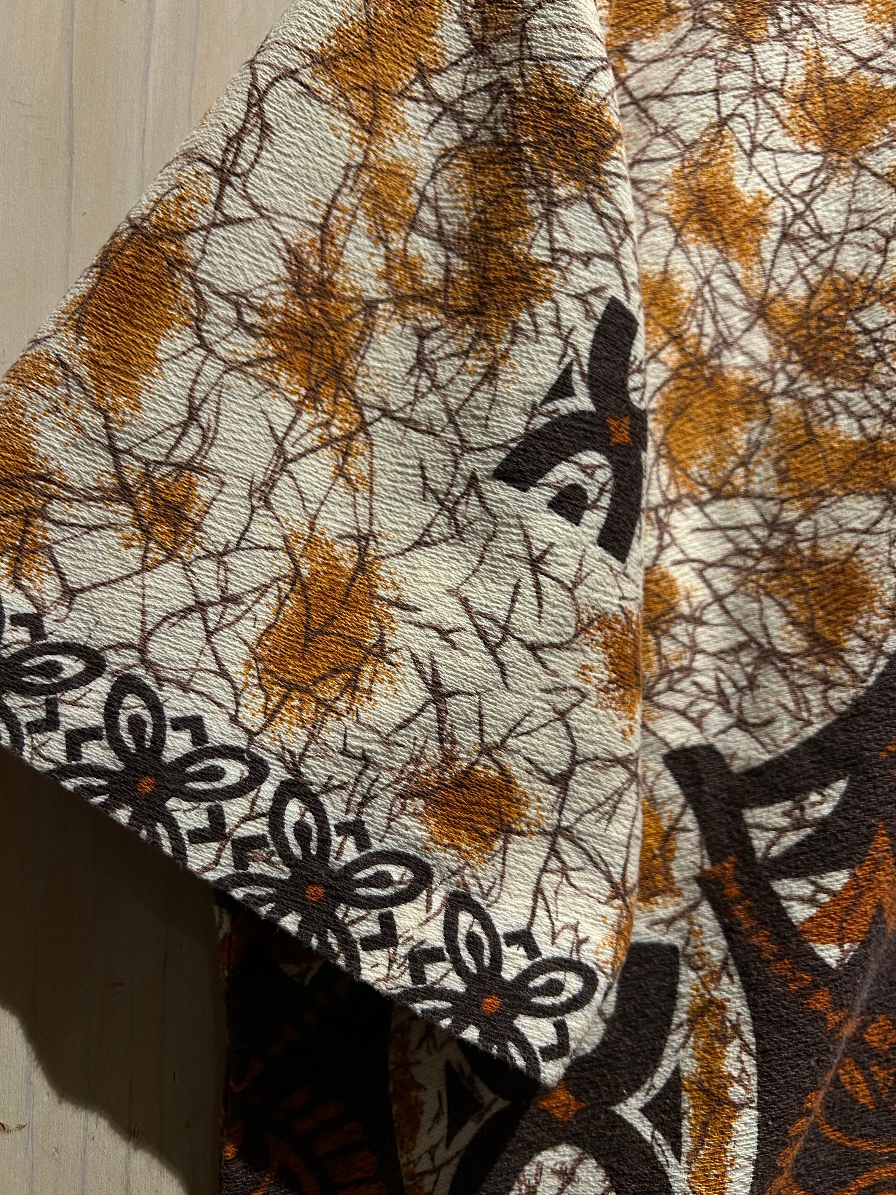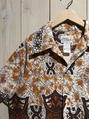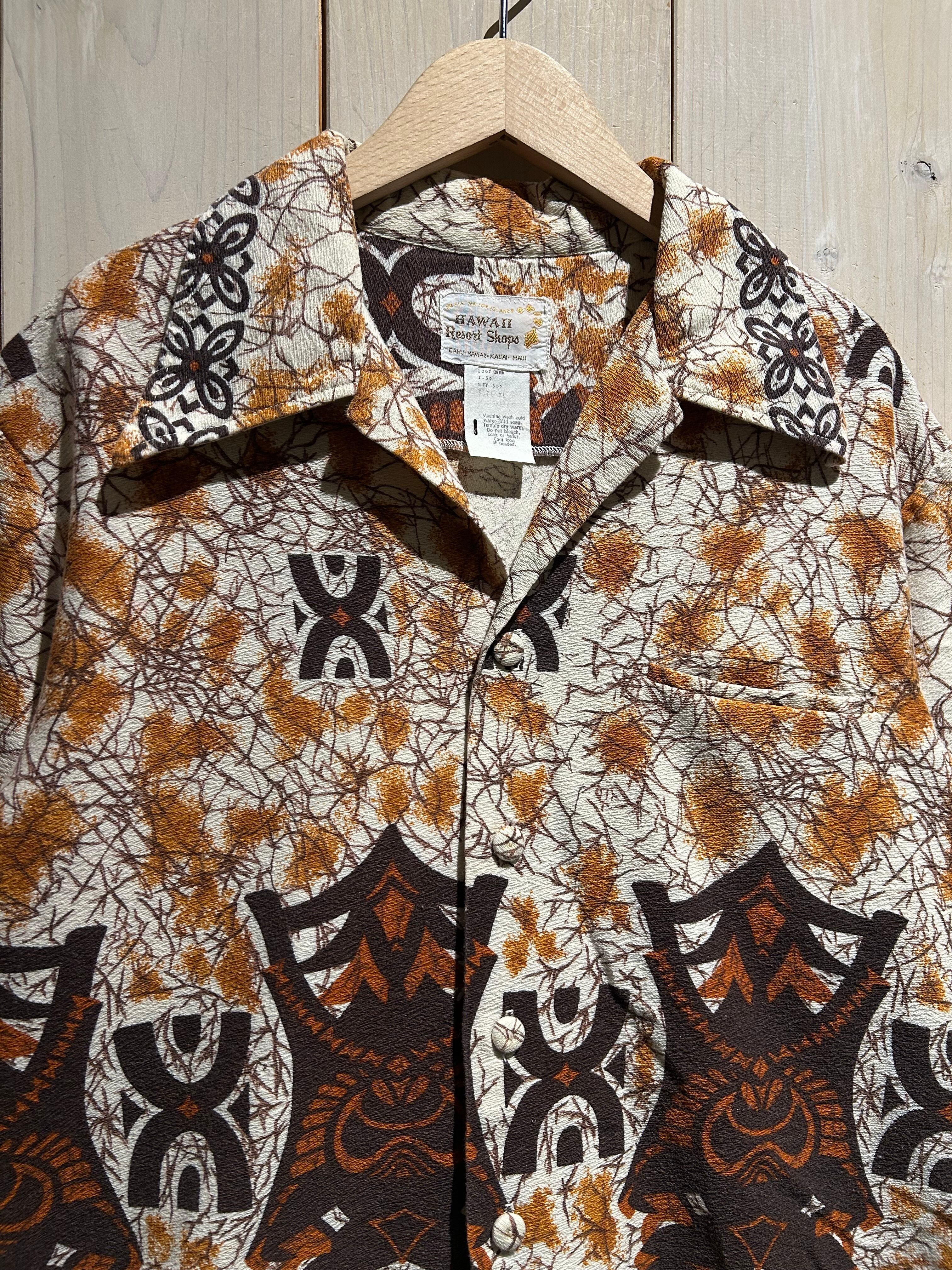 ハリのあるコットンを用いたボディ、ハワイ神話に登場する神様たちをモチーフにした木彫りや石で作られた神の像である"ティキ"をモチーフにエスニックなデザインを載せた70'sヴィンテージのアロハシャツ。