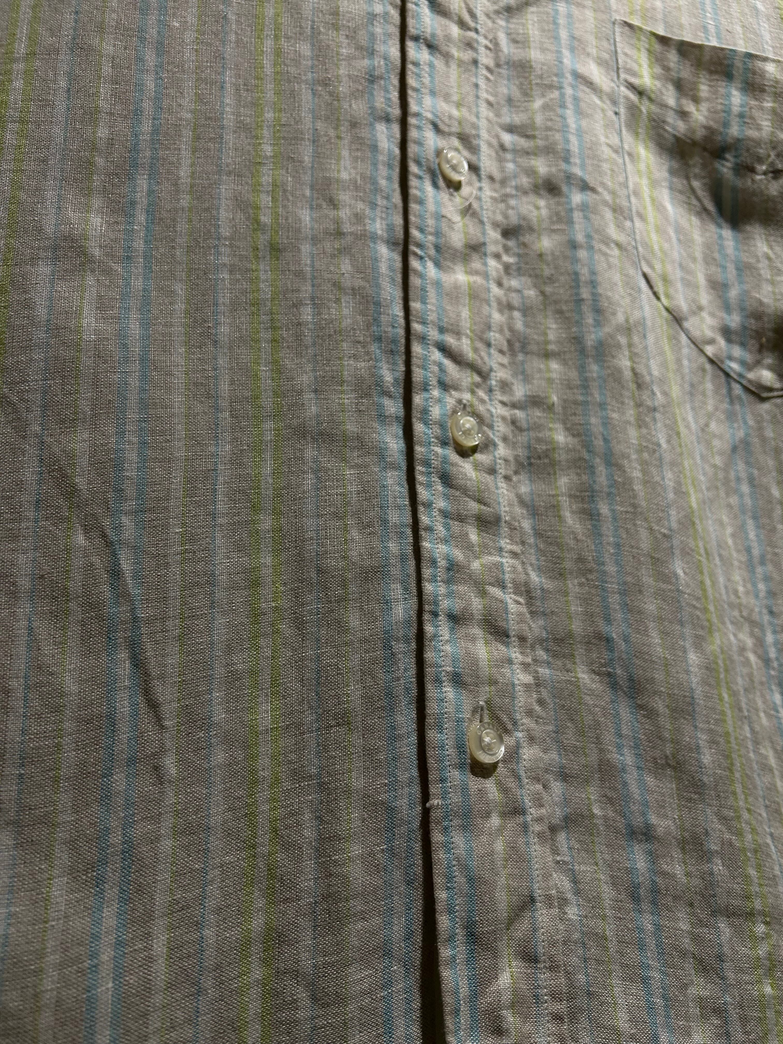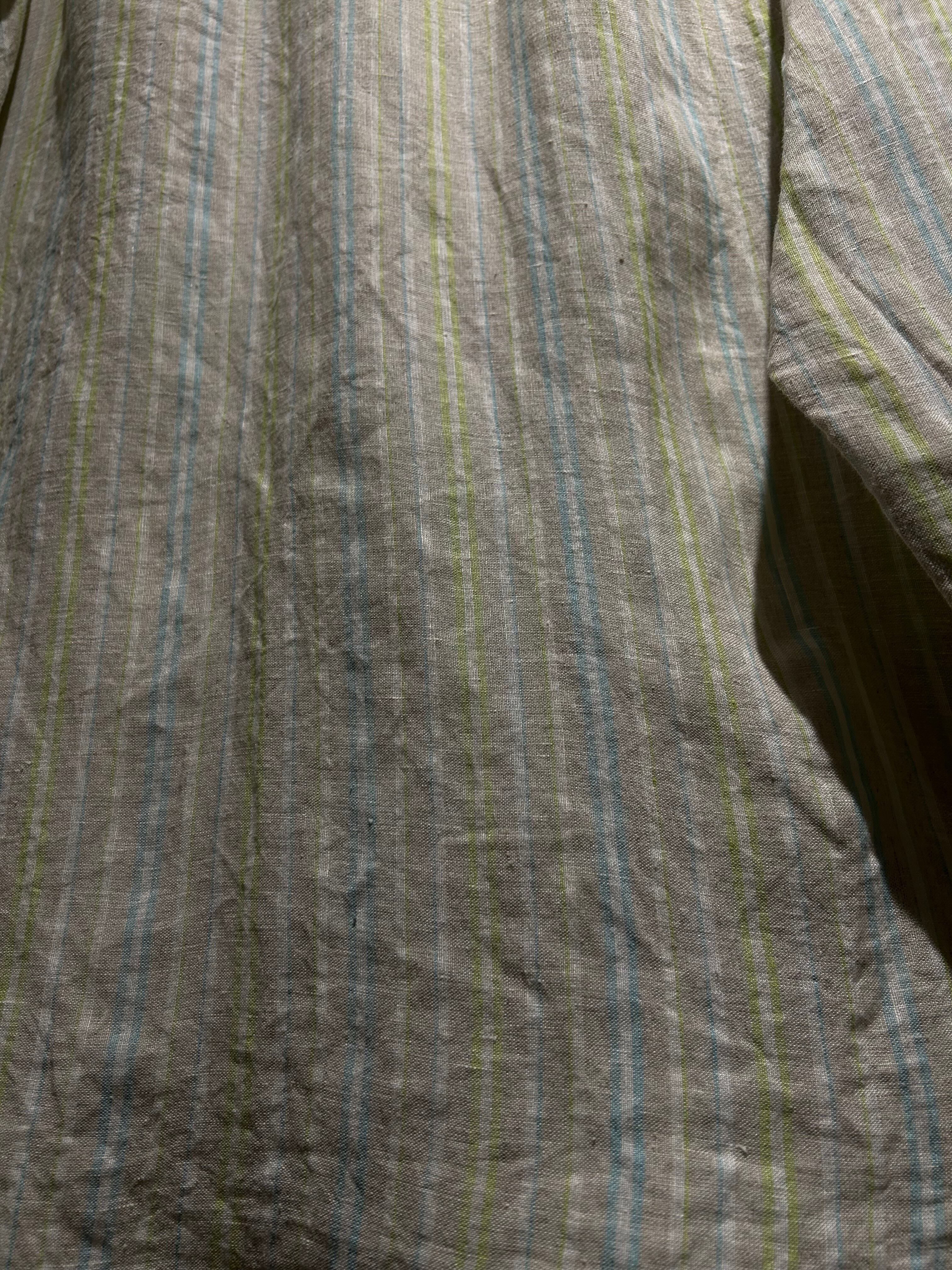 淡い紫、水色、紫のストライプを載せたリネンシャツ。