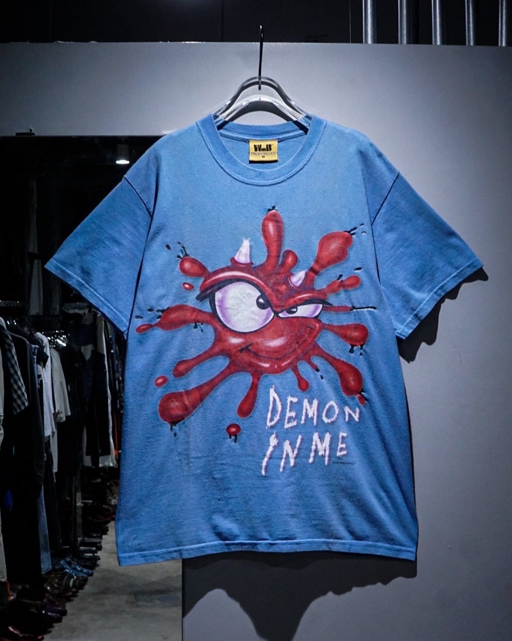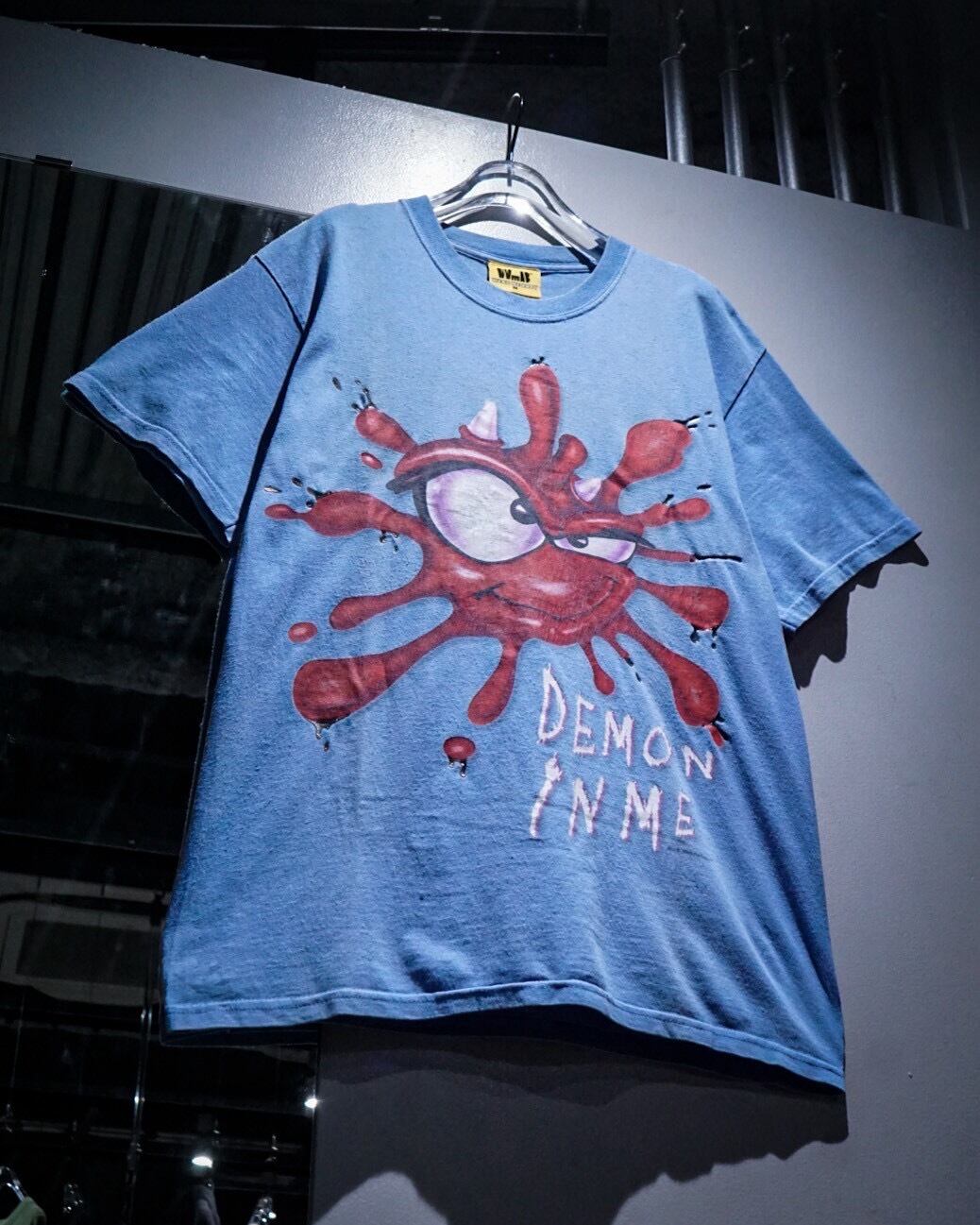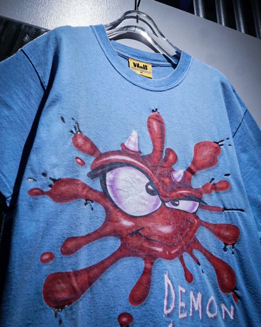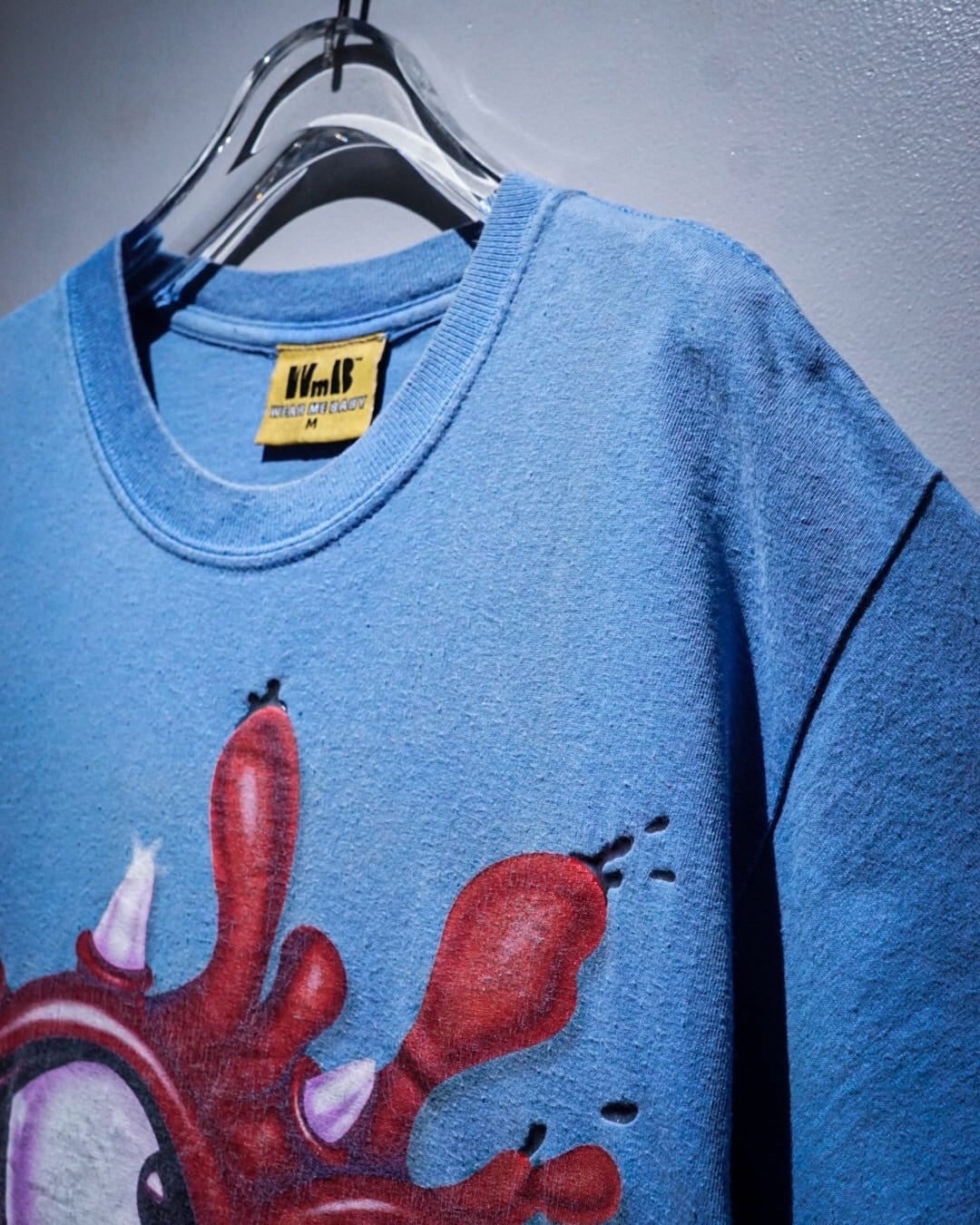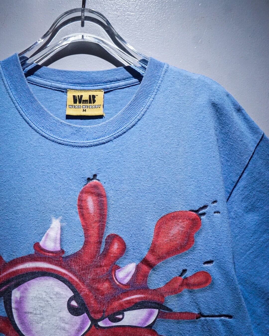 レゲエ系やロック・バンドプリントのTシャツが多く、スリップノットなどのバンドTなども手がける”Wear me baby”より、水色のボディをベースに、ペイントが散ったような、インパクトのあるキャラクターのグラフィックが載せられたTシャツ。