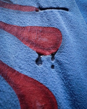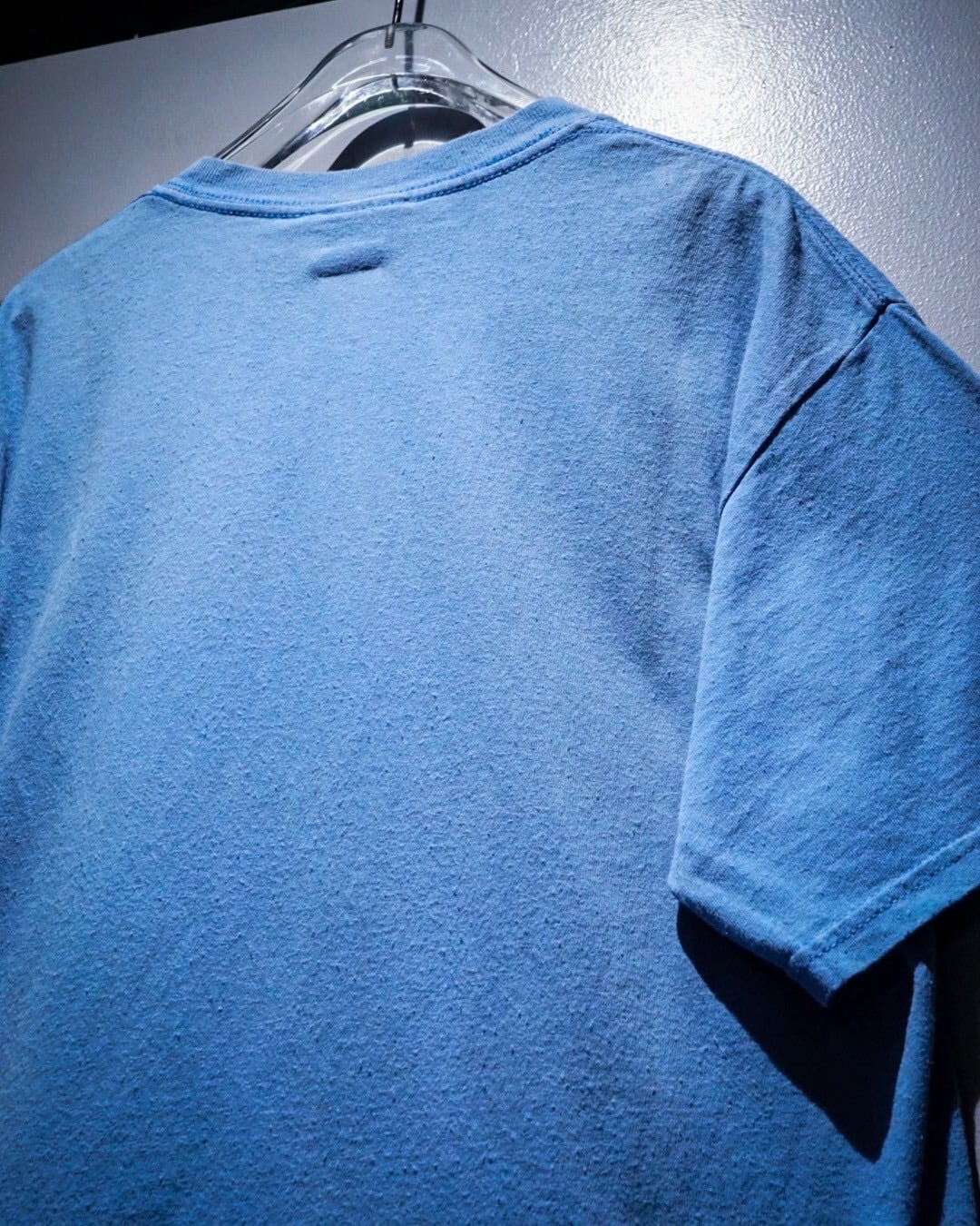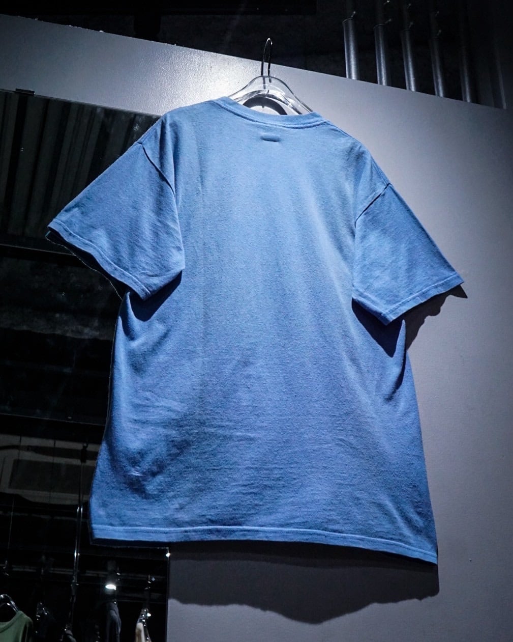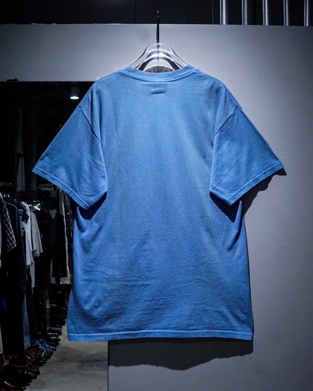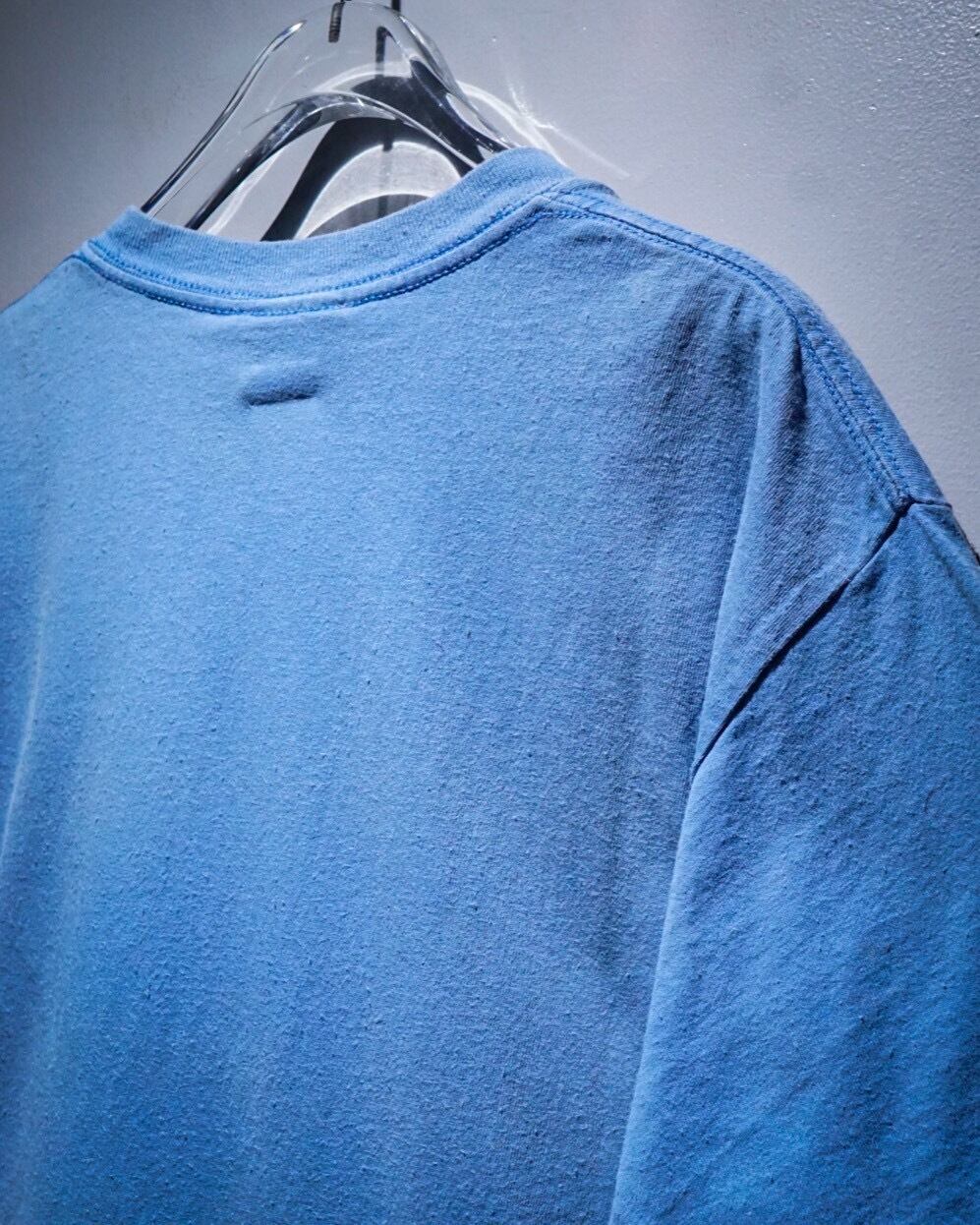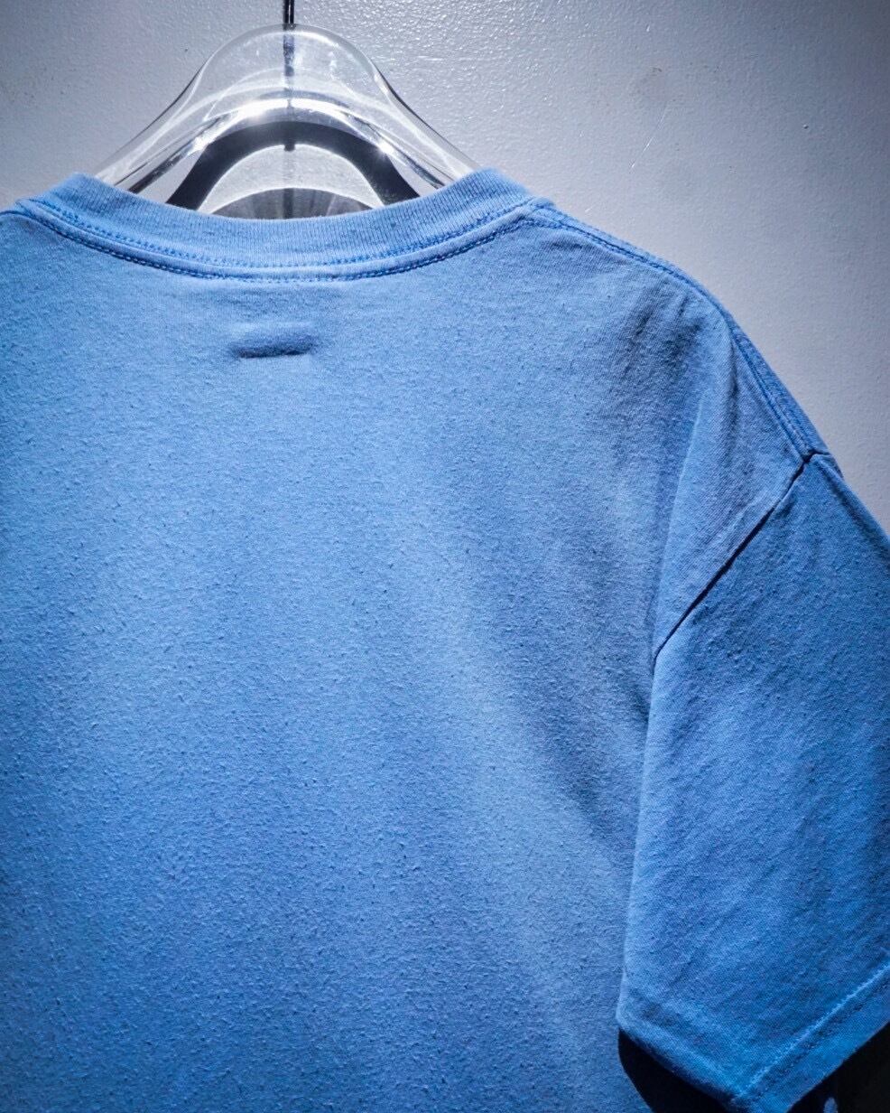 レゲエ系やロック・バンドプリントのTシャツが多く、スリップノットなどのバンドTなども手がける”Wear me baby”より、水色のボディをベースに、ペイントが散ったような、インパクトのあるキャラクターのグラフィックが載せられたTシャツ。
