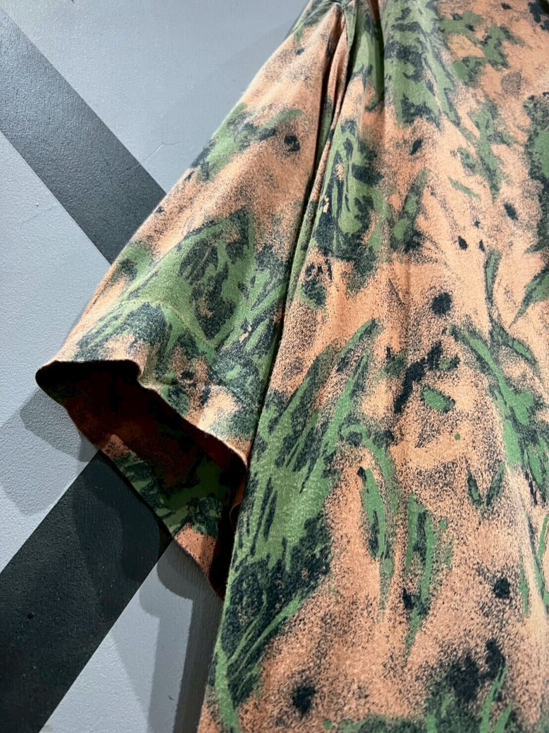 肌触り柔らかな生地を用いたボディに、抽象的なアート柄を載せた半袖シャツ。