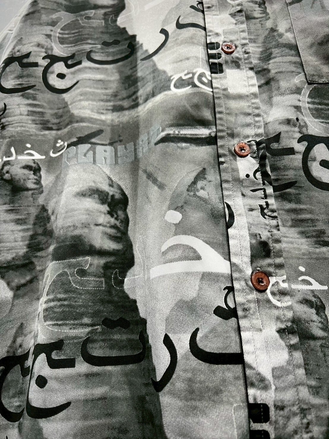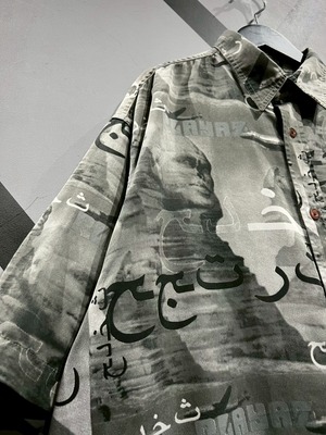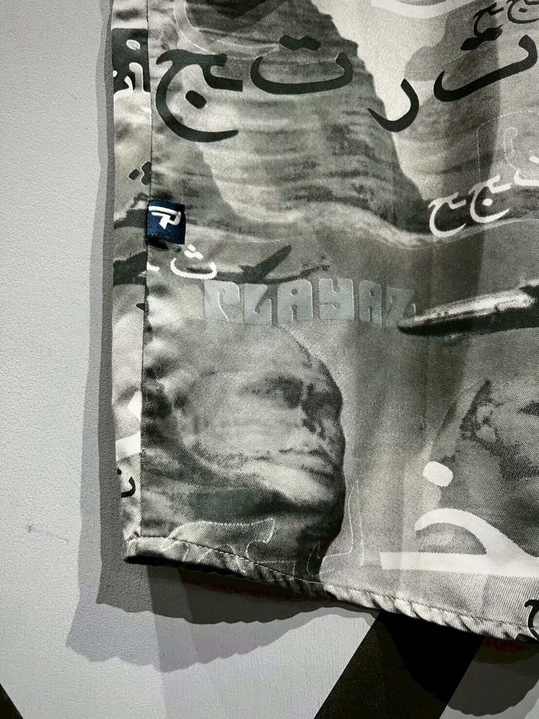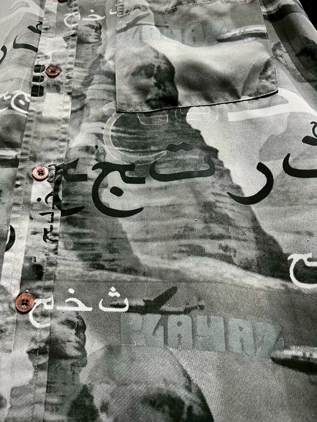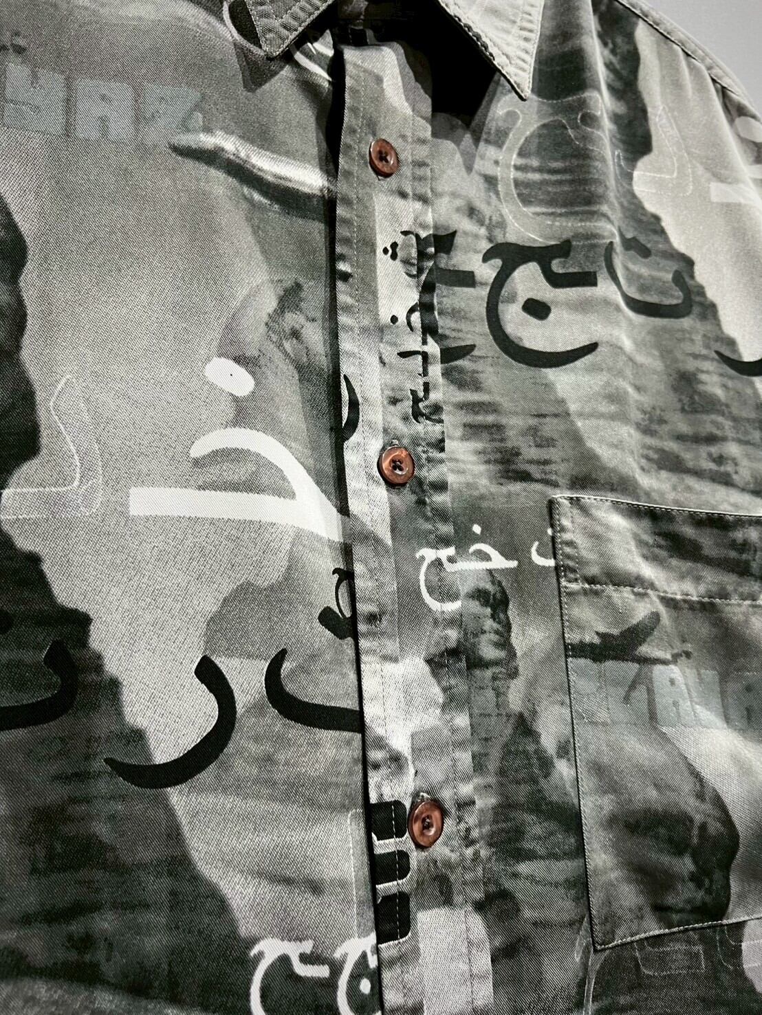 ツルッと滑らかなポリのボディに、スフィンクス、アラビア文字を載せた半袖シャツ。