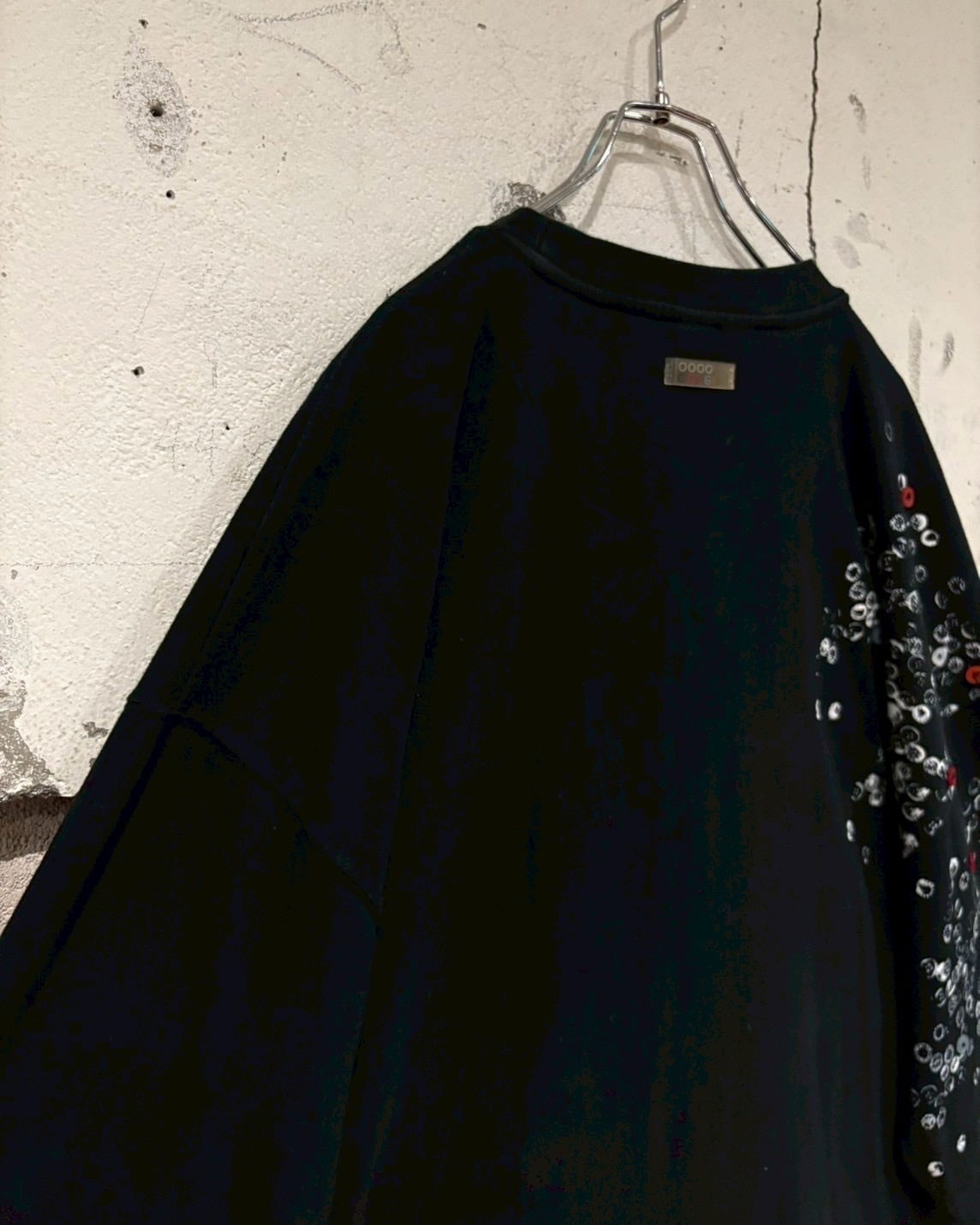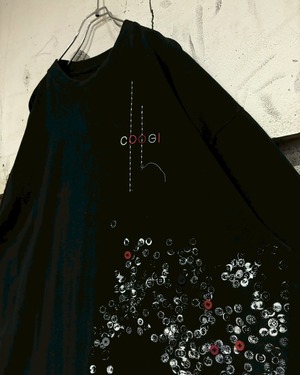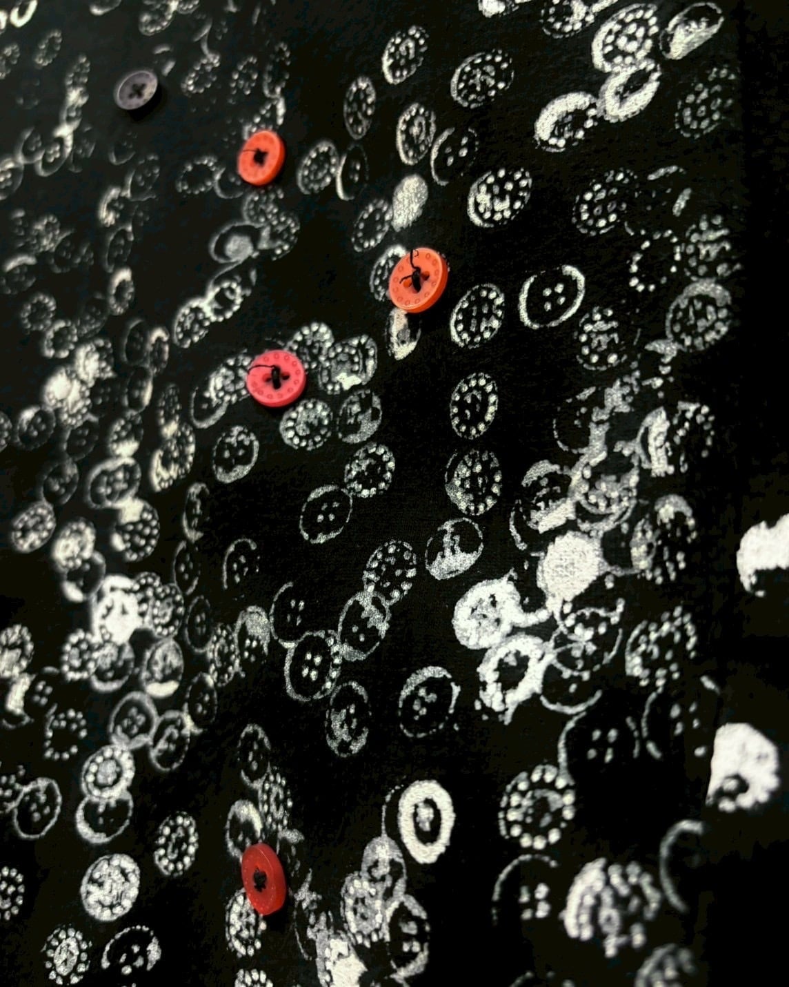 ブラックのボディをベースに、各所にボタン柄のプリント、その上に赤のボタンを縫いつけた遊び心があるデザインの1着。