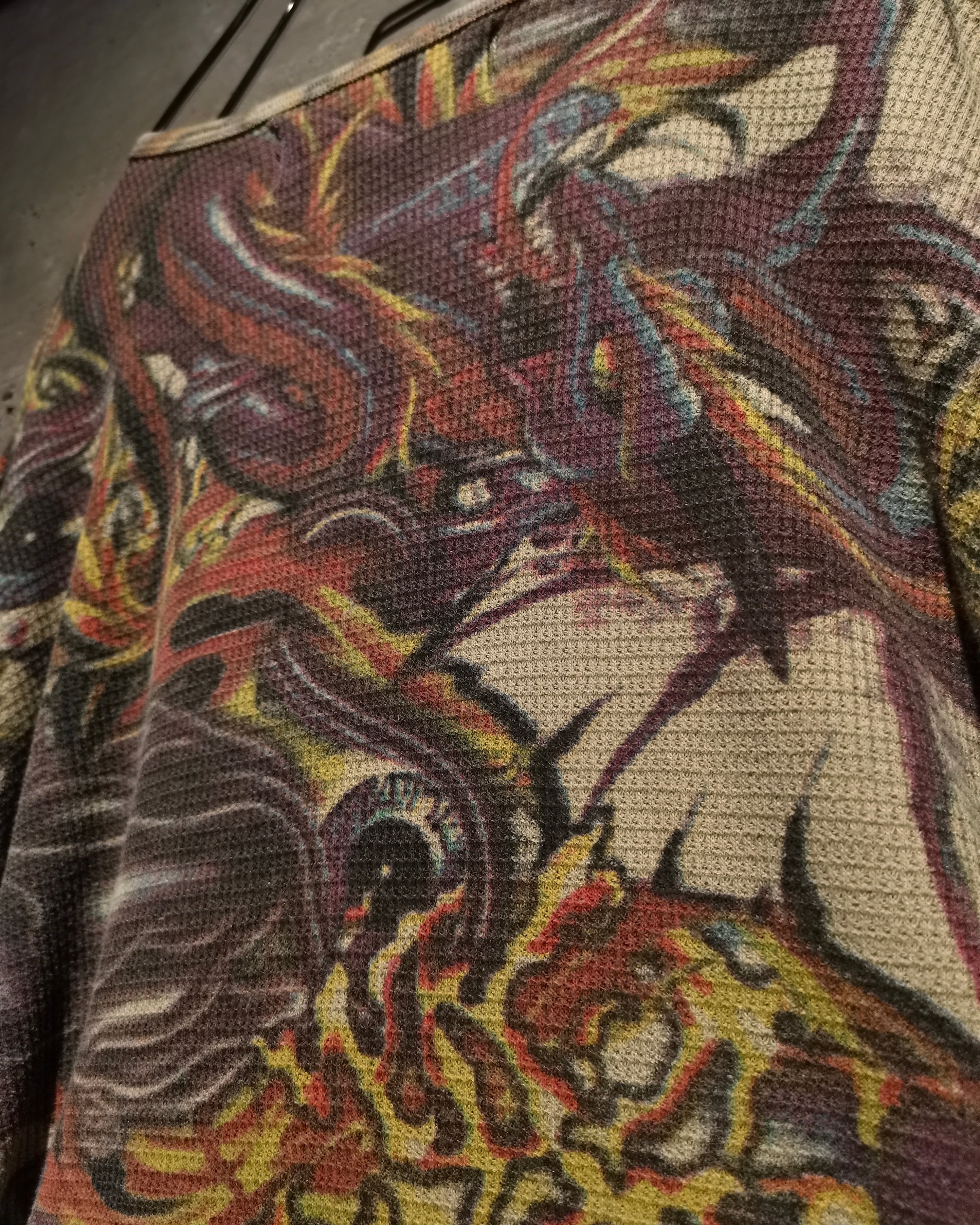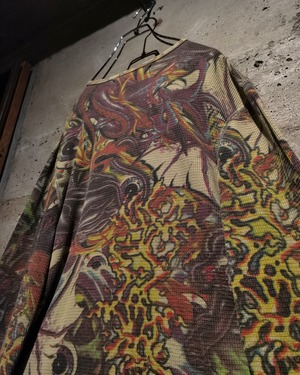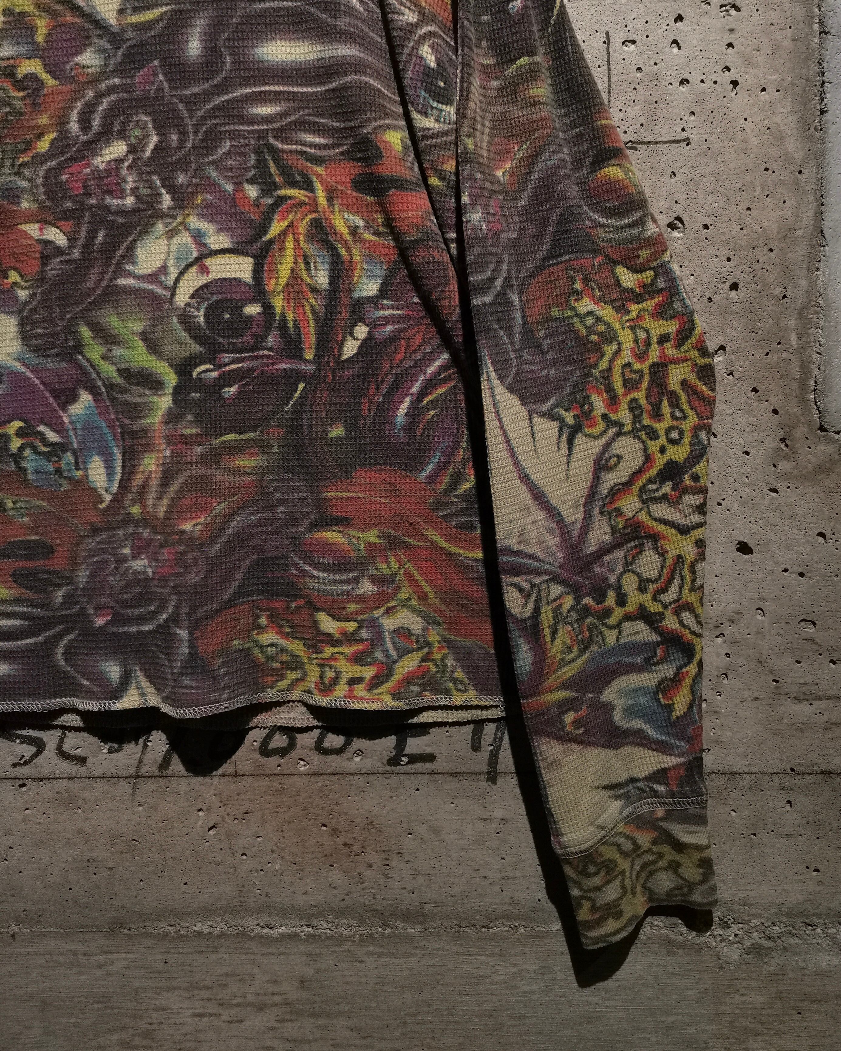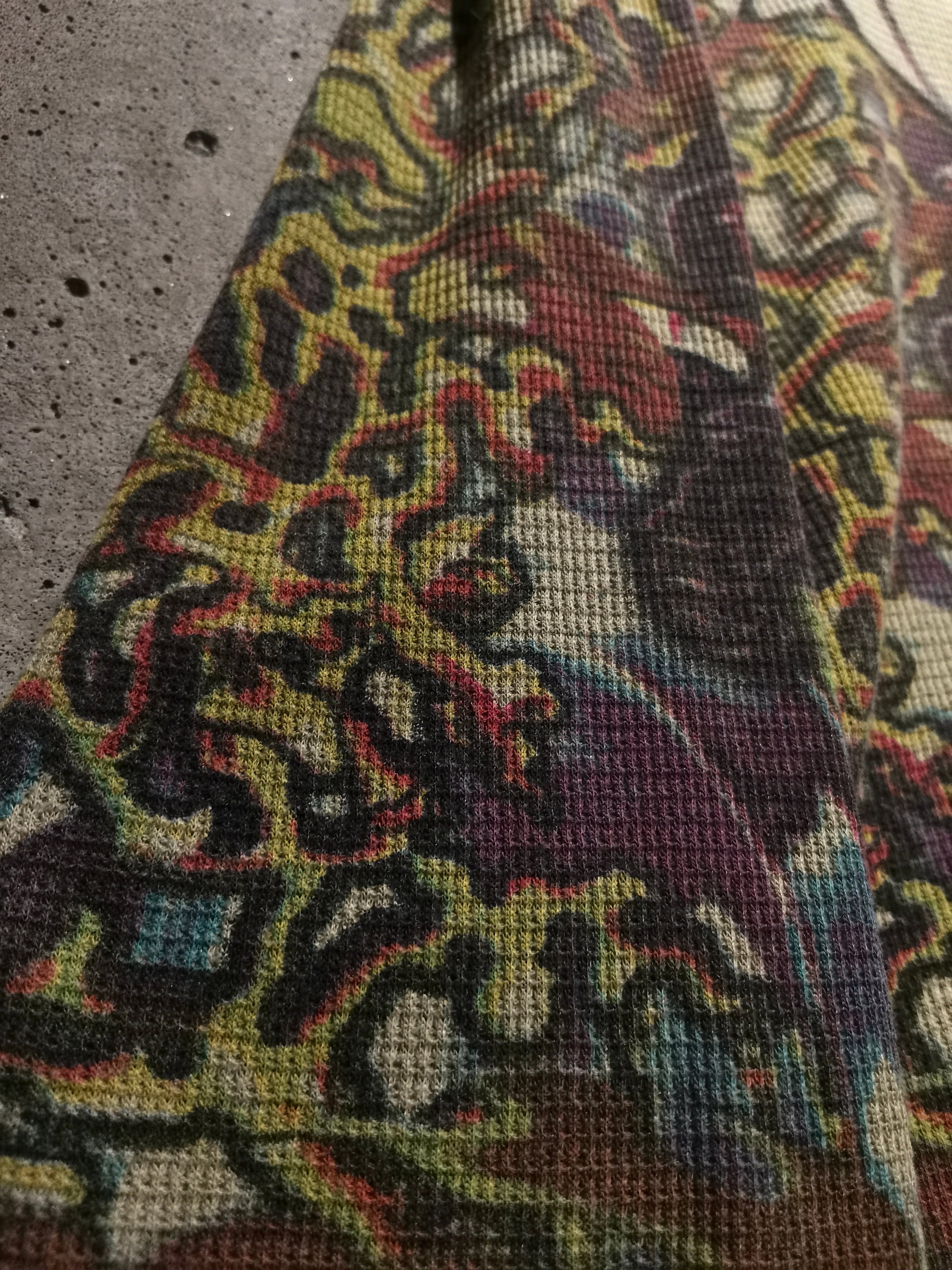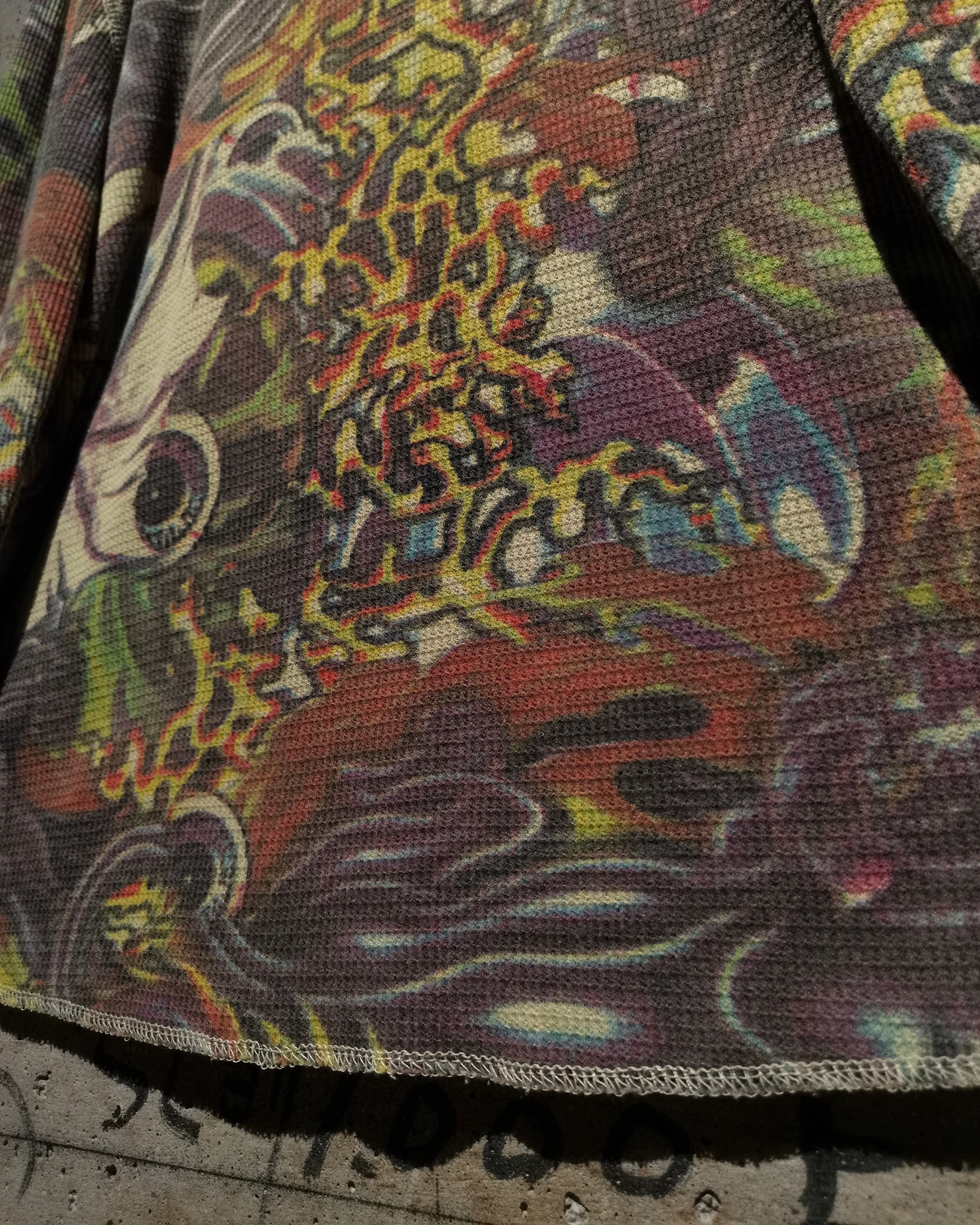 ワッフル状のサーマル生地をベースに、幾重にも重ねられたようなグラフィックを全面にプリントした一品。