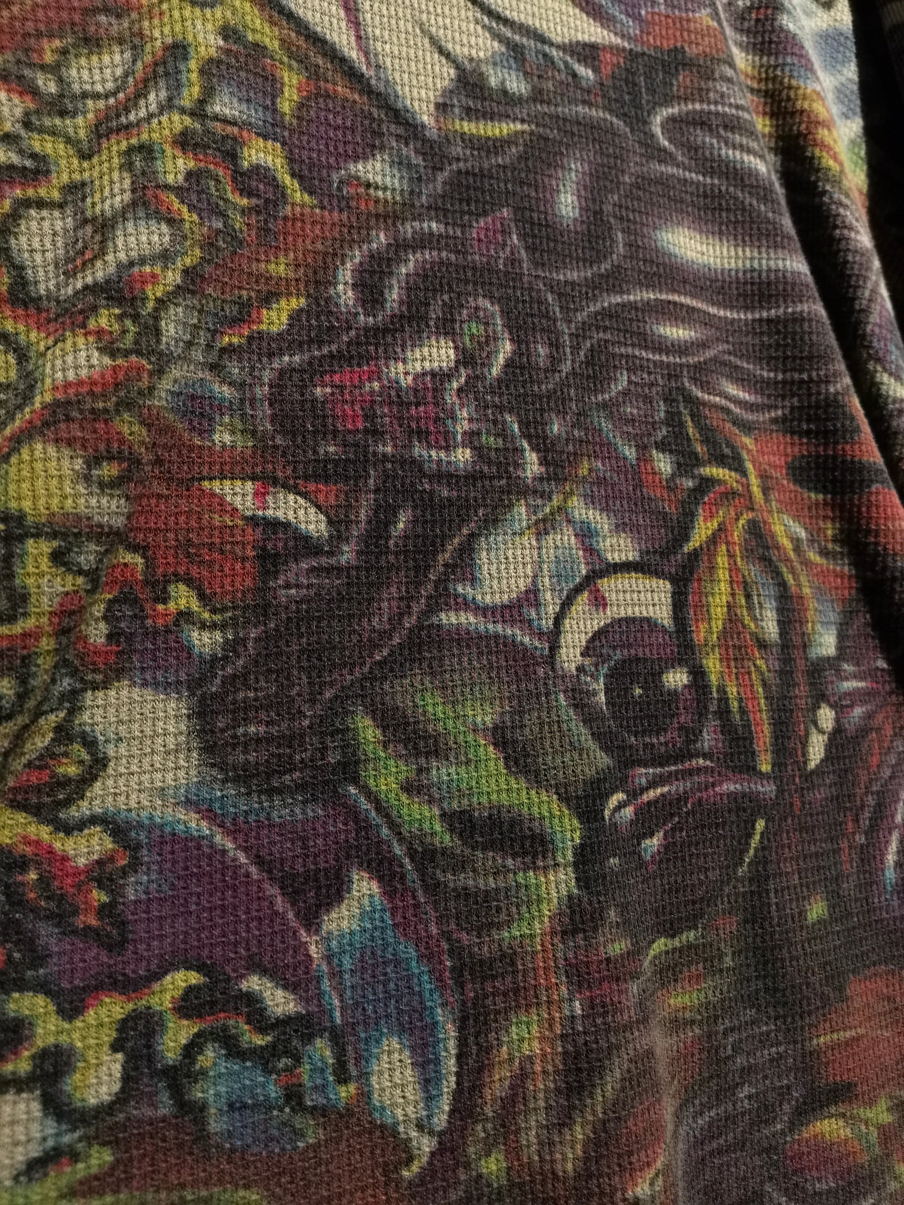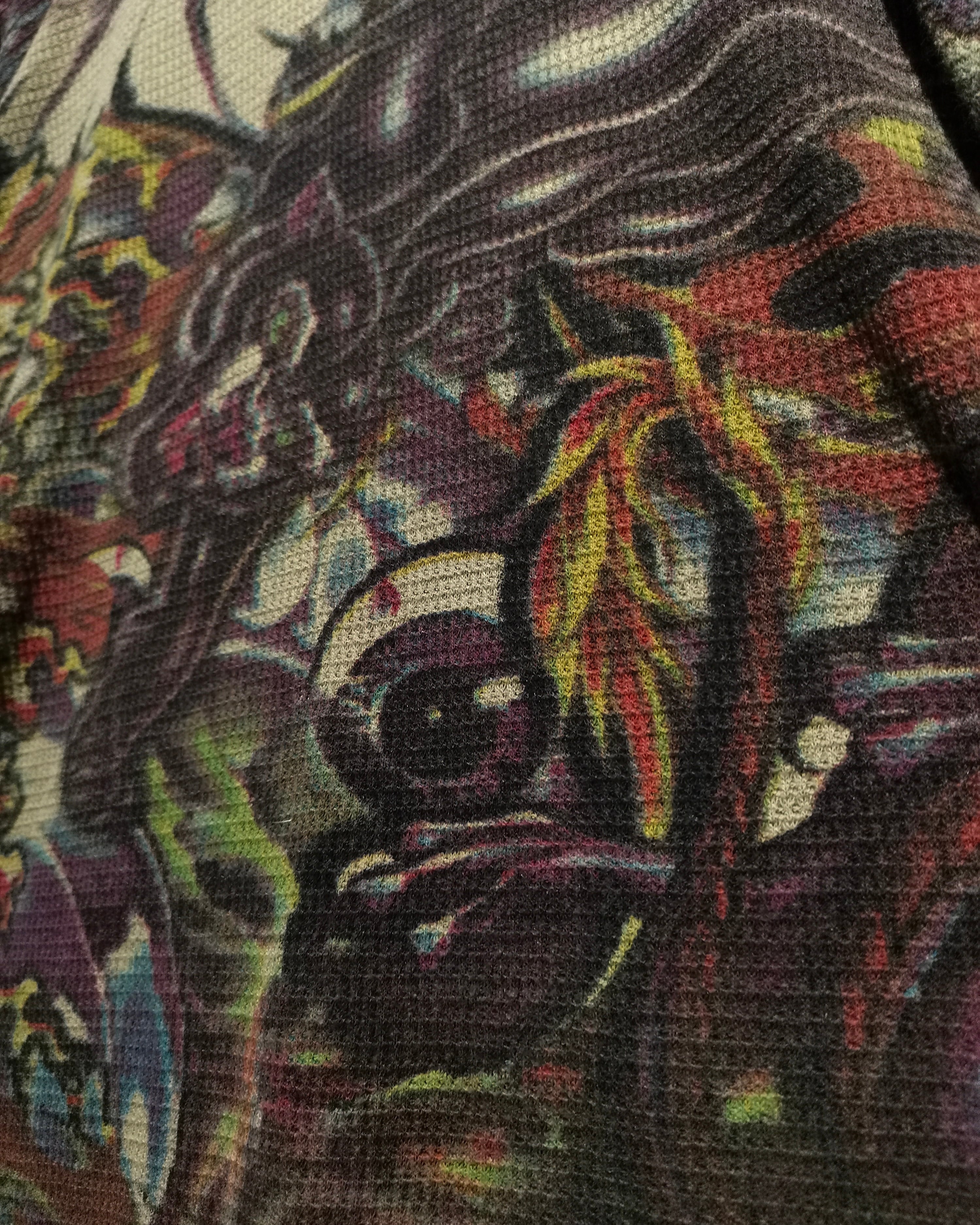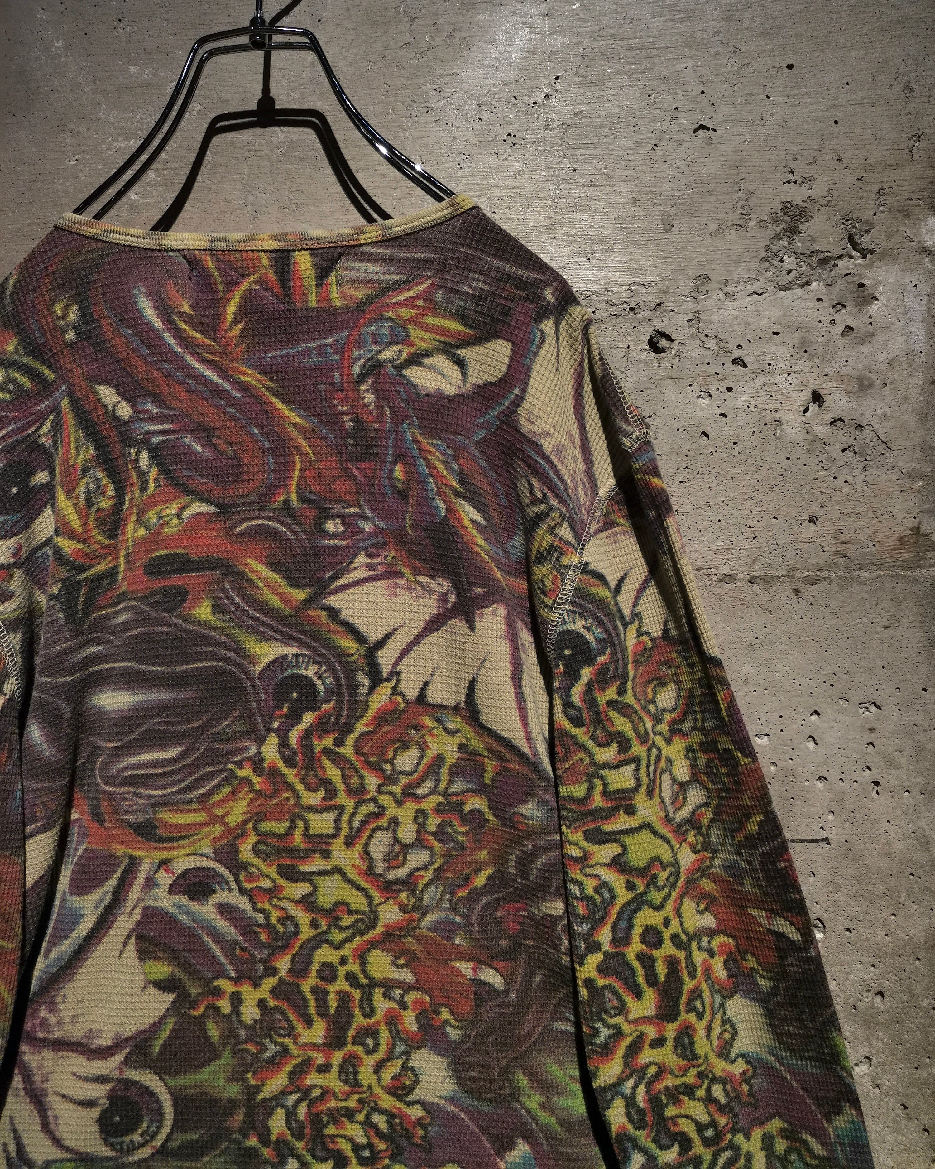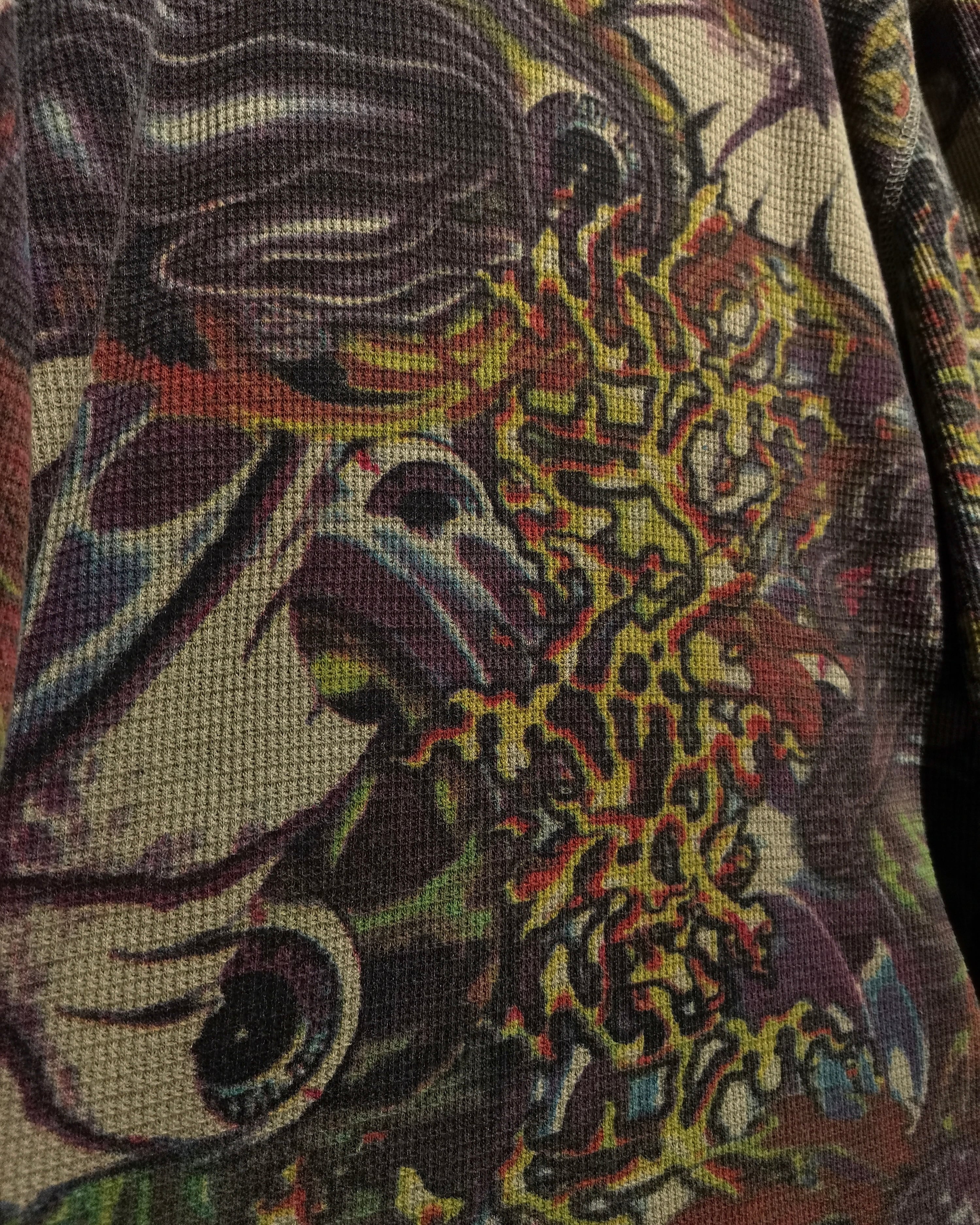 ワッフル状のサーマル生地をベースに、幾重にも重ねられたようなグラフィックを全面にプリントした一品。