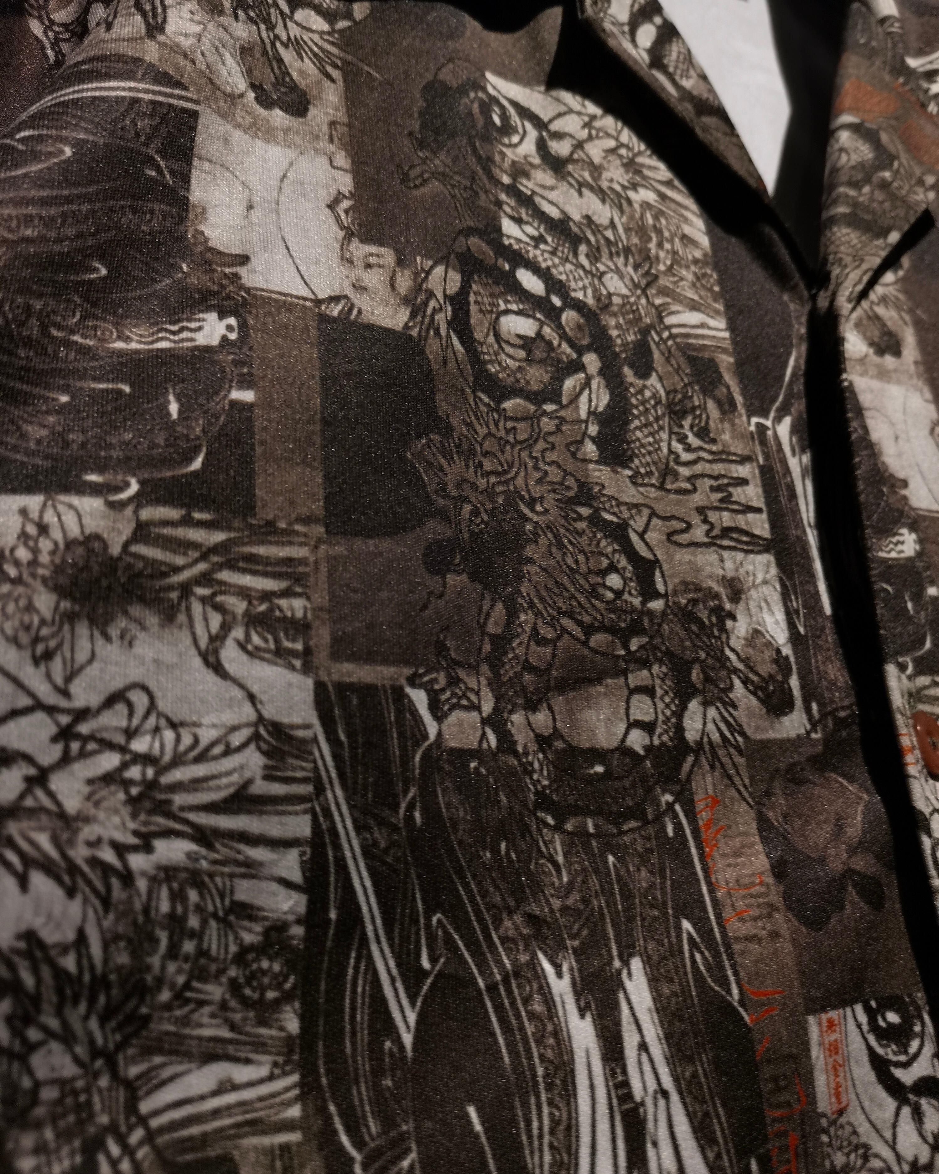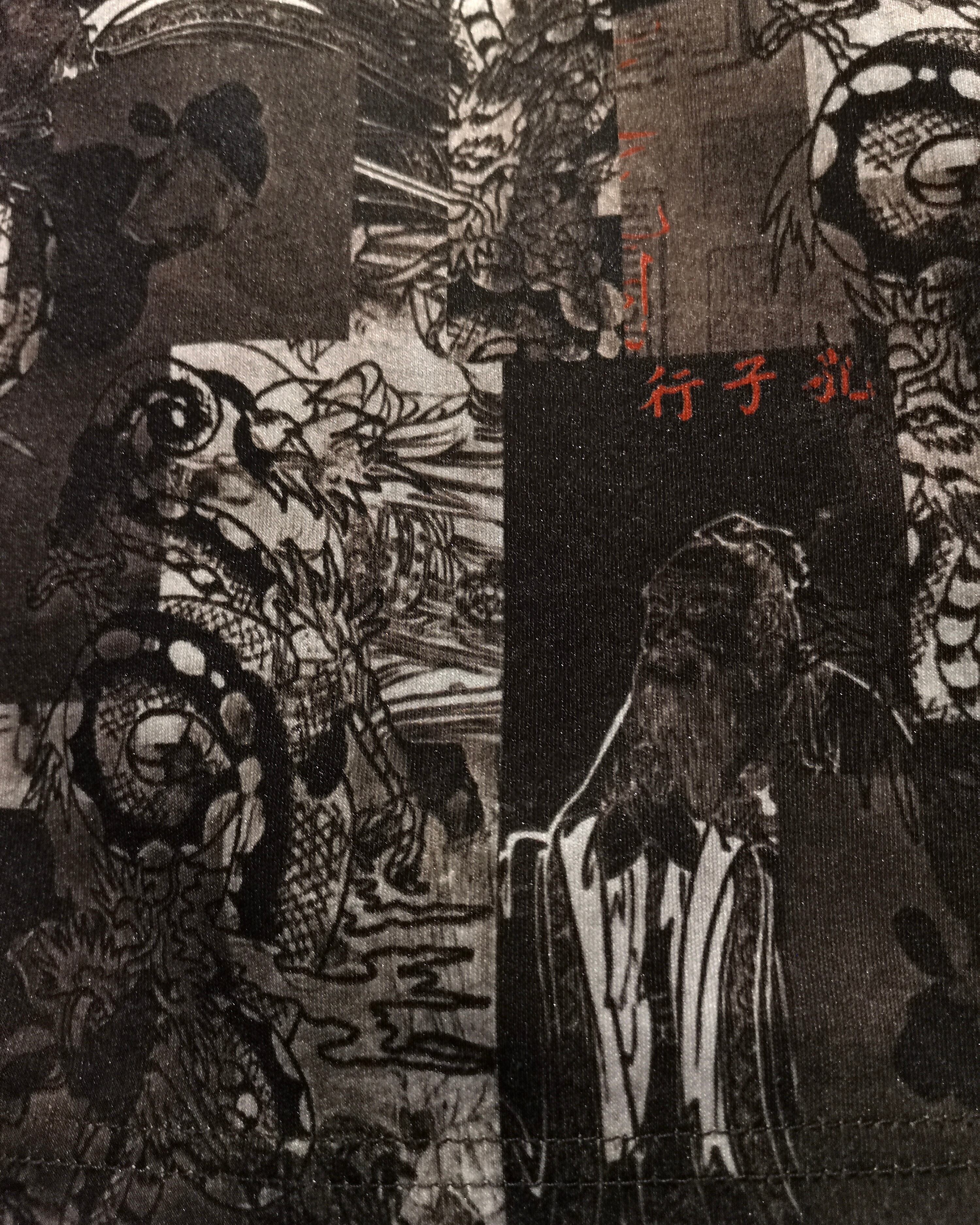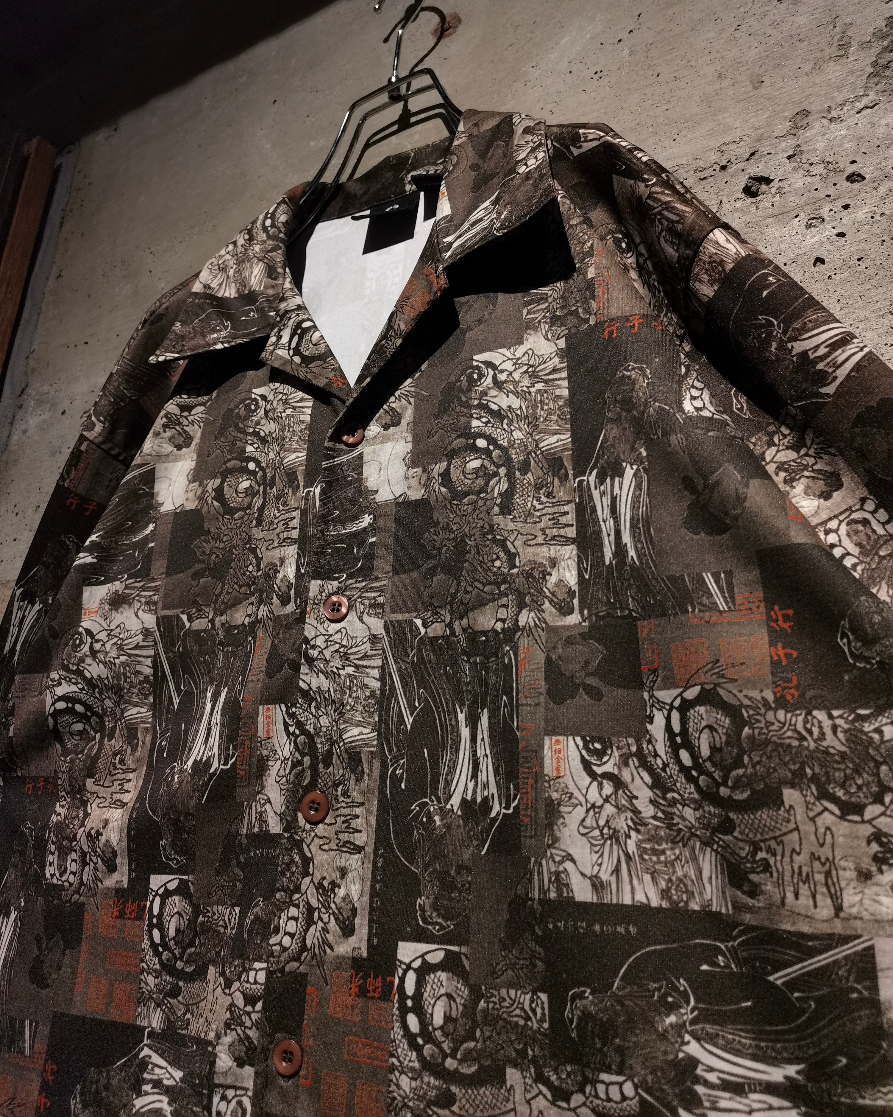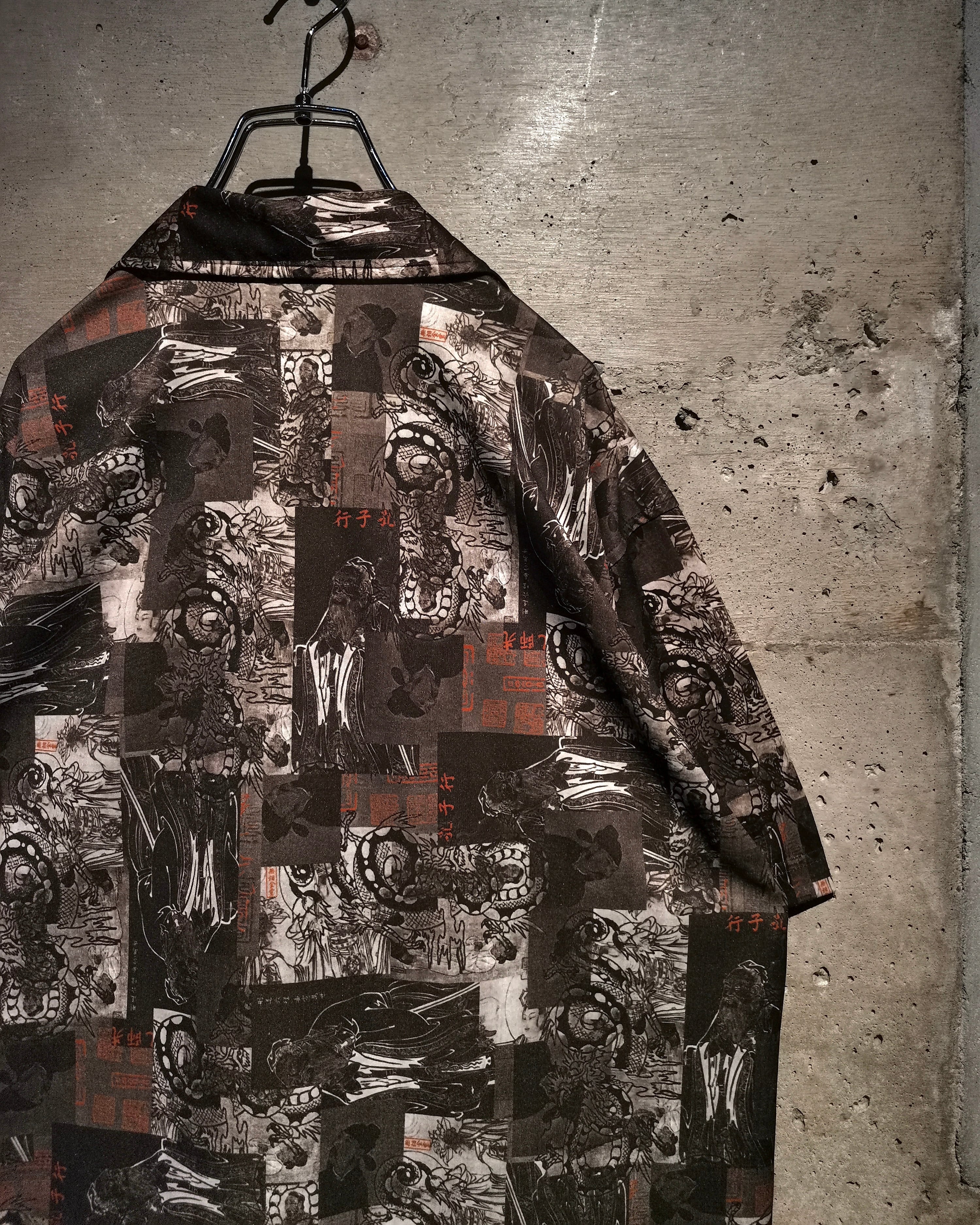 滑らかな質感のボディに、"転写"プリントといった70'sライクな手法で龍や中国の偉人をパッチワーク調に落とし込んだスペシャルな一着。このデザインでOLD Guess Jeansってのが、洋服好きの心を鷲掴みにしてくれますね。