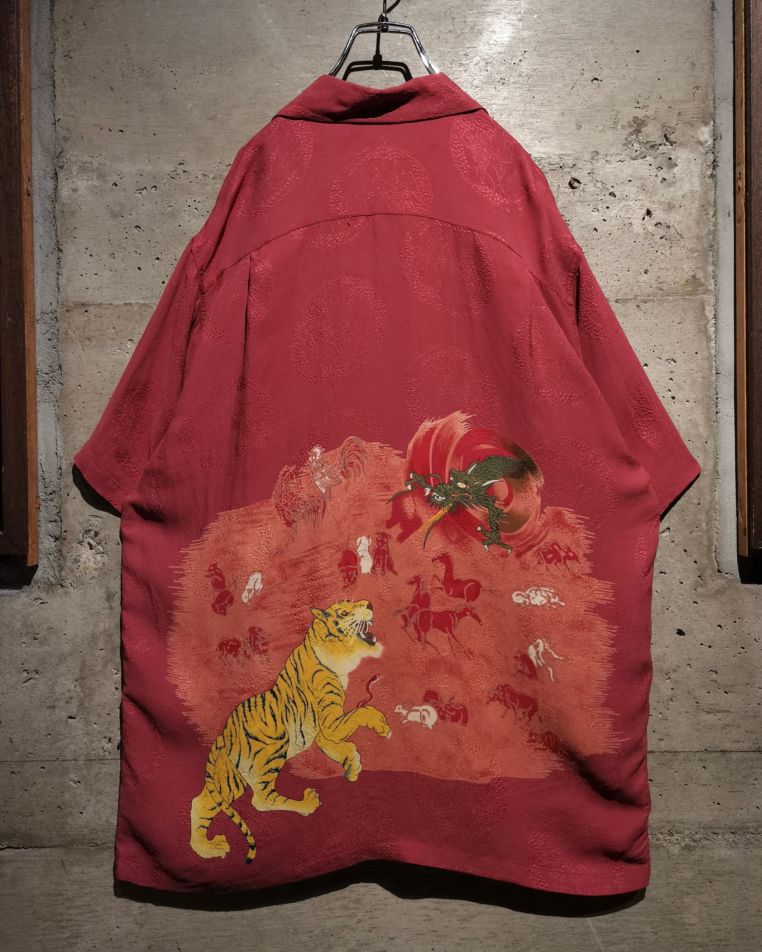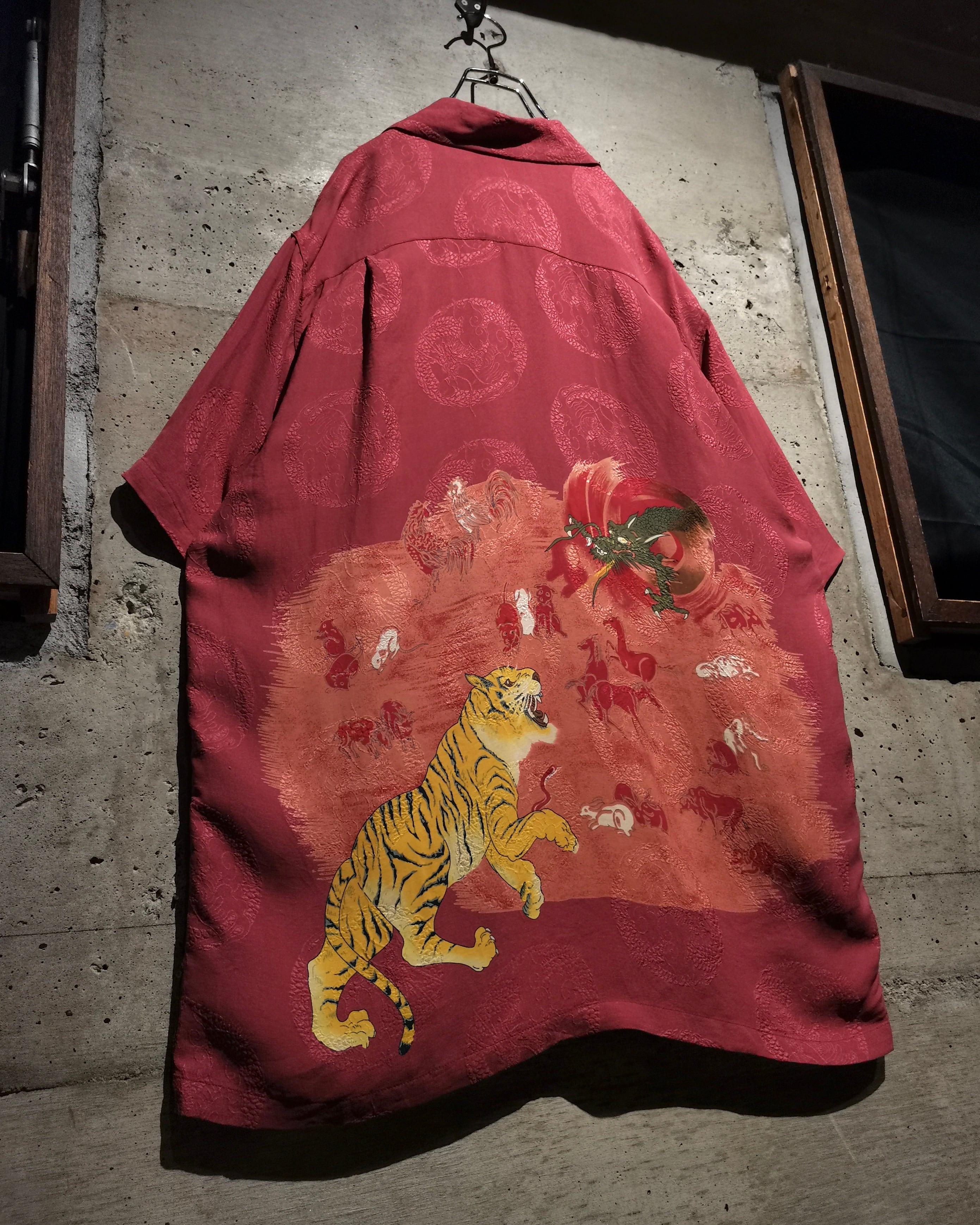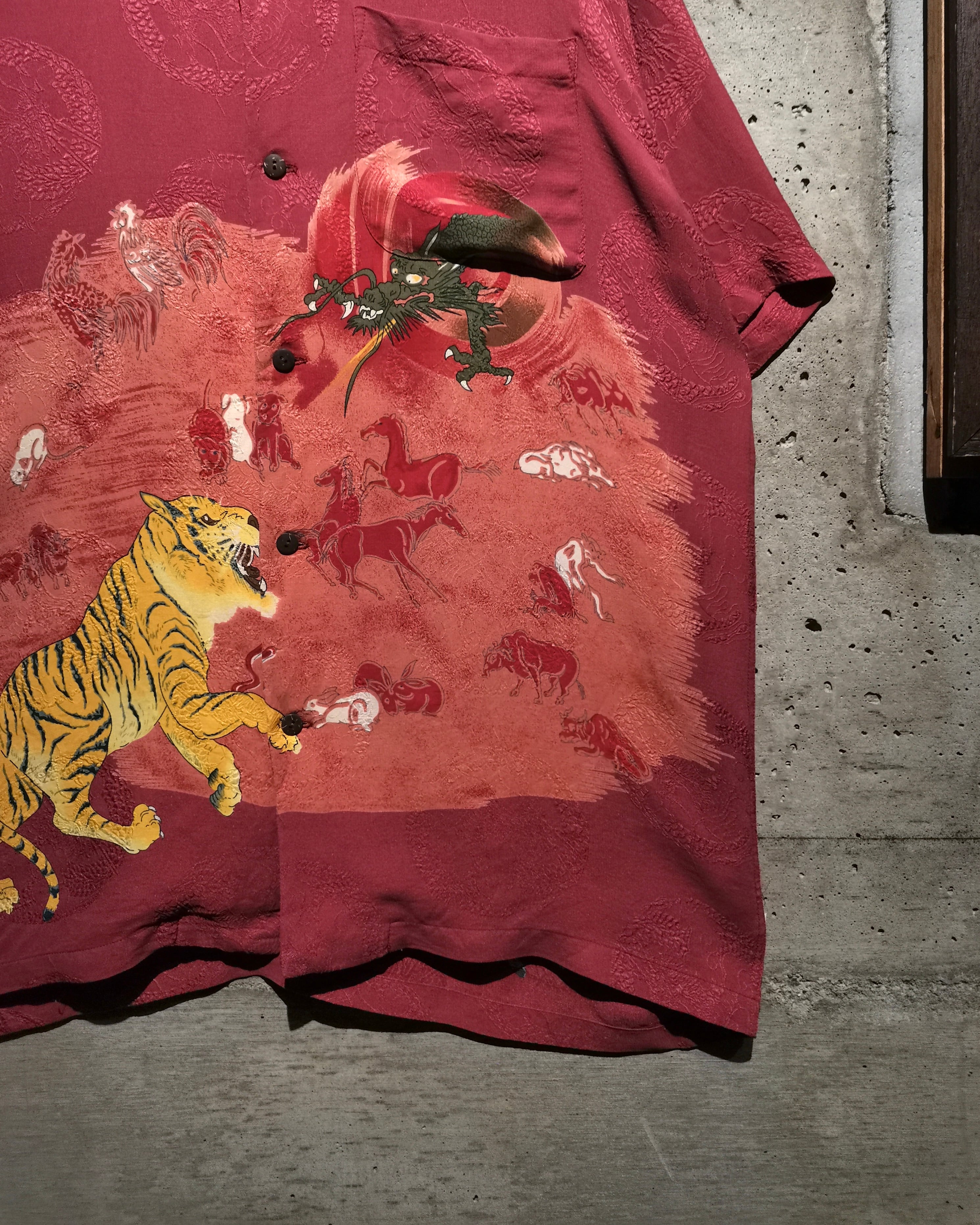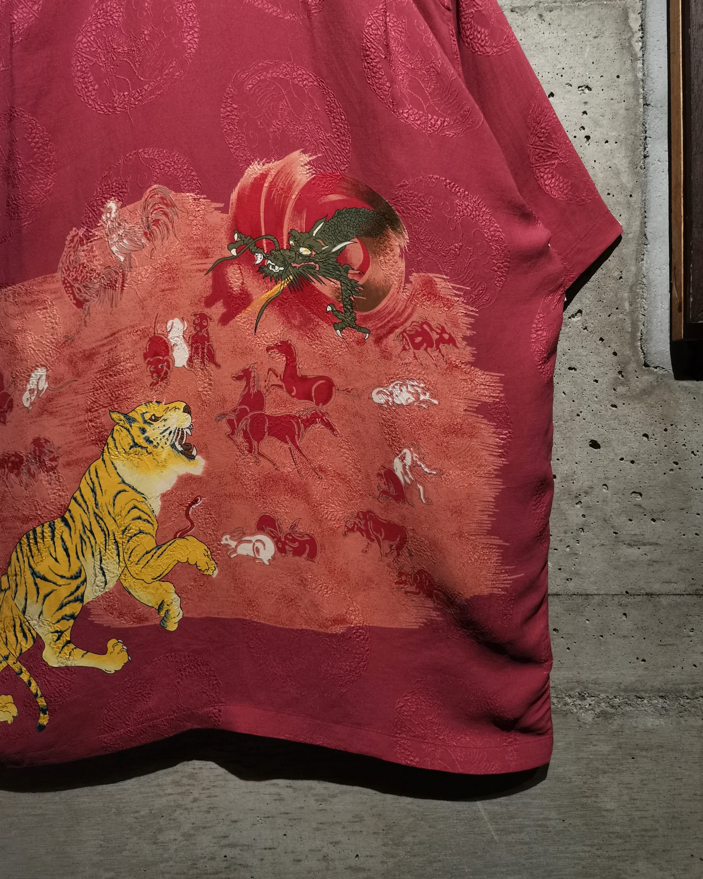 フワッと柔らかな、極上のシルク素材をボディに使用し、虎×龍をメインに、十二支のデザインを載せたアロハシャツ。