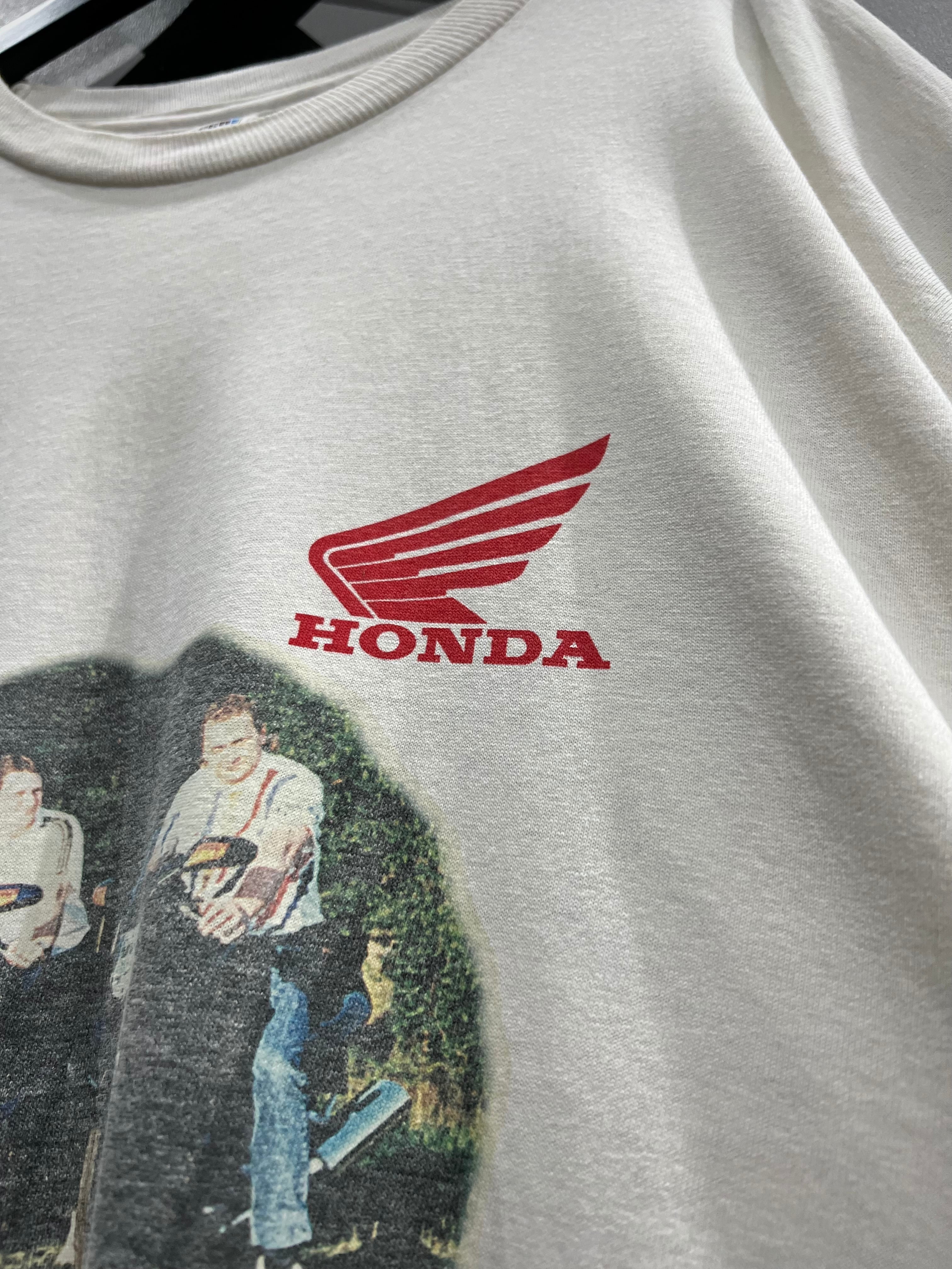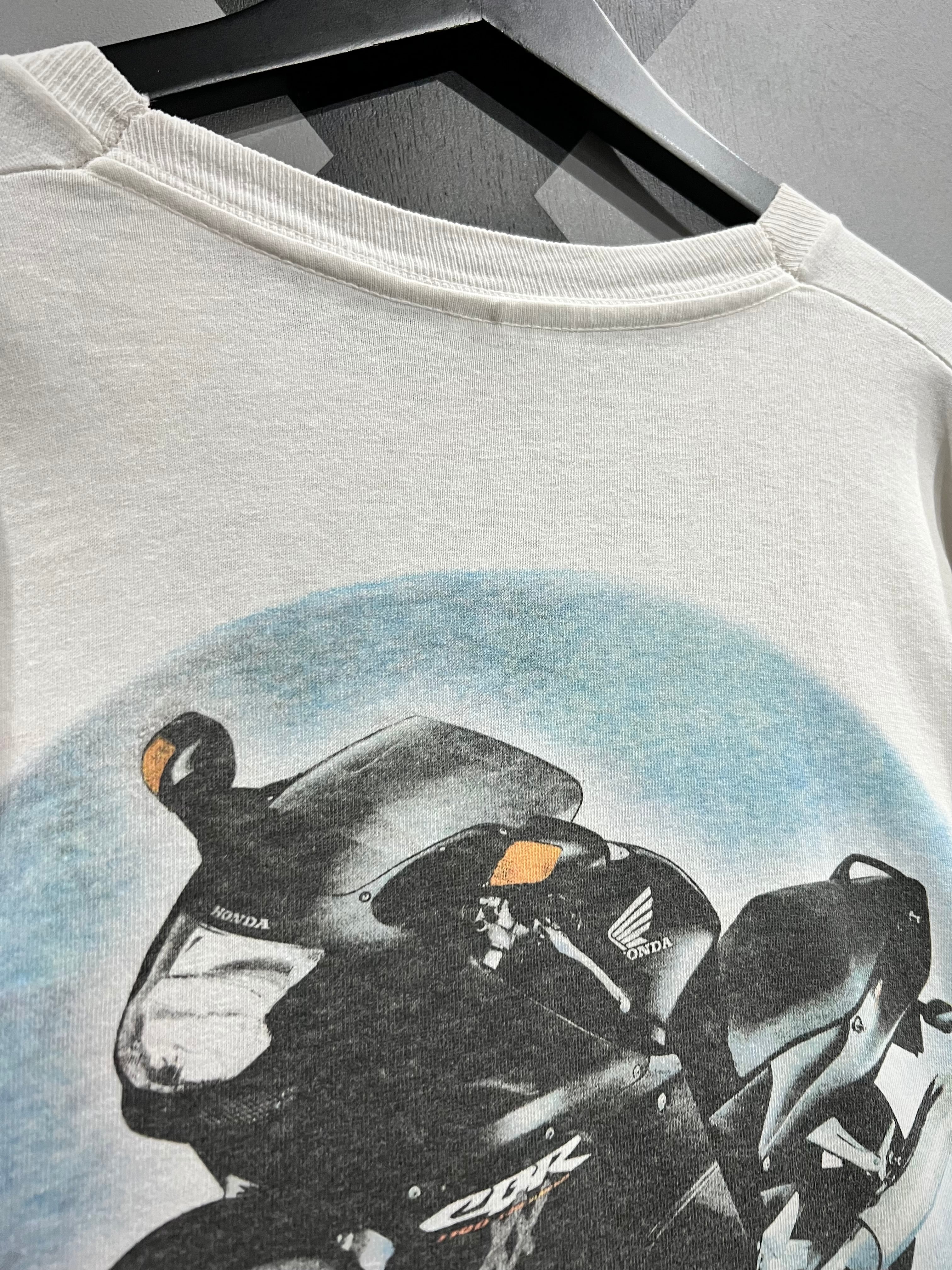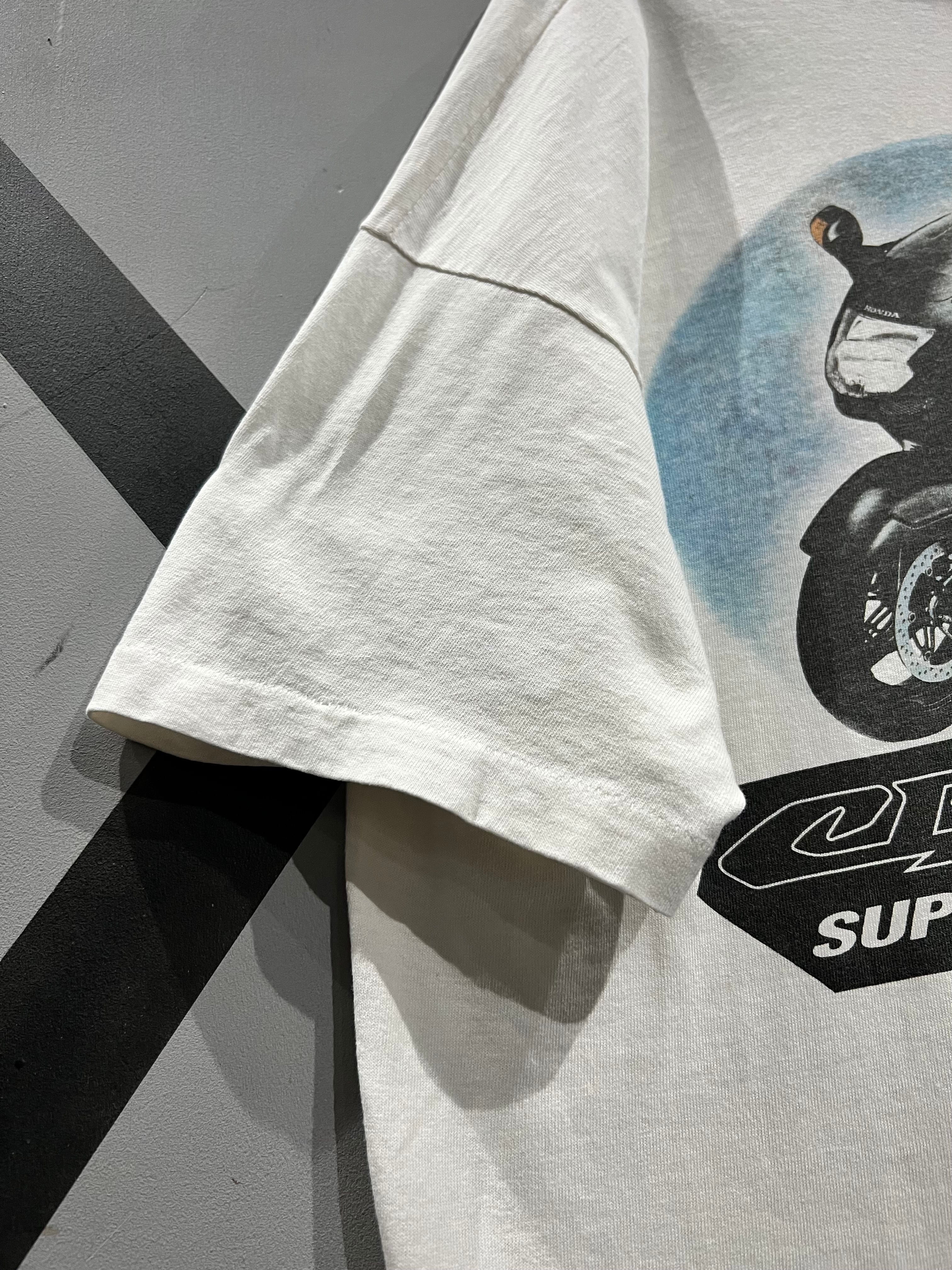 白のボディをベースに、フロントにはロゴマークとCBRを持つ男達、バックにはドカンとCBRの本体が載せられた1着。