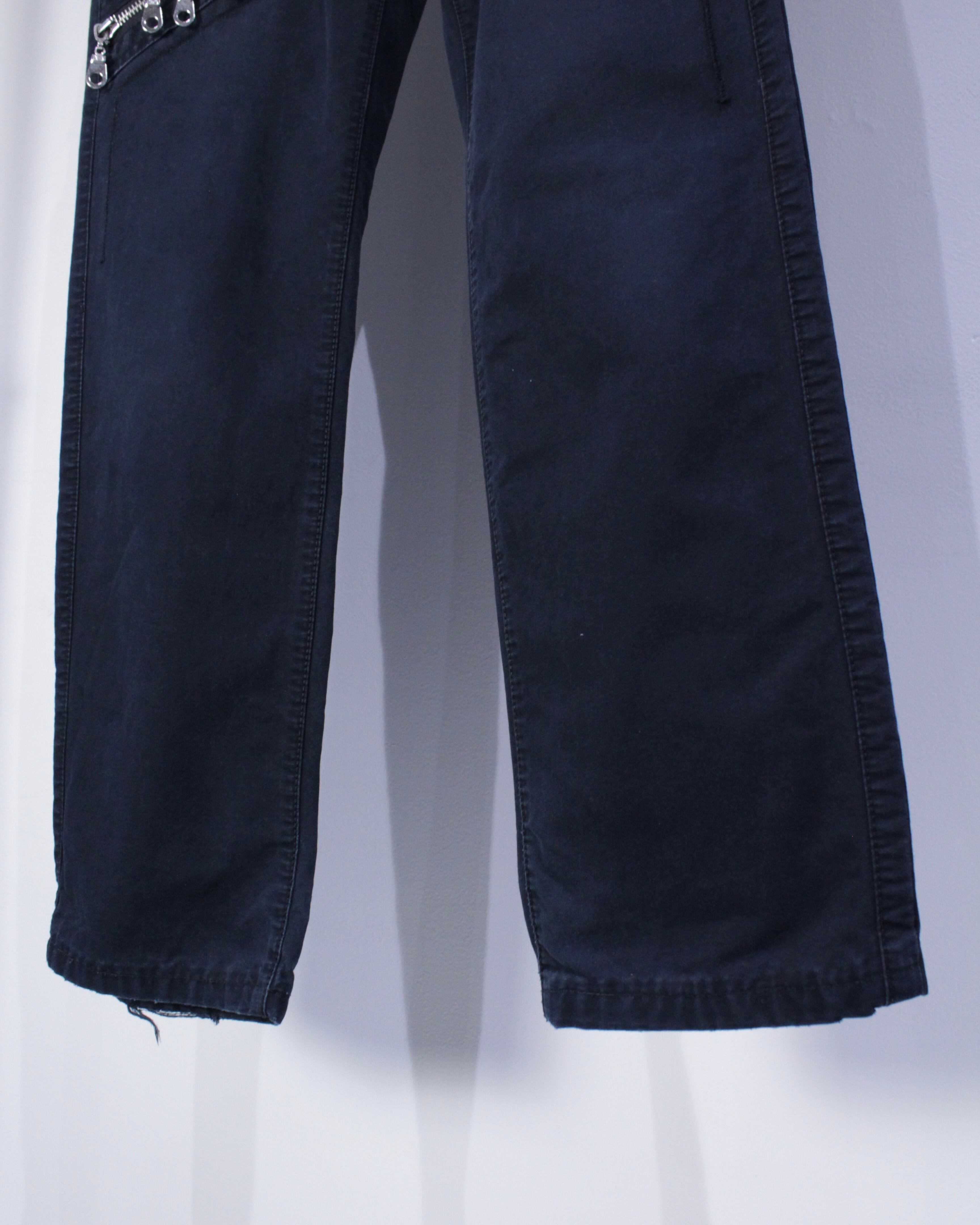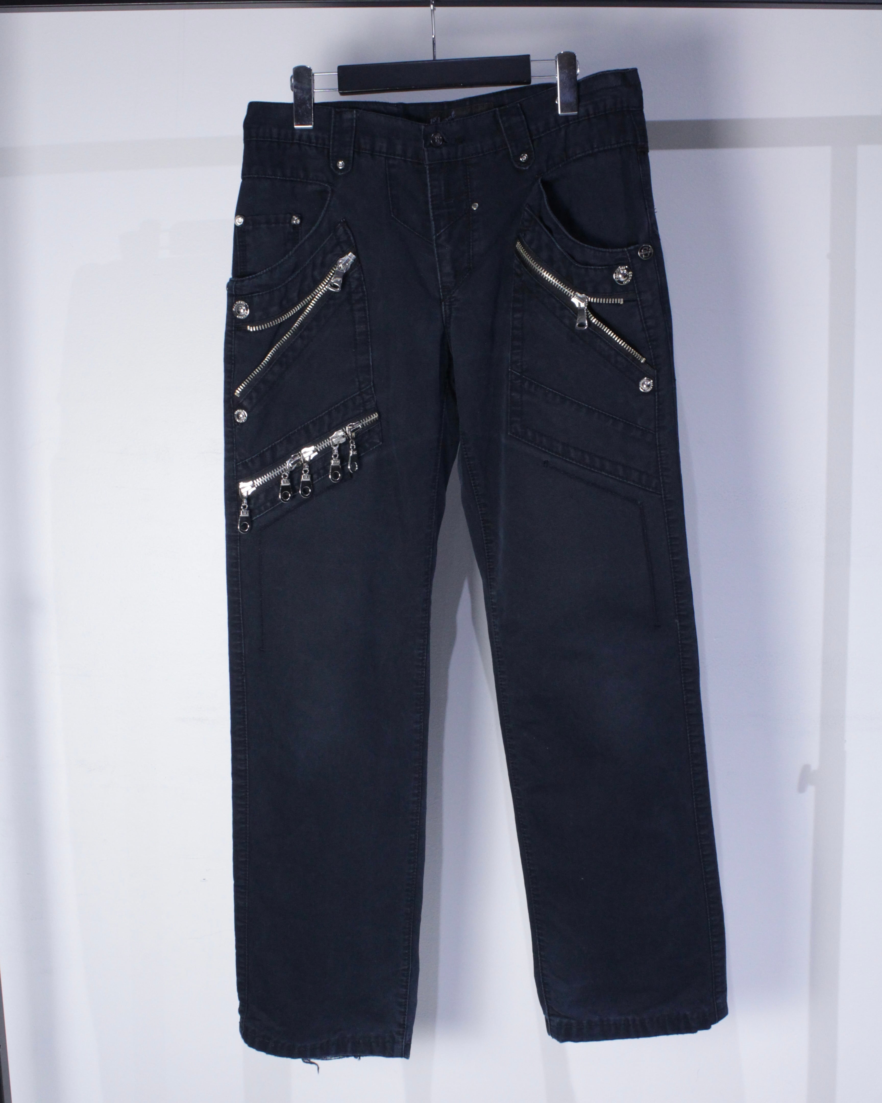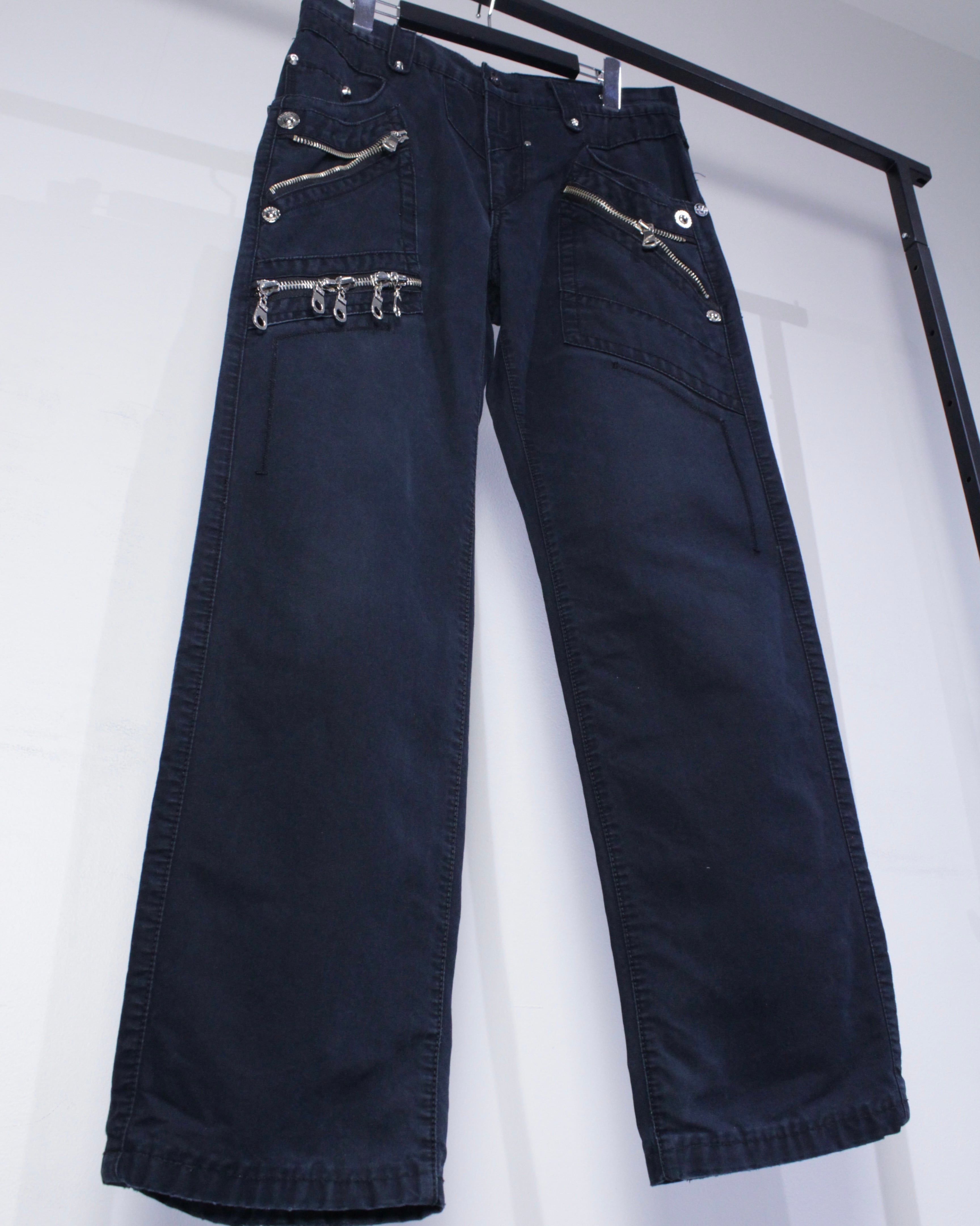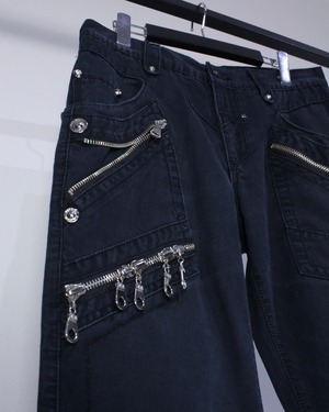 ブラックのボディをベースに、フロントのポケット、バックポケットにジップのギミックを載せたテーパードパンツ。