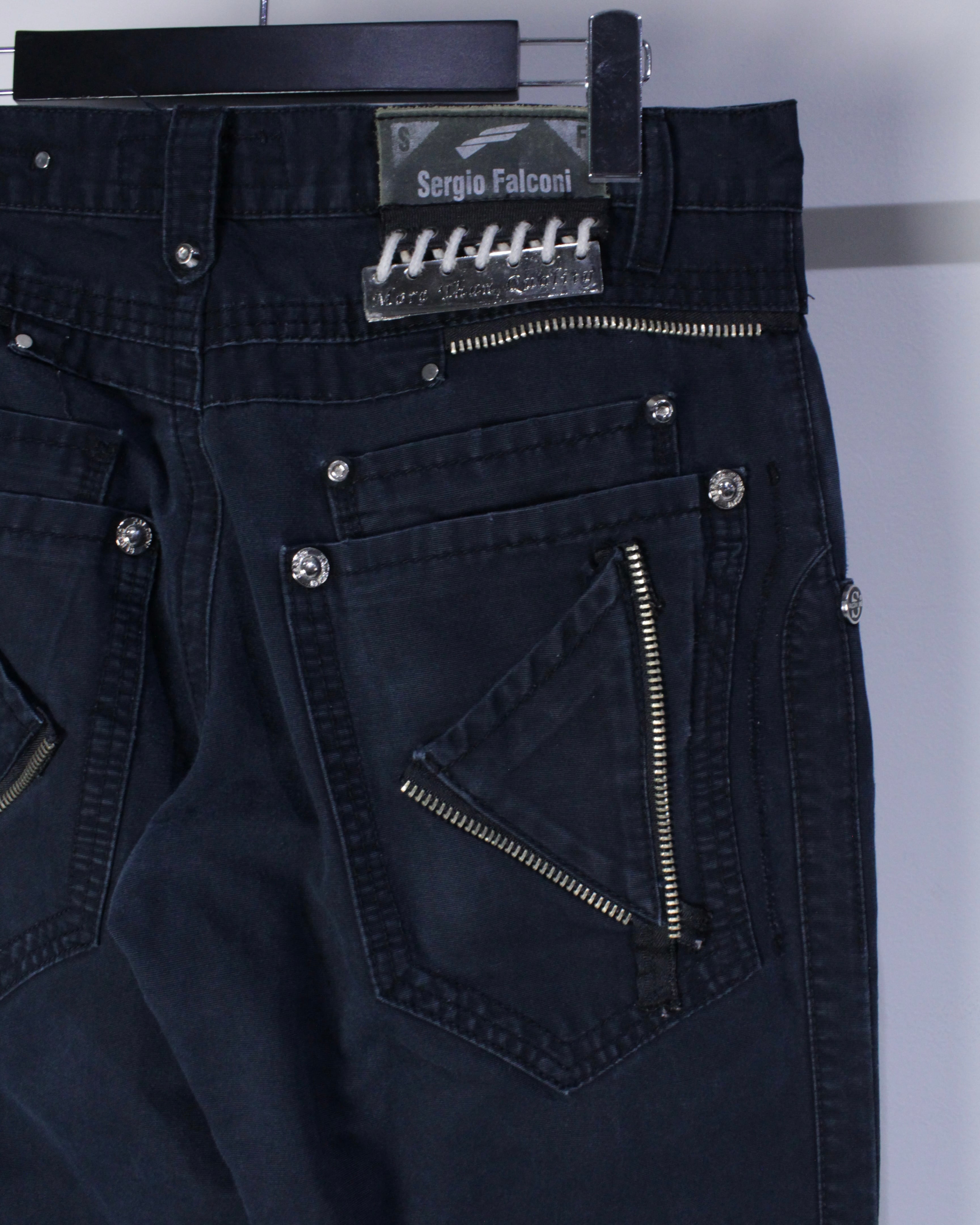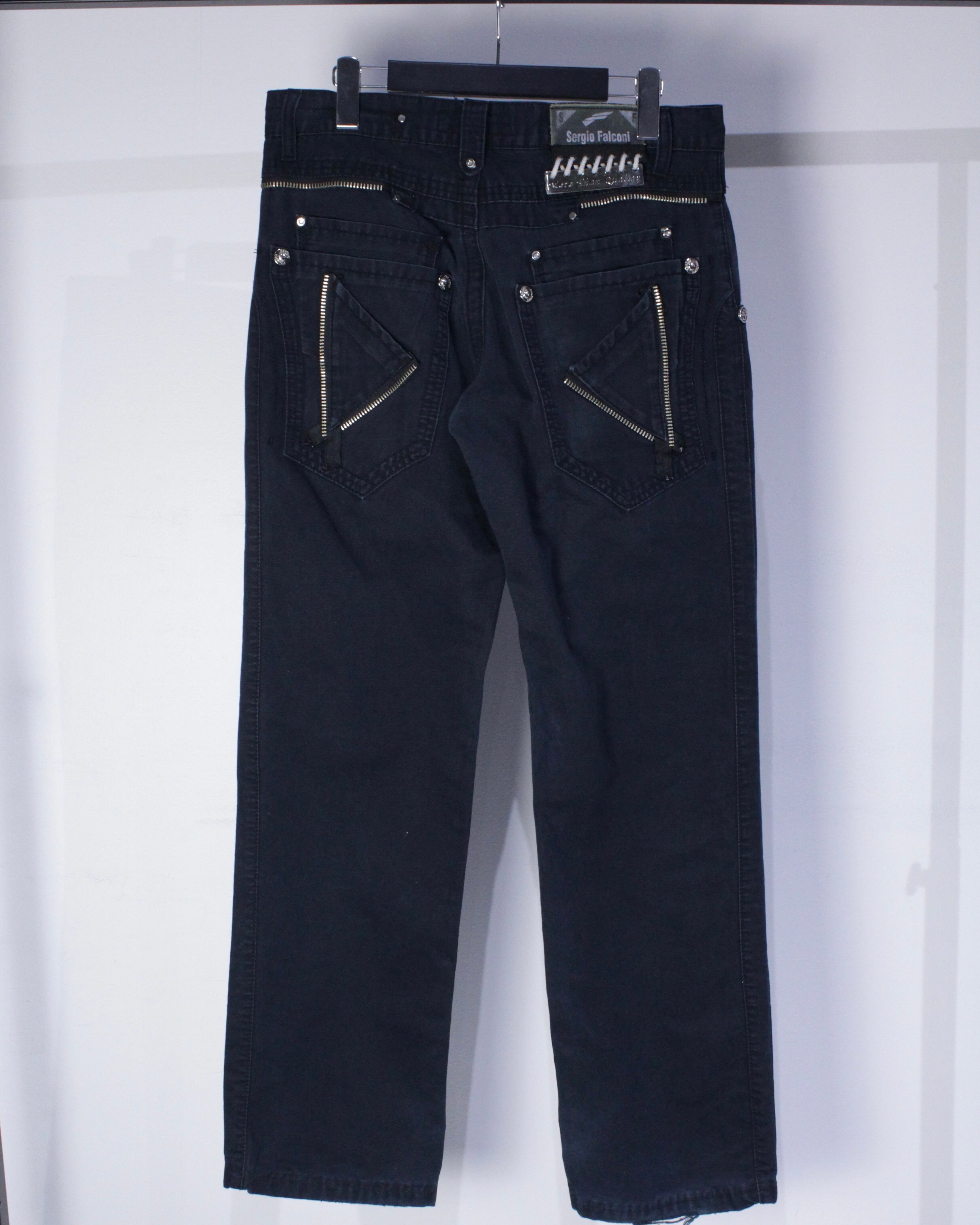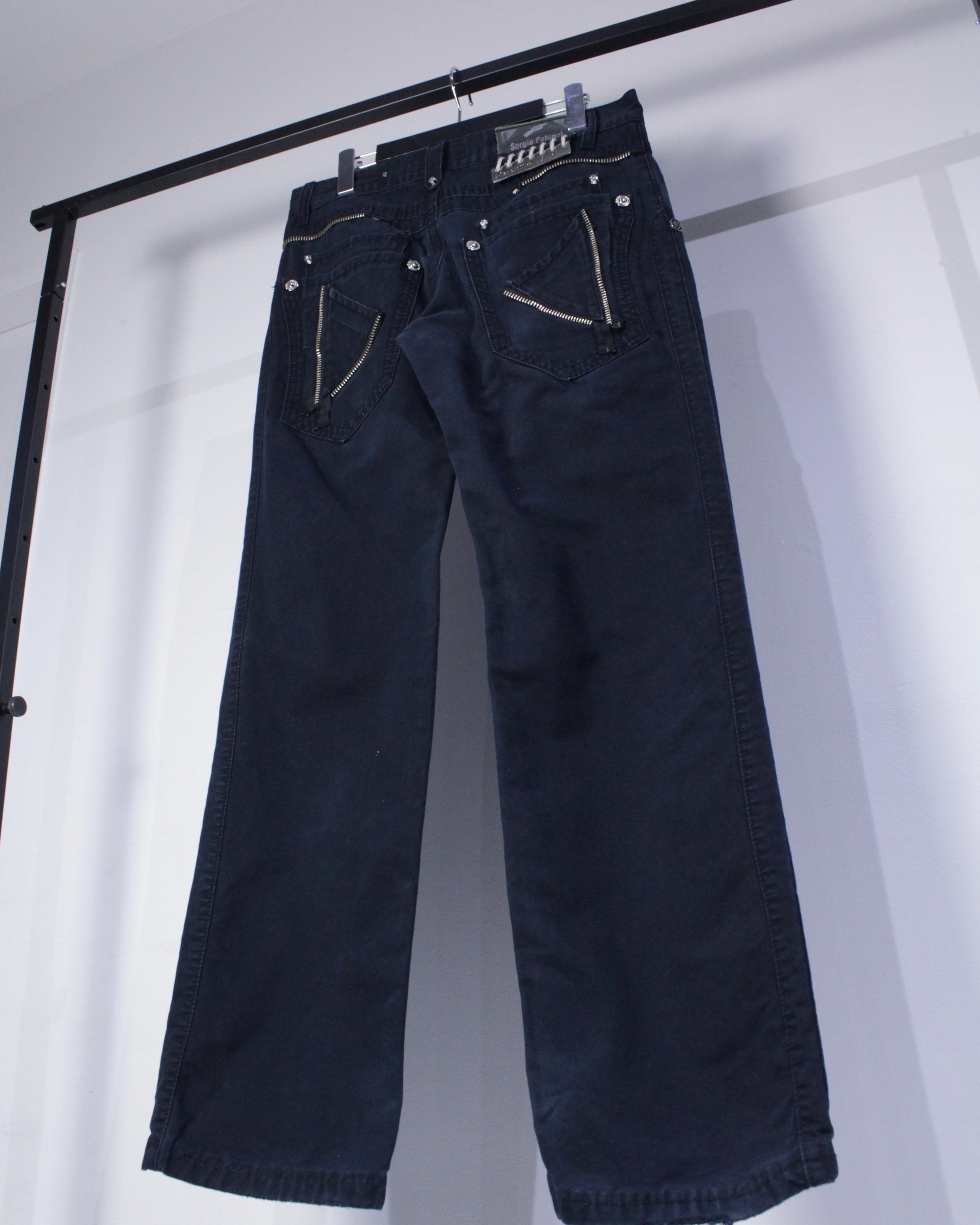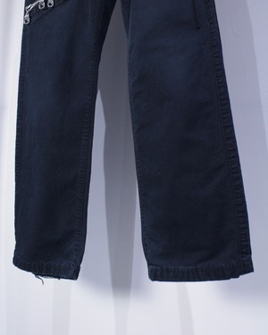 ブラックのボディをベースに、フロントのポケット、バックポケットにジップのギミックを載せたテーパードパンツ。