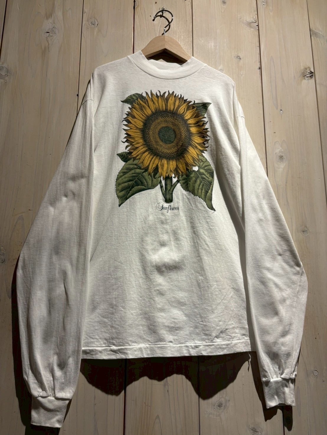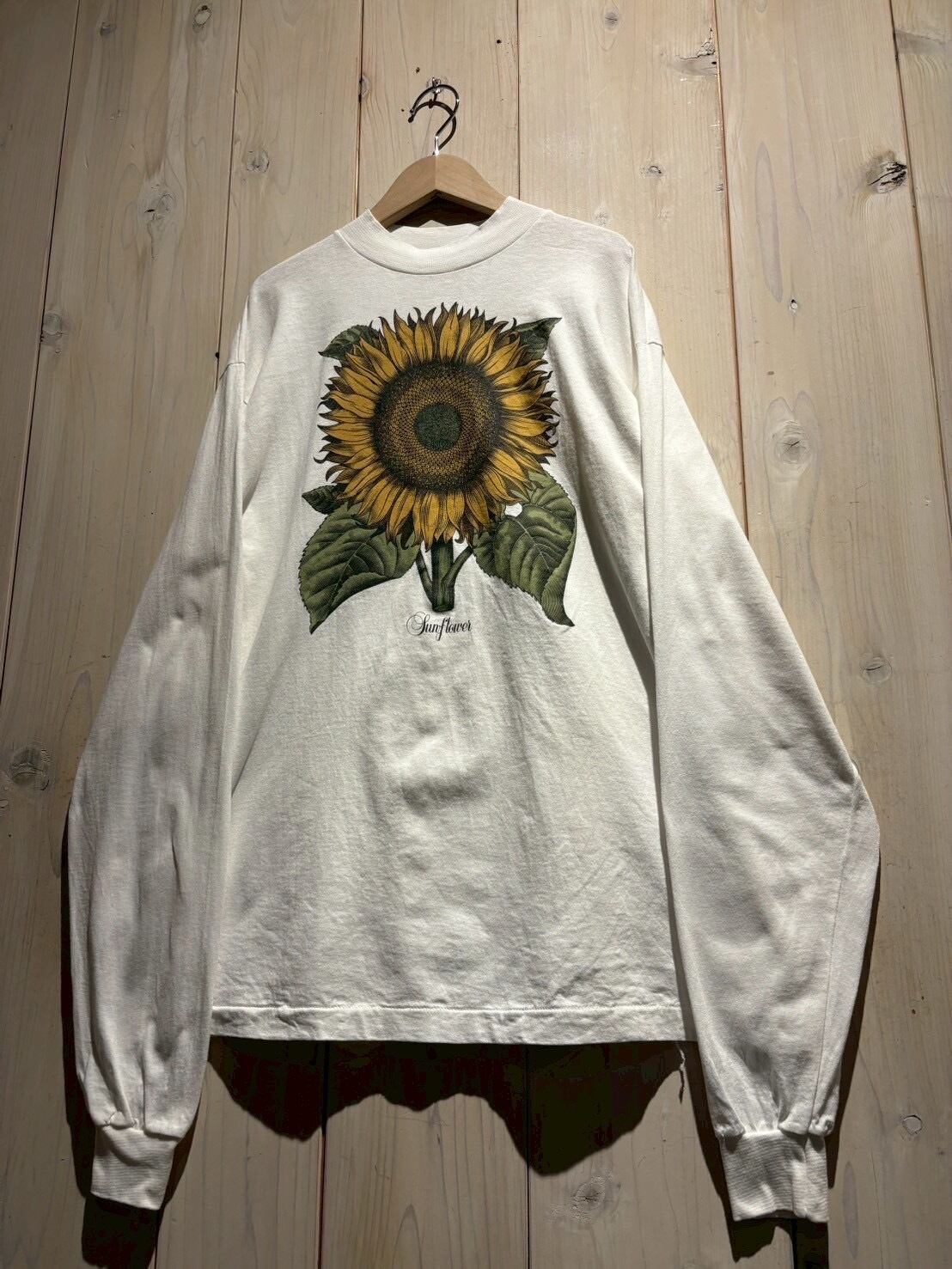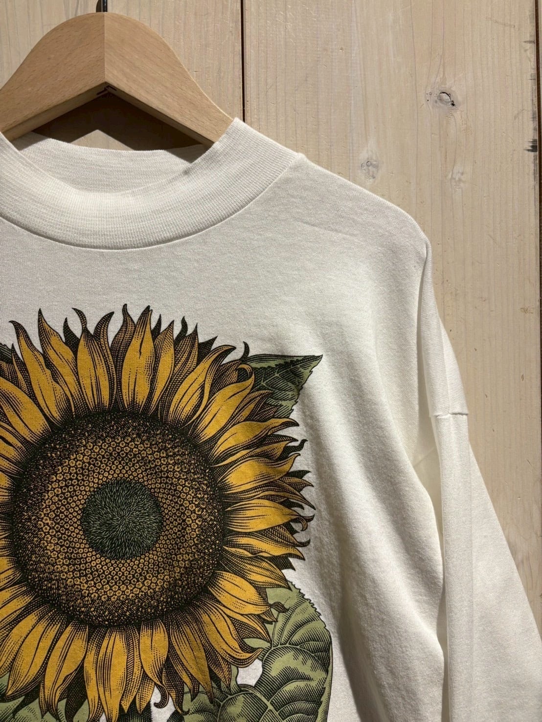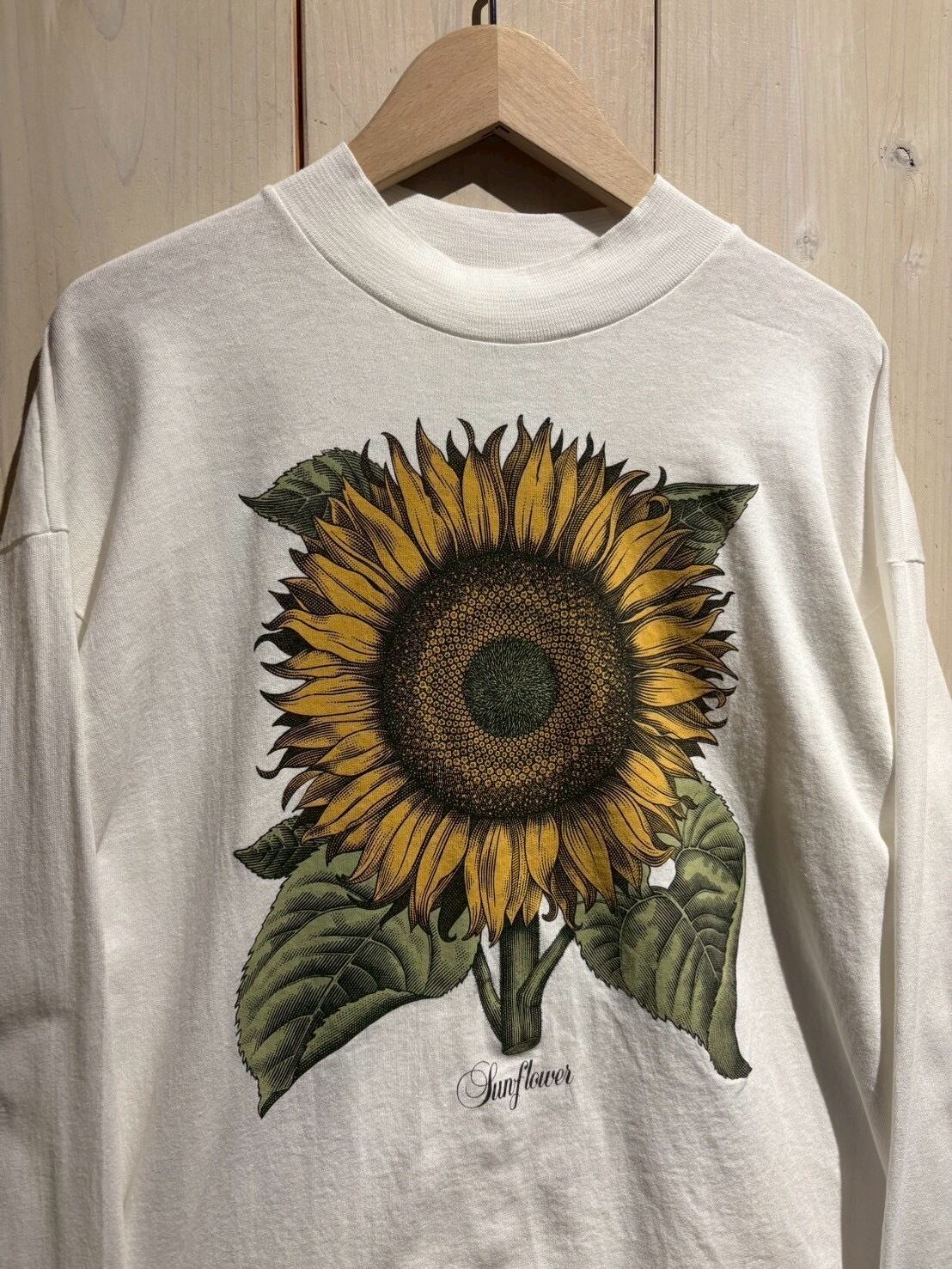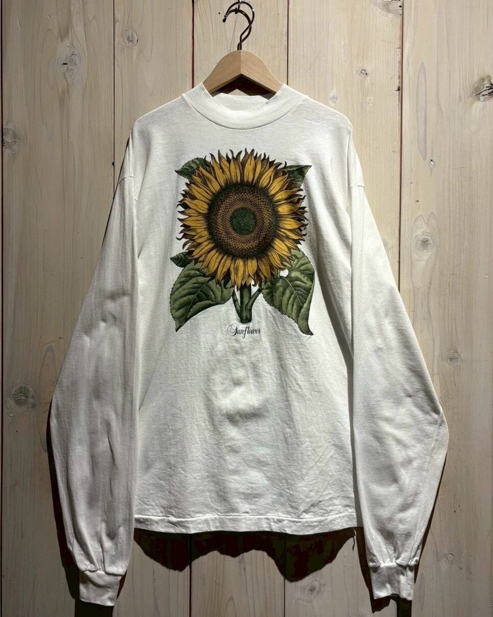 ホワイトのボディに、リアルなタッチで描かれたひまわりの花をプリントした1着。繊細なタッチ、色使いによってシンプルなデザインながら主役を張れるクオリティの高さを誇ります。