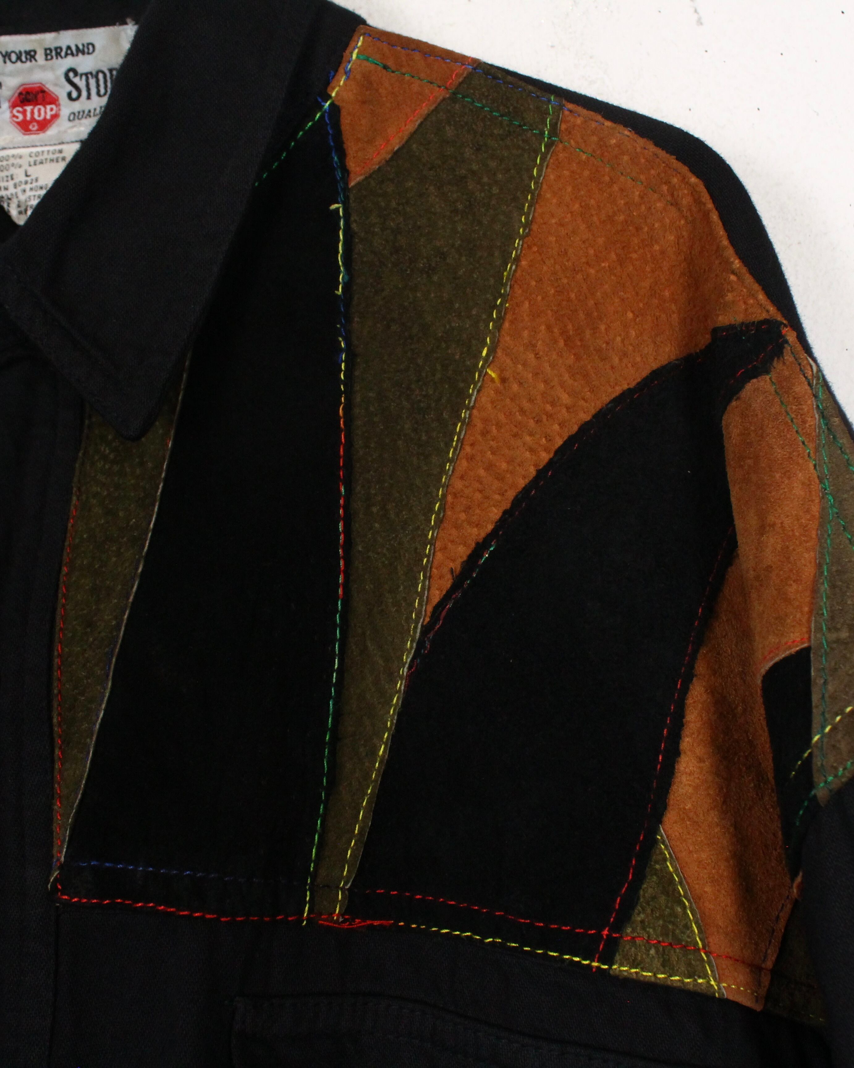 カーキ、ブラウン、ブラックの3色をパッチワーク上に切り替えた非常に贅沢な仕上がり。グラデーションのステッチがより立体感を表現しつつ一枚一枚のレザーもハイクオリティで、完成度の高い1着かと。両胸のフラップポケットのディテールも◎