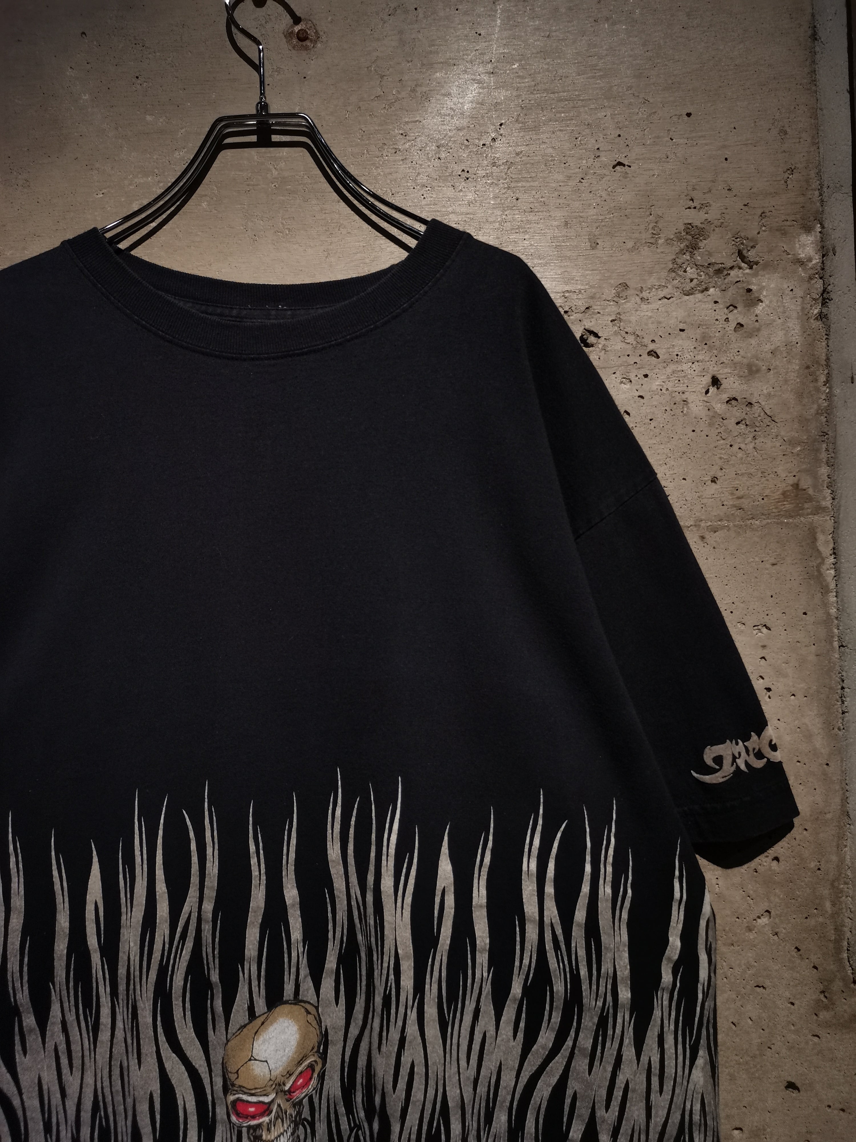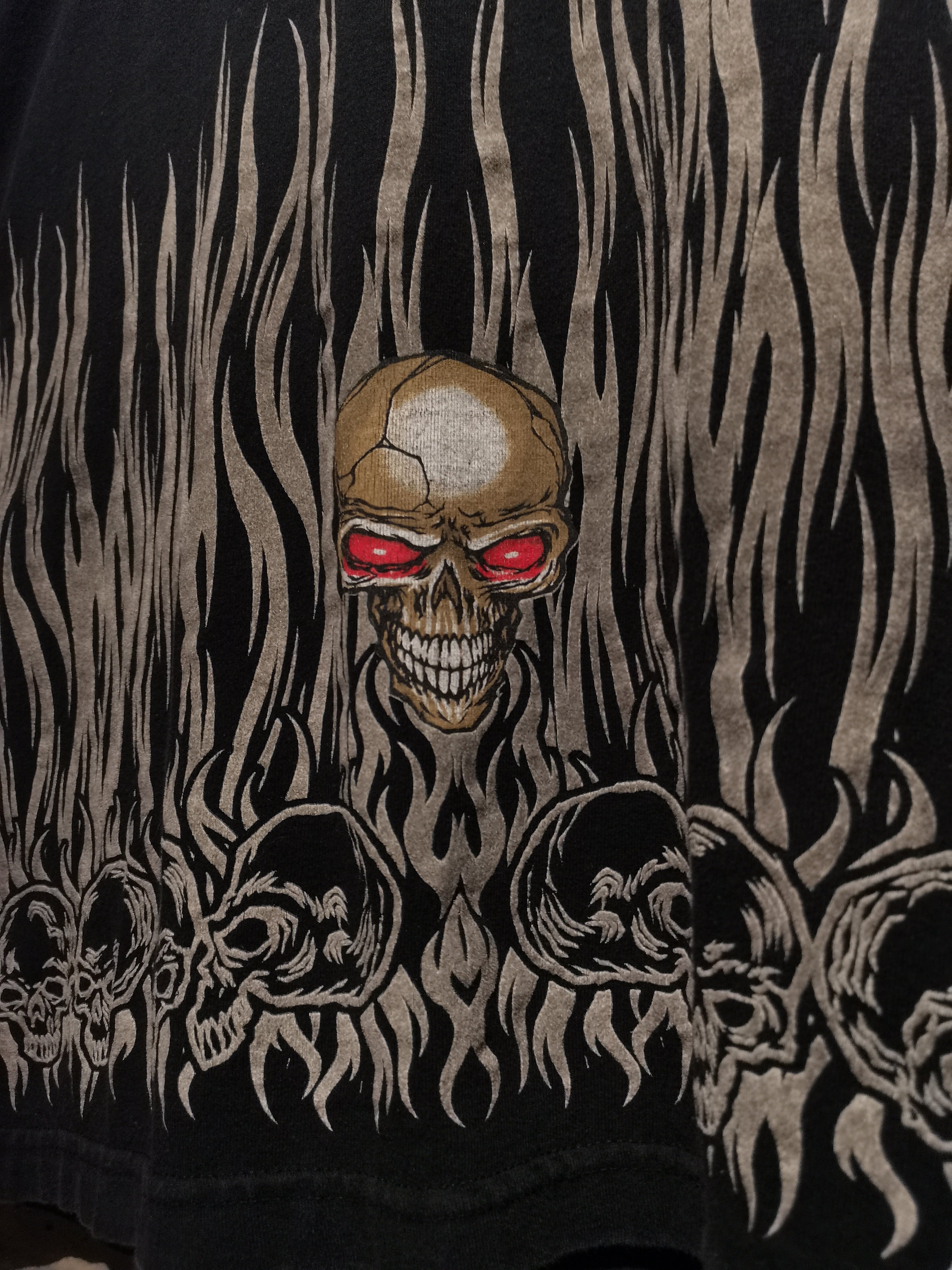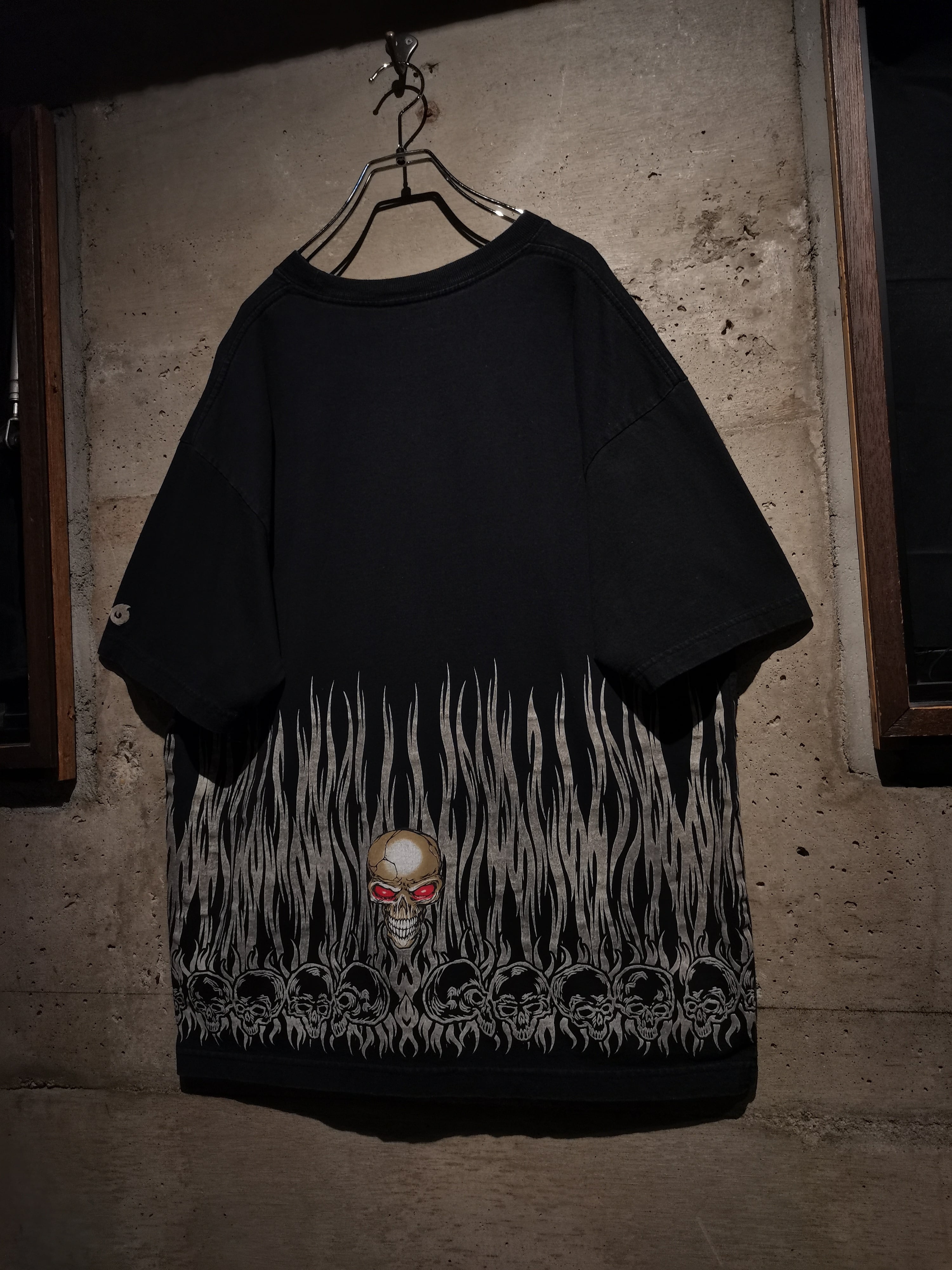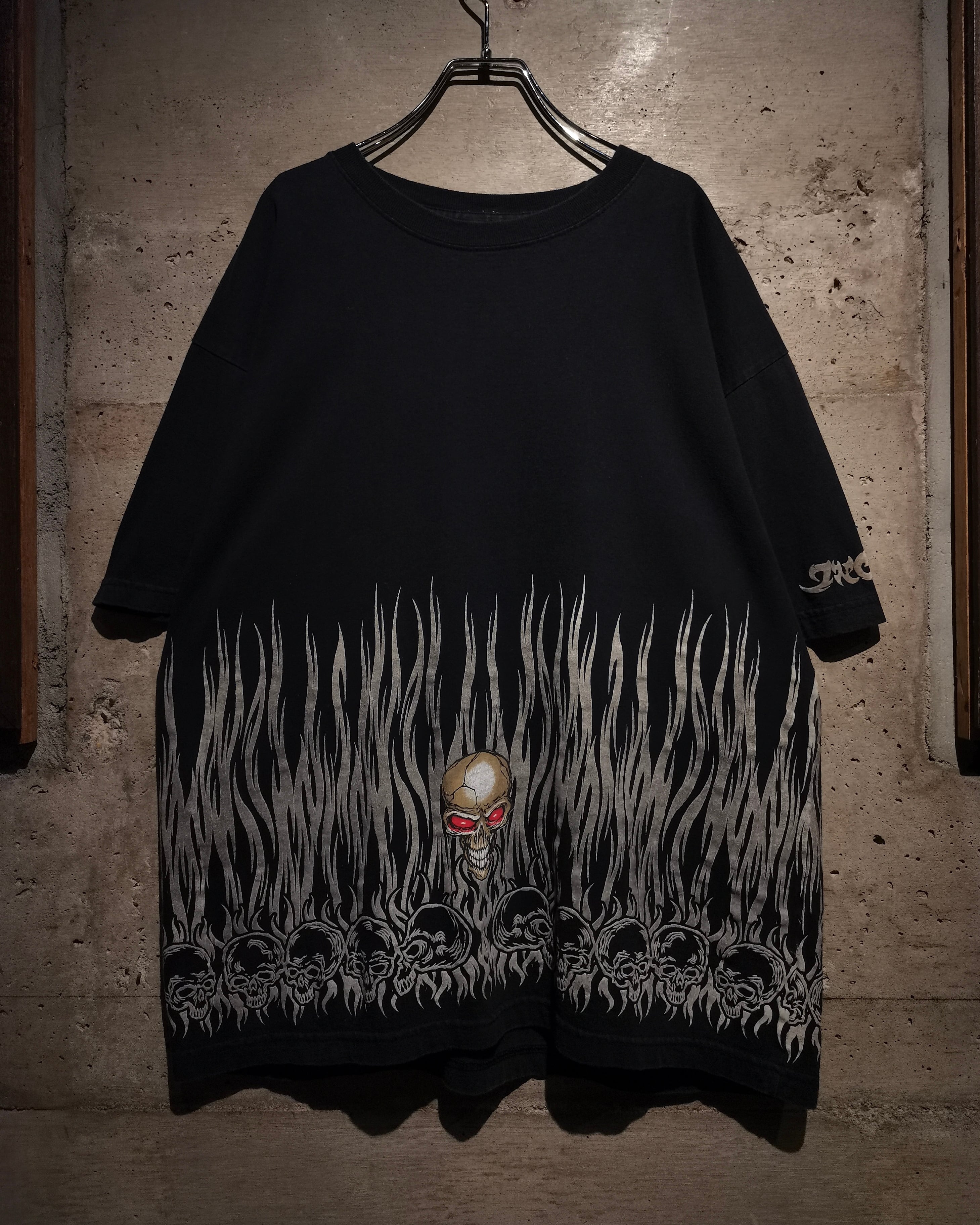 ブラックボディに白のフロッキープリントによってスカル×ファイヤーのデザインを載せた1枚。